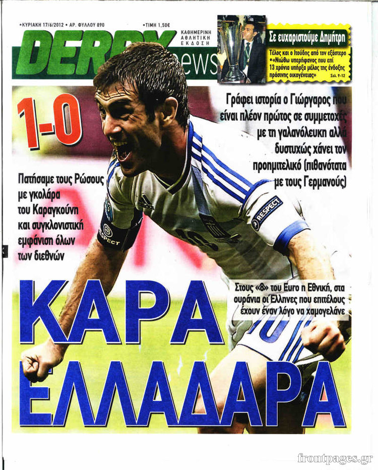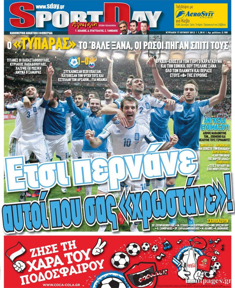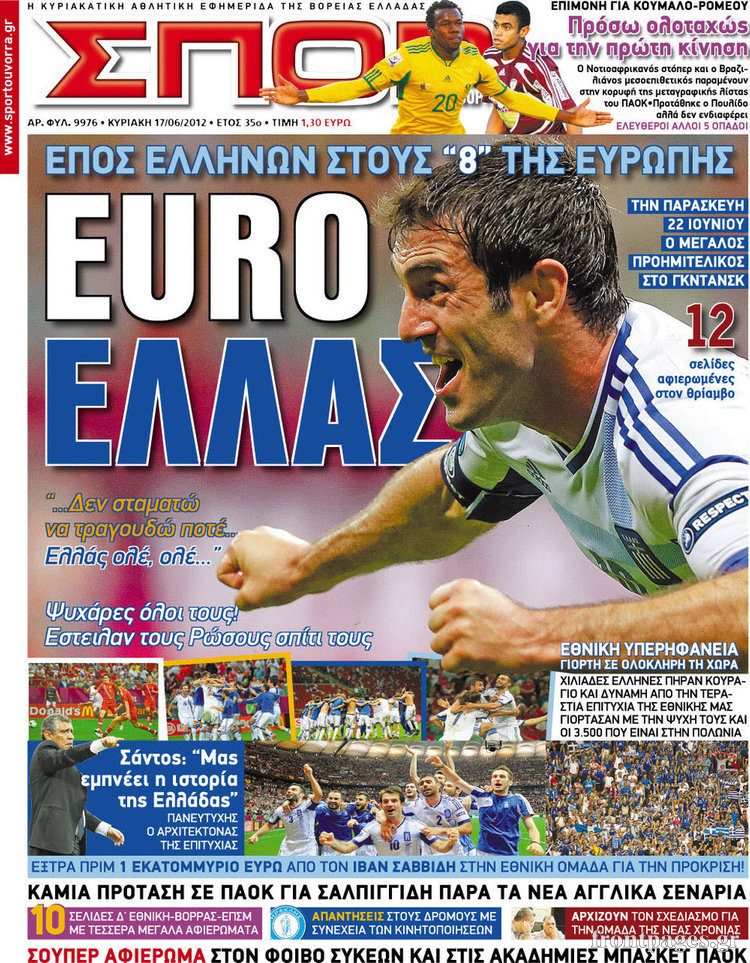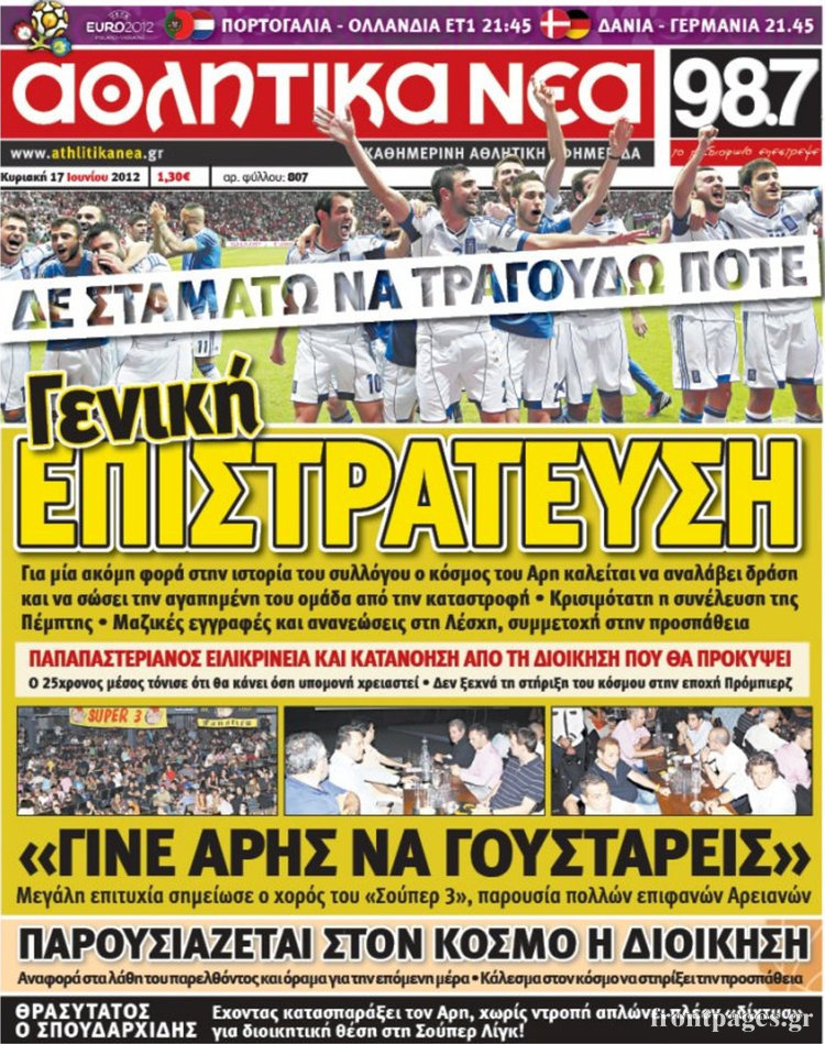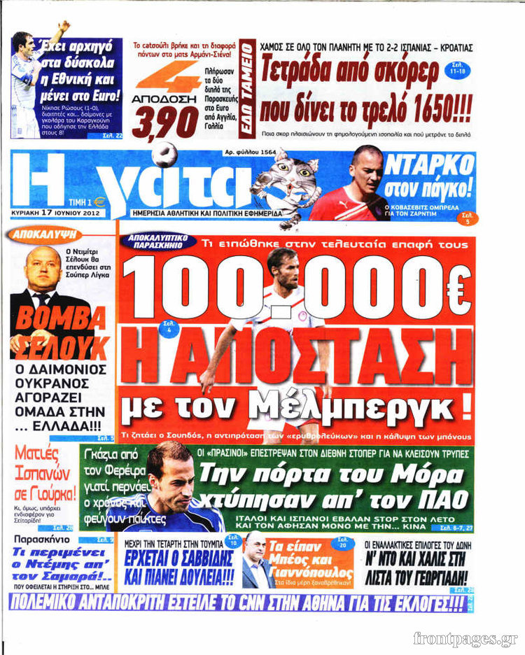 Τα αθλητικά πρωτοσέλιδα Enikos Newsroom 09:47, Κυριακή 17 Ιουνίου 2012 Media ΕΦΗΜΕΡΙΔΕΣ Μοιράσου το: σχολίασε κι εσύ (0 σχόλια) Ακολουθήστε το enikos.gr στο Google News και μάθετε πρώτοι όλες τις ειδήσεις Δείτε όλες τις τελευταίες ειδήσεις από την Ελλάδα και τον Κόσμο στο enikos.gr Ειδήσεις Ροή Ειδήσεων 34 λεπτά πριν Αγρότες: «Όχι στον διάλογο, μας εμπαίζει η κυβέρνηση» – Αποφάσισαν κλιμάκωση των κινητοποιήσεων 1 ώρα πριν Την πρώτη Belharra παρέλαβε η χώρα μας, υψώθηκε η ελληνική σημαία στη φρεγάτα «Κίμων» – Δένδιας: «Το ισχυρότερο Πολεμικό Ναυτικό που είχε ποτέ ο ελληνισμός» 4 ώρες πριν Γιώργος Μαζωνάκης: «Δεν ζήτησα χρήματα, παρά μόνο ηθική δικαίωση» – Οι πρώτες δηλώσεις του 21χρονου μετά την κατάθεση της μήνυσης 19 λεπτά πριν Μιχάλης Χουρδάκης: «Είμαι διαθέσιμος να συμβάλω στην προσωρινή κάλυψη του ιατρείου της Ψερίμου» – Η επιστολή στον Άδωνι Γεωργιάδη 43 λεπτά πριν Εξώδικο Γεωργιάδη στην Κωνσταντοπούλου – «Με κατηγόρησε ότι έχω καταδικαστεί για παιδεραστία» 1 ώρα πριν Τα 5 ζώδια που θα ευνοηθούν στα οικονομικά τους το 2026 – «Τραβούν το χρήμα σαν μαγνήτες» 6 ώρες πριν Αν κάνετε συνεχώς αυτά τα 8 πράγματα με τα κατοικίδιά σας, σας λείπει η ανθρώπινη επαφή 2 ώρες πριν Αυτό που κρύβεται κάτω από τη Γροιλανδία θα μπορούσε να ανατρέψει όσα γνωρίζουμε για την άνοδο της στάθμης των θαλασσών 1 ημέρα πριν 20 χρόνια τα Χριστούγεννα ξεκινούν στα Public με μεγάλη ποικιλία σε δώρα! 3 λεπτά πριν Σμαράγδα Καρύδη για την περούκα της «Ντάλιας»: «Την είχα 20 χρόνια και τώρα μπήκε ξανά σε κουτί» 8 λεπτά πριν Άγιος έρωτας: Η Χριστίνα εξομολογείται στον πατέρα Νικόλαο, απόψε στις 21:00 στον Alpha 13 λεπτά πριν ΕΛΚ – Κωστής Χατζηδάκης: Παρεμβάσεις σε 9 τομείς για την ανταγωνιστικότητα 19 λεπτά πριν Μιχάλης Χουρδάκης: «Είμαι διαθέσιμος να συμβάλω στην προσωρινή κάλυψη του ιατρείου της Ψερίμου» – Η επιστολή στον Άδωνι Γεωργιάδη 24 λεπτά πριν Κουίζ για την παλιά Αθήνα: Αναγνωρίζετε την περιοχή; Είναι από τις πιο γνωστές ENIKOS NETWORK 100 χρόνια ΠΙΣ: Ένας αιώνας προσφοράς στην Ιατρική και την κοινωνία Ένα ποτήρι την ημέρα από αυτόν τον χυμό μειώνει τη χοληστερίνη, τη φλεγμονή και την πίεση Χριστούγεννα και Πρωτοχρονιά: Δείτε πόσα χρήματα θα πάρουν ως αμοιβή όσοι εργαστούν Κρατική επιχορήγηση έως 14.500 ευρώ: Ποιοι θα λάβουν από σήμερα την προκαταβολή στον τραπεζικό λογαριασμό τους Χαρτογραφώντας το «σημείο χωρίς επιστροφή»: Για πρώτη φορά αποκαλύπτεται με λεπτομέρεια το ακανθώδες όριο της ατμόσφαιρας τ... Η Google καταργεί τη λειτουργία «dark web report» – Πώς θα μπορούν οι χρήστες να διαγράφουν τα δεδομένα τους περισσότερα 17:20 , Πέμπτη 18 Δεκεμβρίου 2025 Άγιος έρωτας: Η Χριστίνα εξομολογείται στον πατέρα Νικόλαο, απόψε στις 21:00 στον Alpha Η Νότα αποφασίζει να εκδικηθεί τον Πέτρο και τον Στέφανο, για χάρη του Λούη, όμως τα πράγματα ... 16:50 , Πέμπτη 18 Δεκεμβρίου 2025 Να μ’ αγαπάς: Ζωή και Φωτεινή συμφιλιώνονται ως μάνα με κόρη, απόψε στις 20:00 Η ταυτότητα του Άγγελου αποκαλύπτεται στο νέο επεισόδιο της σειράς “Να μ’ αγαπάς... 15:52 , Πέμπτη 18 Δεκεμβρίου 2025 Το Σπίτι Δίπλα Στο Ποτάμι: Το καθηλωτικό τελευταίο επεισόδιο για το 2025 απόψε στις 22:30 Καθηλώνει το σημερινό επεισόδιο της σειράς “Το Σπίτι Δίπλα Στο Ποτάμι” που έρχεται... 15:20 , Πέμπτη 18 Δεκεμβρίου 2025 Άγιος έρωτας – Η Ελευθερία Αρβανιτάκη τραγουδά και ο Γιάννης Τσορτέκης καθηλώνει με τον χορό του Ο Κλεάνθης χορεύει στους ήχους της Ελευθερίας Αρβανιτάκη στη σειρά “Άγιος Έρωτας“.... ΤΕΛΕΥΤΑΙΕΣ