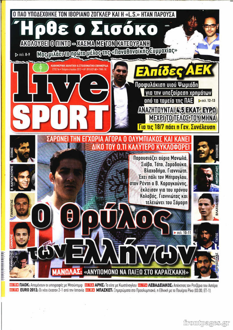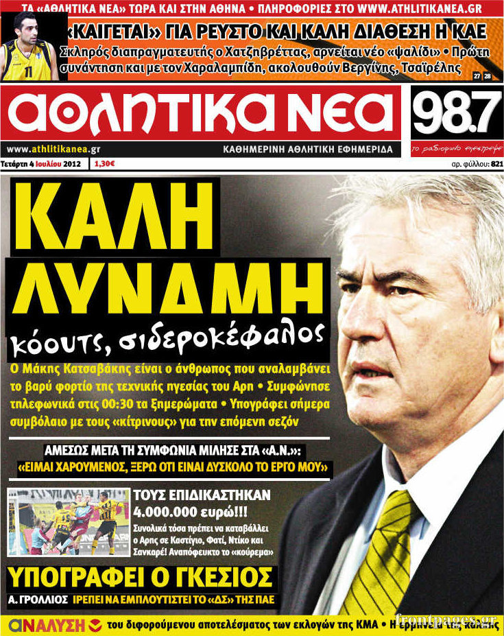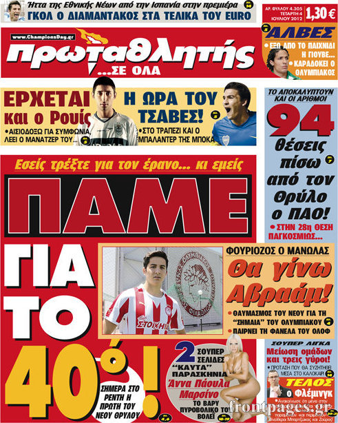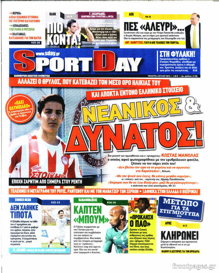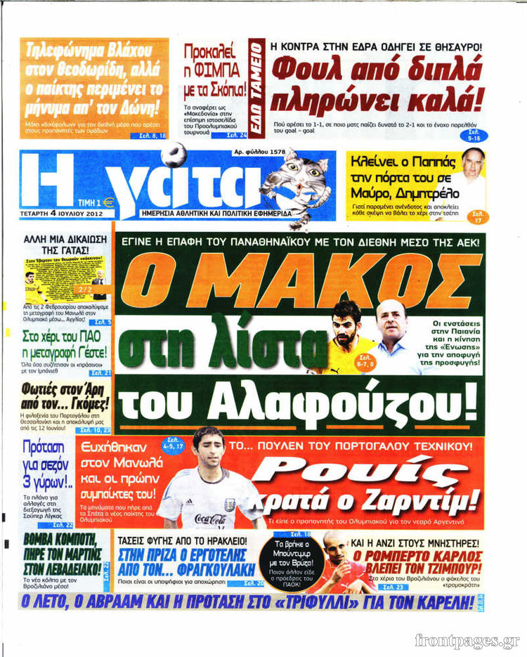 Τα αθλητικά πρωτοσέλιδα Enikos Newsroom 09:53, Τετάρτη 04 Ιουλίου 2012 Media ΕΦΗΜΕΡΙΔΕΣ Μοιράσου το: σχολίασε κι εσύ (0 σχόλια) Ακολουθήστε το enikos.gr στο Google News και μάθετε πρώτοι όλες τις ειδήσεις Δείτε όλες τις τελευταίες ειδήσεις από την Ελλάδα και τον Κόσμο στο enikos.gr Ειδήσεις Ροή Ειδήσεων 43 λεπτά πριν Ευρωπαϊκή Ένωση: Χωρίς συμφωνία, για την μακροπρόθεσμη χρηματοδότηση της Ουκρανίας, ολοκληρώθηκε η Σύνοδος Κορυφής στις Βρυξέλλες 4 ώρες πριν ΟΠΕΚΕΠΕ: Προφυλακιστέος ο φερόμενος αρχηγός και ο λογιστής της εγκληματικής οργάνωσης 5 ώρες πριν Αυξάνουν την πίεση προς την κυβέρνηση οι αγρότες: Κλείνουν παρακαμπτήριους και ανοίγουν διόδια – Τι θα γίνει τις γιορτές 5 ώρες πριν Φοινικούντα: Το Σάββατο απολογείται ο 30χρονος γιος γνωστού επιχειρηματία της Πλάκας που παραδόθηκε – Όσα είπε στους αστυνομικούς και ο ρόλος του στο έγκλημα 4 ώρες πριν ΑΕΚ – Κραϊόβα 3-2: Επική ανατροπή και πρόκριση στους «16» του Conference League η Ένωση 5 ώρες πριν Αρχαιολόγοι ανακάλυψαν ρωμαϊκά τεχνουργήματα από μια πόλη που δεν υπήρξε ποτέ – Τα τρία εντυπωσιακά κτίρια και ο αμφορέας με τις… σαρδέλες 6 ώρες πριν Ύπνος: Η απλή βραδινή ρουτίνα για να προστατεύσετε τα μαλλιά σας από το κρύο κατά τη διάρκεια του χειμώνα 7 ώρες πριν Manifesting: Πώς να συναντήσετε τον σύντροφο της ζωής σας, ανάλογα με τον μήνα γέννησής σας 2 ημέρες πριν 20 χρόνια τα Χριστούγεννα ξεκινούν στα Public με μεγάλη ποικιλία σε δώρα! 3 λεπτά πριν Σίσσυ Τουμάση: «Είμαι ασθενοφοβική πάρα πολύ και με πιάνει μια παράνοια μ’ αυτό» 27 λεπτά πριν Ντόναλντ Τραμπ: Δεν χρειάζομαι την έγκριση του Κογκρέσου για να διατάξω στρατιωτικά πλήγματα στη Βενεζουέλα 43 λεπτά πριν Ευρωπαϊκή Ένωση: Χωρίς συμφωνία, για την μακροπρόθεσμη χρηματοδότηση της Ουκρανίας, ολοκληρώθηκε η Σύνοδος Κορυφής στις Βρυξέλλες 58 λεπτά πριν GNTM: «Κλείδωσαν» οι τέσσερις φιναλίστ – Μεγάλη ανατροπή στις τελευταίες αποχωρήσεις 1 ώρα πριν Γιώργος Μαζωνάκης: Αποθεώθηκε στην πρεμιέρα του στην «Ακτή Πειραιώς» λίγες ώρες μετά τις καταγγελίες – «Είμαι αληθινός», είπε με νόημα ENIKOS NETWORK Σε περίοδο αυξημένης δραστηριότητας η γρίπη στην Ελλάδα-Μέτρα προστασίας από τον ΕΟΔΥ Σκέφτεστε συνέχεια συζητήσεις που έχετε κάνει; Τι σημαίνει αυτό, σύμφωνα με ειδικό Στεγαστικό: Τι λέει η ΠΟΜΙΔΑ για τα νέα μέτρα που ανακοίνωσε ο Κυριάκος Μητσοτάκης Λαγκάρντ: Αισιόδοξη για την ανάπτυξη της Ευρωζώνης, αβέβαιη για τον πληθωρισμό Χαρτογραφώντας το «σημείο χωρίς επιστροφή»: Για πρώτη φορά αποκαλύπτεται με λεπτομέρεια το ακανθώδες όριο της ατμόσφαιρας τ... Η Google καταργεί τη λειτουργία «dark web report» – Πώς θα μπορούν οι χρήστες να διαγράφουν τα δεδομένα τους περισσότερα 02:50 , Παρασκευή 19 Δεκεμβρίου 2025 GNTM: «Κλείδωσαν» οι τέσσερις φιναλίστ – Μεγάλη ανατροπή στις τελευταίες αποχωρήσεις Για προτελευταία φορά εμφανίστηκαν στο πλατό του GNTM οι φιναλίστ του φετινού κύκλου, το βράδυ... 17:45 , Πέμπτη 18 Δεκεμβρίου 2025 ROUK ZOUK: Εορταστικό επεισόδιο με καλεσμένους τους πρωταγωνιστές του «Γιατί ρε πατέρα» Το Σάββατο 20 Δεκεμβρίου στις 21:00, η Ζέτα Μακρυπούλια υποδέχεται εκλεκτούς ηθοποιούς που όλο... 17:20 , Πέμπτη 18 Δεκεμβρίου 2025 Άγιος έρωτας: Η Χριστίνα εξομολογείται στον πατέρα Νικόλαο, απόψε στις 21:00 στον Alpha Η Νότα αποφασίζει να εκδικηθεί τον Πέτρο και τον Στέφανο, για χάρη του Λούη, όμως τα πράγματα ... 16:50 , Πέμπτη 18 Δεκεμβρίου 2025 Να μ’ αγαπάς: Ζωή και Φωτεινή συμφιλιώνονται ως μάνα με κόρη, απόψε στις 20:00 Η ταυτότητα του Άγγελο