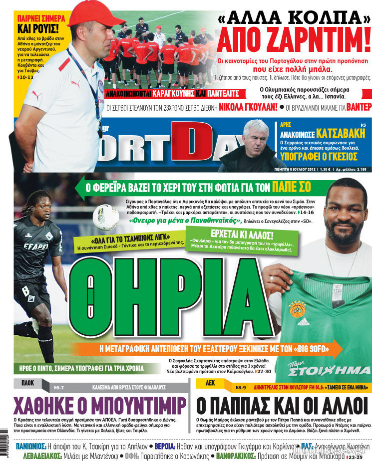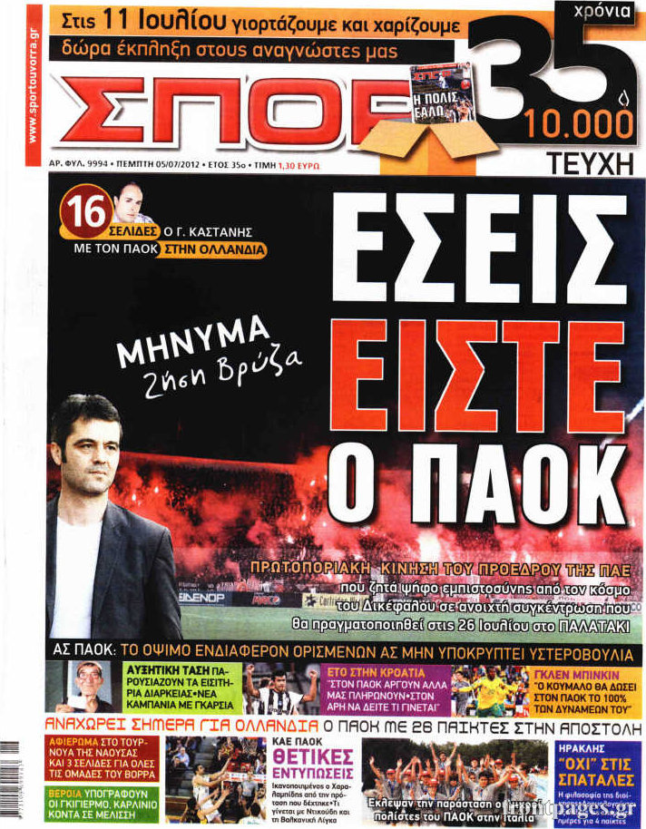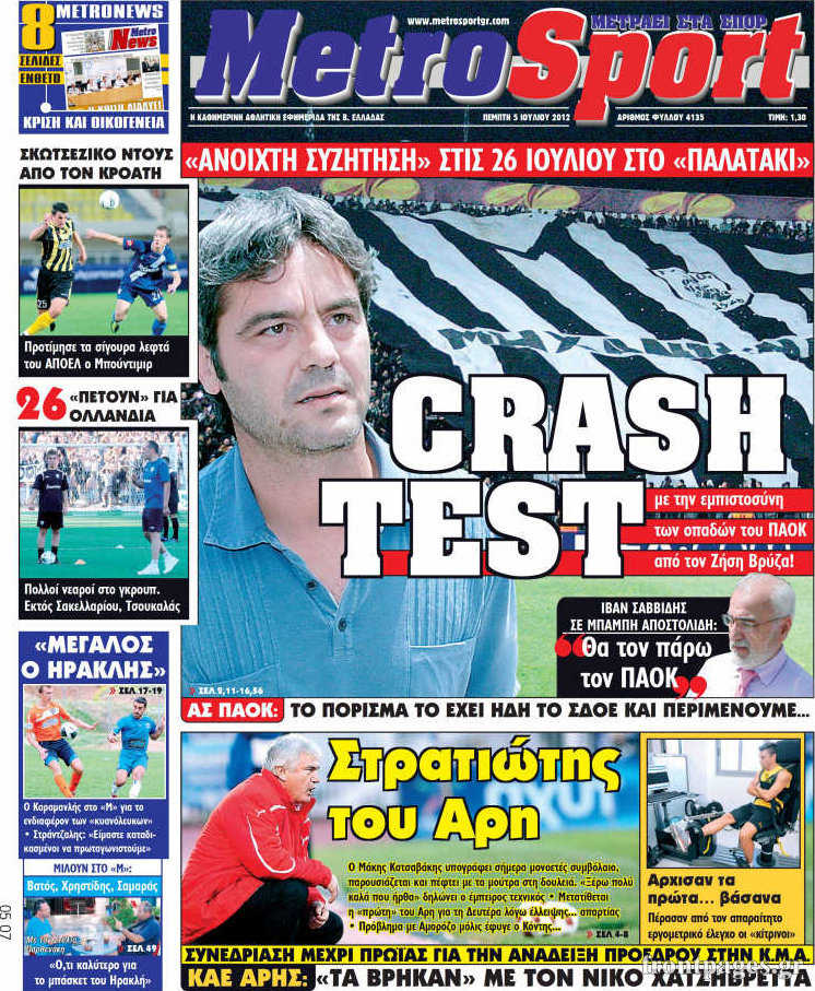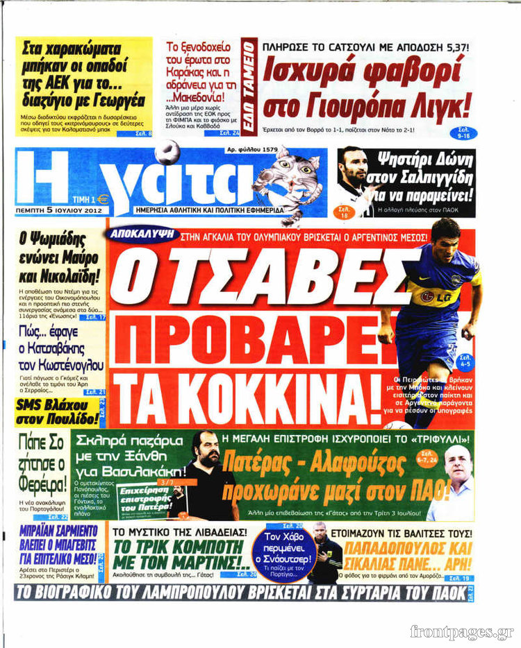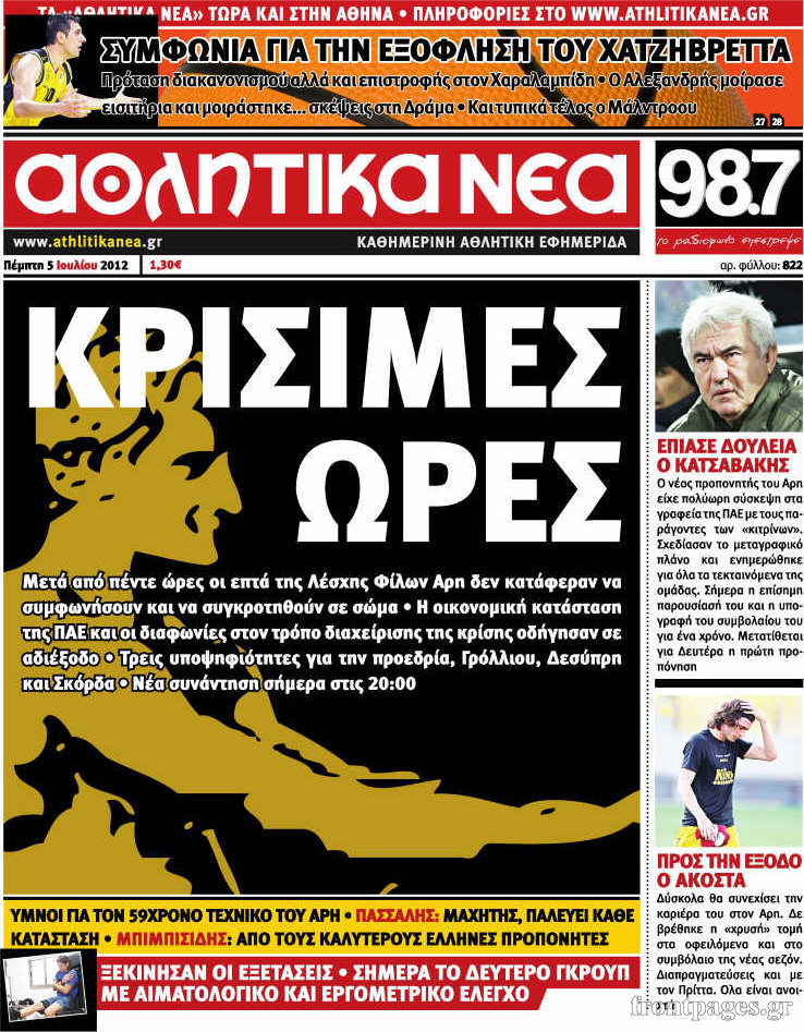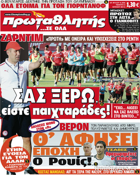 Τα αθλητικά πρωτοσέλιδα Enikos Newsroom 09:31, Πέμπτη 05 Ιουλίου 2012 Media ΕΦΗΜΕΡΙΔΕΣ Μοιράσου το: σχολίασε κι εσύ (0 σχόλια) Ακολουθήστε το enikos.gr στο Google News και μάθετε πρώτοι όλες τις ειδήσεις Δείτε όλες τις τελευταίες ειδήσεις από την Ελλάδα και τον Κόσμο στο enikos.gr Ειδήσεις Ροή Ειδήσεων 1 ώρα πριν Ευρωπαϊκή Ένωση: Συμφωνία για δάνειο 90 δισ. ευρώ στην Ουκρανία τη διετία 2026-2027 6 ώρες πριν ΟΠΕΚΕΠΕ: Προφυλακιστέος ο φερόμενος αρχηγός και ο λογιστής της εγκληματικής οργάνωσης 7 ώρες πριν Αυξάνουν την πίεση προς την κυβέρνηση οι αγρότες: Κλείνουν παρακαμπτήριους και ανοίγουν διόδια – Τι θα γίνει τις γιορτές 7 ώρες πριν Φοινικούντα: Το Σάββατο απολογείται ο 30χρονος γιος γνωστού επιχειρηματία της Πλάκας που παραδόθηκε – Όσα είπε στους αστυνομικούς και ο ρόλος του στο έγκλημα 5 ώρες πριν ΑΕΚ – Κραϊόβα 3-2: Επική ανατροπή και πρόκριση στους «16» του Conference League η Ένωση 6 ώρες πριν Αρχαιολόγοι ανακάλυψαν ρωμαϊκά τεχνουργήματα από μια πόλη που δεν υπήρξε ποτέ – Τα τρία εντυπωσιακά κτίρια και ο αμφορέας με τις… σαρδέλες 7 ώρες πριν Ύπνος: Η απλή βραδινή ρουτίνα για να προστατεύσετε τα μαλλιά σας από το κρύο κατά τη διάρκεια του χειμώνα 8 ώρες πριν Manifesting: Πώς να συναντήσετε τον σύντροφο της ζωής σας, ανάλογα με τον μήνα γέννησής σας 2 ημέρες πριν 20 χρόνια τα Χριστούγεννα ξεκινούν στα Public με μεγάλη ποικιλία σε δώρα! 7 λεπτά πριν Η TikTok στις ΗΠΑ πωλείται σε Oracle, Silver Lake και MGX – Οι λεπτομέρειες του «deal» 15 λεπτά πριν Αλεξάντερ Λουκασένκο: Η Λευκορωσία βρίσκεται κοντά στην αποκατάσταση των σχέσεών της με τις ΗΠΑ 30 λεπτά πριν Αυστραλία: Κήρυξε την Κυριακή (21/12) ημέρα εθνικού πένθους για τη φονική επίθεση στην παραλία Μπόνταϊ 40 λεπτά πριν Ρόδος: Δάσκαλος καράτε καταδικάστηκε για ασέλγεια σε ανήλικες αθλήτριες – Μαρτυρίες για αγγίγματα σε ευαίσθητα σημεία 55 λεπτά πριν Γουατεμάλα: Εξαρθρώθηκε κύκλωμα διακίνησης μεταναστών προς τις ΗΠΑ – Συνελήφθησαν 14 άτομα ENIKOS NETWORK Σε περίοδο αυξημένης δραστηριότητας η γρίπη στην Ελλάδα-Μέτρα προστασίας από τον ΕΟΔΥ Σκέφτεστε συνέχεια συζητήσεις που έχετε κάνει; Τι σημαίνει αυτό, σύμφωνα με ειδικό Στεγαστικό: Τι λέει η ΠΟΜΙΔΑ για τα νέα μέτρα που ανακοίνωσε ο Κυριάκος Μητσοτάκης Λαγκάρντ: Αισιόδοξη για την ανάπτυξη της Ευρωζώνης, αβέβαιη για τον πληθωρισμό Χαρτογραφώντας το «σημείο χωρίς επιστροφή»: Για πρώτη φορά αποκαλύπτεται με λεπτομέρεια το ακανθώδες όριο της ατμόσφαιρας τ... Η Google καταργεί τη λειτουργία «dark web report» – Πώς θα μπορούν οι χρήστες να διαγράφουν τα δεδομένα τους περισσότερα 02:50 , Παρασκευή 19 Δεκεμβρίου 2025 GNTM: «Κλείδωσαν» οι τέσσερις φιναλίστ – Μεγάλη ανατροπή στις τελευταίες αποχωρήσεις Για προτελευταία φορά εμφανίστηκαν στο πλατό του GNTM οι φιναλίστ του φετινού κύκλου, το βράδυ... 17:45 , Πέμπτη 18 Δεκεμβρίου 2025 ROUK ZOUK: Εορταστικό επεισόδιο με καλεσμένους τους πρωταγωνιστές του «Γιατί ρε πατέρα» Το Σάββατο 20 Δεκεμβρίου στις 21:00, η Ζέτα Μακρυπούλια υποδέχεται εκλεκτούς ηθοποιούς που όλο... 17:20 , Πέμπτη 18 Δεκεμβρίου 2025 Άγιος έρωτας: Η Χριστίνα εξομολογείται στον πατέρα Νικόλαο, απόψε στις 21:00 στον Alpha Η Νότα αποφασίζει να εκδικηθεί τον Πέτρο και τον Στέφανο, για χάρη του Λούη, όμως τα πράγματα ... 16:50 , Πέμπτη 18 Δεκεμβρίου 2025 Να μ’ αγαπάς: Ζωή και Φωτεινή συμφιλιώνονται ως μάνα με κόρη, απόψε στις 20:00 Η ταυτότητα του Άγγελου αποκαλύπτεται στο νέο επεισόδιο της σειράς “Να μ’ αγαπάς... ΤΕΛΕΥΤΑΙΕΣ ΕΙΔΗΣΕΙΣ 15 λεπτά πριν Αλεξάντερ Λουκασένκο: Η 