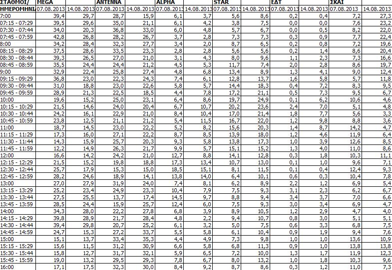 Δείτε τις μετρήσεις τηλεθέασης για την Τετάρτη (14/8) των τηλεοπτικών σταθμών εθνικής εμβέλειας.