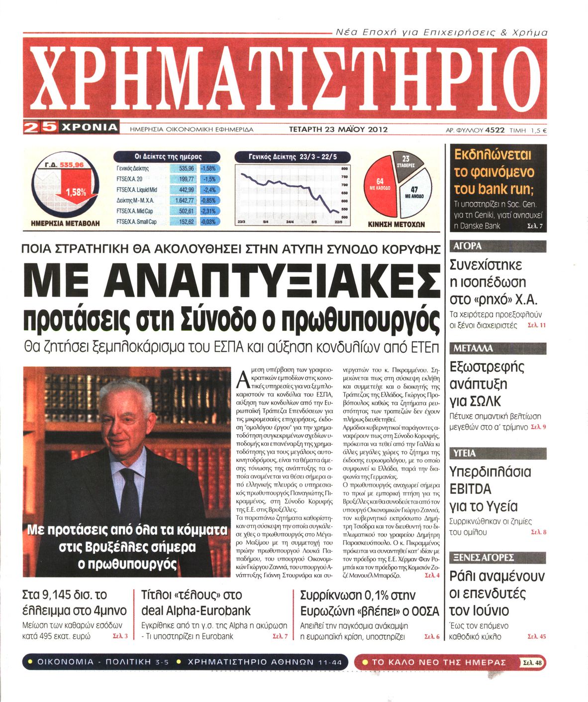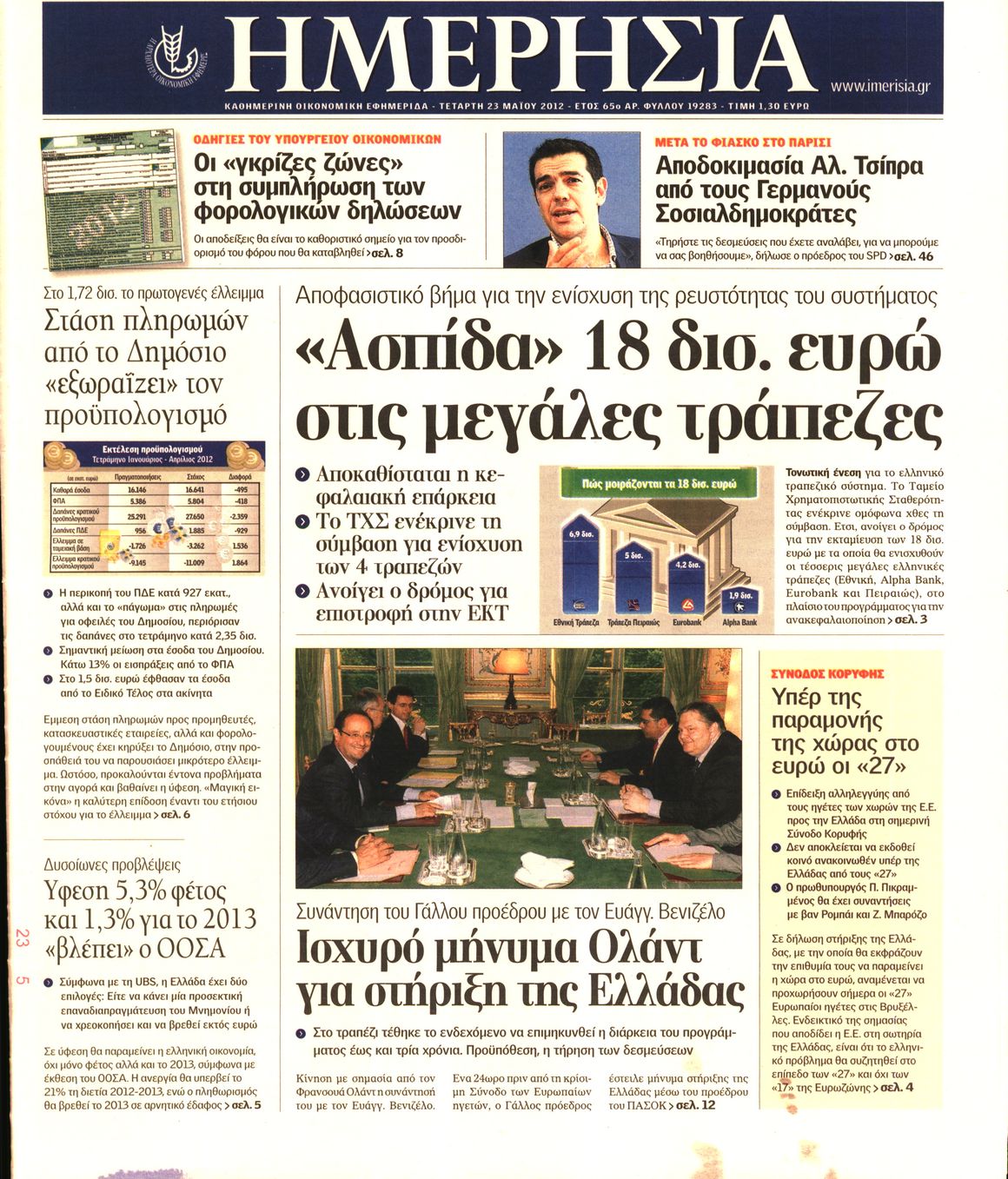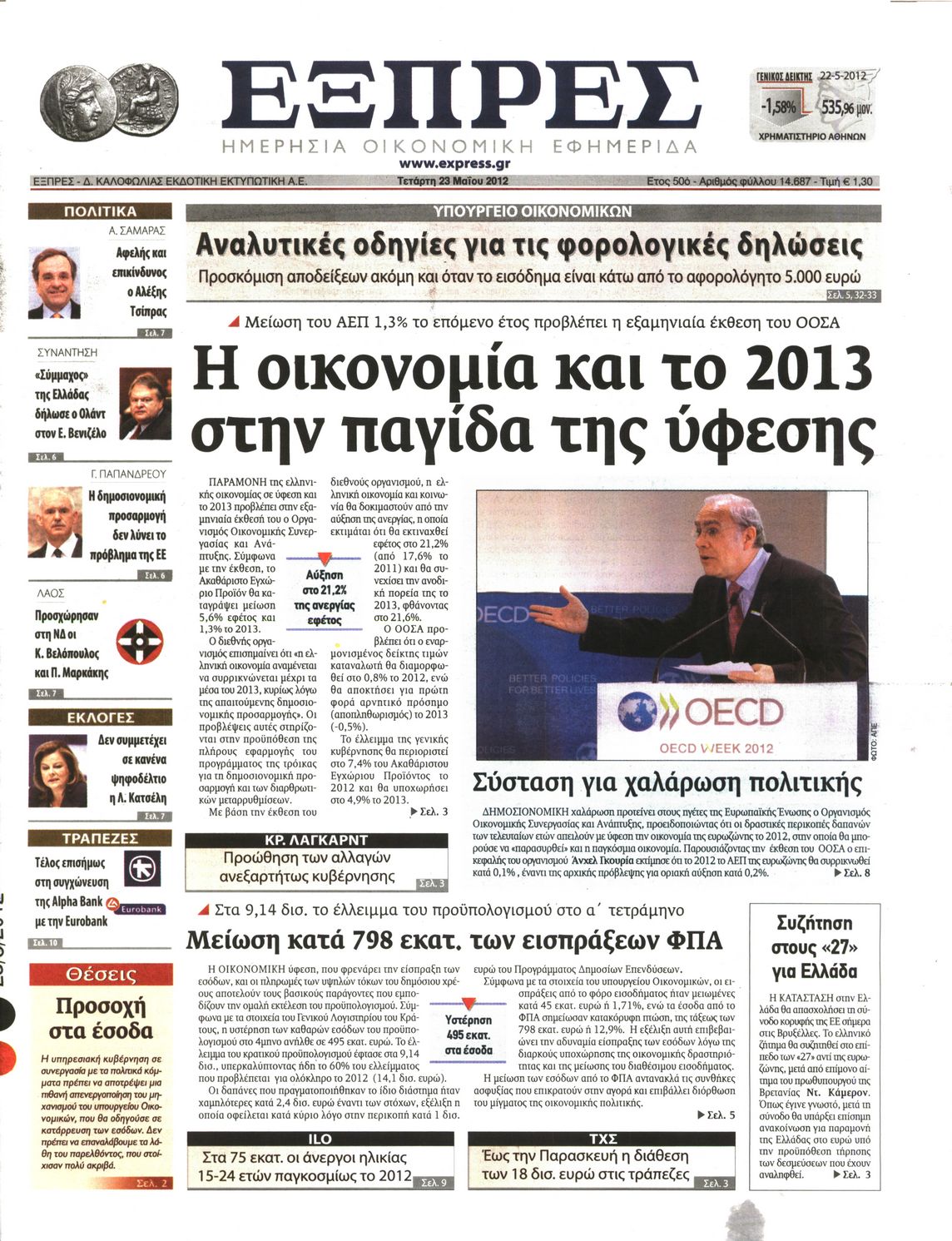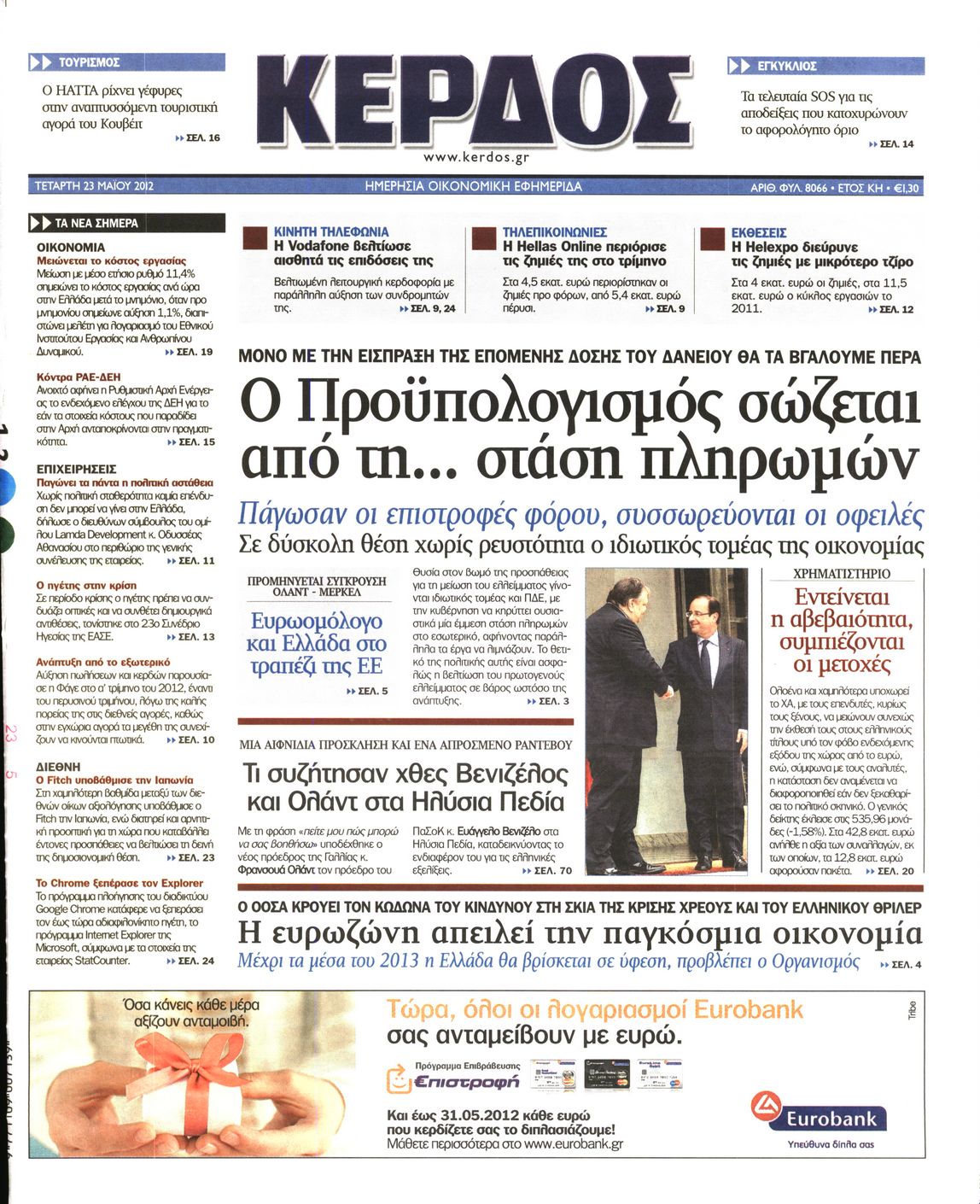 Τα οικονομικά πρωτοσέλιδα Enikos Newsroom 07:51, Τετάρτη 23 Μαΐου 2012 Media ΕΦΗΜΕΡΙΔΕΣ ΠΡΩΤΟΣΕΛΙΔΑ Μοιράσου το: σχολίασε κι εσύ (0 σχόλια) Ακολουθήστε το enikos.gr στο Google News και μάθετε πρώτοι όλες τις ειδήσεις Δείτε όλες τις τελευταίες ειδήσεις από την Ελλάδα και τον Κόσμο στο enikos.gr Ειδήσεις Ροή Ειδήσεων 6 ώρες πριν Μητσοτάκης: Αναγκαία η μεταρρύθμιση του πρωτογενούς τομέα – Τα 6 νέα μέτρα για το στεγαστικό και οι αναφορές σε «Ιθάκη» και «πολιτικούς του καναπέ» 5 ώρες πριν Δάνεια σε ελβετικό φράγκο: Τα βασικά σημεία της ρύθμισης – ανάσας για 40.000 δανειολήπτες – Αναλυτικός οδηγός με ερωτήσεις και απαντήσεις 5 ώρες πριν Κυψέλη: Εξιτήριο πήρε η 14χρονη μαθήτρια που μαχαιρώθηκε από την 16χρονη σε σχολείο – «Θέλω να βοηθήσω το παιδί, έχει μπλέξει με κακές παρέες» 4 ώρες πριν Τραμπ: Γιατί κατέθεσε τώρα την αγωγή κατά του BBC – Πώς η κίνησή του εξυπηρετεί το νέο δόγμα του για «αντίσταση» στην Ευρώπη, υπέρ των συντηρητικών 5 ώρες πριν ΟΠΕΚΕΠΕ – Παράνομες επιδοτήσεις: Ελεύθεροι με περιοριστικούς όρους και οι 7 κατηγορούμενοι που απολογήθηκαν σήμερα 5 ώρες πριν Ανακαλύφθηκε βυθισμένη πέτρινη κατασκευή ανοιχτά της Κριμαίας – Αποτελεί μέρος αρχαίας ελληνικής αποικίας 6 ώρες πριν Ύπνος: Αυτό μπορεί να είναι το χειρότερο λάθος για το βιολογικό ρολόι σας, σύμφωνα με ειδικό 7 ώρες πριν Αριθμολογία: Οι άνθρωποι που έχουν γεννηθεί αυτές τις 3 ημερομηνίες, προσελκύουν μεγάλη τύχη πριν από το τέλος του 2025 9 ώρες πριν Οι 7 συμπεριφορές που μαρτυρούν ότι ένας άνδρας επενδύει μακροπρόθεσμα σε μια σχέση 15 λεπτά πριν Παναγιώτης Μπουγιούρης: «Έχω μια αφέλεια σε σχέση με τη δουλειά μου» 30 λεπτά πριν Παναθηναϊκός: Η έντονη επιθυμία του Ματίας Λεσόρ να επιστρέψει στα γήπεδα – «Μου λείπει πολύ το γ@@@@». 45 λεπτά πριν Νίκος Πλακιάς: Η Μαρία Καρυστιανού πλέον θα κρίνεται ως πολιτικός και όχι ως συγγενής 1 ώρα πριν Ντόναλντ Τραμπ: Κάλυψε απόλυτα την προσωπάρχη του Λευκού Οίκου: «Ναι, έχω προσωπικότητα αλκοολικού» 1 ώρα πριν ΗΠΑ: Στην αγορά δύο Boeing 747-8 προχωρά η Πολεμική Αεροπορία για την υποστήριξη του προεδρικού στόλου ENIKOS NETWORK Αίτημα ΙΣΑ για την εξαίρεση των προσωπικών γιατρών από τις κατ’ οίκον επισκέψεις Η σκανδιναβική μέθοδος στον ύπνο που μπορεί να σώσει έναν γάμο Πιερρακάκης: Ο προϋπολογισμός συμβάλλει ουσιαστικά στην ενίσχυση της αγοραστικής δύναμης της πλειονότητας των εργαζομένων e-ΕΦΚΑ: Παρατείνεται η προθεσμία για την υποβολή ΑΠΔ – Ποιους αφορά Σύγχρονος Νοστράδαμος: Προειδοποιεί για «μεγάλο γεγονός» τους επόμενους μήνες που θα συγκλονίσει τη Βρετανία και τον κόσμο Τεστ παρατηρητικότητας: Μπορείτε να βρείτε τις 3 διαφορές στις εικόνες με έναν πιγκουίνο σε 14 δευτερόλεπτα περισσότερα 20:06 , Τρίτη 16 Δεκεμβρίου 2025 Ο ΣΚΑΙ καταγγέλλει τον ΕΚΚΟΜΕΔ Επιστολή με την οποία καταγράφει την έντονη διαμαρτυρία του προς τον διευθύνοντα σύμβουλο του... 17:40 , Τρίτη 16 Δεκεμβρίου 2025 Eurovision: Στις 4 Ιανουαρίου αποκαλύπτονται τα 28 τραγούδια του ελληνικού τελικού Η αγωνία τελειώνει, η γιορτή της Eurovision αρχίζει στην ΕΡΤ από τις πρώτες ημέρες της νέας χρ... 17:09 , Τρίτη 16 Δεκεμβρίου 2025 Alter Ego Media: Βαθύτατη θλίψη και ειλικρινή συλλυπητήρια για την απώλεια της Ειρήνης Μαρινάκη Τη βαθύτατη θλίψη και τα ειλικρινή συλλυπητήριά της εκφράζει η Alter Ego Media για τον θάνατο ... 13:00 , Τρίτη 16 Δεκεμβρίου 2025 «Στο Παρά Πέντε – 20 Χρόνια Μετά»: Κυκλοφόρησε το τρέιλερ του επετειακού επεισοδίου της θρυλικής σειράς – Πότε θα προβληθεί Η