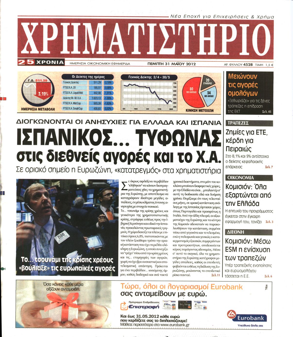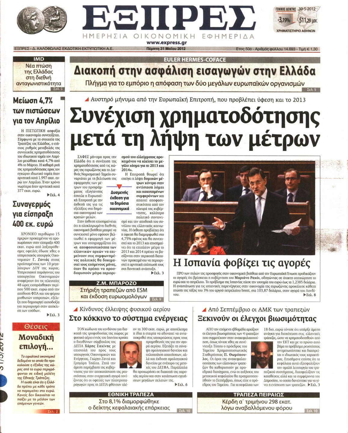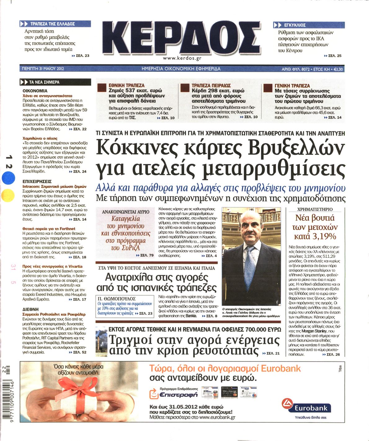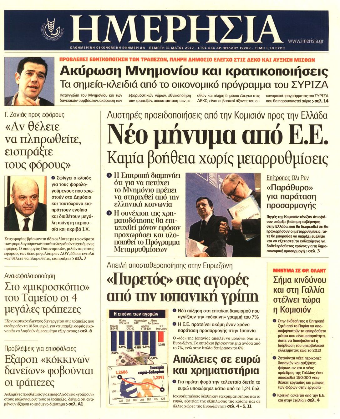Τα οικονομικά πρωτοσέλιδα Enikos Newsroom 07:47, Πέμπτη 31 Μαΐου 2012 Media ΕΦΗΜΕΡΙΔΕΣ ΠΡΩΤΟΣΕΛΙΔΑ Μοιράσου το: σχολίασε κι εσύ (0 σχόλια) Ακολουθήστε το enikos.gr στο Google News και μάθετε πρώτοι όλες τις ειδήσεις Δείτε όλες τις τελευταίες ειδήσεις από την Ελλάδα και τον Κόσμο στο enikos.gr Ειδήσεις Ροή Ειδήσεων 6 ώρες πριν Μητσοτάκης: Αναγκαία η μεταρρύθμιση του πρωτογενούς τομέα – Τα 6 νέα μέτρα για το στεγαστικό και οι αναφορές σε «Ιθάκη» και «πολιτικούς του καναπέ» 5 ώρες πριν Δάνεια σε ελβετικό φράγκο: Τα βασικά σημεία της ρύθμισης – ανάσας για 40.000 δανειολήπτες – Αναλυτικός οδηγός με ερωτήσεις και απαντήσεις 5 ώρες πριν Κυψέλη: Εξιτήριο πήρε η 14χρονη μαθήτρια που μαχαιρώθηκε από την 16χρονη σε σχολείο – «Θέλω να βοηθήσω το παιδί, έχει μπλέξει με κακές παρέες» 5 ώρες πριν Τραμπ: Γιατί κατέθεσε τώρα την αγωγή κατά του BBC – Πώς η κίνησή του εξυπηρετεί το νέο δόγμα του για «αντίσταση» στην Ευρώπη, υπέρ των συντηρητικών 6 ώρες πριν ΟΠΕΚΕΠΕ – Παράνομες επιδοτήσεις: Ελεύθεροι με περιοριστικούς όρους και οι 7 κατηγορούμενοι που απολογήθηκαν σήμερα 5 ώρες πριν Ανακαλύφθηκε βυθισμένη πέτρινη κατασκευή ανοιχτά της Κριμαίας – Αποτελεί μέρος αρχαίας ελληνικής αποικίας 6 ώρες πριν Ύπνος: Αυτό μπορεί να είναι το χειρότερο λάθος για το βιολογικό ρολόι σας, σύμφωνα με ειδικό 7 ώρες πριν Αριθμολογία: Οι άνθρωποι που έχουν γεννηθεί αυτές τις 3 ημερομηνίες, προσελκύουν μεγάλη τύχη πριν από το τέλος του 2025 9 ώρες πριν Οι 7 συμπεριφορές που μαρτυρούν ότι ένας άνδρας επενδύει μακροπρόθεσμα σε μια σχέση 3 λεπτά πριν Ντόναλντ Τραμπ: Ξένη τρομοκρατική οργάνωση η Βενεζουέλα – Πλήρης αποκλεισμός των δεξαμενόπλοιων από και προς το Καράκας 18 λεπτά πριν Παναγιώτης Μπουγιούρης: «Έχω μια αφέλεια σε σχέση με τη δουλειά μου» 33 λεπτά πριν Παναθηναϊκός: Η έντονη επιθυμία του Ματίας Λεσόρ να επιστρέψει στα γήπεδα – «Μου λείπει πολύ το γ@@@@». 48 λεπτά πριν Νίκος Πλακιάς: Η Μαρία Καρυστιανού πλέον θα κρίνεται ως πολιτικός και όχι ως συγγενής 1 ώρα πριν Ντόναλντ Τραμπ: Κάλυψε απόλυτα την προσωπάρχη του Λευκού Οίκου: «Ναι, έχω προσωπικότητα αλκοολικού» ENIKOS NETWORK Αίτημα ΙΣΑ για την εξαίρεση των προσωπικών γιατρών από τις κατ’ οίκον επισκέψεις Η σκανδιναβική μέθοδος στον ύπνο που μπορεί να σώσει έναν γάμο Πιερρακάκης: Ο προϋπολογισμός συμβάλλει ουσιαστικά στην ενίσχυση της αγοραστικής δύναμης της πλειονότητας των εργαζομένων e-ΕΦΚΑ: Παρατείνεται η προθεσμία για την υποβολή ΑΠΔ – Ποιους αφορά Σύγχρονος Νοστράδαμος: Προειδοποιεί για «μεγάλο γεγονός» τους επόμενους μήνες που θα συγκλονίσει τη Βρετανία και τον κόσμο Τεστ παρατηρητικότητας: Μπορείτε να βρείτε τις 3 διαφορές στις εικόνες με έναν πιγκουίνο σε 14 δευτερόλεπτα περισσότερα 20:06 , Τρίτη 16 Δεκεμβρίου 2025 Ο ΣΚΑΙ καταγγέλλει τον ΕΚΚΟΜΕΔ Επιστολή με την οποία καταγράφει την έντονη διαμαρτυρία του προς τον διευθύνοντα σύμβουλο του... 17:40 , Τρίτη 16 Δεκεμβρίου 2025 Eurovision: Στις 4 Ιανουαρίου αποκαλύπτονται τα 28 τραγούδια του ελληνικού τελικού Η αγωνία τελειώνει, η γιορτή της Eurovision αρχίζει στην ΕΡΤ από τις πρώτες ημέρες της νέας χρ... 17:09 , Τρίτη 16 Δεκεμβρίου 2025 Alter Ego Media: Βαθύτατη θλίψη και ειλικρινή συλλυπητήρια για την απώλεια της Ειρήνης Μαρινάκη Τη βαθύτατη θλίψη και τα ειλικρινή συλλυπητήριά της εκφράζει η Alter Ego Media για τον θάνατο ... 13:00 , Τρίτη 16 Δεκεμβρίου 2025 «Στο Παρά Πέντε – 20 Χρόνια Μετά»: Κυκλοφόρησε το τρέιλερ του επετειακού επεισοδίου της θρυλικής σε