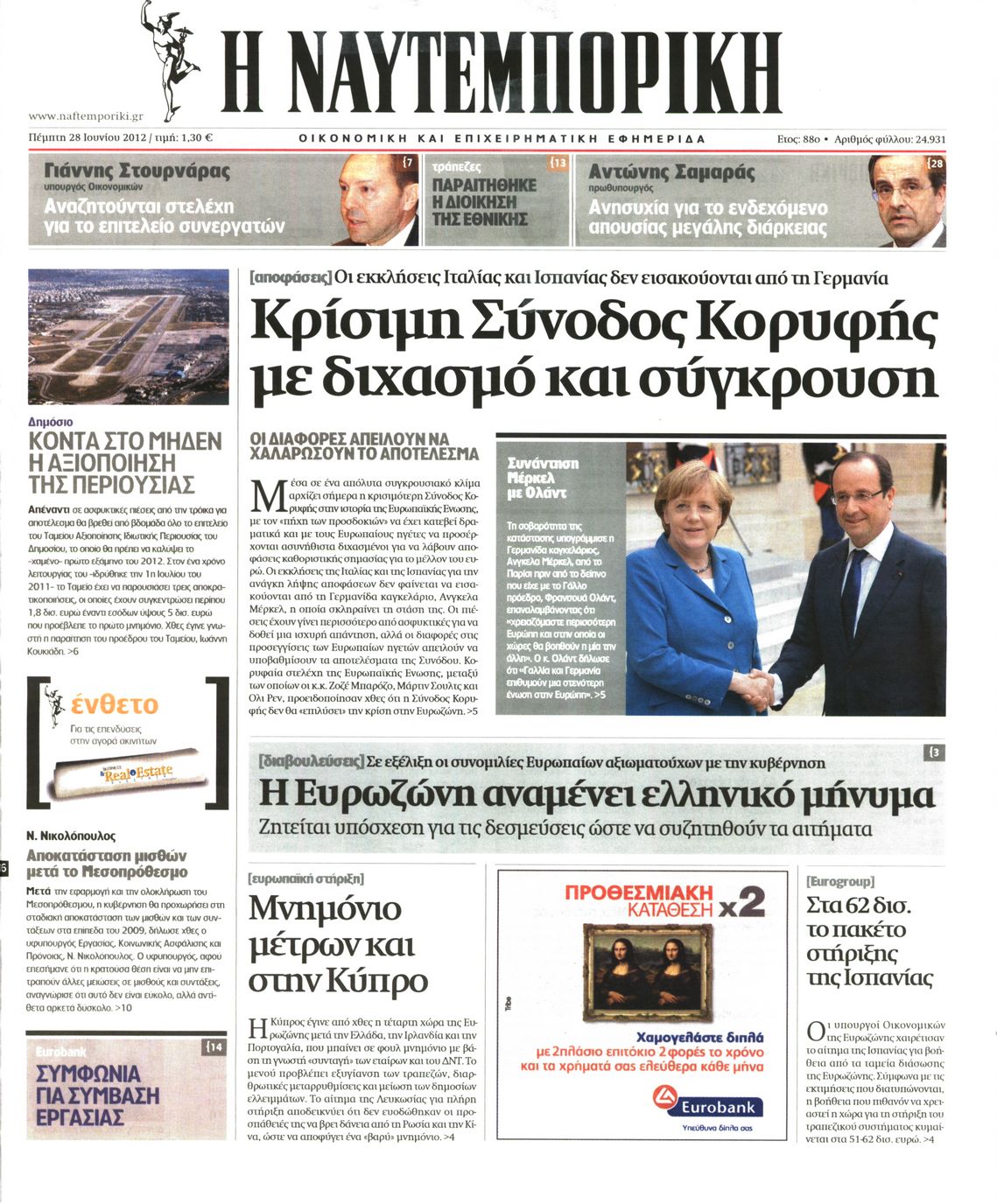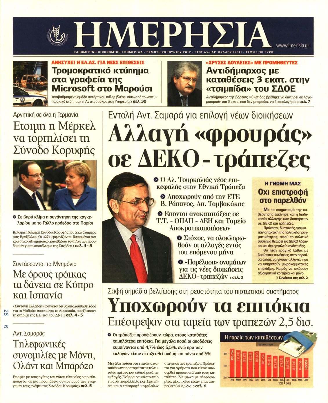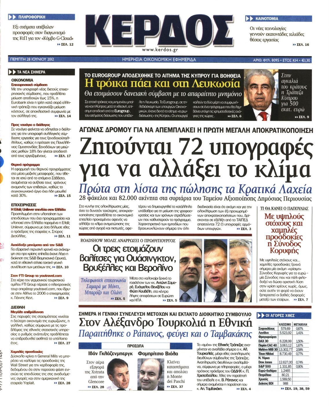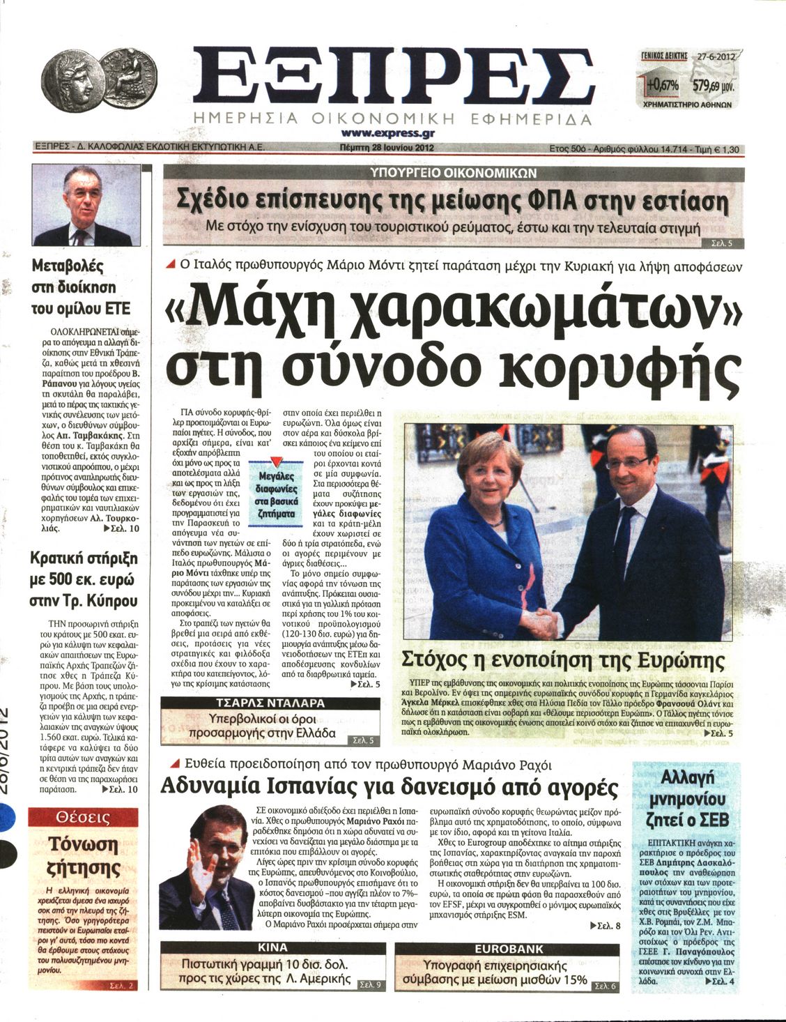 Τα οικονομικά πρωτοσέλιδα Enikos Newsroom 07:49, Πέμπτη 28 Ιουνίου 2012 Media ΕΦΗΜΕΡΙΔΕΣ ΠΡΩΤΟΣΕΛΙΔΑ Μοιράσου το: σχολίασε κι εσύ (0 σχόλια) Ακολουθήστε το enikos.gr στο Google News και μάθετε πρώτοι όλες τις ειδήσεις Δείτε όλες τις τελευταίες ειδήσεις από την Ελλάδα και τον Κόσμο στο enikos.gr Ειδήσεις Ροή Ειδήσεων 25 λεπτά πριν Πώς στήθηκε η επιχείρηση «Ίπαλλος» που οδήγησε στη σύλληψη του «Έλληνα Εσκομπάρ» – «Ο πόλεμος ενάντια στους εμπόρους ναρκωτικών θα συνεχιστεί» 10 λεπτά πριν Δίκη Χρυσής Αυγής: Την ενοχή και των 42 κατηγορουμένων ζητά η εισαγγελέας 30 λεπτά πριν Κυψέλη: Στη φυλακή η 16χρονη που μαχαίρωσε συμμαθήτριά της 3 ώρες πριν Αμοργός: «Θα προσπαθήσω να το κάνω κάθε μέρα» – Ποιος είναι ο αγρότης που έστησε μόνος του το πρώτο μπλόκο στο νησί 1 ώρα πριν Τραγωδία στην Αλεξανδρούπολη: Παιδάκι 3 ετών μεταφέρθηκε νεκρό από τη μητέρα του στο νοσοκομείο 36 λεπτά πριν Τα 3 ζώδια που θα δουν τη ζωή τους να αλλάζει ριζικά το 2026 – «Όλα γίνονται καλύτερα σταδιακά» 6 ώρες πριν «Δεν είχα κλάψει από τότε που διαγνώστηκα με καρκίνο, ώσπου ένα τηλεφώνημα με έκανε να λυγίσω» – Η συγκλονιστική εξομολόγηση ενός άνδρα 2 ώρες πριν Ο σπάνιος σεισμός που έλυσε τα χέρια των επιστημόνων – Αποκάλυψε ακριβώς όσα αναζητούσαν 7 ώρες πριν 20 χρόνια τα Χριστούγεννα ξεκινούν στα Public με μεγάλη ποικιλία σε δώρα! 4 λεπτά πριν Τραγωδία στην Αχαΐα: 48χρονος κατέρρευσε στο κυνήγι μπροστά στα μάτια του πατέρα του 10 λεπτά πριν Δίκη Χρυσής Αυγής: Την ενοχή και των 42 κατηγορουμένων ζητά η εισαγγελέας 11 λεπτά πριν Μαρκέλλα Γιαννάτου: «Είμαι κοντά στα 14 χρόνια σε ψυχανάλυση – Είχα αρχίσει να έχω κρίσεις άγχους, νόμιζα ότι θα πεθάνω» 18 λεπτά πριν Υπουργείο Αγροτικής Ανάπτυξης: Πώς θα γίνει η πληρωμή αγροτεμαχίων έως 20 στρέμματα παρά τα ζητήματα ΚΑΕΚ 25 λεπτά πριν Πώς στήθηκε η επιχείρηση «Ίπαλλος» που οδήγησε στη σύλληψη του «Έλληνα Εσκομπάρ» – «Ο πόλεμος ενάντια στους εμπόρους ναρκωτικών θα συνεχιστεί» ENIKOS NETWORK Σοβαροί κίνδυνοι από τη λάθος χορήγηση φαρμάκου για τις αιμορραγίες-Συστάσεις προς τους γιατρούς 5 πράγματα που αποφεύγει γαστρεντερολόγος για να μειώσει τον κίνδυνο καρκίνου του εντέρου Eurostat: Κάτω από την αρχική εκτίμηση της Υπηρεσίας ο πληθωρισμός στην Ελλάδα τον Νοέμβριο του 2025 – Tα στοιχεία για την ... Συντάξεις Ιανουαρίου 2026: Σε ποιους θα πιστωθούν την Πέμπτη τα χρήματα και τι αυξήσεις θα δοθούν – Δείτε αναλυτικά παραδεί... Χαρτογραφώντας το «σημείο χωρίς επιστροφή»: Για πρώτη φορά αποκαλύπτεται με λεπτομέρεια το ακανθώδες όριο της ατμόσφαιρας τ... Η Google καταργεί τη λειτουργία «dark web report» – Πώς θα μπορούν οι χρήστες να διαγράφουν τα δεδομένα τους περισσότερα 12:35 , Τετάρτη 17 Δεκεμβρίου 2025 Μίρκα Παπακωνσταντίνου: «Δεν ήμουν αισιόδοξη για τα νούμερα – Είμαι ρεαλίστρια» Στα γυρίσματα του εορταστικού επεισοδίου της αγαπημένης σειράς “Το Σόι Σου”, βρέθηκε η κάμερα ... 12:12 , Τετάρτη 17 Δεκεμβρίου 2025 Ακούστε την εκπομπή του Νίκου Χατζηνικολάου 17/12/2025 Ακούστε την εκπομπή του Νίκου Χατζηνικολάου στον ραδιοφωνικό σταθμό RealFm 97,8, την Τετάρτη 1... 11:35 , Τετάρτη 17 Δεκεμβρίου 2025 Home Alone: Το σπίτι της ταινίας θα ανακαινιστεί – Επιστροφή στην αισθητική της δεκαετίας του ’90 Οι νέοι ιδιοκτήτες του πραγματικού σπιτιού που παρουσιάζεται στην κλασική ταινία του 1990 «Hom... 11:25 , Τετάρτη 17 Δεκεμβρίου 2025 Grand Hotel: Απόψε το τελευταίο επεισόδιο της χρονιάς – Όλα τα μυστικά μένουν εδώ Το τελευταίο επεισόδιο της χρονιάς της σειράς 
