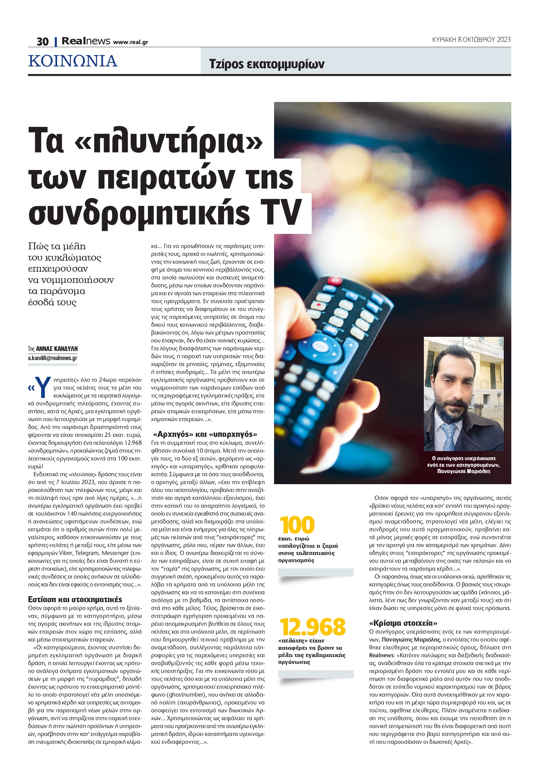 Για τη συμμετοχή τους στο κύκλωμα, συνελήφθησαν συνολικά 10 άτομα. Μετά την απολογία τους, τα δύο εξ αυτών, φερόμενα ως «αρχηγός» και «υπαρχηγός», κρίθηκαν προφυλακιστέα. Σύμφωνα με τα όσα τους αποδίδονται, ο αρχηγός, μεταξύ άλλων, «έχει την επίβλεψη όλου του πελατολογίου, προβαίνει στην αναζήτηση και αγορά κατάλληλου εξοπλισμού, έχει στην κατοχή του το απαραίτητο λογισμικό, το οποίο εν συνεχεία εγκαθιστά στις συσκευές αναμετάδοσης, αλλά και διαμοιράζει στα υπόλοιπα μέλη και είναι ενήμερος για όλες τις πληρωμές των πελατών από τους “εισπράκτορες” της οργάνωσης, ρόλο που, πέραν των άλλων, έχει και ο ίδιος. Ο ανωτέρω διαχειρίζεται το σύνολο των εισπράξεων, είναι σε συχνή επαφή με τον “ταμία” της οργάνωσης, με τον οποίο έχει συγγενική σχέση, προκειμένου αυτός να παραλάβει τα χρήματα από τα υπόλοιπα μέλη της οργάνωσης και να τα κατανείμει στη συνέχεια ανάλογα με τη βαθμίδα, τα αντίστοιχα ποσοστά στο κάθε μέλος. Τέλος, βρίσκεται σε εικοσιτετράωρη εγρήγορση προκειμένου να παρέχει απομακρυσμένη βοήθεια σε όλους τους πελάτες και στα υπόλοιπα μέλη, σε περίπτωση που δημιουργηθεί τεχνικό πρόβλημα με την αναμετάδοση, συλλέγοντας παράλληλα πληροφορίες για τις παρεχόμενες υπηρεσίες και αναβαθμίζοντάς τες κάθε φορά μέσω τεχνικής υποστήριξης. Για την επικοινωνία τόσο με τους πελάτες όσο και με τα υπόλοιπα μέλη της οργάνωσης, χρησιμοποιεί επιχειρησιακό τηλέφωνο (ghostnumber), που ανήκει σε αλλοδαπό πολίτη (αχυράνθρωπος), προκειμένου να αποφεύγει τον εντοπισμό των διωκτικών Αρχών… Χρησιμοποιώντας ως κεφάλαιο τα χρήματα που προέρχονται από την ανωτέρω εγκληματική δράση, ιδρύει καταστήματα υγειονομικού ενδιαφέροντος…».
