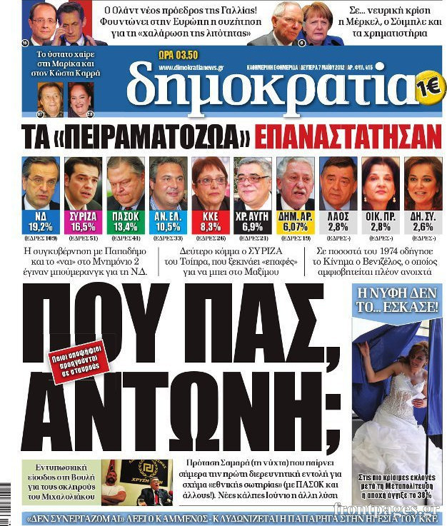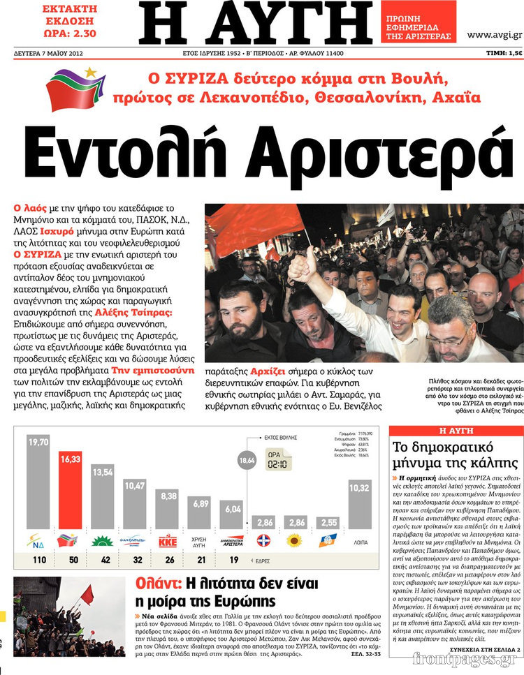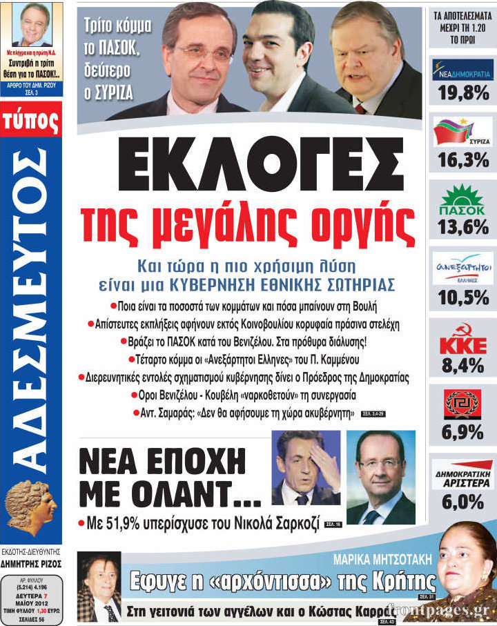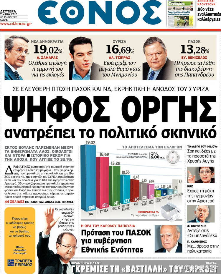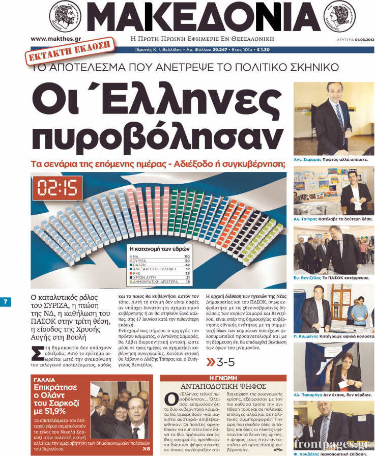 Τα πολιτικά πρωτοσέλιδα Enikos Newsroom 08:28, Δευτέρα 07 Μαΐου 2012 Media Διαβάστε πώς είδε ο ελληνικός τύπος τα αποτελέσματα των εκλογών. ΕΦΗΜΕΡΙΔΕΣ Μοιράσου το: σχολίασε κι εσύ (0 σχόλια) Ακολουθήστε το enikos.gr στο Google News και μάθετε πρώτοι όλες τις ειδήσεις Δείτε όλες τις τελευταίες ειδήσεις από την Ελλάδα και τον Κόσμο στο enikos.gr Ειδήσεις Ροή Ειδήσεων 53 λεπτά πριν Αυξάνουν την πίεση προς την κυβέρνηση οι αγρότες: Κλείνουν παρακαμπτήριους και ανοίγουν διόδια – Τι θα γίνει τις γιορτές 44 λεπτά πριν Φοινικούντα: Το Σάββατο απολογείται ο 30χρονος γιος γνωστού επιχειρηματία της Πλάκας που παραδόθηκε – Όσα είπε στους αστυνομικούς και ο ρόλος του στο έγκλημα 26 λεπτά πριν Μπορεί ο Μαδούρο να αντέξει τον αποκλεισμό του Τραμπ; Τι θα χρειαστεί η Ουάσινγκτον για να τον ανατρέψει 2 ώρες πριν Δημοσκόπηση Metron Analysis: Στις 10 μονάδες η διαφορά ΝΔ-ΠΑΣΟΚ, στην 3η θέση η Πλεύση Ελευθερίας – 8 στους 10 στηρίζουν τον αγώνα των αγροτών 2 ώρες πριν Πρίγκιπας Ουίλιαμ – Κέιτ: Η νέα οικογενειακή φωτογραφία για τις Χριστουγεννιάτικες κάρτες του 2025 2 ώρες πριν Ύπνος: Η απλή βραδινή ρουτίνα για να προστατεύσετε τα μαλλιά σας από το κρύο κατά τη διάρκεια του χειμώνα 2 ώρες πριν Manifesting: Πώς να συναντήσετε τον σύντροφο της ζωής σας, ανάλογα με τον μήνα γέννησής σας 2 ημέρες πριν 20 χρόνια τα Χριστούγεννα ξεκινούν στα Public με μεγάλη ποικιλία σε δώρα! 29 λεπτά πριν Αρχαιολόγοι ανακάλυψαν ρωμαϊκά τεχνουργήματα από μια πόλη που δεν υπήρξε ποτέ – Τα τρία εντυπωσιακά κτίρια και ο αμφορέας με τις… σαρδέλες 10 λεπτά πριν Παναθηναϊκός – Χάποελ Τελ Αβίβ 93-82: Με… φόρα από την Κωνσταντινούπολη 26 λεπτά πριν Μπορεί ο Μαδούρο να αντέξει τον αποκλεισμό του Τραμπ; Τι θα χρειαστεί η Ουάσινγκτον για να τον ανατρέψει 29 λεπτά πριν Αρχαιολόγοι ανακάλυψαν ρωμαϊκά τεχνουργήματα από μια πόλη που δεν υπήρξε ποτέ – Τα τρία εντυπωσιακά κτίρια και ο αμφορέας με τις… σαρδέλες 31 λεπτά πριν Στο ΟΑΚΑ για το «Παναθηναϊκός – Χάποελ» η Κίμπερλι Γκίλφοϊλ – ΦΩΤΟ 39 λεπτά πριν Ούρσουλα φον ντερ Λάιεν: Μετατίθεται για τον Ιανουάριο η υπογραφή της εμπορικής συμφωνίας «ΕΕ-MERCOSUR» ENIKOS NETWORK Σε περίοδο αυξημένης δραστηριότητας η γρίπη στην Ελλάδα-Μέτρα προστασίας από τον ΕΟΔΥ Σκέφτεστε συνέχεια συζητήσεις που έχετε κάνει; Τι σημαίνει αυτό, σύμφωνα με ειδικό Στεγαστικό: Τι λέει η ΠΟΜΙΔΑ για τα νέα μέτρα που ανακοίνωσε ο Κυριάκος Μητσοτάκης Λαγκάρντ: Αισιόδοξη για την ανάπτυξη της Ευρωζώνης, αβέβαιη για τον πληθωρισμό Χαρτογραφώντας το «σημείο χωρίς επιστροφή»: Για πρώτη φορά αποκαλύπτεται με λεπτομέρεια το ακανθώδες όριο της ατμόσφαιρας τ... Η Google καταργεί τη λειτουργία «dark web report» – Πώς θα μπορούν οι χρήστες να διαγράφουν τα δεδομένα τους περισσότερα 17:45 , Πέμπτη 18 Δεκεμβρίου 2025 ROUK ZOUK: Εορταστικό επεισόδιο με καλεσμένους τους πρωταγωνιστές του «Γιατί ρε πατέρα» Το Σάββατο 20 Δεκεμβρίου στις 21:00, η Ζέτα Μακρυπούλια υποδέχεται εκλεκτούς ηθοποιούς που όλο... 17:20 , Πέμπτη 18 Δεκεμβρίου 2025 Άγιος έρωτας: Η Χριστίνα εξομολογείται στον πατέρα Νικόλαο, απόψε στις 21:00 στον Alpha Η Νότα αποφασίζει να εκδικηθεί τον Πέτρο και τον Στέφανο, για χάρη του Λούη, όμως τα πράγματα ... 16:50 , Πέμπτη 18 Δεκεμβρίου 2025 Να μ’ αγαπάς: Ζωή και Φωτεινή συμφιλιώνονται ως μάνα με κόρη, απόψε στις 20:00 Η ταυτότητα του Άγγελου αποκαλύπτεται στο νέο επεισόδιο της σειράς “Να μ’ αγαπάς... 15:52 , Πέμπτη 18 Δεκεμβρίου 2025 Το Σπίτι Δίπλα Στο Ποτάμι: Το καθηλωτικό τελευταίο επεισόδιο για το 2025 