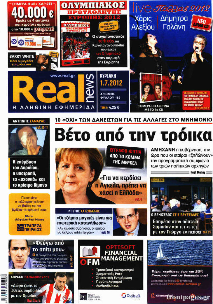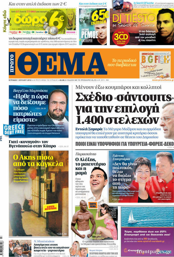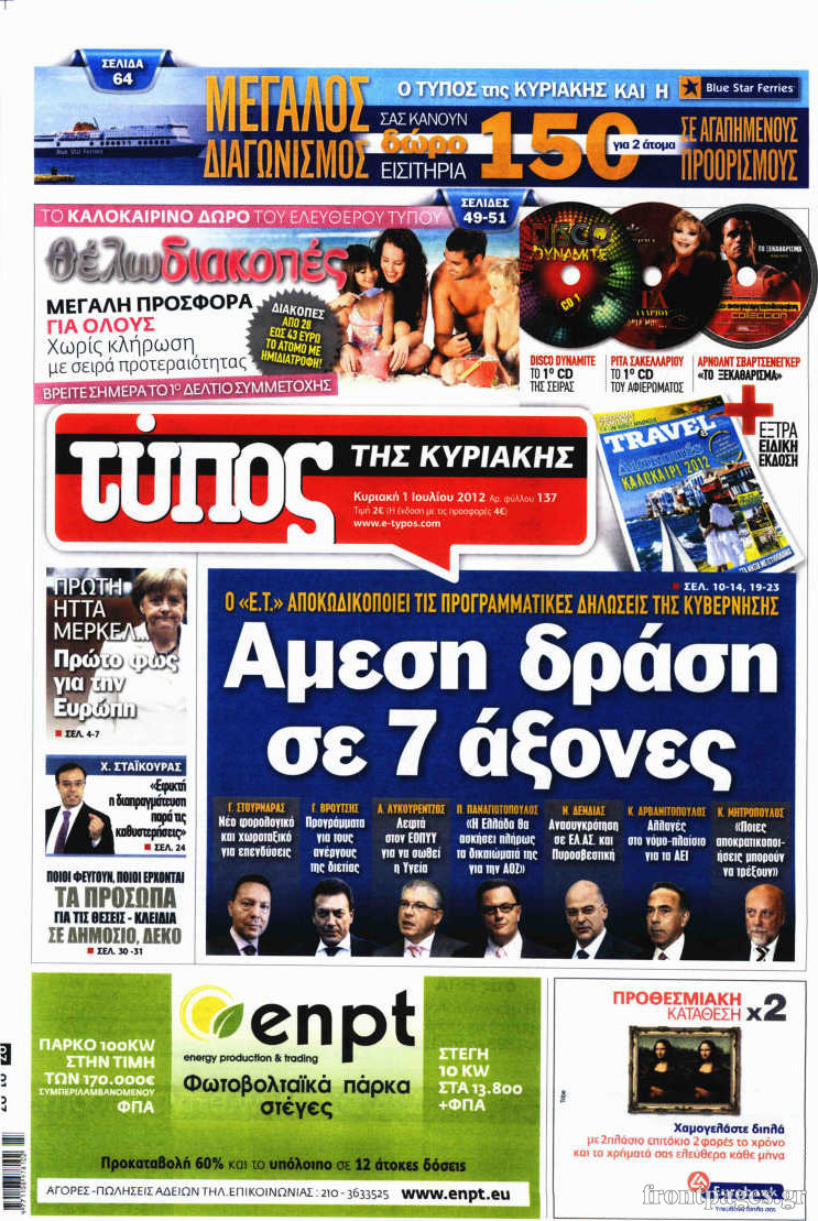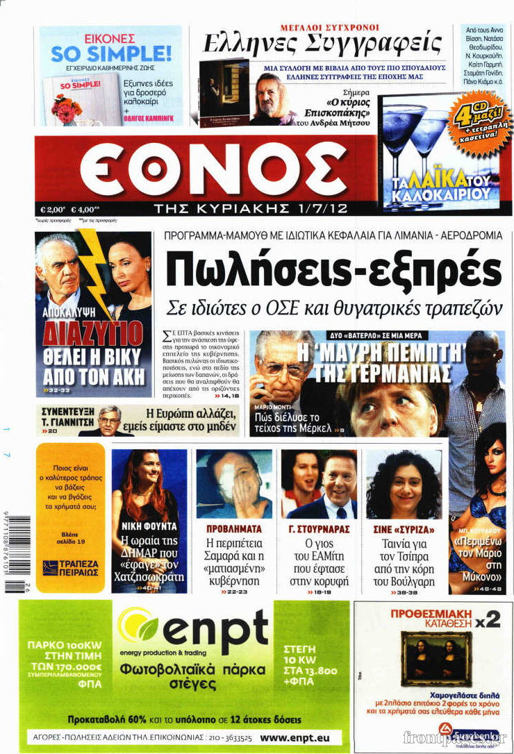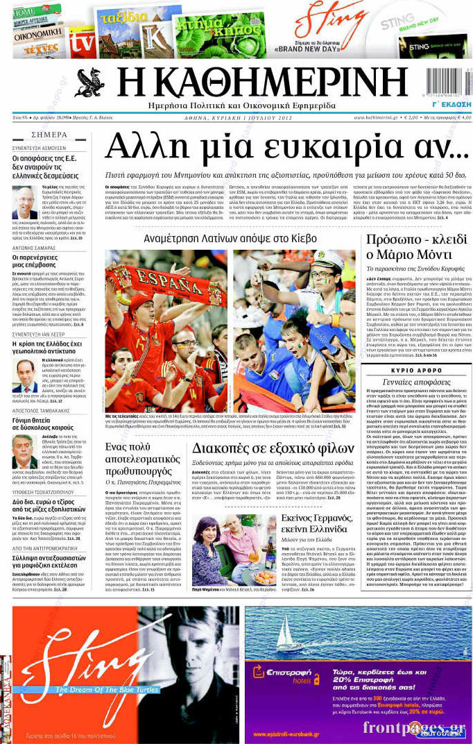 Τα πρωτοσέλιδα σήμερα Enikos Newsroom 09:48, Κυριακή 01 Ιουλίου 2012 Media ΕΦΗΜΕΡΙΔΕΣ Μοιράσου το: σχολίασε κι εσύ (0 σχόλια) Ακολουθήστε το enikos.gr στο Google News και μάθετε πρώτοι όλες τις ειδήσεις Δείτε όλες τις τελευταίες ειδήσεις από την Ελλάδα και τον Κόσμο στο enikos.gr Ειδήσεις Ροή Ειδήσεων 4 ώρες πριν Χριστούγεννα στα μπλόκα: Επιμένουν στις κινητοποιήσεις τους οι αγρότες – Ανοίγουν τα διόδια το Σαββατοκύριακο 5 ώρες πριν Ουκρανία: Η άνευ προηγουμένου επίθεση σε ρωσικό τάνκερ στη Μεσόγειο και το μήνυμα προς στον Πούτιν – Το «μακρύ χέρι» του Κιέβου 4 ώρες πριν Πούτιν: Τα μηνύματα σε Ευρώπη και ΝΑΤΟ από το μαραθώνιο «σόου» του – Η απαίτηση για «σεβασμό» και η ειρήνη «με τους όρους» της Μόσχας 5 ώρες πριν Τραμπ: Δεν αποκλείει την πιθανότητα ενός πολέμου στη Βενεζουέλα – «Ο Μαδούρο ξέρει καλύτερα από τον καθένα τι ακριβώς θέλω» 6 ώρες πριν Συνεχίζει να προκαλεί ο Μίτσκοσκι: «Για μένα το όνομα Μακεδονία είναι ιερό» 4 ώρες πριν Ανακαλύφθηκαν αρχαία χρυσά νομίσματα 2.200 ετών που απεικονίζουν τον θεό Απόλλωνα – Η άγνωστη σύνδεση με τον Φίλιππο Β΄ της Μακεδονίας 5 ώρες πριν Ύπνος: Μια κρυφή κατάσταση του εγκεφάλου πριν από τον ύπνο μπορεί να είναι το “κλειδί” για υψηλή ευφυΐα και δημιουργικότητα 6 ώρες πριν Αριθμολογία: Οι άνθρωποι που έχουν γεννηθεί αυτές τις 4 ημερομηνίες, συχνά παρεξηγούνται – «Η καλοσύνη τους κρύβει τεράστια δύναμη» 7 ώρες πριν Ξεχάστε το καθάρισμα το Σαββατοκύριακο: Ο «κανόνας των 20 λεπτών» που θα σας λύσει τα χέρια 16 λεπτά πριν GNTM: Η Ξένια Τσίρκοβα αναδείχθηκε μεγάλη νικήτρια και πήρε τις 50.000 ευρώ – Ποιος βρέθηκε σε απόσταση αναπνοής; 31 λεπτά πριν Θεσσαλονίκη: Εξαφανίστηκε 13χρονος από χώρο φιλοξενίας ασυνόδευτων ανηλίκων στο Ωραιόκαστρο 41 λεπτά πριν Ντόναλντ Τραμπ: «Πολύ βαριά αντίποινα» στη Συρία – «Πλήττουμε πολύ δυνατά οχυρά του Ισλαμικού Κράτους» 56 λεπτά πριν Εξάρχεια: Ένταση με μολότοφ, χημικά και κρότου λάμψης 1 ώρα πριν ΗΠΑ: Τραγωδία στην Αλαμπάμα – Σκότωσε την δημοσιογράφο σύζυγό του και αυτοκτόνησε μπροστά στον 3χρονο γιο τους ENIKOS NETWORK Το ΕΚΑΒ τιμήθηκε από την Ακαδημία Αθηνών για τα 40 χρόνια προσφοράς του Έχετε πραγματικά μεγάλη καρδιά; 10 χαρακτηριστικά όσων έχουν καλοσύνη Αναστολή μέτρων αναγκαστικής εκτέλεσης για κτηνοτρόφους που πλήττονται από την ευλογιά των αιγοπροβάτων Πλήρης επάρκεια προϊόντων στις λαϊκές της Αττικής, παρά τις αγροτικές κινητοποιήσεις – Τι απαντούν οι πωλητές Χαρτογραφώντας το «σημείο χωρίς επιστροφή»: Για πρώτη φορά αποκαλύπτεται με λεπτομέρεια το ακανθώδες όριο της ατμόσφαιρας τ... Η Google καταργεί τη λειτουργία «dark web report» – Πώς θα μπορούν οι χρήστες να διαγράφουν τα δεδομένα τους περισσότερα 02:50 , Σάββατο 20 Δεκεμβρίου 2025 GNTM: Η Ξένια Τσίρκοβα αναδείχθηκε μεγάλη νικήτρια και πήρε τις 50.000 ευρώ – Ποιος βρέθηκε σε απόσταση αναπνοής; Με φαντασμαγορικό τρόπο ολοκληρώθηκε το βράδυ της Παρασκευής ο μεγάλος τελικός του GNTM, μέσα ... 22:42 , Παρασκευή 19 Δεκεμβρίου 2025 Γιώργος Γιαννόπουλος για “Το σόι σου”: “Είναι ευτυχία και ευλογία αυτή η σειρά” «Είναι ευτυχία και ευλογία η συγκυρία αυτής της σειράς», θα πει ο Γιώργος Γιαννόπουλος -ο αγαπ... 20:37 , Παρασκευή 19 Δεκεμβρίου 2025 Don’t Forget The Lyrics: Η Έλλη Κοκκίνου υποδέχεται 4 παίκτες που θα κάνουν τα πάντα για να μη χάσουν ούτε… μισή λέξη από τους στίχους Το «Don’t Forget The Lyrics» επιστρέφει απόψε, Παρασκευή 19 Δεκεμβρίου, στις 21:00 με νέο επει... 19:31 , Παρασκευή 19 Δεκεμβρίου 2025 GNTM: Απόψε 