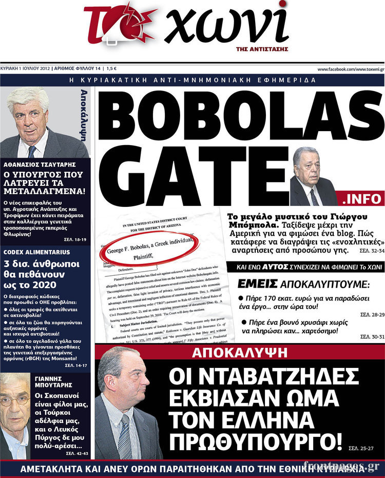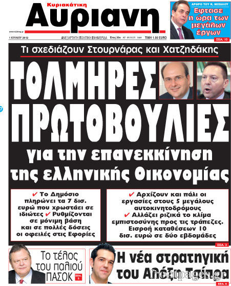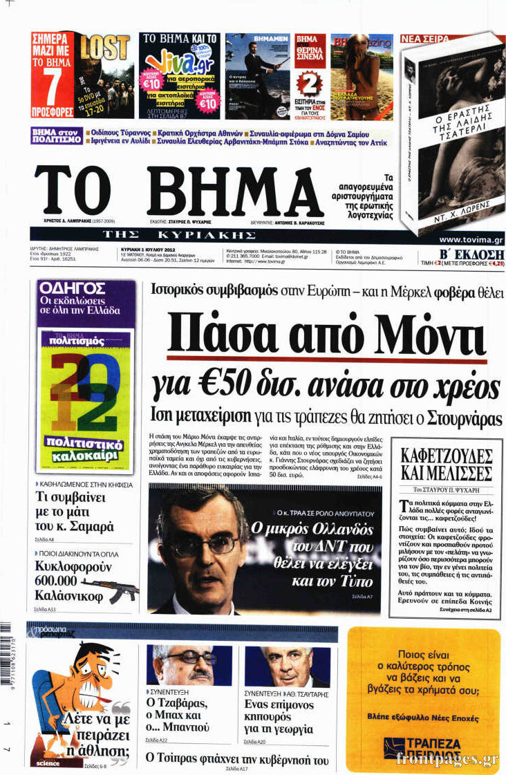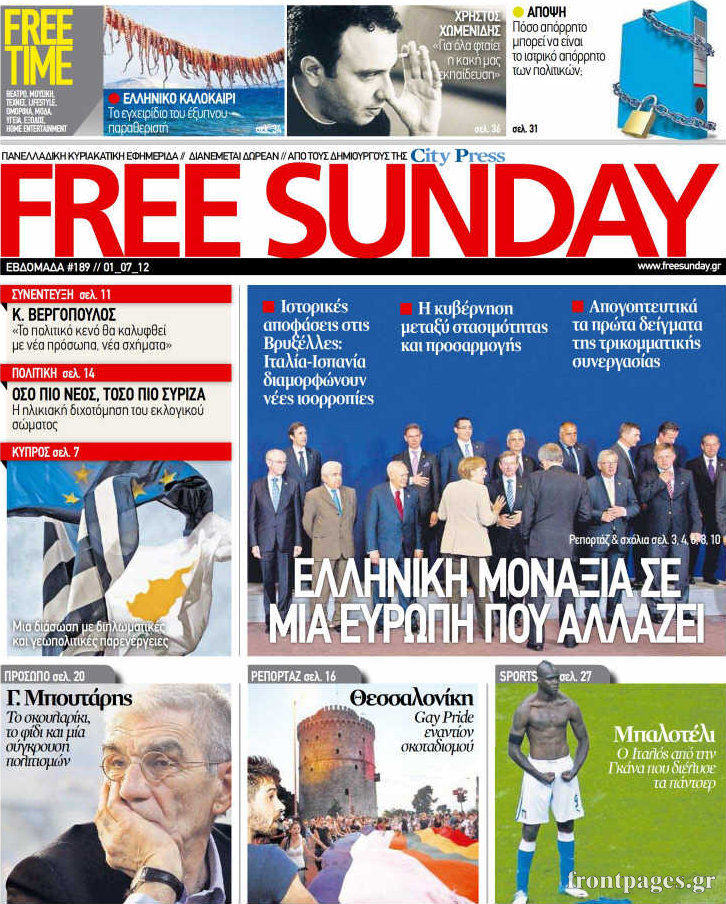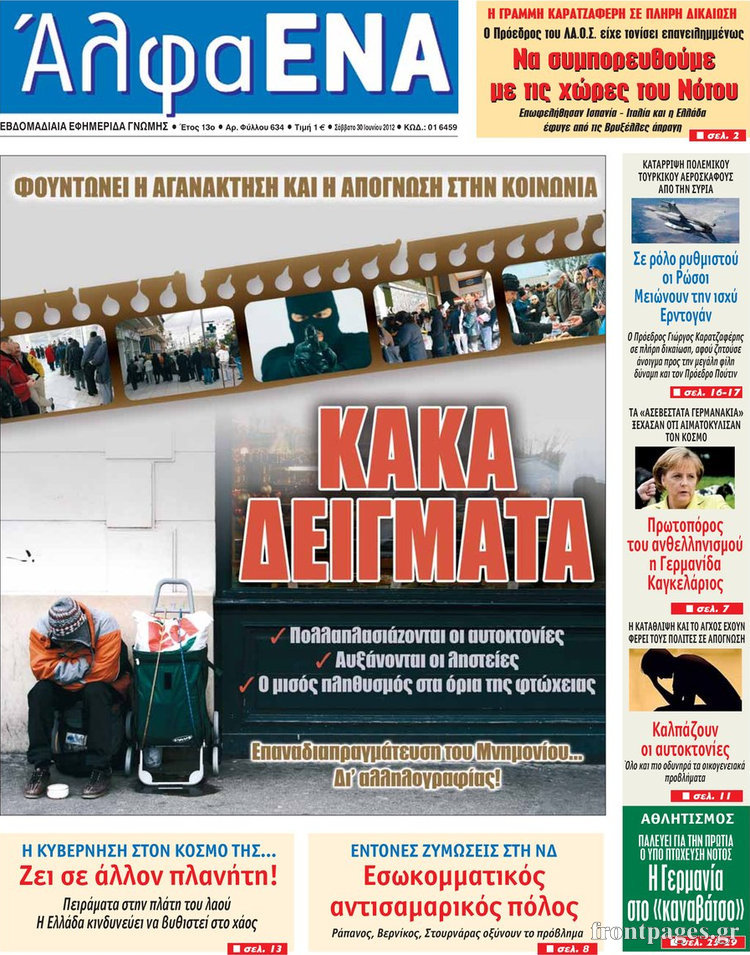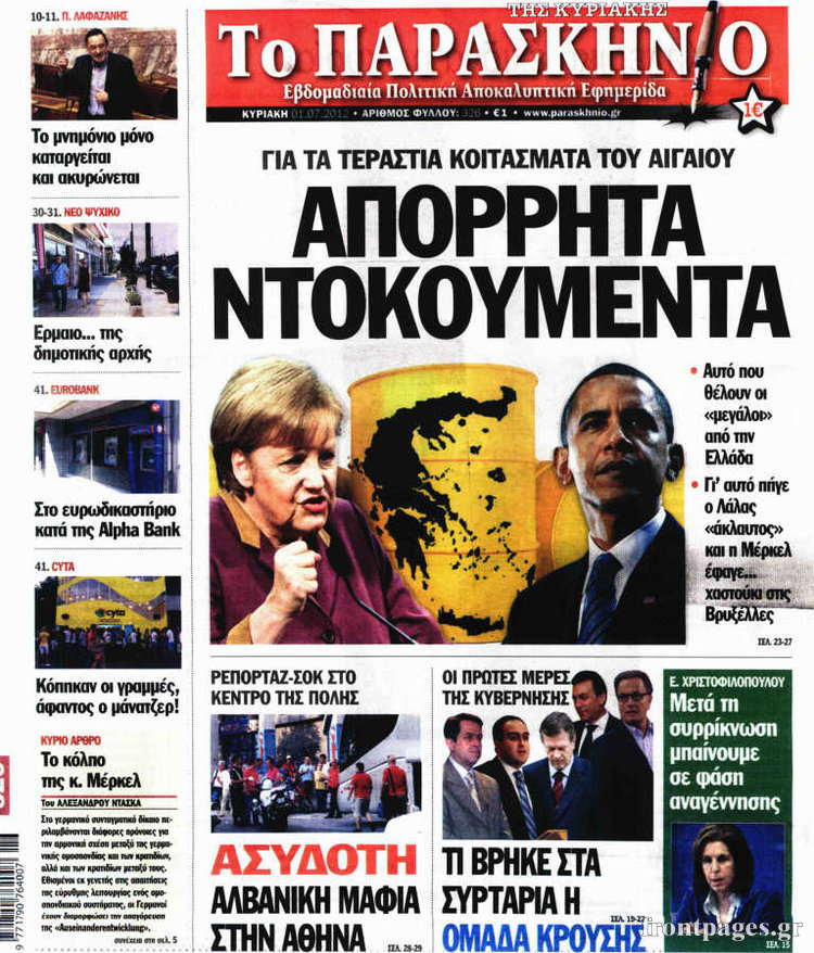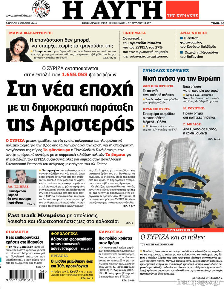 Τα πρωτοσέλιδα σήμερα Enikos Newsroom 09:48, Κυριακή 01 Ιουλίου 2012 Media ΕΦΗΜΕΡΙΔΕΣ Μοιράσου το: σχολίασε κι εσύ (0 σχόλια) Ακολουθήστε το enikos.gr στο Google News και μάθετε πρώτοι όλες τις ειδήσεις Δείτε όλες τις τελευταίες ειδήσεις από την Ελλάδα και τον Κόσμο στο enikos.gr Ειδήσεις Ροή Ειδήσεων 4 ώρες πριν Χριστούγεννα στα μπλόκα: Επιμένουν στις κινητοποιήσεις τους οι αγρότες – Ανοίγουν τα διόδια το Σαββατοκύριακο 5 ώρες πριν Ουκρανία: Η άνευ προηγουμένου επίθεση σε ρωσικό τάνκερ στη Μεσόγειο και το μήνυμα προς στον Πούτιν – Το «μακρύ χέρι» του Κιέβου 4 ώρες πριν Πούτιν: Τα μηνύματα σε Ευρώπη και ΝΑΤΟ από το μαραθώνιο «σόου» του – Η απαίτηση για «σεβασμό» και η ειρήνη «με τους όρους» της Μόσχας 5 ώρες πριν Τραμπ: Δεν αποκλείει την πιθανότητα ενός πολέμου στη Βενεζουέλα – «Ο Μαδούρο ξέρει καλύτερα από τον καθένα τι ακριβώς θέλω» 6 ώρες πριν Συνεχίζει να προκαλεί ο Μίτσκοσκι: «Για μένα το όνομα Μακεδονία είναι ιερό» 4 ώρες πριν Ανακαλύφθηκαν αρχαία χρυσά νομίσματα 2.200 ετών που απεικονίζουν τον θεό Απόλλωνα – Η άγνωστη σύνδεση με τον Φίλιππο Β΄ της Μακεδονίας 5 ώρες πριν Ύπνος: Μια κρυφή κατάσταση του εγκεφάλου πριν από τον ύπνο μπορεί να είναι το “κλειδί” για υψηλή ευφυΐα και δημιουργικότητα 6 ώρες πριν Αριθμολογία: Οι άνθρωποι που έχουν γεννηθεί αυτές τις 4 ημερομηνίες, συχνά παρεξηγούνται – «Η καλοσύνη τους κρύβει τεράστια δύναμη» 7 ώρες πριν Ξεχάστε το καθάρισμα το Σαββατοκύριακο: Ο «κανόνας των 20 λεπτών» που θα σας λύσει τα χέρια 16 λεπτά πριν GNTM: Η Ξένια Τσίρκοβα αναδείχθηκε μεγάλη νικήτρια και πήρε τις 50.000 ευρώ – Ποιος βρέθηκε σε απόσταση αναπνοής; 31 λεπτά πριν Θεσσαλονίκη: Εξαφανίστηκε 13χρονος από χώρο φιλοξενίας ασυνόδευτων ανηλίκων στο Ωραιόκαστρο 41 λεπτά πριν Ντόναλντ Τραμπ: «Πολύ βαριά αντίποινα» στη Συρία – «Πλήττουμε πολύ δυνατά οχυρά του Ισλαμικού Κράτους» 56 λεπτά πριν Εξάρχεια: Ένταση με μολότοφ, χημικά και κρότου λάμψης 1 ώρα πριν ΗΠΑ: Τραγωδία στην Αλαμπάμα – Σκότωσε την δημοσιογράφο σύζυγό του και αυτοκτόνησε μπροστά στον 3χρονο γιο τους ENIKOS NETWORK Το ΕΚΑΒ τιμήθηκε από την Ακαδημία Αθηνών για τα 40 χρόνια προσφοράς του Έχετε πραγματικά μεγάλη καρδιά; 10 χαρακτηριστικά όσων έχουν καλοσύνη Αναστολή μέτρων αναγκαστικής εκτέλεσης για κτηνοτρόφους που πλήττονται από την ευλογιά των αιγοπροβάτων Πλήρης επάρκεια προϊόντων στις λαϊκές της Αττικής, παρά τις αγροτικές κινητοποιήσεις – Τι απαντούν οι πωλητές Χαρτογραφώντας το «σημείο χωρίς επιστροφή»: Για πρώτη φορά αποκαλύπτεται με λεπτομέρεια το ακανθώδες όριο της ατμόσφαιρας τ... Η Google καταργεί τη λειτουργία «dark web report» – Πώς θα μπορούν οι χρήστες να διαγράφουν τα δεδομένα τους περισσότερα 02:50 , Σάββατο 20 Δεκεμβρίου 2025 GNTM: Η Ξένια Τσίρκοβα αναδείχθηκε μεγάλη νικήτρια και πήρε τις 50.000 ευρώ – Ποιος βρέθηκε σε απόσταση αναπνοής; Με φαντασμαγορικό τρόπο ολοκληρώθηκε το βράδυ της Παρασκευής ο μεγάλος τελικός του GNTM, μέσα ... 22:42 , Παρασκευή 19 Δεκεμβρίου 2025 Γιώργος Γιαννόπουλος για “Το σόι σου”: “Είναι ευτυχία και ευλογία αυτή η σειρά” «Είναι ευτυχία και ευλογία η συγκυρία αυτής της σειράς», θα πει ο Γιώργος Γιαννόπουλος -ο αγαπ... 20:37 , Παρασκευή 19 Δεκεμβρίου 2025 Don’t Forget The Lyrics: Η Έλλη Κοκκίνου υποδέχεται 4 παίκτες που θα κάνουν τα πάντα για να μη χάσουν ούτε… μισή λέξη από τους στίχους Το «Don’t Forget The Lyrics» επιστρέφει απόψε, Παρασκευή 19 Δεκεμβρίου, στις 21:00 με νέο επει... 19:31 , Παρασκευή 19 Δεκεμβρίου 2025 GNTM: Απόψε 