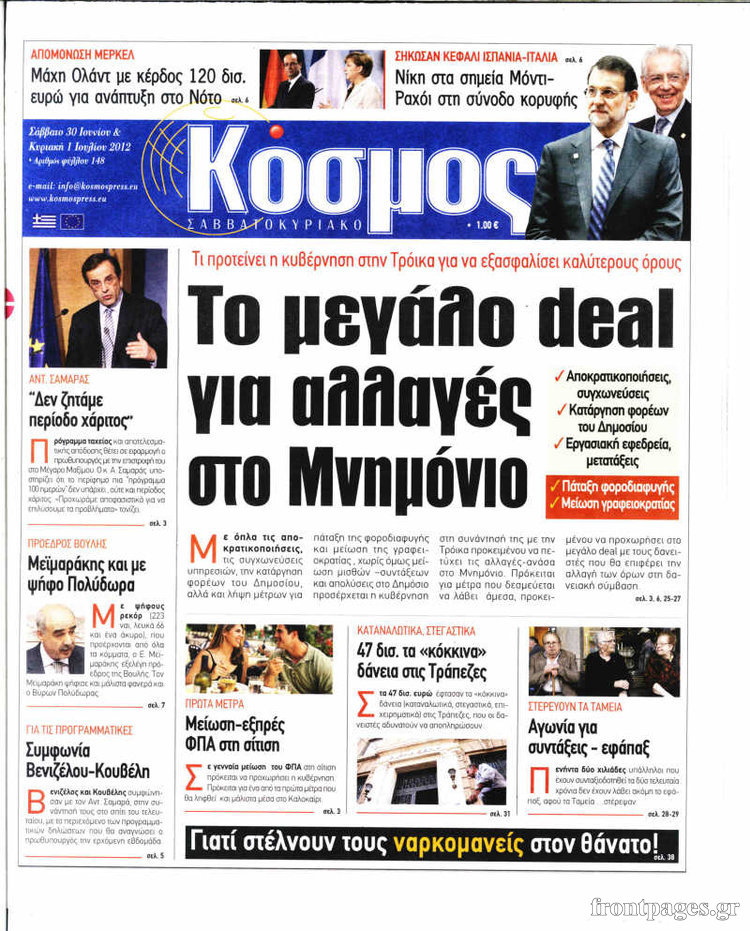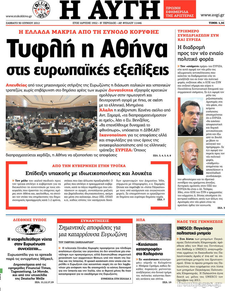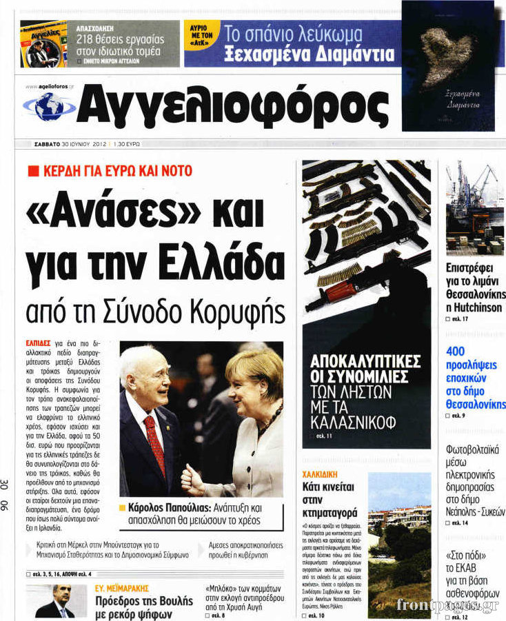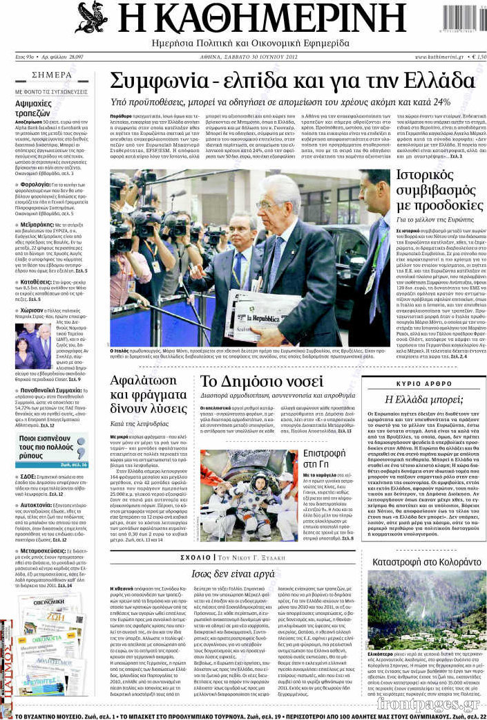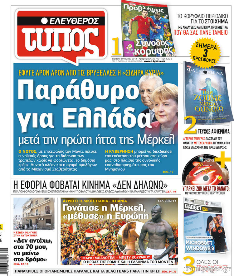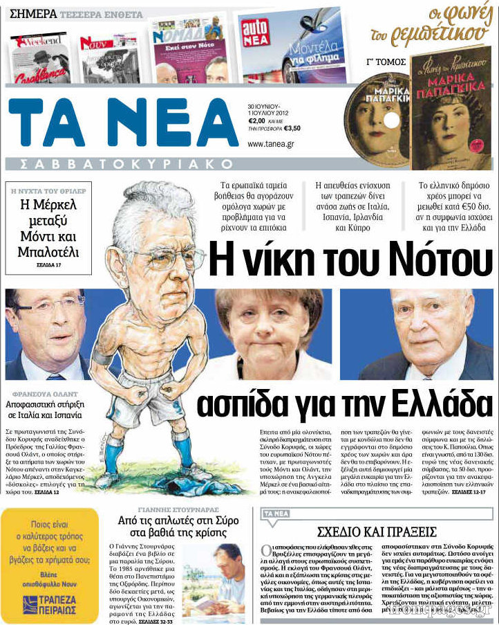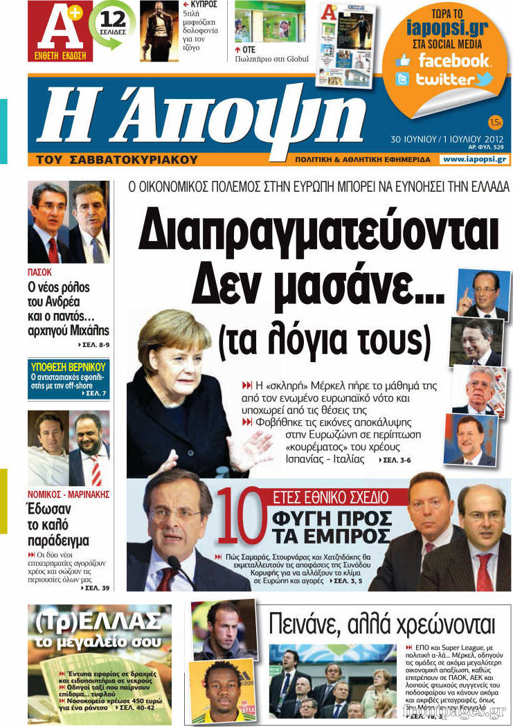 Τα πρωτοσέλιδα σήμερα Enikos Newsroom 09:17, Σάββατο 30 Ιουνίου 2012 Media ΕΦΗΜΕΡΙΔΕΣ Μοιράσου το: σχολίασε κι εσύ (0 σχόλια) Ακολουθήστε το enikos.gr στο Google News και μάθετε πρώτοι όλες τις ειδήσεις Δείτε όλες τις τελευταίες ειδήσεις από την Ελλάδα και τον Κόσμο στο enikos.gr Ειδήσεις Ροή Ειδήσεων 4 ώρες πριν Χριστούγεννα στα μπλόκα: Επιμένουν στις κινητοποιήσεις τους οι αγρότες – Ανοίγουν τα διόδια το Σαββατοκύριακο 5 ώρες πριν Ουκρανία: Η άνευ προηγουμένου επίθεση σε ρωσικό τάνκερ στη Μεσόγειο και το μήνυμα προς στον Πούτιν – Το «μακρύ χέρι» του Κιέβου 4 ώρες πριν Πούτιν: Τα μηνύματα σε Ευρώπη και ΝΑΤΟ από το μαραθώνιο «σόου» του – Η απαίτηση για «σεβασμό» και η ειρήνη «με τους όρους» της Μόσχας 5 ώρες πριν Τραμπ: Δεν αποκλείει την πιθανότητα ενός πολέμου στη Βενεζουέλα – «Ο Μαδούρο ξέρει καλύτερα από τον καθένα τι ακριβώς θέλω» 6 ώρες πριν Συνεχίζει να προκαλεί ο Μίτσκοσκι: «Για μένα το όνομα Μακεδονία είναι ιερό» 4 ώρες πριν Ανακαλύφθηκαν αρχαία χρυσά νομίσματα 2.200 ετών που απεικονίζουν τον θεό Απόλλωνα – Η άγνωστη σύνδεση με τον Φίλιππο Β΄ της Μακεδονίας 5 ώρες πριν Ύπνος: Μια κρυφή κατάσταση του εγκεφάλου πριν από τον ύπνο μπορεί να είναι το “κλειδί” για υψηλή ευφυΐα και δημιουργικότητα 6 ώρες πριν Αριθμολογία: Οι άνθρωποι που έχουν γεννηθεί αυτές τις 4 ημερομηνίες, συχνά παρεξηγούνται – «Η καλοσύνη τους κρύβει τεράστια δύναμη» 7 ώρες πριν Ξεχάστε το καθάρισμα το Σαββατοκύριακο: Ο «κανόνας των 20 λεπτών» που θα σας λύσει τα χέρια 16 λεπτά πριν GNTM: Η Ξένια Τσίρκοβα αναδείχθηκε μεγάλη νικήτρια και πήρε τις 50.000 ευρώ – Ποιος βρέθηκε σε απόσταση αναπνοής; 31 λεπτά πριν Θεσσαλονίκη: Εξαφανίστηκε 13χρονος από χώρο φιλοξενίας ασυνόδευτων ανηλίκων στο Ωραιόκαστρο 42 λεπτά πριν Ντόναλντ Τραμπ: «Πολύ βαριά αντίποινα» στη Συρία – «Πλήττουμε πολύ δυνατά οχυρά του Ισλαμικού Κράτους» 56 λεπτά πριν Εξάρχεια: Ένταση με μολότοφ, χημικά και κρότου λάμψης 1 ώρα πριν ΗΠΑ: Τραγωδία στην Αλαμπάμα – Σκότωσε την δημοσιογράφο σύζυγό του και αυτοκτόνησε μπροστά στον 3χρονο γιο τους ENIKOS NETWORK Το ΕΚΑΒ τιμήθηκε από την Ακαδημία Αθηνών για τα 40 χρόνια προσφοράς του Έχετε πραγματικά μεγάλη καρδιά; 10 χαρακτηριστικά όσων έχουν καλοσύνη Αναστολή μέτρων αναγκαστικής εκτέλεσης για κτηνοτρόφους που πλήττονται από την ευλογιά των αιγοπροβάτων Πλήρης επάρκεια προϊόντων στις λαϊκές της Αττικής, παρά τις αγροτικές κινητοποιήσεις – Τι απαντούν οι πωλητές Χαρτογραφώντας το «σημείο χωρίς επιστροφή»: Για πρώτη φορά αποκαλύπτεται με λεπτομέρεια το ακανθώδες όριο της ατμόσφαιρας τ... Η Google καταργεί τη λειτουργία «dark web report» – Πώς θα μπορούν οι χρήστες να διαγράφουν τα δεδομένα τους περισσότερα 02:50 , Σάββατο 20 Δεκεμβρίου 2025 GNTM: Η Ξένια Τσίρκοβα αναδείχθηκε μεγάλη νικήτρια και πήρε τις 50.000 ευρώ – Ποιος βρέθηκε σε απόσταση αναπνοής; Με φαντασμαγορικό τρόπο ολοκληρώθηκε το βράδυ της Παρασκευής ο μεγάλος τελικός του GNTM, μέσα ... 22:42 , Παρασκευή 19 Δεκεμβρίου 2025 Γιώργος Γιαννόπουλος για “Το σόι σου”: “Είναι ευτυχία και ευλογία αυτή η σειρά” «Είναι ευτυχία και ευλογία η συγκυρία αυτής της σειράς», θα πει ο Γιώργος Γιαννόπουλος -ο αγαπ... 20:37 , Παρασκευή 19 Δεκεμβρίου 2025 Don’t Forget The Lyrics: Η Έλλη Κοκκίνου υποδέχεται 4 παίκτες που θα κάνουν τα πάντα για να μη χάσουν ούτε… μισή λέξη από τους στίχους Το «Don’t Forget The Lyrics» επιστρέφει απόψε, Παρασκευή 19 Δεκεμβρίου, στις 21:00 με νέο επει... 19:31 , Παρασκευή 19 Δεκεμβρίου 2025 GNTM: Απόψε 