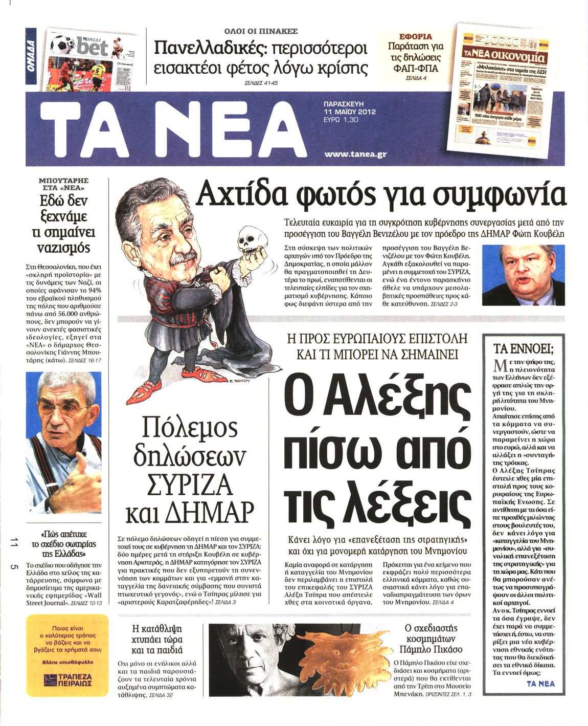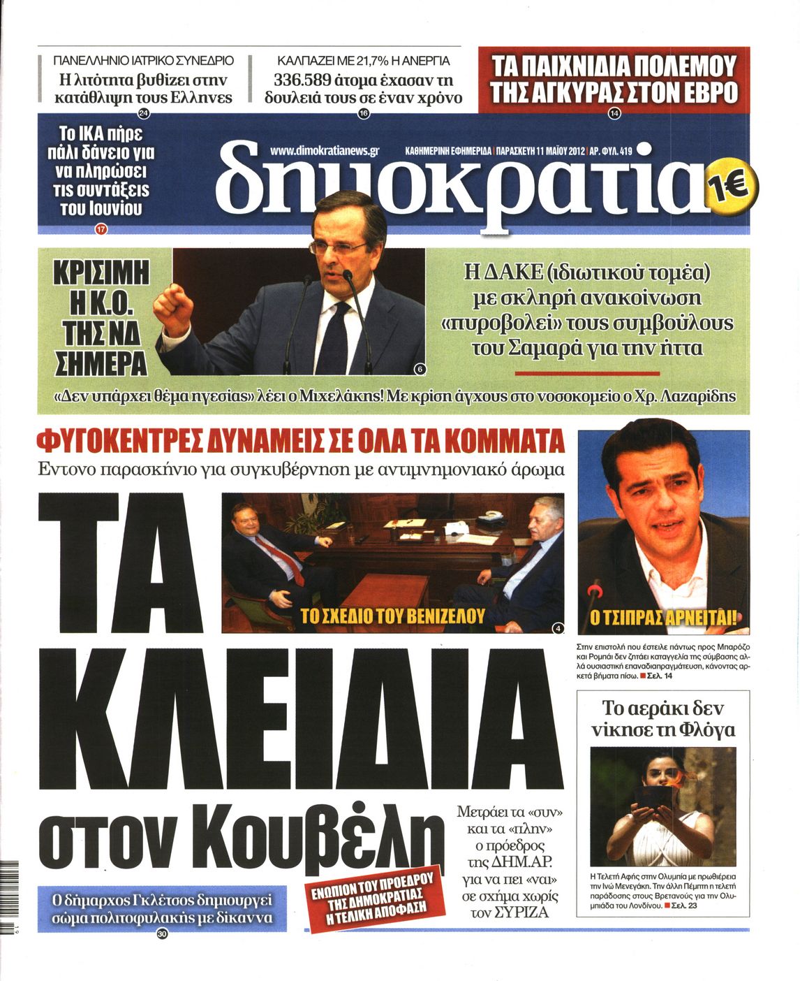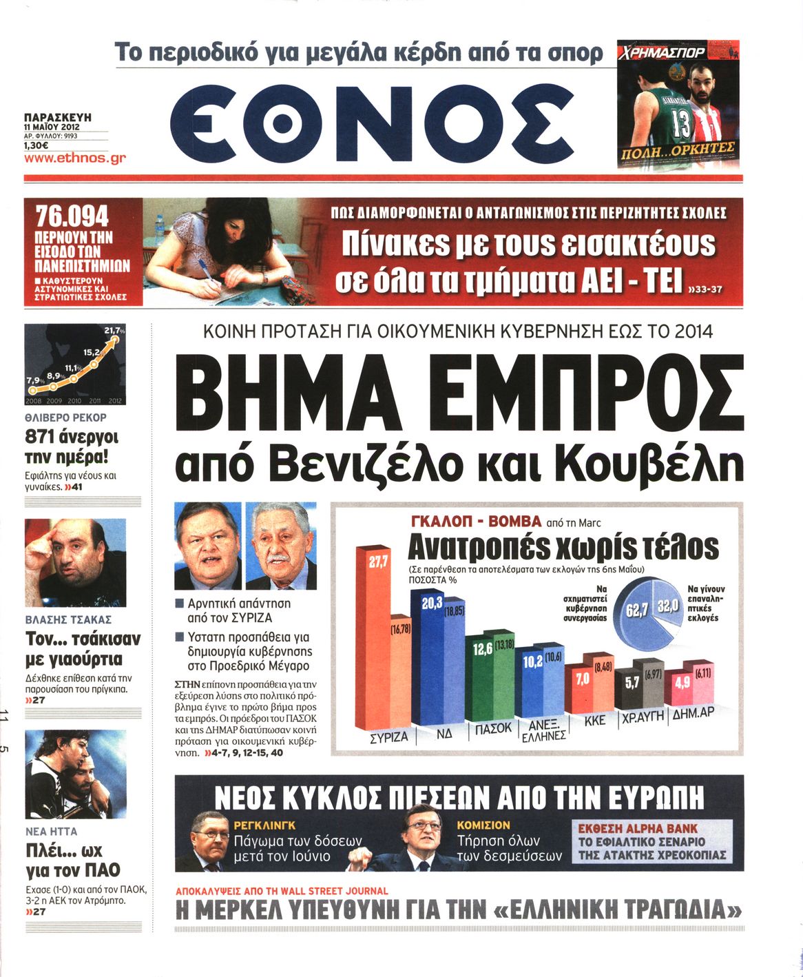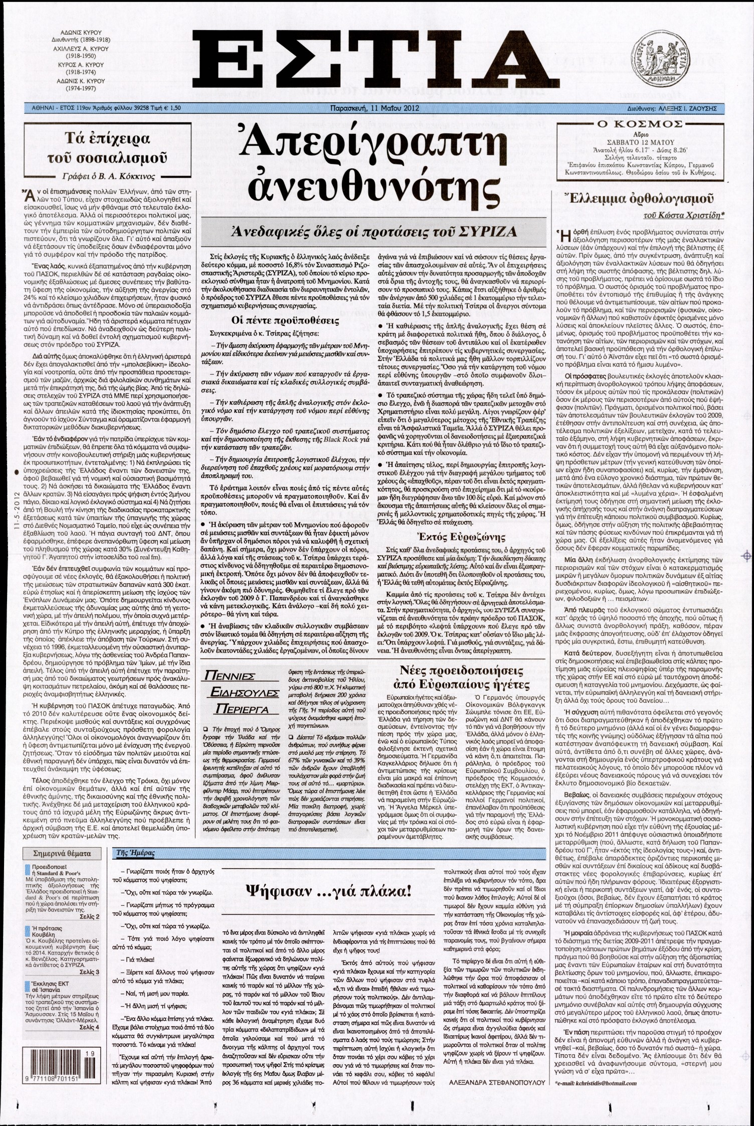Τα πρωτοσέλιδα των εφημερίδων Enikos Newsroom 08:56, Παρασκευή 11 Μαΐου 2012 Media ΕΦΗΜΕΡΙΔΕΣ ΠΡΩΤΟΣΕΛΙΔΑ Μοιράσου το: σχολίασε κι εσύ (0 σχόλια) Ακολουθήστε το enikos.gr στο Google News και μάθετε πρώτοι όλες τις ειδήσεις Δείτε όλες τις τελευταίες ειδήσεις από την Ελλάδα και τον Κόσμο στο enikos.gr Ειδήσεις Ροή Ειδήσεων 2 ώρες πριν Μητσοτάκης για αγρότες: Ελπίζω πως θα απομακρυνθούν σύντομα από τα μπλόκα 4 ώρες πριν Έρευνα MRB: Η πρόθεση ψήφου και τα σημαντικότερα προβλήματα – Οι «λέξεις» που εκφράζουν τους πολίτες 34 λεπτά πριν Αμοργός: «Θα προσπαθήσω να το κάνω κάθε μέρα» – Ποιος είναι ο αγρότης που έστησε μόνος του το πρώτο μπλόκο στο νησί 1 ώρα πριν Μισέλ Ομπάμα: Εμφανώς αδυνατισμένη στην εκπομπή του Τζίμι Κίμελ – Οι φήμες για τη χρήση Ozempic και η «φιλία» της με τον Ρομπ Ράινερ 1 ώρα πριν Αγρότες: Επ’ αόριστον μπλόκο στον σταθμό στον Προμαχώνα για τα φορτηγά – Κλείνει το ρεύμα εισόδου στα Μάλγαρα 3 ώρες πριν Τα 4 ζώδια που ξαναβρίσκουν τον εαυτό τους – «Μπαίνετε επιτέλους στην ουσία των πραγμάτων» 4 ώρες πριν 20 χρόνια τα Χριστούγεννα ξεκινούν στα Public με μεγάλη ποικιλία σε δώρα! 3 ώρες πριν «Δεν είχα κλάψει από τότε που διαγνώστηκα με καρκίνο, ώσπου ένα τηλεφώνημα με έκανε να λυγίσω» – Η συγκλονιστική εξομολόγηση ενός άνδρα 2 ώρες πριν Τα 7 σπάνια χαρακτηριστικά που κάνουν κάποιους ανθρώπους ακαταμάχητους 6 λεπτά πριν Κρεμλίνο: «Η θέση μας είναι σαφής» για τα ευρωπαϊκά στρατεύματα στην Ουκρανία – «Είναι θέμα προς συζήτηση» 11 λεπτά πριν Μαρία Σολωμού: Έχω σκεφτεί να παντρευτώ στα 70, επειδή δεν το έχω κάνει 16 λεπτά πριν Παρίσι: Παρατείνεται η απεργία στο Λούβρο – To μουσείο παραμένει κλειστό «μέχρι νεωτέρας» 21 λεπτά πριν Λάκης Γαβαλάς, Σουζάνα Κεγγίτση και Έλενα Γαλύφα μας περιμένουν σήμερα στο πιο stylish Χριστουγεννιάτικο ραντεβού στο Athens Metro Mall – Το Madwalk Gifting Lounge by ΣΚΡΑΤΣ επιστρέφει σήμερα από τις 14:00 έως τις 18:30 26 λεπτά πριν Αγρίνιο: Συνελήφθη μαθητής που απείλησε τον διευθυντή και εκπαιδευτικούς – Χειροπέδες και στη μητέρα του ENIKOS NETWORK Ανησυχητική αύξηση της υπέρτασης στα παιδιά – Πώς θα τα προστατέψουμε; Αδενώματα Υπόφυσης: Μια πάθηση καλοήθης, αλλά όχι αθώα Διεθνής Οργανισμός Ενέργειας (ΔΟΕ, IEA): Τι δείχνουν τα νέα στοιχεία για την παγκόσμια κατανάλωση άνθρακα Διευκρινίσεις από το ΥΠΑΑΤ και τον ΟΠΕΚΕΠΕ για την εξόφληση της βασικής ενίσχυσης στους αγρότες Σύγχρονος Νοστράδαμος: Προειδοποιεί για «μεγάλο γεγονός» τους επόμενους μήνες που θα συγκλονίσει τη Βρετανία και τον κόσμο Τεστ παρατηρητικότητας: Μπορείτε να βρείτε τις 3 διαφορές στις εικόνες με έναν πιγκουίνο σε 14 δευτερόλεπτα περισσότερα 12:35 , Τετάρτη 17 Δεκεμβρίου 2025 Μίρκα Παπακωνσταντίνου: «Δεν ήμουν αισιόδοξη για τα νούμερα – Είμαι ρεαλίστρια» Στα γυρίσματα του εορταστικού επεισοδίου της αγαπημένης σειράς “Το Σόι Σου”, βρέθηκε η κάμερα ... 12:12 , Τετάρτη 17 Δεκεμβρίου 2025 Ακούστε την εκπομπή του Νίκου Χατζηνικολάου 17/12/2025 Ακούστε την εκπομπή του Νίκου Χατζηνικολάου στον ραδιοφωνικό σταθμό RealFm 97,8, την Τετάρτη 1... 11:35 , Τετάρτη 17 Δεκεμβρίου 2025 Home Alone: Το σπίτι της ταινίας θα ανακαινιστεί – Επιστροφή στην αισθητική της δεκαετίας του ’90 Οι νέοι ιδιοκτήτες του πραγματικού σπιτιού που παρουσιάζεται στην κλασική ταινία του 1990 «Hom... 11:25 , Τετάρτη 17 Δεκεμβρίου 2025 Grand Hotel: Απόψε το τελευταίο επεισόδιο της χρονιάς – Όλα τα μυστικά μένουν εδώ Το τελευταίο επεισόδιο της χρονιάς της σειράς «Grand Hotel» θα προβληθεί απόψε στις 21:00. Ο 