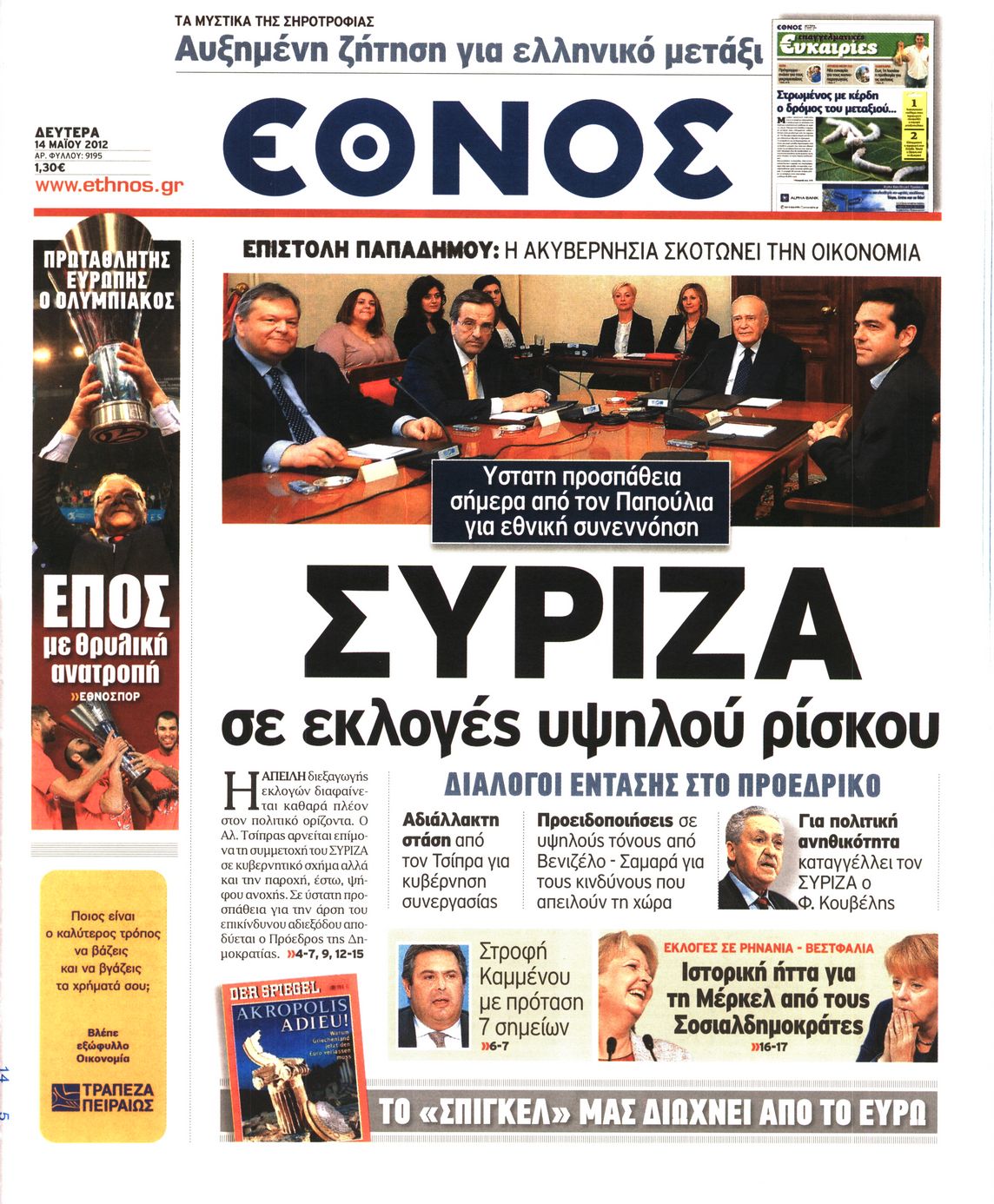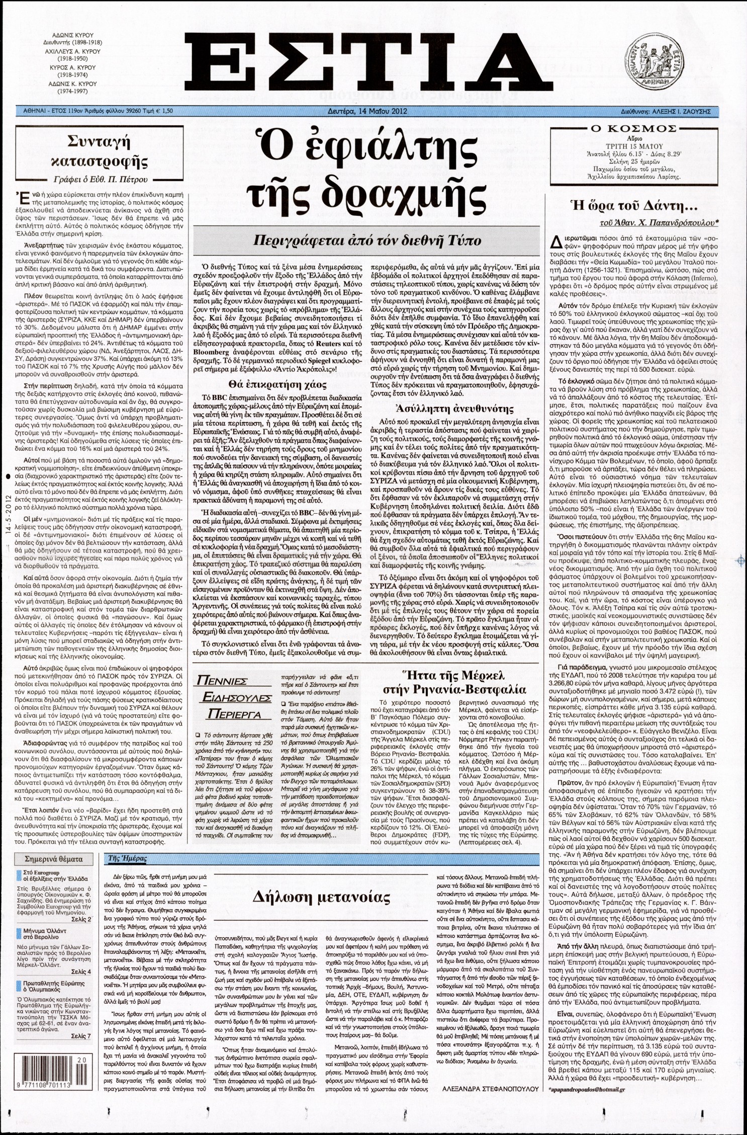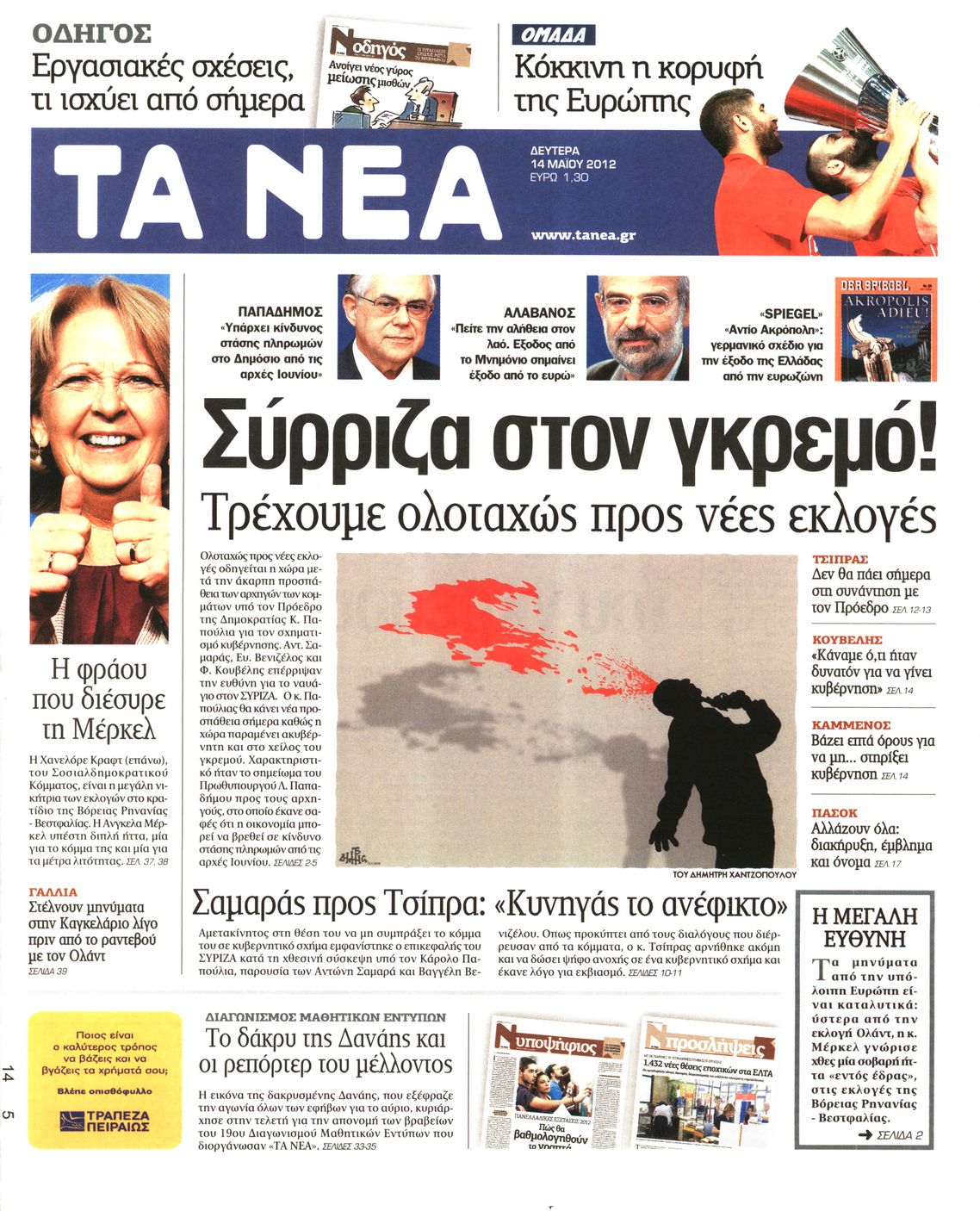 Τα πρωτοσέλιδα των εφημερίδων Enikos Newsroom 07:38, Δευτέρα 14 Μαΐου 2012 Media ΕΦΗΜΕΡΙΔΕΣ ΠΡΩΤΟΣΕΛΙΔΑ Μοιράσου το: σχολίασε κι εσύ (0 σχόλια) Ακολουθήστε το enikos.gr στο Google News και μάθετε πρώτοι όλες τις ειδήσεις Δείτε όλες τις τελευταίες ειδήσεις από την Ελλάδα και τον Κόσμο στο enikos.gr Ειδήσεις Ροή Ειδήσεων 55 λεπτά πριν Πώς στήθηκε η επιχείρηση «Ίπαλλος» που οδήγησε στη σύλληψη του «Έλληνα Εσκομπάρ» – «Ο πόλεμος ενάντια στους εμπόρους ναρκωτικών θα συνεχιστεί» 40 λεπτά πριν Δίκη Χρυσής Αυγής: Την ενοχή και των 42 κατηγορουμένων ζητά η εισαγγελέας 1 ώρα πριν Κυψέλη: Στη φυλακή η 16χρονη που μαχαίρωσε συμμαθήτριά της 4 ώρες πριν Αμοργός: «Θα προσπαθήσω να το κάνω κάθε μέρα» – Ποιος είναι ο αγρότης που έστησε μόνος του το πρώτο μπλόκο στο νησί 2 ώρες πριν Τραγωδία στην Αλεξανδρούπολη: Παιδάκι 3 ετών μεταφέρθηκε νεκρό από τη μητέρα του στο νοσοκομείο 1 ώρα πριν Τα 3 ζώδια που θα δουν τη ζωή τους να αλλάζει ριζικά το 2026 – «Όλα γίνονται καλύτερα σταδιακά» 6 ώρες πριν «Δεν είχα κλάψει από τότε που διαγνώστηκα με καρκίνο, ώσπου ένα τηλεφώνημα με έκανε να λυγίσω» – Η συγκλονιστική εξομολόγηση ενός άνδρα 2 ώρες πριν Ο σπάνιος σεισμός που έλυσε τα χέρια των επιστημόνων – Αποκάλυψε ακριβώς όσα αναζητούσαν 8 ώρες πριν 20 χρόνια τα Χριστούγεννα ξεκινούν στα Public με μεγάλη ποικιλία σε δώρα! 2 λεπτά πριν Κουίζ για την παλιά Αθήνα: Αναγνωρίζετε την οδό; Είναι από τις πιο γνωστές 5 λεπτά πριν Δημοσιογράφος μήνυσε τον ευρωβουλευτή Νίκο Παππά για ξυλοδαρμό – Αναζητείται στο πλαίσιο του αυτοφώρου 11 λεπτά πριν ΥΠΕΞ σε Μίτσκοσκι: «Κάθε προσπάθεια αλλοίωσης της Συμφωνίας των Πρεσπών δεν πρόκειται να γίνει αποδεκτή» 15 λεπτά πριν Θεσσαλονίκη: Επίθεση αδέσποτου σκύλου σε κάτοικο στον Χορτιάτη – Διακομίστηκε στο νοσοκομείο 27 λεπτά πριν Θεσσαλονίκη: Ακυρώνονται τρεις παραστάσεις του ΚΘΒΕ λόγω στάσης εργασίας των εργαζομένων ENIKOS NETWORK Γιατί αναζητούμε τα Χριστούγεννα όλο και νωρίτερα; Ποιοι οι ψυχολογικοί και οι συναισθηματικοί λόγοι Σοβαροί κίνδυνοι από τη λάθος χορήγηση φαρμάκου για τις αιμορραγίες-Συστάσεις προς τους γιατρούς Επίδομα παιδιού: Πότε θα δοθεί η τελευταία δόση για το 2025 από τον ΟΠΕΚΑ και τι πρέπει να γνωρίζετε Eurostat: Κάτω από την αρχική εκτίμηση της Υπηρεσίας ο πληθωρισμός στην Ελλάδα τον Νοέμβριο του 2025 – Tα στοιχεία για την ... Χαρτογραφώντας το «σημείο χωρίς επιστροφή»: Για πρώτη φορά αποκαλύπτεται με λεπτομέρεια το ακανθώδες όριο της ατμόσφαιρας τ... Η Google καταργεί τη λειτουργία «dark web report» – Πώς θα μπορούν οι χρήστες να διαγράφουν τα δεδομένα τους περισσότερα 12:35 , Τετάρτη 17 Δεκεμβρίου 2025 Μίρκα Παπακωνσταντίνου: «Δεν ήμουν αισιόδοξη για τα νούμερα – Είμαι ρεαλίστρια» Στα γυρίσματα του εορταστικού επεισοδίου της αγαπημένης σειράς “Το Σόι Σου”, βρέθηκε η κάμερα ... 12:12 , Τετάρτη 17 Δεκεμβρίου 2025 Ακούστε την εκπομπή του Νίκου Χατζηνικολάου 17/12/2025 Ακούστε την εκπομπή του Νίκου Χατζηνικολάου στον ραδιοφωνικό σταθμό RealFm 97,8, την Τετάρτη 1... 11:35 , Τετάρτη 17 Δεκεμβρίου 2025 Home Alone: Το σπίτι της ταινίας θα ανακαινιστεί – Επιστροφή στην αισθητική της δεκαετίας του ’90 Οι νέοι ιδιοκτήτες του πραγματικού σπιτιού που παρουσιάζεται στην κλασική ταινία του 1990 «Hom... 11:25 , Τετάρτη 17 Δεκεμβρίου 2025 Grand Hotel: Απόψε το τελευταίο επεισόδιο της χρονιάς – Όλα τα μυστικά μένουν εδώ Το τελευταίο επεισόδιο της χρονιάς της σειράς «Grand Hotel» θα προβληθεί απόψε στις 21:00. Ο Ά... ΤΕΛΕΥΤΑΙΕΣ ΕΙΔΗΣΕΙΣ 5 λεπτά πριν