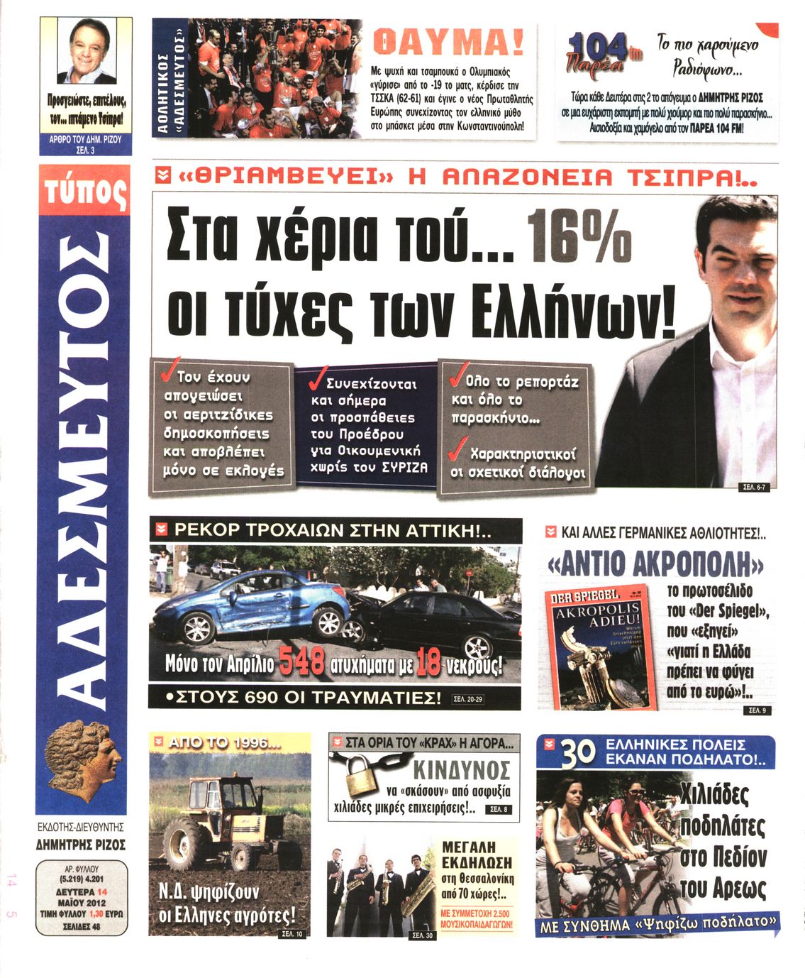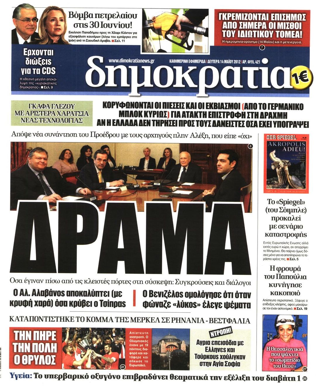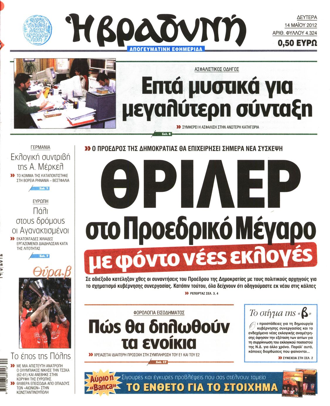 Τα πρωτοσέλιδα των εφημερίδων Enikos Newsroom 07:38, Δευτέρα 14 Μαΐου 2012 Media ΕΦΗΜΕΡΙΔΕΣ ΠΡΩΤΟΣΕΛΙΔΑ Μοιράσου το: σχολίασε κι εσύ (0 σχόλια) Ακολουθήστε το enikos.gr στο Google News και μάθετε πρώτοι όλες τις ειδήσεις Δείτε όλες τις τελευταίες ειδήσεις από την Ελλάδα και τον Κόσμο στο enikos.gr Ειδήσεις Ροή Ειδήσεων 55 λεπτά πριν Πώς στήθηκε η επιχείρηση «Ίπαλλος» που οδήγησε στη σύλληψη του «Έλληνα Εσκομπάρ» – «Ο πόλεμος ενάντια στους εμπόρους ναρκωτικών θα συνεχιστεί» 40 λεπτά πριν Δίκη Χρυσής Αυγής: Την ενοχή και των 42 κατηγορουμένων ζητά η εισαγγελέας 1 ώρα πριν Κυψέλη: Στη φυλακή η 16χρονη που μαχαίρωσε συμμαθήτριά της 4 ώρες πριν Αμοργός: «Θα προσπαθήσω να το κάνω κάθε μέρα» – Ποιος είναι ο αγρότης που έστησε μόνος του το πρώτο μπλόκο στο νησί 2 ώρες πριν Τραγωδία στην Αλεξανδρούπολη: Παιδάκι 3 ετών μεταφέρθηκε νεκρό από τη μητέρα του στο νοσοκομείο 1 ώρα πριν Τα 3 ζώδια που θα δουν τη ζωή τους να αλλάζει ριζικά το 2026 – «Όλα γίνονται καλύτερα σταδιακά» 6 ώρες πριν «Δεν είχα κλάψει από τότε που διαγνώστηκα με καρκίνο, ώσπου ένα τηλεφώνημα με έκανε να λυγίσω» – Η συγκλονιστική εξομολόγηση ενός άνδρα 2 ώρες πριν Ο σπάνιος σεισμός που έλυσε τα χέρια των επιστημόνων – Αποκάλυψε ακριβώς όσα αναζητούσαν 8 ώρες πριν 20 χρόνια τα Χριστούγεννα ξεκινούν στα Public με μεγάλη ποικιλία σε δώρα! 2 λεπτά πριν Κουίζ για την παλιά Αθήνα: Αναγνωρίζετε την οδό; Είναι από τις πιο γνωστές 5 λεπτά πριν Δημοσιογράφος μήνυσε τον ευρωβουλευτή Νίκο Παππά για ξυλοδαρμό – Αναζητείται στο πλαίσιο του αυτοφώρου 11 λεπτά πριν ΥΠΕΞ σε Μίτσκοσκι: «Κάθε προσπάθεια αλλοίωσης της Συμφωνίας των Πρεσπών δεν πρόκειται να γίνει αποδεκτή» 15 λεπτά πριν Θεσσαλονίκη: Επίθεση αδέσποτου σκύλου σε κάτοικο στον Χορτιάτη – Διακομίστηκε στο νοσοκομείο 27 λεπτά πριν Θεσσαλονίκη: Ακυρώνονται τρεις παραστάσεις του ΚΘΒΕ λόγω στάσης εργασίας των εργαζομένων ENIKOS NETWORK Γιατί αναζητούμε τα Χριστούγεννα όλο και νωρίτερα; Ποιοι οι ψυχολογικοί και οι συναισθηματικοί λόγοι Σοβαροί κίνδυνοι από τη λάθος χορήγηση φαρμάκου για τις αιμορραγίες-Συστάσεις προς τους γιατρούς Επίδομα παιδιού: Πότε θα δοθεί η τελευταία δόση για το 2025 από τον ΟΠΕΚΑ και τι πρέπει να γνωρίζετε Eurostat: Κάτω από την αρχική εκτίμηση της Υπηρεσίας ο πληθωρισμός στην Ελλάδα τον Νοέμβριο του 2025 – Tα στοιχεία για την ... Χαρτογραφώντας το «σημείο χωρίς επιστροφή»: Για πρώτη φορά αποκαλύπτεται με λεπτομέρεια το ακανθώδες όριο της ατμόσφαιρας τ... Η Google καταργεί τη λειτουργία «dark web report» – Πώς θα μπορούν οι χρήστες να διαγράφουν τα δεδομένα τους περισσότερα 12:35 , Τετάρτη 17 Δεκεμβρίου 2025 Μίρκα Παπακωνσταντίνου: «Δεν ήμουν αισιόδοξη για τα νούμερα – Είμαι ρεαλίστρια» Στα γυρίσματα του εορταστικού επεισοδίου της αγαπημένης σειράς “Το Σόι Σου”, βρέθηκε η κάμερα ... 12:12 , Τετάρτη 17 Δεκεμβρίου 2025 Ακούστε την εκπομπή του Νίκου Χατζηνικολάου 17/12/2025 Ακούστε την εκπομπή του Νίκου Χατζηνικολάου στον ραδιοφωνικό σταθμό RealFm 97,8, την Τετάρτη 1... 11:35 , Τετάρτη 17 Δεκεμβρίου 2025 Home Alone: Το σπίτι της ταινίας θα ανακαινιστεί – Επιστροφή στην αισθητική της δεκαετίας του ’90 Οι νέοι ιδιοκτήτες του πραγματικού σπιτιού που παρουσιάζεται στην κλασική ταινία του 1990 «Hom... 11:25 , Τετάρτη 17 Δεκεμβρίου 2025 Grand Hotel: Απόψε το τελευταίο επεισόδιο της χρονιάς – Όλα τα μυστικά μένουν εδώ Το τελευταίο επεισόδιο της χρονιάς της σειράς «Grand Hotel» θα προβληθεί απόψε στις 21:00. Ο Ά... ΤΕΛΕΥΤΑΙΕΣ ΕΙΔΗΣΕΙΣ 5 λεπτά πριν