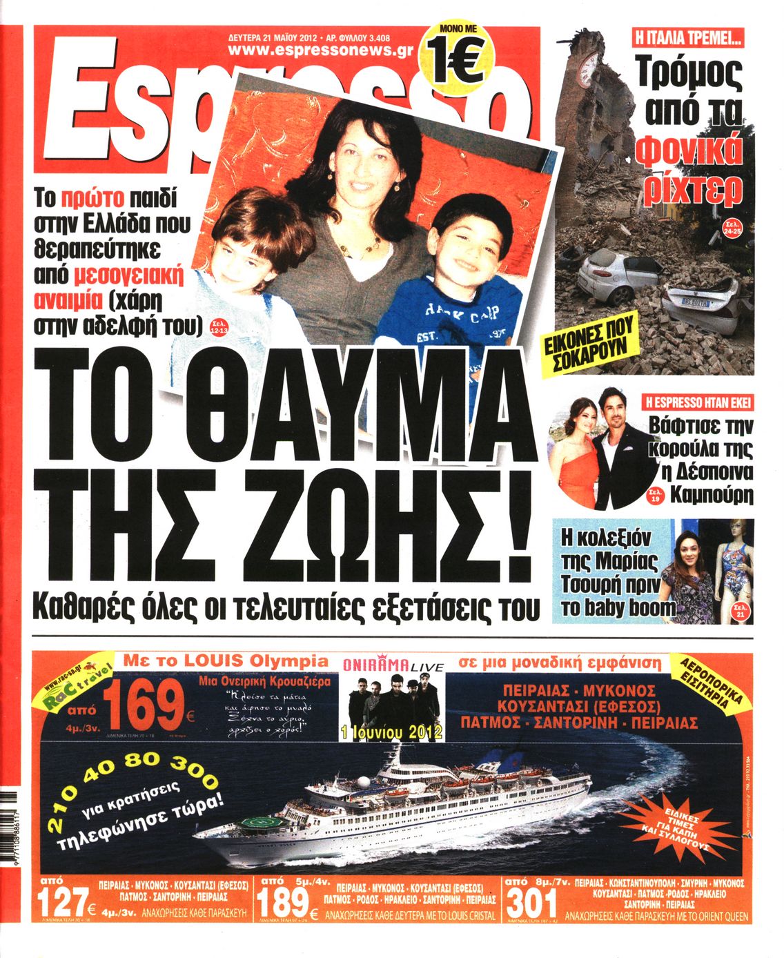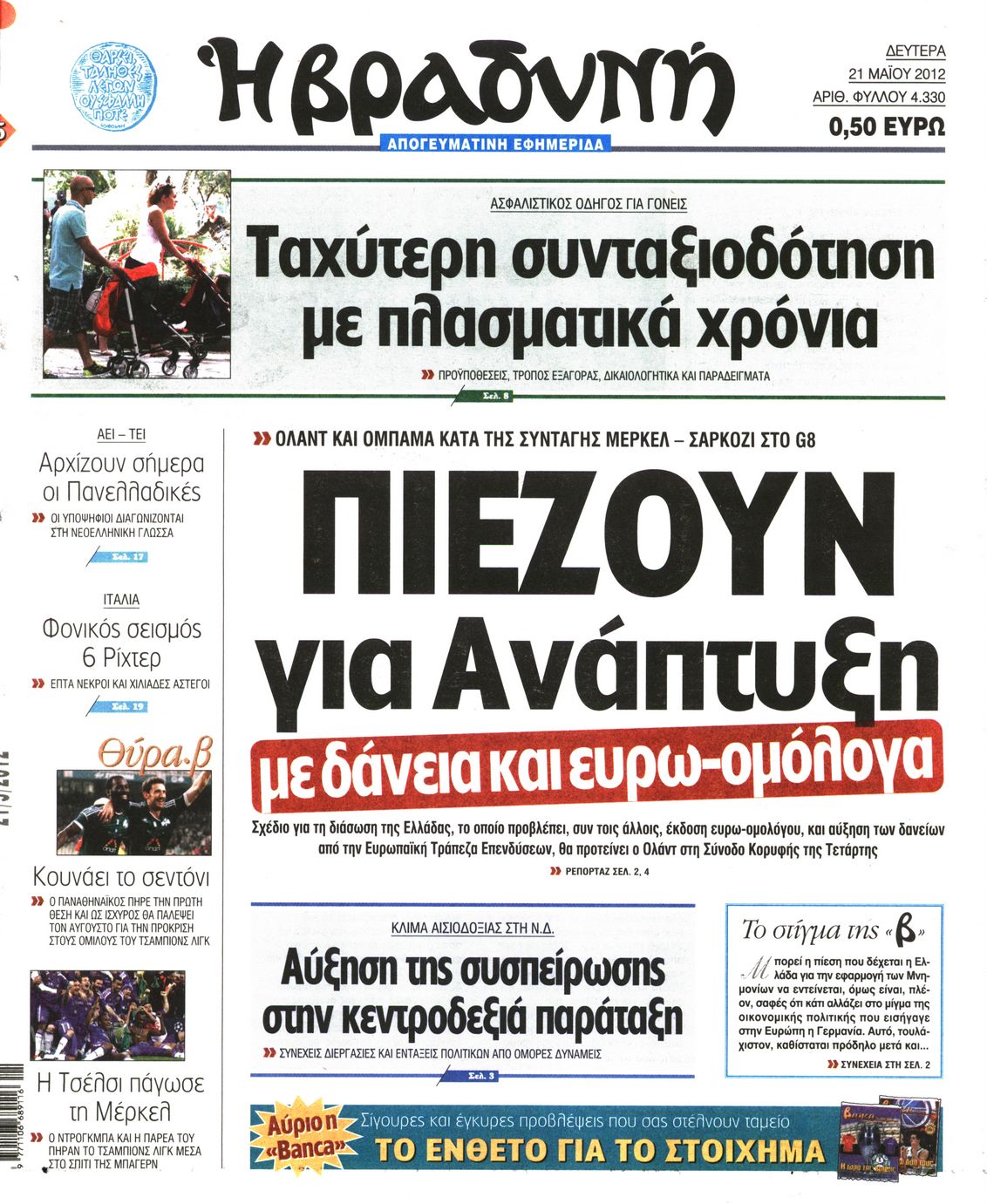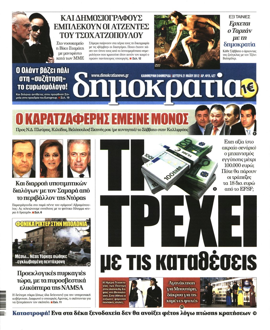 Τα πρωτοσέλιδα των εφημερίδων Enikos Newsroom 07:34, Δευτέρα 21 Μαΐου 2012 Media ΕΦΗΜΕΡΙΔΕΣ ΠΡΩΤΟΣΕΛΙΔΑ Μοιράσου το: σχολίασε κι εσύ (0 σχόλια) Ακολουθήστε το enikos.gr στο Google News και μάθετε πρώτοι όλες τις ειδήσεις Δείτε όλες τις τελευταίες ειδήσεις από την Ελλάδα και τον Κόσμο στο enikos.gr Ειδήσεις Ροή Ειδήσεων 45 λεπτά πριν Μητσοτάκης για αγρότες: Ελπίζω πως θα απομακρυνθούν σύντομα από τα μπλόκα 2 ώρες πριν Έρευνα MRB: Η πρόθεση ψήφου και τα σημαντικότερα προβλήματα – Οι «λέξεις» που εκφράζουν τους πολίτες 2 ώρες πριν Αλαλούμ με τις πληρωμές στους αγρότες: Δεν καταβλήθηκε η Βασική Ενίσχυση, αλλά έγινε παρακράτηση της εισφοράς στον ΕΛΓΑ – Τι απαντά η κυβέρνηση 2 ώρες πριν Κλέφτες άρπαξαν έναν… 12μετρο φουσκωτό Άγιο Βασίλη – «Αν κάποιος έχει πληροφορίες να επικοινωνήσει μαζί μας» 1 ώρα πριν Εξεταστική ΟΠΕΚΕΠΕ – Μυλωνάκης: «Ουδέποτε είχα πληροφόρηση ή ενημέρωσα οποιονδήποτε για επισυνδέσεις της δικογραφίας» 2 ώρες πριν Τα 4 ζώδια που ξαναβρίσκουν τον εαυτό τους – «Μπαίνετε επιτέλους στην ουσία των πραγμάτων» 3 ώρες πριν 20 χρόνια τα Χριστούγεννα ξεκινούν στα Public με μεγάλη ποικιλία σε δώρα! 2 ώρες πριν «Δεν είχα κλάψει από τότε που διαγνώστηκα με καρκίνο, ώσπου ένα τηλεφώνημα με έκανε να λυγίσω» – Η συγκλονιστική εξομολόγηση ενός άνδρα 34 λεπτά πριν Τα 7 σπάνια χαρακτηριστικά που κάνουν κάποιους ανθρώπους ακαταμάχητους 5 λεπτά πριν Μεγάλη Χριστουγεννιάτικη Αγορά στην πλατεία Κοτζιά: Ξύλινα σπιτάκια, καρουζέλ και μουσική – Όλο το πρόγραμμα 10 λεπτά πριν Εξεταστική για τον ΟΠΕΚΕΠΕ: Αντιπαράθεση για την ταυτότητα του «Φραπέ» 14 λεπτά πριν Έρευνα MRB: Οι πιο δημοφιλείς υπουργοί 22 λεπτά πριν Ακούστε την εκπομπή του Νίκου Χατζηνικολάου 17/12/2025 28 λεπτά πριν Μεξικό: Χάος στο Κογκρέσο με βουλευτίνες να «μαλλιοτραβιούνται» – Βίντεο από τη μαζική σύρραξη ENIKOS NETWORK Ανησυχητική αύξηση της υπέρτασης στα παιδιά – Πώς θα τα προστατέψουμε; Αδενώματα Υπόφυσης: Μια πάθηση καλοήθης, αλλά όχι αθώα Προϋπολογισμός: Στα 12,6 δισ. ευρώ το πρωτογενές πλεόνασμα το 11μηνο-Δείτε αναλυτικά τα στοιχεία Ελεύθεροι επαγγελματίες: Ποιοι κλάδοι δήλωσαν τους υψηλότερους ετήσιους τζίρους και ποιοι τους χαμηλότερους-Δείτε τα στοιχε... Σύγχρονος Νοστράδαμος: Προειδοποιεί για «μεγάλο γεγονός» τους επόμενους μήνες που θα συγκλονίσει τη Βρετανία και τον κόσμο Τεστ παρατηρητικότητας: Μπορείτε να βρείτε τις 3 διαφορές στις εικόνες με έναν πιγκουίνο σε 14 δευτερόλεπτα περισσότερα 12:12 , Τετάρτη 17 Δεκεμβρίου 2025 Ακούστε την εκπομπή του Νίκου Χατζηνικολάου 17/12/2025 Ακούστε την εκπομπή του Νίκου Χατζηνικολάου στον ραδιοφωνικό σταθμό RealFm 97,8, την Τετάρτη 1... 11:35 , Τετάρτη 17 Δεκεμβρίου 2025 Home Alone: Το σπίτι της ταινίας θα ανακαινιστεί – Επιστροφή στην αισθητική της δεκαετίας του ’90 Οι νέοι ιδιοκτήτες του πραγματικού σπιτιού που παρουσιάζεται στην κλασική ταινία του 1990 «Hom... 11:25 , Τετάρτη 17 Δεκεμβρίου 2025 Grand Hotel: Απόψε το τελευταίο επεισόδιο της χρονιάς – Όλα τα μυστικά μένουν εδώ Το τελευταίο επεισόδιο της χρονιάς της σειράς «Grand Hotel» θα προβληθεί απόψε στις 21:00. Ο Ά... 09:08 , Τετάρτη 17 Δεκεμβρίου 2025 Τηλεθέαση (16/12): Ανακατατάξεις στην πρωινή ψυχαγωγική ζώνη Ξεκάθαρη πρωτιά στην τηλεθέαση για την «Super Κατερίνα» στο δυναμικό κοινό με ποσοστό 18,5%, α... ΤΕΛΕΥΤΑΙΕΣ ΕΙΔΗΣΕΙΣ 5 λεπτά πριν Μεγάλη Χριστουγεννιάτικη Αγορά στην πλατεία Κοτζιά:... 10 λεπτά πριν Εξεταστική για τον ΟΠΕΚΕΠΕ: Αντιπαράθεση για την... 14 λεπτά πριν Έρευνα MRB: Οι πιο δημ