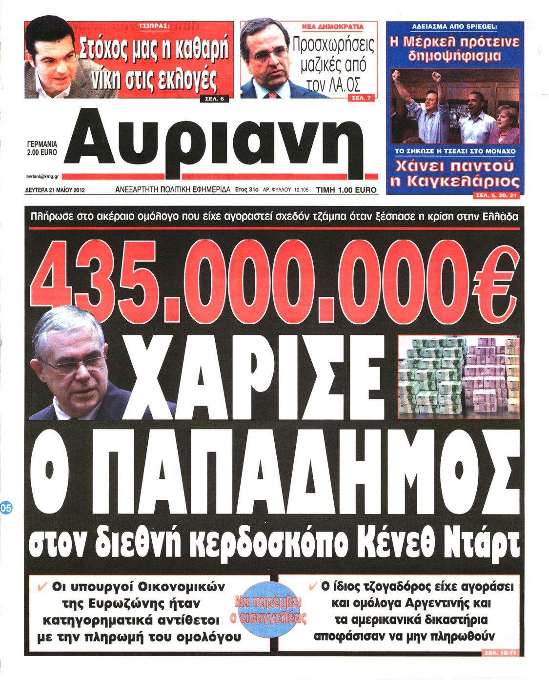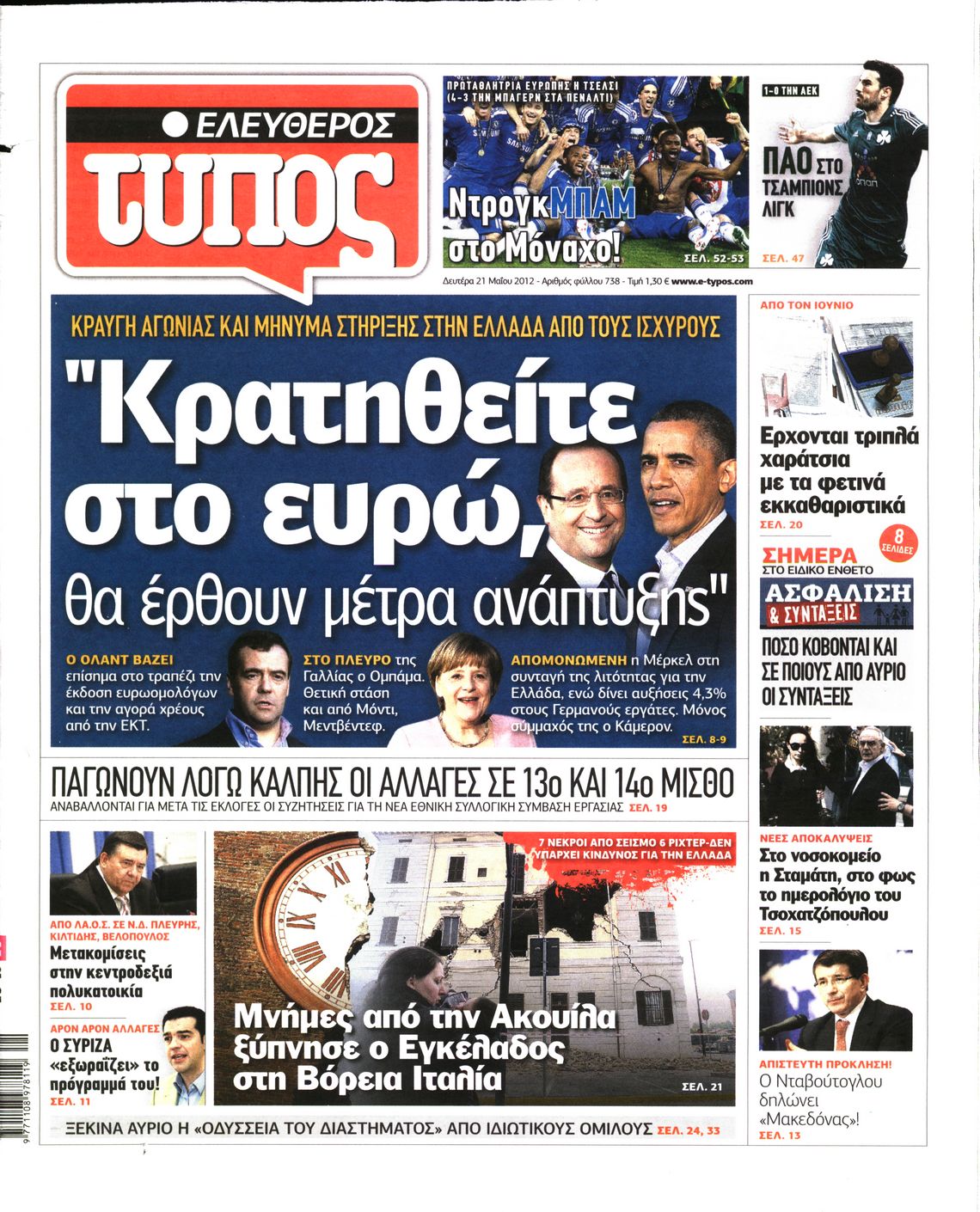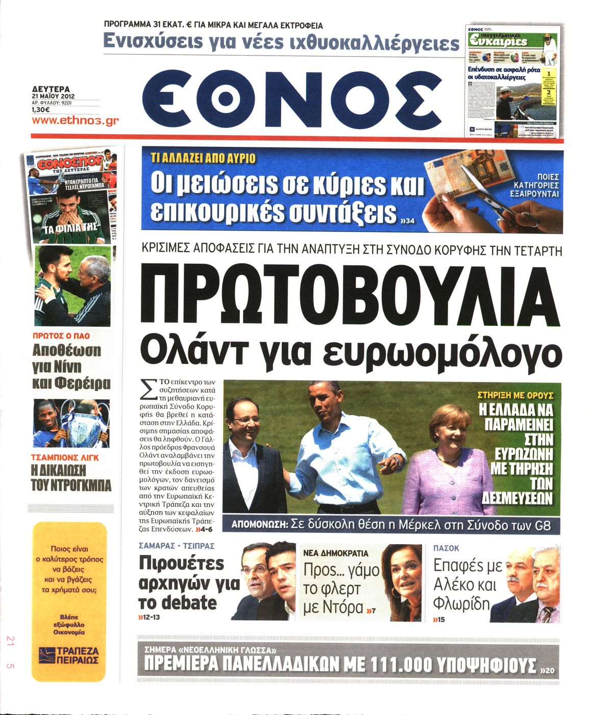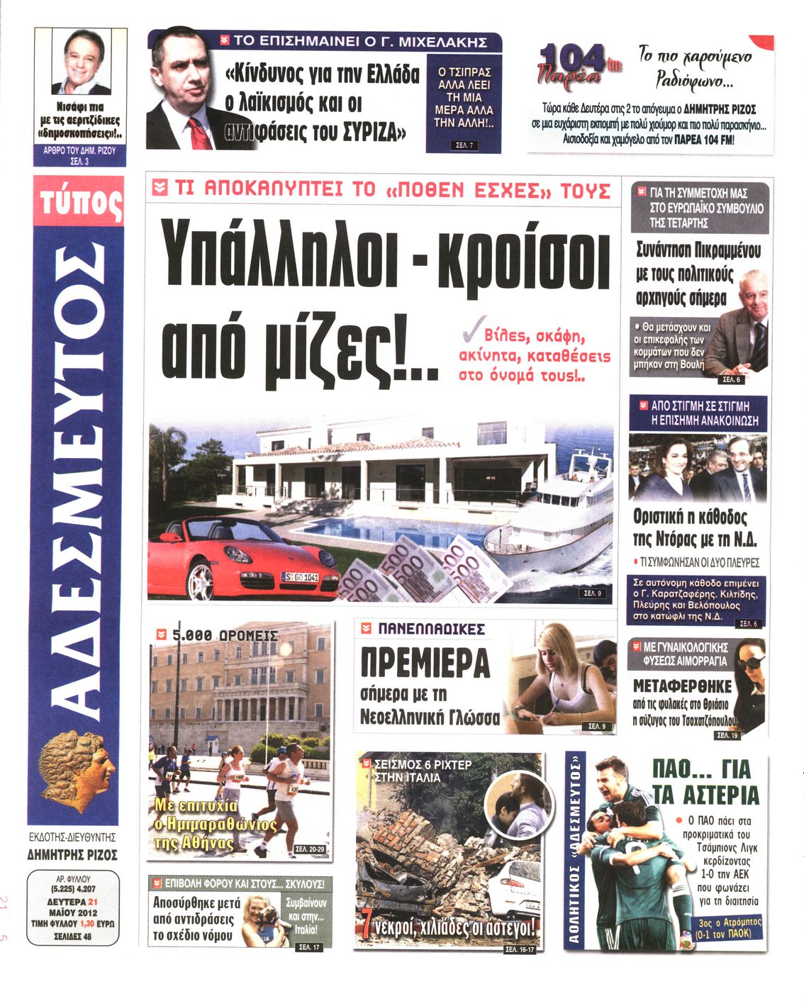 Τα πρωτοσέλιδα των εφημερίδων Enikos Newsroom 07:34, Δευτέρα 21 Μαΐου 2012 Media ΕΦΗΜΕΡΙΔΕΣ ΠΡΩΤΟΣΕΛΙΔΑ Μοιράσου το: σχολίασε κι εσύ (0 σχόλια) Ακολουθήστε το enikos.gr στο Google News και μάθετε πρώτοι όλες τις ειδήσεις Δείτε όλες τις τελευταίες ειδήσεις από την Ελλάδα και τον Κόσμο στο enikos.gr Ειδήσεις Ροή Ειδήσεων 45 λεπτά πριν Μητσοτάκης για αγρότες: Ελπίζω πως θα απομακρυνθούν σύντομα από τα μπλόκα 2 ώρες πριν Έρευνα MRB: Η πρόθεση ψήφου και τα σημαντικότερα προβλήματα – Οι «λέξεις» που εκφράζουν τους πολίτες 2 ώρες πριν Αλαλούμ με τις πληρωμές στους αγρότες: Δεν καταβλήθηκε η Βασική Ενίσχυση, αλλά έγινε παρακράτηση της εισφοράς στον ΕΛΓΑ – Τι απαντά η κυβέρνηση 2 ώρες πριν Κλέφτες άρπαξαν έναν… 12μετρο φουσκωτό Άγιο Βασίλη – «Αν κάποιος έχει πληροφορίες να επικοινωνήσει μαζί μας» 1 ώρα πριν Εξεταστική ΟΠΕΚΕΠΕ – Μυλωνάκης: «Ουδέποτε είχα πληροφόρηση ή ενημέρωσα οποιονδήποτε για επισυνδέσεις της δικογραφίας» 2 ώρες πριν Τα 4 ζώδια που ξαναβρίσκουν τον εαυτό τους – «Μπαίνετε επιτέλους στην ουσία των πραγμάτων» 3 ώρες πριν 20 χρόνια τα Χριστούγεννα ξεκινούν στα Public με μεγάλη ποικιλία σε δώρα! 2 ώρες πριν «Δεν είχα κλάψει από τότε που διαγνώστηκα με καρκίνο, ώσπου ένα τηλεφώνημα με έκανε να λυγίσω» – Η συγκλονιστική εξομολόγηση ενός άνδρα 34 λεπτά πριν Τα 7 σπάνια χαρακτηριστικά που κάνουν κάποιους ανθρώπους ακαταμάχητους 5 λεπτά πριν Μεγάλη Χριστουγεννιάτικη Αγορά στην πλατεία Κοτζιά: Ξύλινα σπιτάκια, καρουζέλ και μουσική – Όλο το πρόγραμμα 10 λεπτά πριν Εξεταστική για τον ΟΠΕΚΕΠΕ: Αντιπαράθεση για την ταυτότητα του «Φραπέ» 14 λεπτά πριν Έρευνα MRB: Οι πιο δημοφιλείς υπουργοί 22 λεπτά πριν Ακούστε την εκπομπή του Νίκου Χατζηνικολάου 17/12/2025 28 λεπτά πριν Μεξικό: Χάος στο Κογκρέσο με βουλευτίνες να «μαλλιοτραβιούνται» – Βίντεο από τη μαζική σύρραξη ENIKOS NETWORK Ανησυχητική αύξηση της υπέρτασης στα παιδιά – Πώς θα τα προστατέψουμε; Αδενώματα Υπόφυσης: Μια πάθηση καλοήθης, αλλά όχι αθώα Προϋπολογισμός: Στα 12,6 δισ. ευρώ το πρωτογενές πλεόνασμα το 11μηνο-Δείτε αναλυτικά τα στοιχεία Ελεύθεροι επαγγελματίες: Ποιοι κλάδοι δήλωσαν τους υψηλότερους ετήσιους τζίρους και ποιοι τους χαμηλότερους-Δείτε τα στοιχε... Σύγχρονος Νοστράδαμος: Προειδοποιεί για «μεγάλο γεγονός» τους επόμενους μήνες που θα συγκλονίσει τη Βρετανία και τον κόσμο Τεστ παρατηρητικότητας: Μπορείτε να βρείτε τις 3 διαφορές στις εικόνες με έναν πιγκουίνο σε 14 δευτερόλεπτα περισσότερα 12:12 , Τετάρτη 17 Δεκεμβρίου 2025 Ακούστε την εκπομπή του Νίκου Χατζηνικολάου 17/12/2025 Ακούστε την εκπομπή του Νίκου Χατζηνικολάου στον ραδιοφωνικό σταθμό RealFm 97,8, την Τετάρτη 1... 11:35 , Τετάρτη 17 Δεκεμβρίου 2025 Home Alone: Το σπίτι της ταινίας θα ανακαινιστεί – Επιστροφή στην αισθητική της δεκαετίας του ’90 Οι νέοι ιδιοκτήτες του πραγματικού σπιτιού που παρουσιάζεται στην κλασική ταινία του 1990 «Hom... 11:25 , Τετάρτη 17 Δεκεμβρίου 2025 Grand Hotel: Απόψε το τελευταίο επεισόδιο της χρονιάς – Όλα τα μυστικά μένουν εδώ Το τελευταίο επεισόδιο της χρονιάς της σειράς «Grand Hotel» θα προβληθεί απόψε στις 21:00. Ο Ά... 09:08 , Τετάρτη 17 Δεκεμβρίου 2025 Τηλεθέαση (16/12): Ανακατατάξεις στην πρωινή ψυχαγωγική ζώνη Ξεκάθαρη πρωτιά στην τηλεθέαση για την «Super Κατερίνα» στο δυναμικό κοινό με ποσοστό 18,5%, α... ΤΕΛΕΥΤΑΙΕΣ ΕΙΔΗΣΕΙΣ 5 λεπτά πριν Μεγάλη Χριστουγεννιάτικη Αγορά στην πλατεία Κοτζιά:... 10 λεπτά πριν Εξεταστική για τον ΟΠΕΚΕΠΕ: Αντιπαράθεση για την... 14 λεπτά πριν Έρευνα MRB: Οι πιο δημ