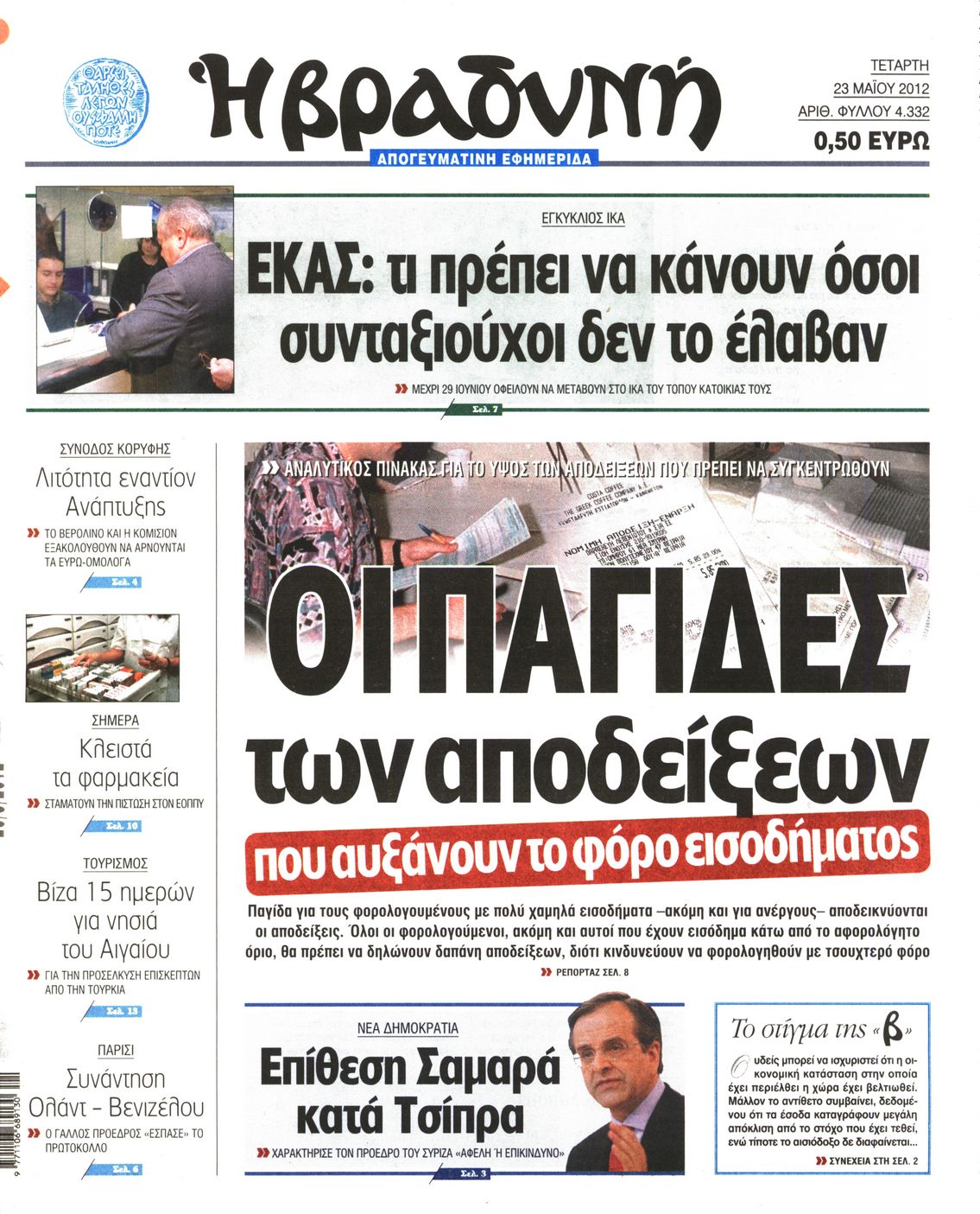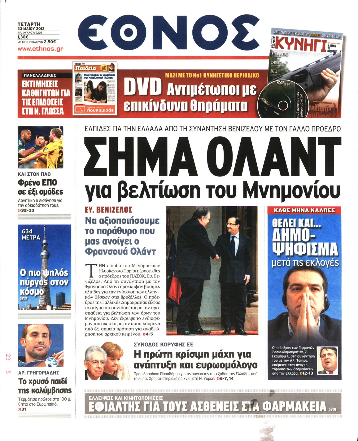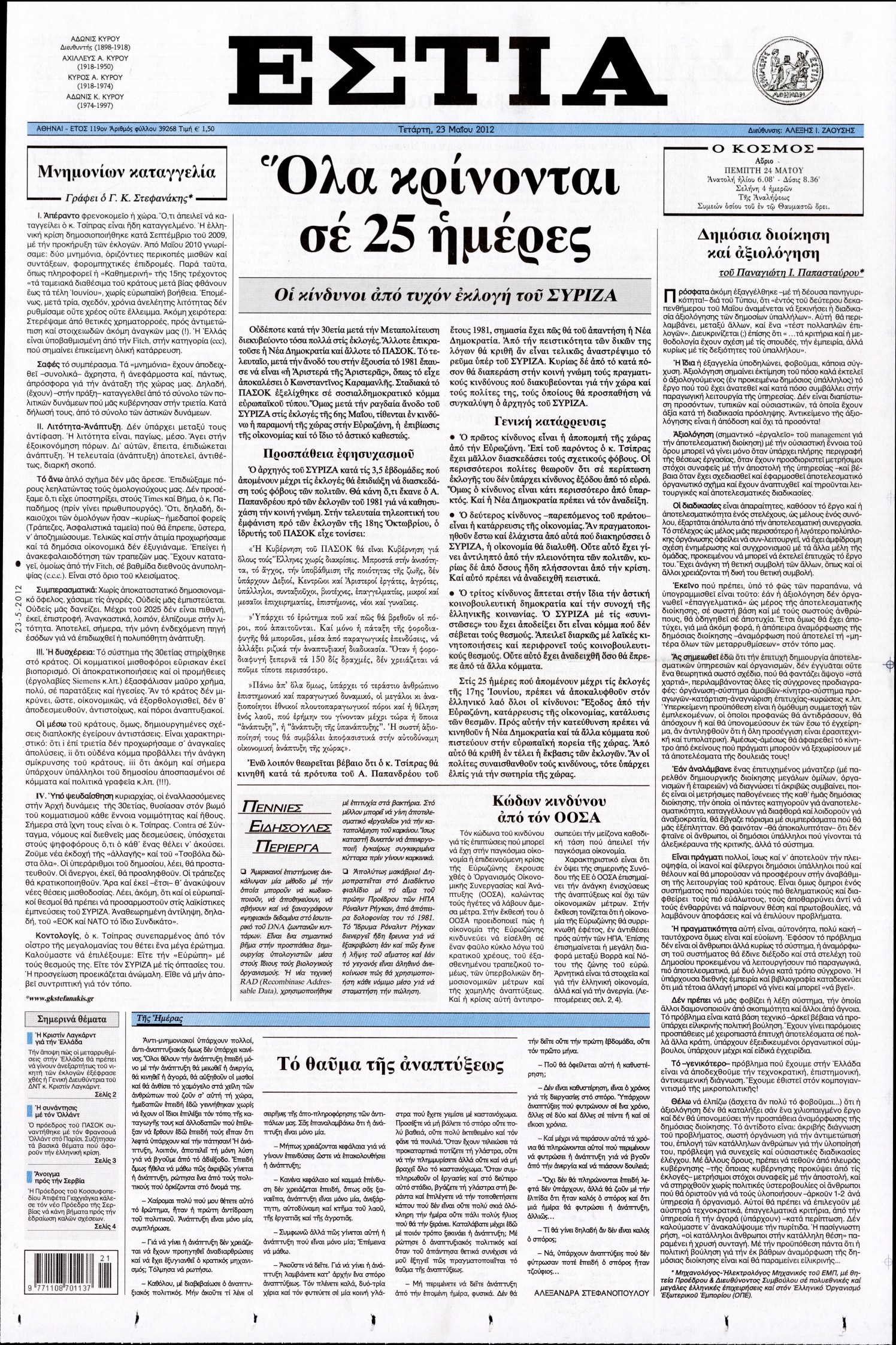Τα πρωτοσέλιδα των εφημερίδων Enikos Newsroom 07:27, Τετάρτη 23 Μαΐου 2012 Media ΕΦΗΜΕΡΙΔΕΣ ΠΡΩΤΟΣΕΛΙΔΑ Μοιράσου το: σχολίασε κι εσύ (0 σχόλια) Ακολουθήστε το enikos.gr στο Google News και μάθετε πρώτοι όλες τις ειδήσεις Δείτε όλες τις τελευταίες ειδήσεις από την Ελλάδα και τον Κόσμο στο enikos.gr Ειδήσεις Ροή Ειδήσεων 3 ώρες πριν Αυξάνουν την πίεση προς την κυβέρνηση οι αγρότες: Κλείνουν παρακαμπτήριους και ανοίγουν διόδια – Τι θα γίνει τις γιορτές 2 ώρες πριν ΟΠΕΚΕΠΕ: Προφυλακιστέος ο φερόμενος αρχηγός και ο λογιστής της εγκληματικής οργάνωσης 3 ώρες πριν Φοινικούντα: Το Σάββατο απολογείται ο 30χρονος γιος γνωστού επιχειρηματία της Πλάκας που παραδόθηκε – Όσα είπε στους αστυνομικούς και ο ρόλος του στο έγκλημα 2 ώρες πριν Μπορεί ο Μαδούρο να αντέξει τον αποκλεισμό του Τραμπ; Τι θα χρειαστεί η Ουάσινγκτον για να τον ανατρέψει 4 ώρες πριν Πρίγκιπας Ουίλιαμ – Κέιτ: Η νέα οικογενειακή φωτογραφία για τις Χριστουγεννιάτικες κάρτες του 2025 3 ώρες πριν Ύπνος: Η απλή βραδινή ρουτίνα για να προστατεύσετε τα μαλλιά σας από το κρύο κατά τη διάρκεια του χειμώνα 4 ώρες πριν Manifesting: Πώς να συναντήσετε τον σύντροφο της ζωής σας, ανάλογα με τον μήνα γέννησής σας 2 ημέρες πριν 20 χρόνια τα Χριστούγεννα ξεκινούν στα Public με μεγάλη ποικιλία σε δώρα! 2 ώρες πριν Αρχαιολόγοι ανακάλυψαν ρωμαϊκά τεχνουργήματα από μια πόλη που δεν υπήρξε ποτέ – Τα τρία εντυπωσιακά κτίρια και ο αμφορέας με τις… σαρδέλες 4 λεπτά πριν ΟΗΕ: Iστορική επίσκεψη του Συμβουλίου Ασφαλείας στη Δαμασκό – Mήνυμα Ελλάδας για συμπερίληψη και λογοδοσία 11 λεπτά πριν Νέος πρέσβης της Μεγάλης Βρετανίας στις ΗΠΑ ο Κρίστιαν Τέρνερ 15 λεπτά πριν Conference League: Με Νόα, Ντρίτα, Άλκμααρ ή Τσέλιε στους «16» η ΑΕΚ 23 λεπτά πριν Conference League: Απευθείας στους «16» η ΑΕΚ Λάρνακας και η Ρακόβ των Σβάρνα και Κωνσταντόπουλου – Τα αποτελέσματα και η βαθμολογία, 3η η ΑΕΚ 33 λεπτά πριν Σε ομάδες που συνδέονται με το ρωσικό κράτος αποδίδει η Δανία δύο κυβερνοεπιθέσεις που δέχθηκε ENIKOS NETWORK Σε περίοδο αυξημένης δραστηριότητας η γρίπη στην Ελλάδα-Μέτρα προστασίας από τον ΕΟΔΥ Σκέφτεστε συνέχεια συζητήσεις που έχετε κάνει; Τι σημαίνει αυτό, σύμφωνα με ειδικό Στεγαστικό: Τι λέει η ΠΟΜΙΔΑ για τα νέα μέτρα που ανακοίνωσε ο Κυριάκος Μητσοτάκης Λαγκάρντ: Αισιόδοξη για την ανάπτυξη της Ευρωζώνης, αβέβαιη για τον πληθωρισμό Χαρτογραφώντας το «σημείο χωρίς επιστροφή»: Για πρώτη φορά αποκαλύπτεται με λεπτομέρεια το ακανθώδες όριο της ατμόσφαιρας τ... Η Google καταργεί τη λειτουργία «dark web report» – Πώς θα μπορούν οι χρήστες να διαγράφουν τα δεδομένα τους περισσότερα 17:45 , Πέμπτη 18 Δεκεμβρίου 2025 ROUK ZOUK: Εορταστικό επεισόδιο με καλεσμένους τους πρωταγωνιστές του «Γιατί ρε πατέρα» Το Σάββατο 20 Δεκεμβρίου στις 21:00, η Ζέτα Μακρυπούλια υποδέχεται εκλεκτούς ηθοποιούς που όλο... 17:20 , Πέμπτη 18 Δεκεμβρίου 2025 Άγιος έρωτας: Η Χριστίνα εξομολογείται στον πατέρα Νικόλαο, απόψε στις 21:00 στον Alpha Η Νότα αποφασίζει να εκδικηθεί τον Πέτρο και τον Στέφανο, για χάρη του Λούη, όμως τα πράγματα ... 16:50 , Πέμπτη 18 Δεκεμβρίου 2025 Να μ’ αγαπάς: Ζωή και Φωτεινή συμφιλιώνονται ως μάνα με κόρη, απόψε στις 20:00 Η ταυτότητα του Άγγελου αποκαλύπτεται στο νέο επεισόδιο της σειράς “Να μ’ αγαπάς... 15:52 , Πέμπτη 18 Δεκεμβρίου 2025 Το Σπίτι Δίπλα Στο Ποτάμι: Το καθηλωτικό τελευταίο επεισόδιο για το 2025 απόψε στις 22:30 Καθηλώνει το σημερινό επεισόδιο της σειράς “Το Σπίτι Δίπλα Στο Ποτάμι” που έρχεται... ΤΕΛΕΥΤΑΙΕΣ ΕΙΔΗΣΕΙΣ 4 λεπτ