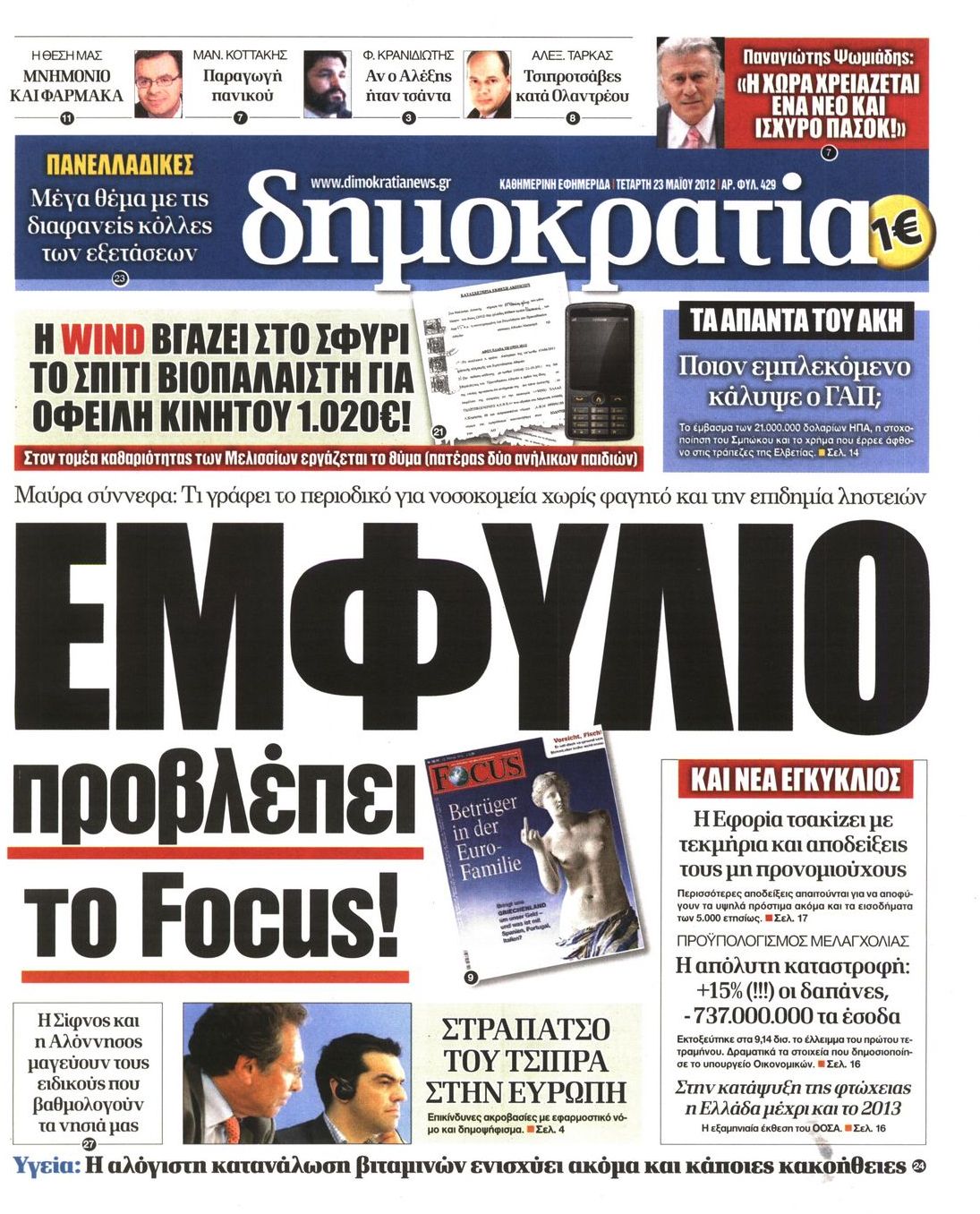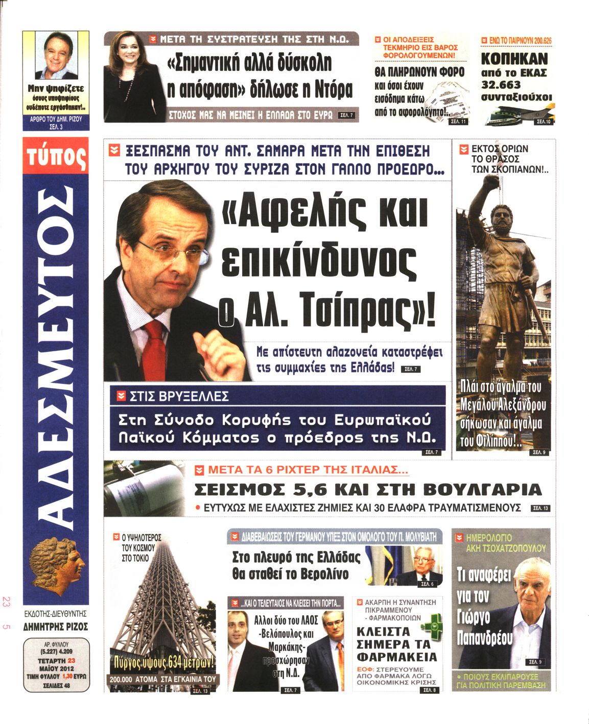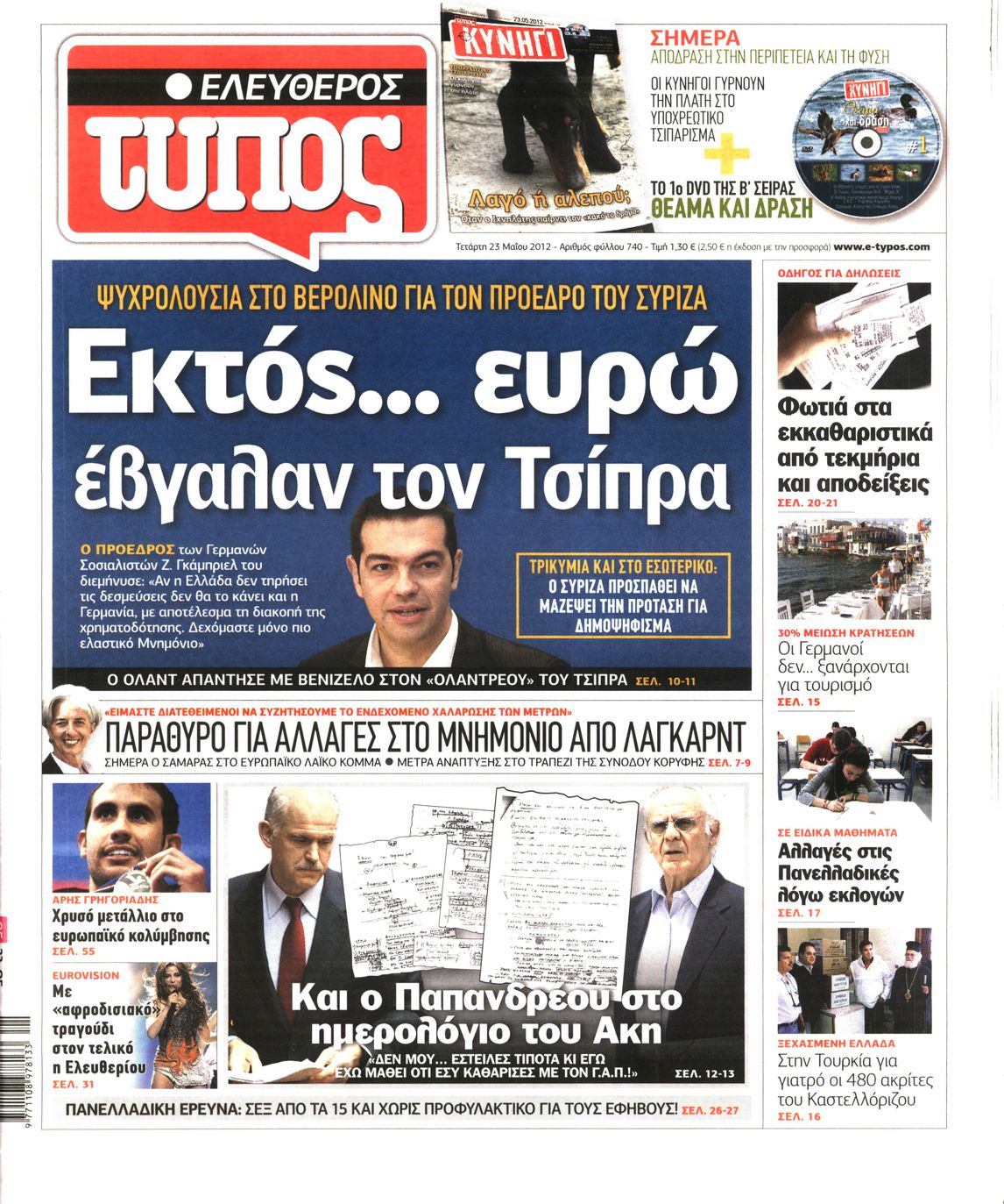 Τα πρωτοσέλιδα των εφημερίδων Enikos Newsroom 07:27, Τετάρτη 23 Μαΐου 2012 Media ΕΦΗΜΕΡΙΔΕΣ ΠΡΩΤΟΣΕΛΙΔΑ Μοιράσου το: σχολίασε κι εσύ (0 σχόλια) Ακολουθήστε το enikos.gr στο Google News και μάθετε πρώτοι όλες τις ειδήσεις Δείτε όλες τις τελευταίες ειδήσεις από την Ελλάδα και τον Κόσμο στο enikos.gr Ειδήσεις Ροή Ειδήσεων 3 ώρες πριν Αυξάνουν την πίεση προς την κυβέρνηση οι αγρότες: Κλείνουν παρακαμπτήριους και ανοίγουν διόδια – Τι θα γίνει τις γιορτές 2 ώρες πριν ΟΠΕΚΕΠΕ: Προφυλακιστέος ο φερόμενος αρχηγός και ο λογιστής της εγκληματικής οργάνωσης 3 ώρες πριν Φοινικούντα: Το Σάββατο απολογείται ο 30χρονος γιος γνωστού επιχειρηματία της Πλάκας που παραδόθηκε – Όσα είπε στους αστυνομικούς και ο ρόλος του στο έγκλημα 2 ώρες πριν Μπορεί ο Μαδούρο να αντέξει τον αποκλεισμό του Τραμπ; Τι θα χρειαστεί η Ουάσινγκτον για να τον ανατρέψει 4 ώρες πριν Πρίγκιπας Ουίλιαμ – Κέιτ: Η νέα οικογενειακή φωτογραφία για τις Χριστουγεννιάτικες κάρτες του 2025 3 ώρες πριν Ύπνος: Η απλή βραδινή ρουτίνα για να προστατεύσετε τα μαλλιά σας από το κρύο κατά τη διάρκεια του χειμώνα 4 ώρες πριν Manifesting: Πώς να συναντήσετε τον σύντροφο της ζωής σας, ανάλογα με τον μήνα γέννησής σας 2 ημέρες πριν 20 χρόνια τα Χριστούγεννα ξεκινούν στα Public με μεγάλη ποικιλία σε δώρα! 2 ώρες πριν Αρχαιολόγοι ανακάλυψαν ρωμαϊκά τεχνουργήματα από μια πόλη που δεν υπήρξε ποτέ – Τα τρία εντυπωσιακά κτίρια και ο αμφορέας με τις… σαρδέλες 4 λεπτά πριν ΟΗΕ: Iστορική επίσκεψη του Συμβουλίου Ασφαλείας στη Δαμασκό – Mήνυμα Ελλάδας για συμπερίληψη και λογοδοσία 11 λεπτά πριν Νέος πρέσβης της Μεγάλης Βρετανίας στις ΗΠΑ ο Κρίστιαν Τέρνερ 15 λεπτά πριν Conference League: Με Νόα, Ντρίτα, Άλκμααρ ή Τσέλιε στους «16» η ΑΕΚ 23 λεπτά πριν Conference League: Απευθείας στους «16» η ΑΕΚ Λάρνακας και η Ρακόβ των Σβάρνα και Κωνσταντόπουλου – Τα αποτελέσματα και η βαθμολογία, 3η η ΑΕΚ 33 λεπτά πριν Σε ομάδες που συνδέονται με το ρωσικό κράτος αποδίδει η Δανία δύο κυβερνοεπιθέσεις που δέχθηκε ENIKOS NETWORK Σε περίοδο αυξημένης δραστηριότητας η γρίπη στην Ελλάδα-Μέτρα προστασίας από τον ΕΟΔΥ Σκέφτεστε συνέχεια συζητήσεις που έχετε κάνει; Τι σημαίνει αυτό, σύμφωνα με ειδικό Στεγαστικό: Τι λέει η ΠΟΜΙΔΑ για τα νέα μέτρα που ανακοίνωσε ο Κυριάκος Μητσοτάκης Λαγκάρντ: Αισιόδοξη για την ανάπτυξη της Ευρωζώνης, αβέβαιη για τον πληθωρισμό Χαρτογραφώντας το «σημείο χωρίς επιστροφή»: Για πρώτη φορά αποκαλύπτεται με λεπτομέρεια το ακανθώδες όριο της ατμόσφαιρας τ... Η Google καταργεί τη λειτουργία «dark web report» – Πώς θα μπορούν οι χρήστες να διαγράφουν τα δεδομένα τους περισσότερα 17:45 , Πέμπτη 18 Δεκεμβρίου 2025 ROUK ZOUK: Εορταστικό επεισόδιο με καλεσμένους τους πρωταγωνιστές του «Γιατί ρε πατέρα» Το Σάββατο 20 Δεκεμβρίου στις 21:00, η Ζέτα Μακρυπούλια υποδέχεται εκλεκτούς ηθοποιούς που όλο... 17:20 , Πέμπτη 18 Δεκεμβρίου 2025 Άγιος έρωτας: Η Χριστίνα εξομολογείται στον πατέρα Νικόλαο, απόψε στις 21:00 στον Alpha Η Νότα αποφασίζει να εκδικηθεί τον Πέτρο και τον Στέφανο, για χάρη του Λούη, όμως τα πράγματα ... 16:50 , Πέμπτη 18 Δεκεμβρίου 2025 Να μ’ αγαπάς: Ζωή και Φωτεινή συμφιλιώνονται ως μάνα με κόρη, απόψε στις 20:00 Η ταυτότητα του Άγγελου αποκαλύπτεται στο νέο επεισόδιο της σειράς “Να μ’ αγαπάς... 15:52 , Πέμπτη 18 Δεκεμβρίου 2025 Το Σπίτι Δίπλα Στο Ποτάμι: Το καθηλωτικό τελευταίο επεισόδιο για το 2025 απόψε στις 22:30 Καθηλώνει το σημερινό επεισόδιο της σειράς “Το Σπίτι Δίπλα Στο Ποτάμι” που έρχεται... ΤΕΛΕΥΤΑΙΕΣ ΕΙΔΗΣΕΙΣ 4 λεπτ