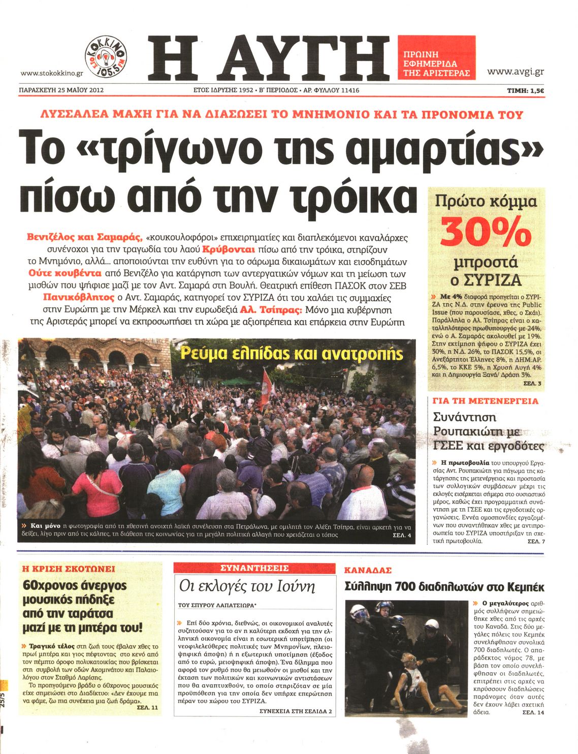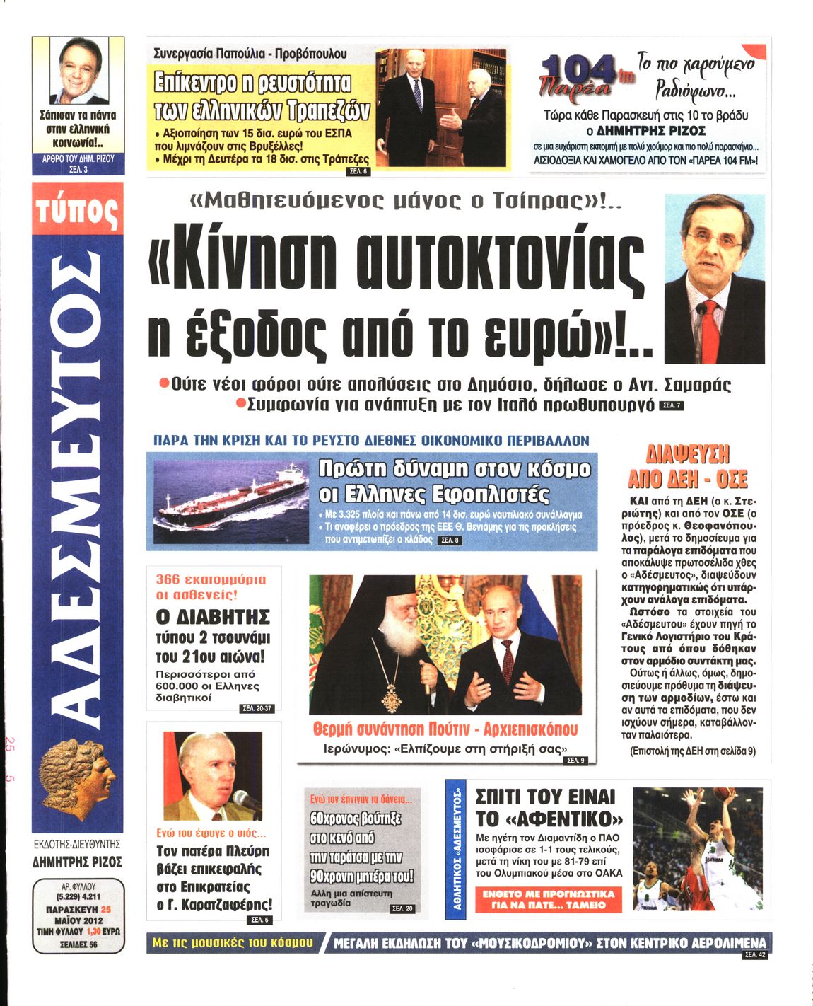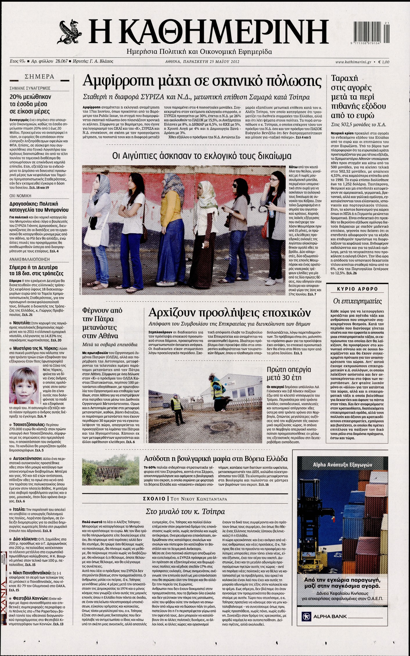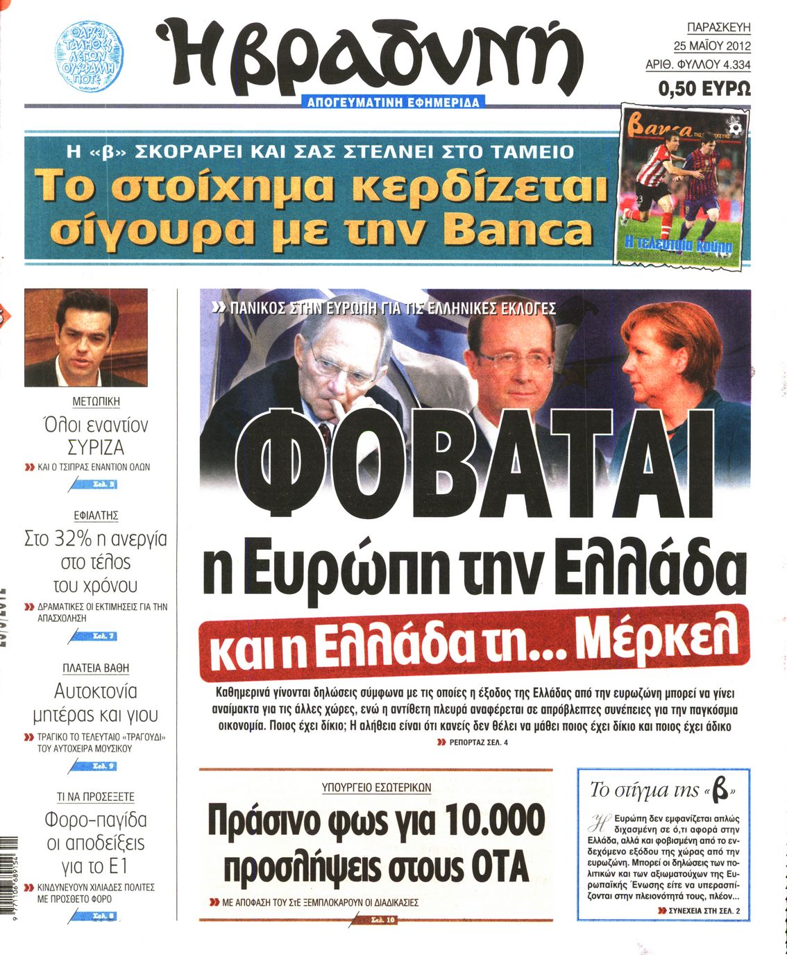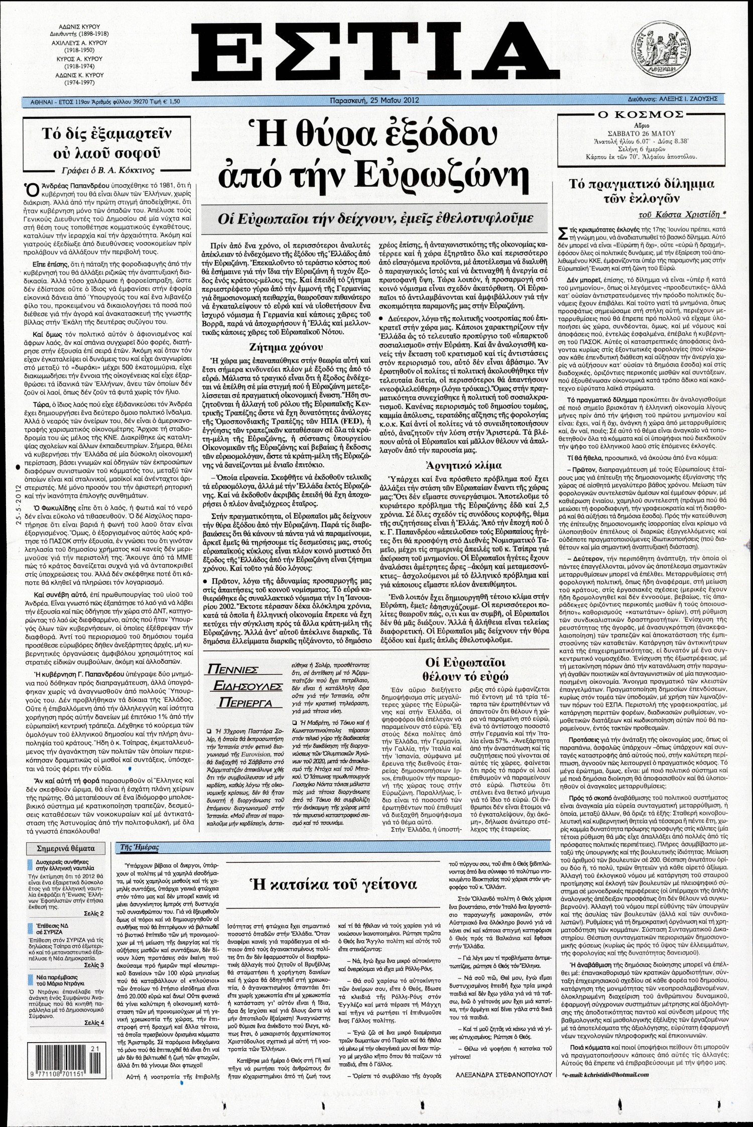 Τα πρωτοσέλιδα των εφημερίδων Enikos Newsroom 07:29, Παρασκευή 25 Μαΐου 2012 Media ΕΦΗΜΕΡΙΔΕΣ ΠΡΩΤΟΣΕΛΙΔΑ Μοιράσου το: σχολίασε κι εσύ (0 σχόλια) Ακολουθήστε το enikos.gr στο Google News και μάθετε πρώτοι όλες τις ειδήσεις Δείτε όλες τις τελευταίες ειδήσεις από την Ελλάδα και τον Κόσμο στο enikos.gr Ειδήσεις Ροή Ειδήσεων 8 ώρες πριν Μητσοτάκης: Αναγκαία η μεταρρύθμιση του πρωτογενούς τομέα – Τα 6 νέα μέτρα για το στεγαστικό και οι αναφορές σε «Ιθάκη» και «πολιτικούς του καναπέ» 7 ώρες πριν Δάνεια σε ελβετικό φράγκο: Τα βασικά σημεία της ρύθμισης – ανάσας για 40.000 δανειολήπτες – Αναλυτικός οδηγός με ερωτήσεις και απαντήσεις 7 ώρες πριν Κυψέλη: Εξιτήριο πήρε η 14χρονη μαθήτρια που μαχαιρώθηκε από την 16χρονη σε σχολείο – «Θέλω να βοηθήσω το παιδί, έχει μπλέξει με κακές παρέες» 6 ώρες πριν Τραμπ: Γιατί κατέθεσε τώρα την αγωγή κατά του BBC – Πώς η κίνησή του εξυπηρετεί το νέο δόγμα του για «αντίσταση» στην Ευρώπη, υπέρ των συντηρητικών 7 ώρες πριν ΟΠΕΚΕΠΕ – Παράνομες επιδοτήσεις: Ελεύθεροι με περιοριστικούς όρους και οι 7 κατηγορούμενοι που απολογήθηκαν σήμερα 6 ώρες πριν Ανακαλύφθηκε βυθισμένη πέτρινη κατασκευή ανοιχτά της Κριμαίας – Αποτελεί μέρος αρχαίας ελληνικής αποικίας 7 ώρες πριν Ύπνος: Αυτό μπορεί να είναι το χειρότερο λάθος για το βιολογικό ρολόι σας, σύμφωνα με ειδικό 8 ώρες πριν Αριθμολογία: Οι άνθρωποι που έχουν γεννηθεί αυτές τις 3 ημερομηνίες, προσελκύουν μεγάλη τύχη πριν από το τέλος του 2025 10 ώρες πριν Οι 7 συμπεριφορές που μαρτυρούν ότι ένας άνδρας επενδύει μακροπρόθεσμα σε μια σχέση 5 λεπτά πριν Κόστα Ρίκα: Το Κογκρέσο απέρριψε το αίτημα για άρση της ασυλίας του προέδρου Τσάβες 13 λεπτά πριν Κολομβία: Νεκροί τέσσερις αστυνομικοί σε βομβιστικές επιθέσεις ανταρτών 21 λεπτά πριν Στάση εργασίας 11:00 – 17:00 σήμερα στα λεωφορεία του ΟΑΣΑ – Ποιες γραμμές θα λειτουργήσουν 37 λεπτά πριν Παλαιστινιακό: «Η λύση των δύο κρατών είναι ο μόνος βιώσιμος δρόμος», τόνισε η Ελλάδα στο Συμβούλιο Ασφαλείας του ΟΗΕ 44 λεπτά πριν Ελένη Καρακάση: «Ένιωθα πολύ αδικημένη, δεν μπορούσα να ελέγξω τον εαυτό μου σε δύσκολες στιγμές» ENIKOS NETWORK Αίτημα ΙΣΑ για την εξαίρεση των προσωπικών γιατρών από τις κατ’ οίκον επισκέψεις Η σκανδιναβική μέθοδος στον ύπνο που μπορεί να σώσει έναν γάμο Πιερρακάκης: Ο προϋπολογισμός συμβάλλει ουσιαστικά στην ενίσχυση της αγοραστικής δύναμης της πλειονότητας των εργαζομένων e-ΕΦΚΑ: Παρατείνεται η προθεσμία για την υποβολή ΑΠΔ – Ποιους αφορά Σύγχρονος Νοστράδαμος: Προειδοποιεί για «μεγάλο γεγονός» τους επόμενους μήνες που θα συγκλονίσει τη Βρετανία και τον κόσμο Τεστ παρατηρητικότητας: Μπορείτε να βρείτε τις 3 διαφορές στις εικόνες με έναν πιγκουίνο σε 14 δευτερόλεπτα περισσότερα 20:06 , Τρίτη 16 Δεκεμβρίου 2025 Ο ΣΚΑΙ καταγγέλλει τον ΕΚΚΟΜΕΔ Επιστολή με την οποία καταγράφει την έντονη διαμαρτυρία του προς τον διευθύνοντα σύμβουλο του... 17:40 , Τρίτη 16 Δεκεμβρίου 2025 Eurovision: Στις 4 Ιανουαρίου αποκαλύπτονται τα 28 τραγούδια του ελληνικού τελικού Η αγωνία τελειώνει, η γιορτή της Eurovision αρχίζει στην ΕΡΤ από τις πρώτες ημέρες της νέας χρ... 17:09 , Τρίτη 16 Δεκεμβρίου 2025 Alter Ego Media: Βαθύτατη θλίψη και ειλικρινή συλλυπητήρια για την απώλεια της Ειρήνης Μαρινάκη Τη βαθύτατη θλίψη και τα ειλικρινή συλλυπητήριά της εκφράζει η Alter Ego Media για τον θάνατο ... 13:00 , Τρίτη 16 Δεκεμβρίου 2025 «Στο Παρά Πέντε – 20 Χρόνια Μετά»: Κυκλοφόρησε το τρέιλερ του επετειακού επεισοδίου της θρυλικής σειράς – Π