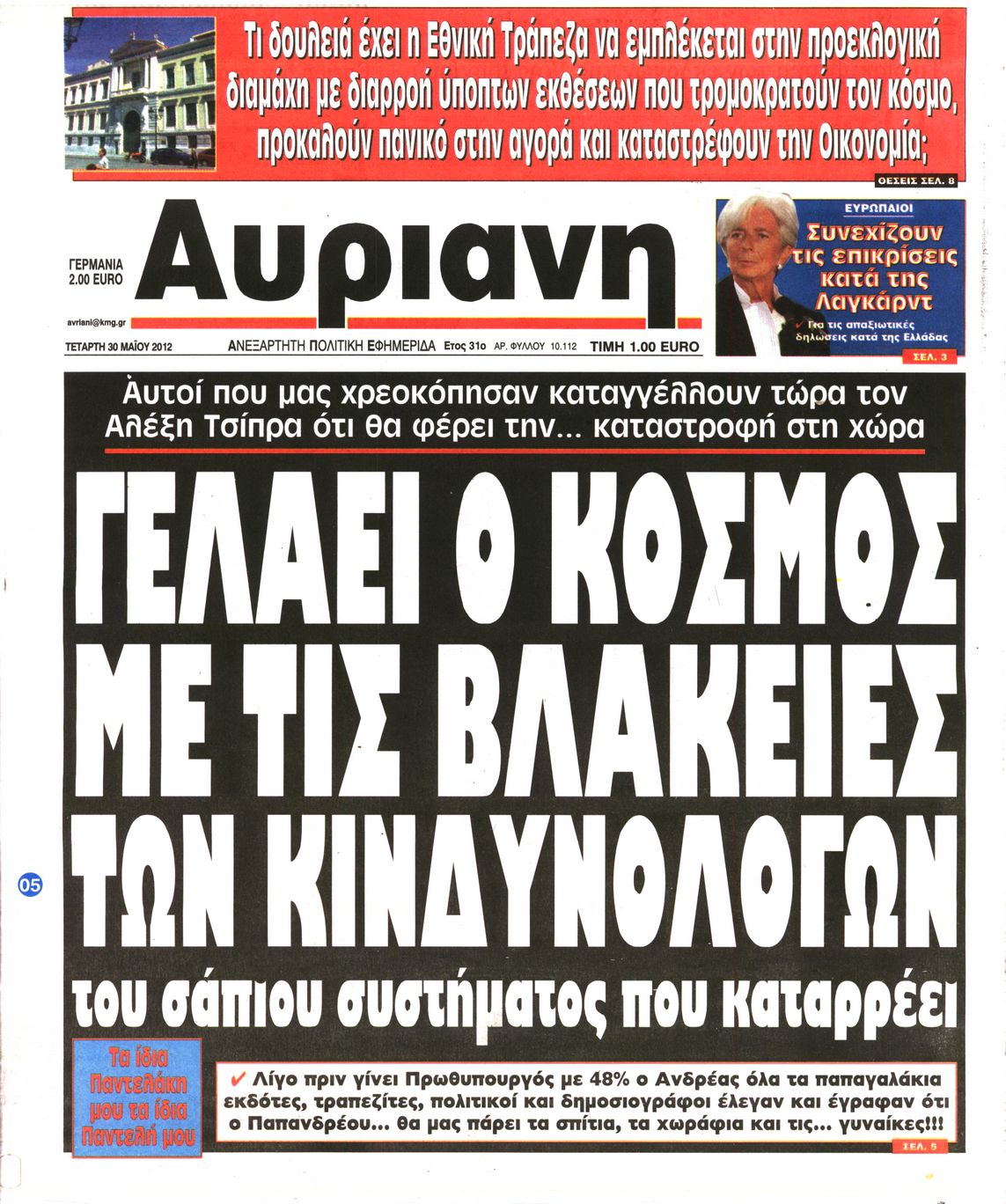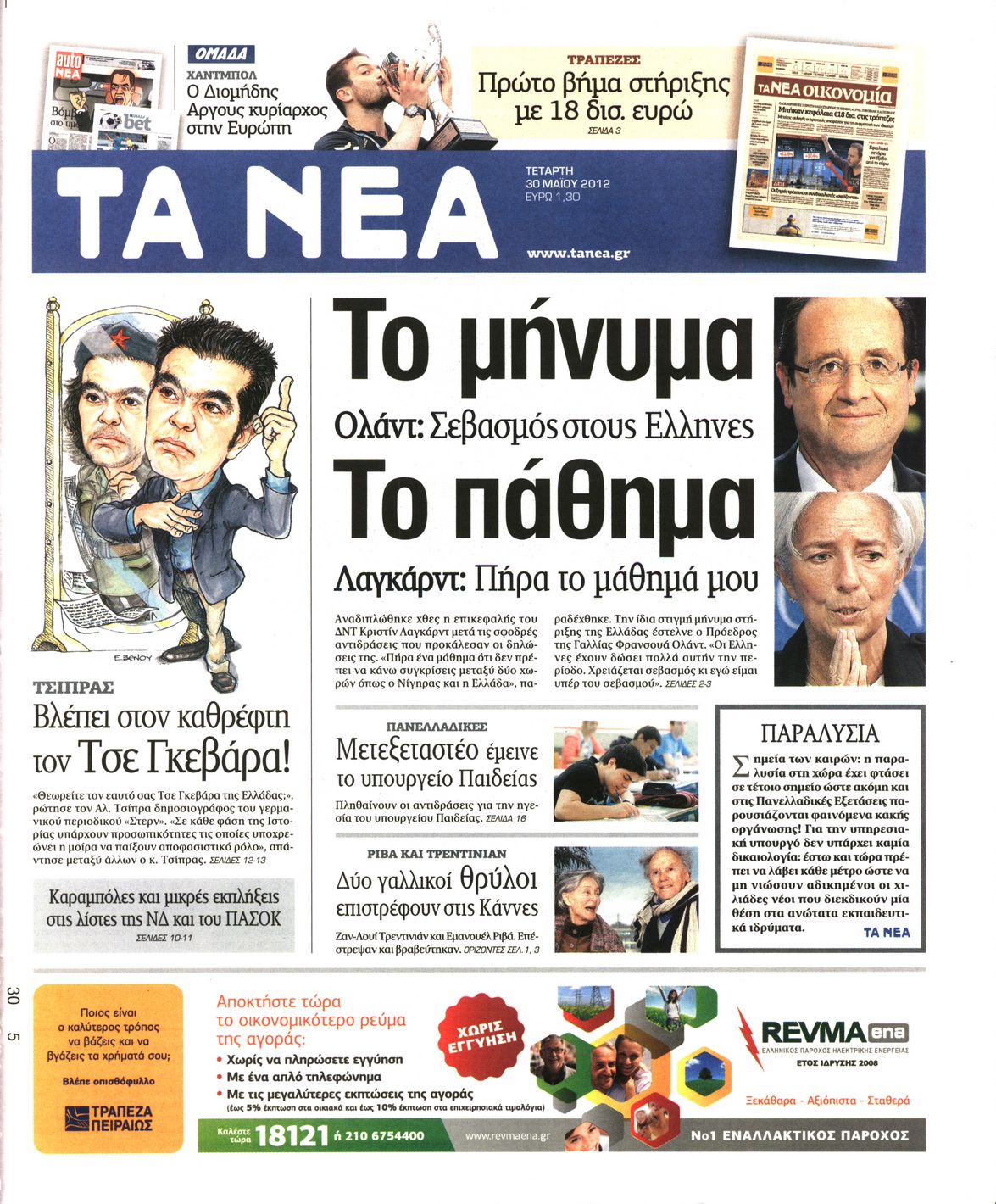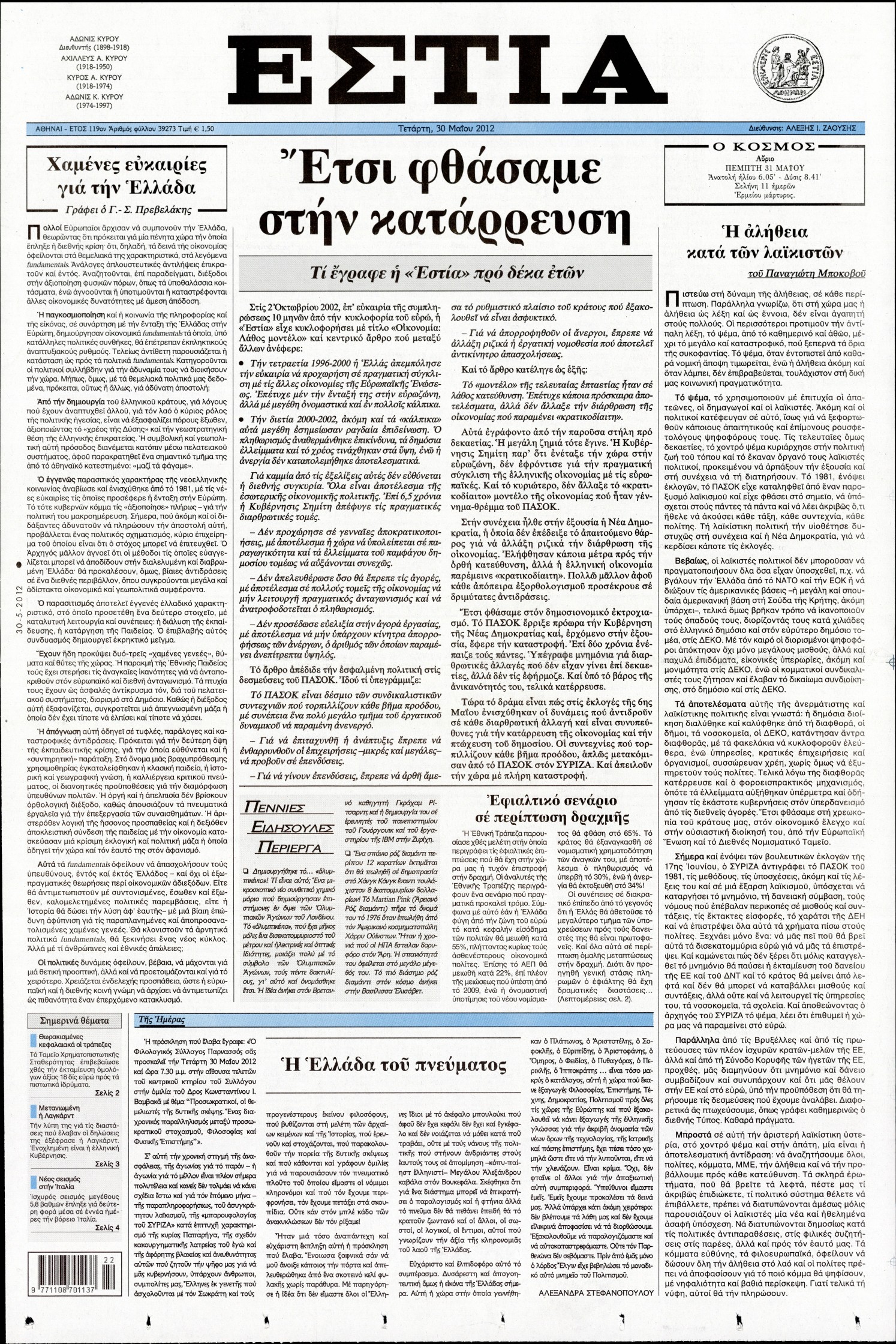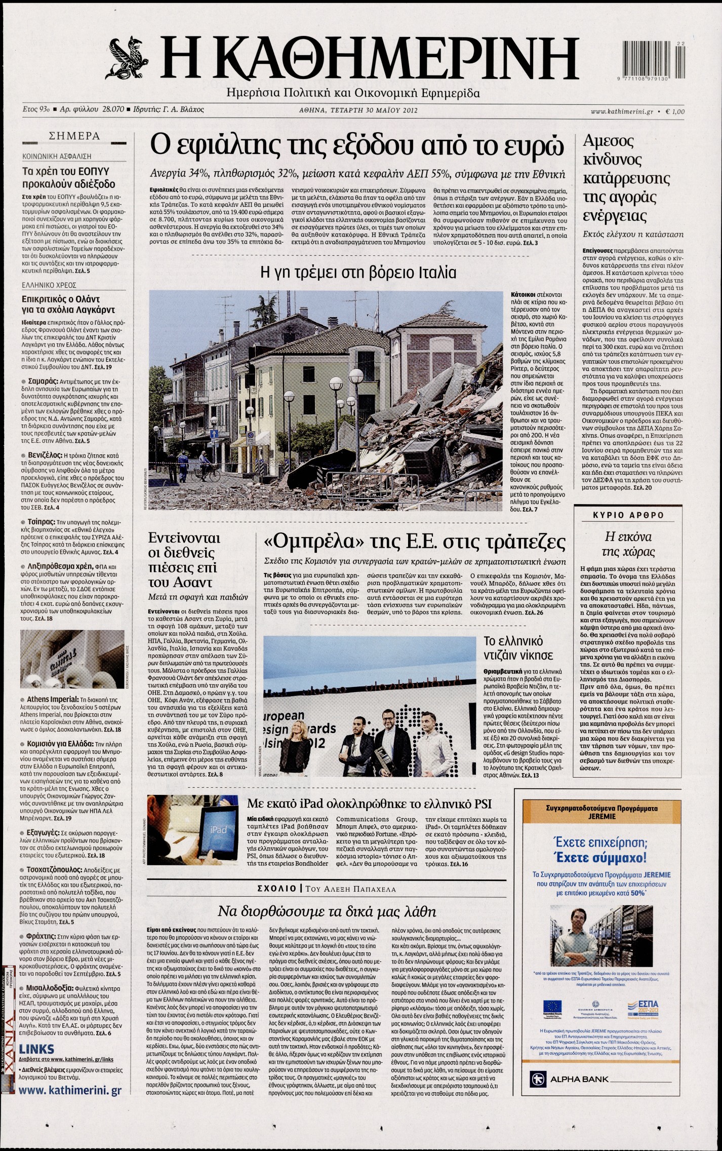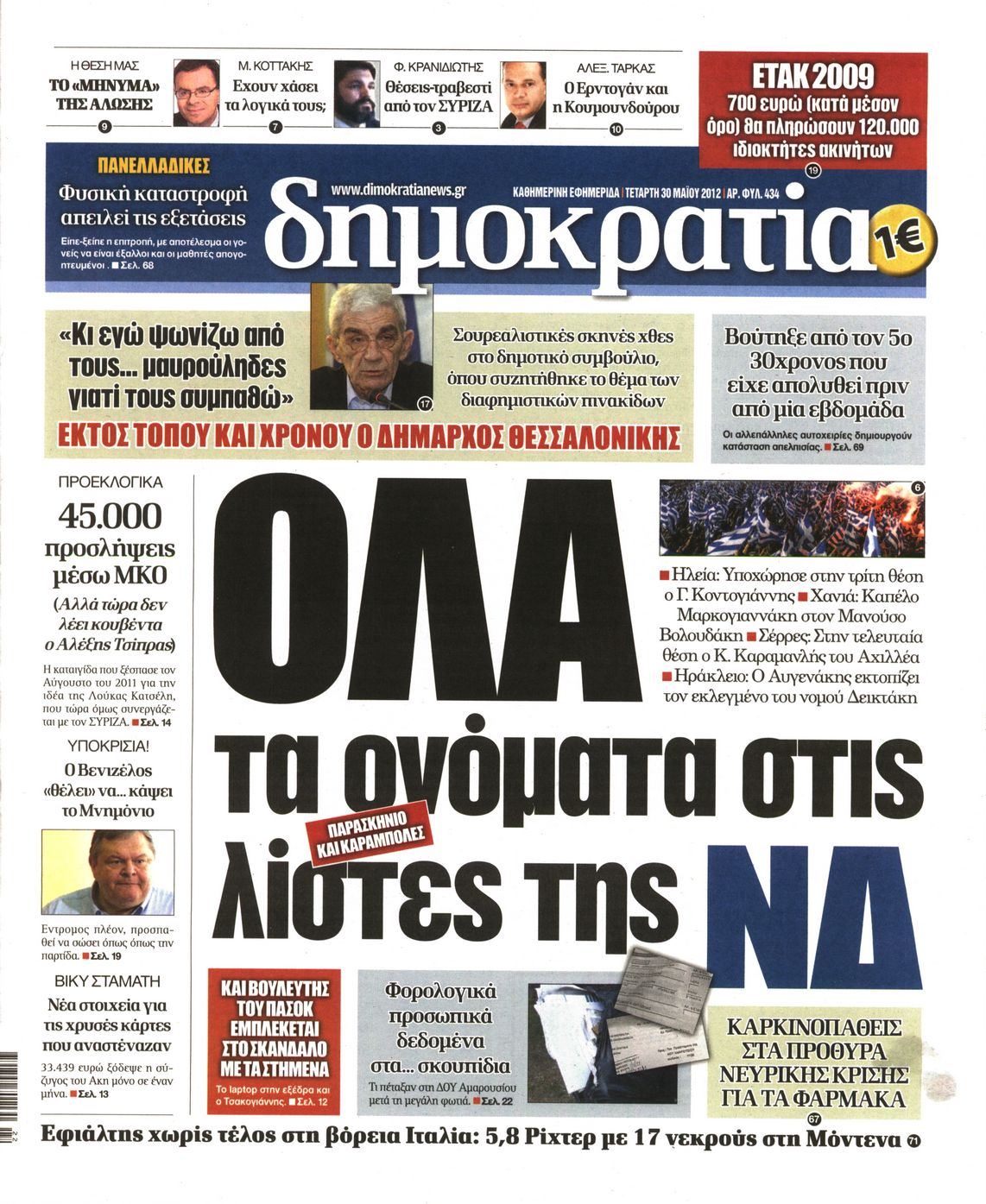 Τα πρωτοσέλιδα των εφημερίδων Enikos Newsroom 07:31, Τετάρτη 30 Μαΐου 2012 Media ΕΦΗΜΕΡΙΔΕΣ ΠΡΩΤΟΣΕΛΙΔΑ Μοιράσου το: σχολίασε κι εσύ (0 σχόλια) Ακολουθήστε το enikos.gr στο Google News και μάθετε πρώτοι όλες τις ειδήσεις Δείτε όλες τις τελευταίες ειδήσεις από την Ελλάδα και τον Κόσμο στο enikos.gr Ειδήσεις Ροή Ειδήσεων 7 ώρες πριν Μητσοτάκης: Αναγκαία η μεταρρύθμιση του πρωτογενούς τομέα – Τα 6 νέα μέτρα για το στεγαστικό και οι αναφορές σε «Ιθάκη» και «πολιτικούς του καναπέ» 6 ώρες πριν Δάνεια σε ελβετικό φράγκο: Τα βασικά σημεία της ρύθμισης – ανάσας για 40.000 δανειολήπτες – Αναλυτικός οδηγός με ερωτήσεις και απαντήσεις 6 ώρες πριν Κυψέλη: Εξιτήριο πήρε η 14χρονη μαθήτρια που μαχαιρώθηκε από την 16χρονη σε σχολείο – «Θέλω να βοηθήσω το παιδί, έχει μπλέξει με κακές παρέες» 6 ώρες πριν Τραμπ: Γιατί κατέθεσε τώρα την αγωγή κατά του BBC – Πώς η κίνησή του εξυπηρετεί το νέο δόγμα του για «αντίσταση» στην Ευρώπη, υπέρ των συντηρητικών 7 ώρες πριν ΟΠΕΚΕΠΕ – Παράνομες επιδοτήσεις: Ελεύθεροι με περιοριστικούς όρους και οι 7 κατηγορούμενοι που απολογήθηκαν σήμερα 6 ώρες πριν Ανακαλύφθηκε βυθισμένη πέτρινη κατασκευή ανοιχτά της Κριμαίας – Αποτελεί μέρος αρχαίας ελληνικής αποικίας 7 ώρες πριν Ύπνος: Αυτό μπορεί να είναι το χειρότερο λάθος για το βιολογικό ρολόι σας, σύμφωνα με ειδικό 8 ώρες πριν Αριθμολογία: Οι άνθρωποι που έχουν γεννηθεί αυτές τις 3 ημερομηνίες, προσελκύουν μεγάλη τύχη πριν από το τέλος του 2025 10 ώρες πριν Οι 7 συμπεριφορές που μαρτυρούν ότι ένας άνδρας επενδύει μακροπρόθεσμα σε μια σχέση 9 λεπτά πριν Παλαιστινιακό: «Η λύση των δύο κρατών είναι ο μόνος βιώσιμος δρόμος», τόνισε η Ελλάδα στο Συμβούλιο Ασφαλείας του ΟΗΕ 16 λεπτά πριν Ελένη Καρακάση: «Ένιωθα πολύ αδικημένη, δεν μπορούσα να ελέγξω τον εαυτό μου σε δύσκολες στιγμές» 24 λεπτά πριν Κλαούδια Σέινμπαουμ προς Ντόναλντ Τραμπ για φαιντανύλη: Να επιτεθούμε στα αίτια κατανάλωσης αντί να την κατατάσσουμε στα «όπλα μαζικής καταστροφής» 32 λεπτά πριν Ρωσία: Ουκρανική επίθεση με drones στο Κρασνοντάρ – Δύο τραυματίες, ζημιές σε σπίτια και διακοπή ρεύματος 41 λεπτά πριν Αντόνιο Ταγιάνι: Νομικά εμπόδια για τη χρήση των ρωσικών κεφαλαίων υπέρ της Ουκρανίας ENIKOS NETWORK Αίτημα ΙΣΑ για την εξαίρεση των προσωπικών γιατρών από τις κατ’ οίκον επισκέψεις Η σκανδιναβική μέθοδος στον ύπνο που μπορεί να σώσει έναν γάμο Πιερρακάκης: Ο προϋπολογισμός συμβάλλει ουσιαστικά στην ενίσχυση της αγοραστικής δύναμης της πλειονότητας των εργαζομένων e-ΕΦΚΑ: Παρατείνεται η προθεσμία για την υποβολή ΑΠΔ – Ποιους αφορά Σύγχρονος Νοστράδαμος: Προειδοποιεί για «μεγάλο γεγονός» τους επόμενους μήνες που θα συγκλονίσει τη Βρετανία και τον κόσμο Τεστ παρατηρητικότητας: Μπορείτε να βρείτε τις 3 διαφορές στις εικόνες με έναν πιγκουίνο σε 14 δευτερόλεπτα περισσότερα 20:06 , Τρίτη 16 Δεκεμβρίου 2025 Ο ΣΚΑΙ καταγγέλλει τον ΕΚΚΟΜΕΔ Επιστολή με την οποία καταγράφει την έντονη διαμαρτυρία του προς τον διευθύνοντα σύμβουλο του... 17:40 , Τρίτη 16 Δεκεμβρίου 2025 Eurovision: Στις 4 Ιανουαρίου αποκαλύπτονται τα 28 τραγούδια του ελληνικού τελικού Η αγωνία τελειώνει, η γιορτή της Eurovision αρχίζει στην ΕΡΤ από τις πρώτες ημέρες της νέας χρ... 17:09 , Τρίτη 16 Δεκεμβρίου 2025 Alter Ego Media: Βαθύτατη θλίψη και ειλικρινή συλλυπητήρια για την απώλεια της Ειρήνης Μαρινάκη Τη βαθύτατη θλίψη και τα ειλικρινή συλλυπητήριά της εκφράζει η Alter Ego Media για τον θάνατο ... 13:00 , Τρίτη 16 Δεκεμβρίου 2025 «Στο Παρά Πέντ