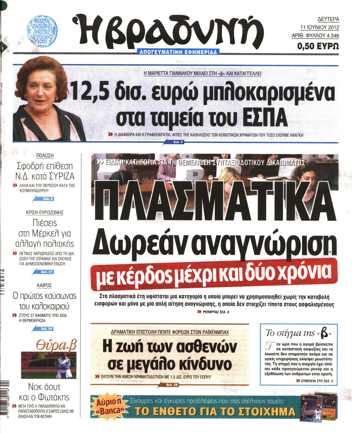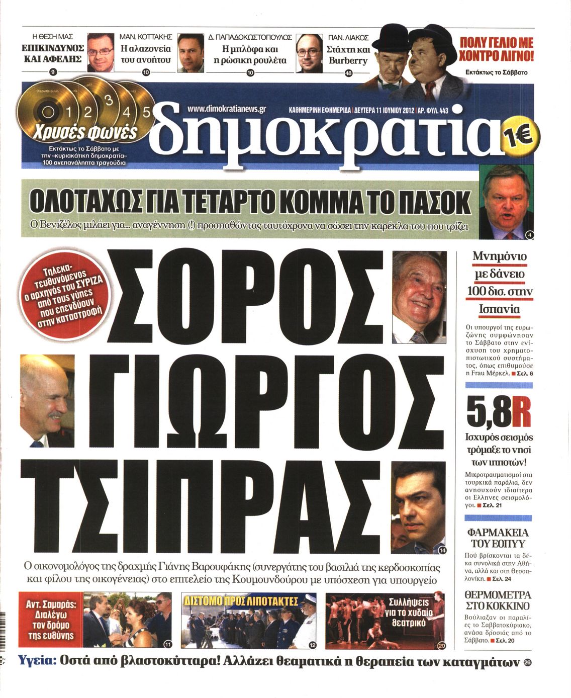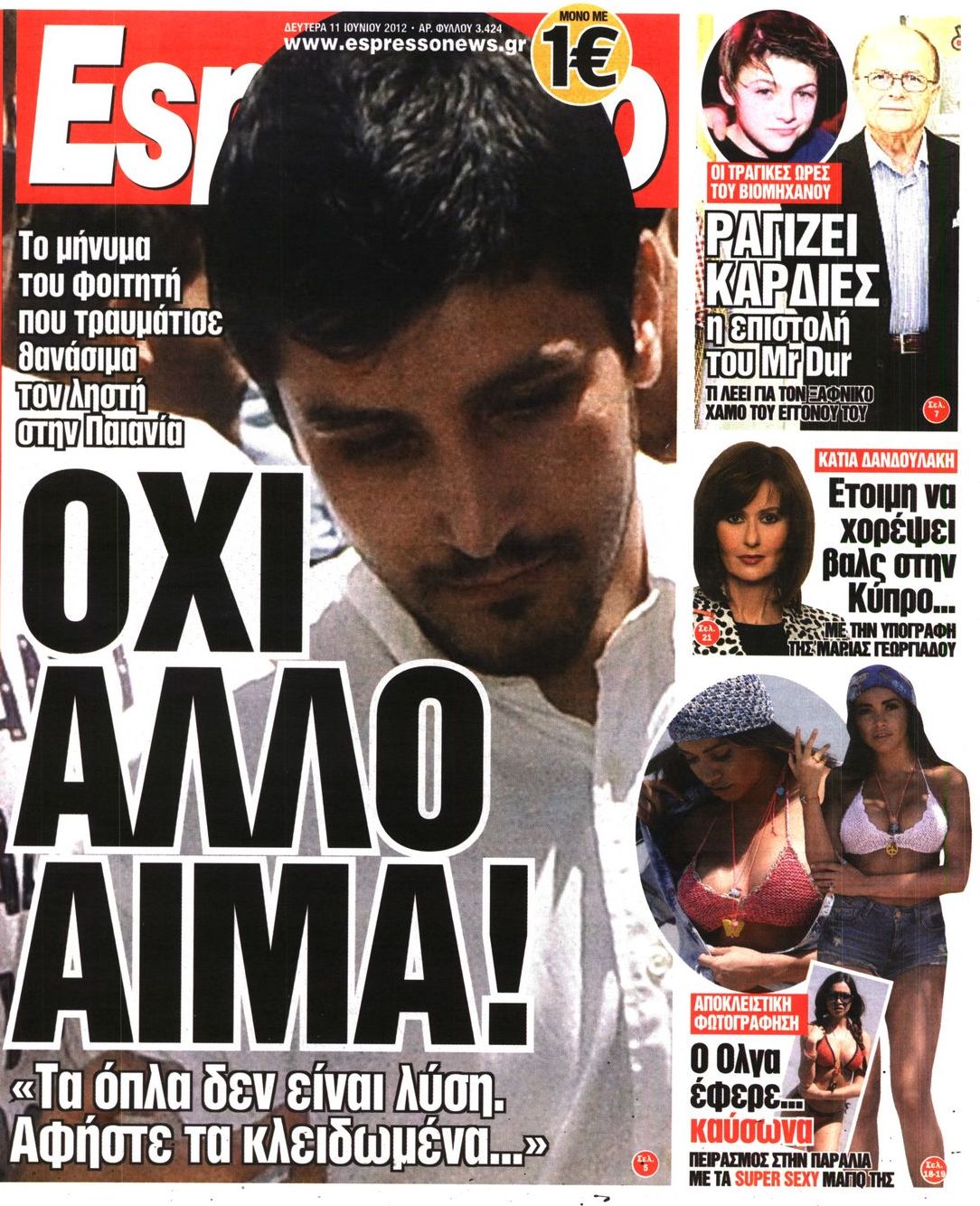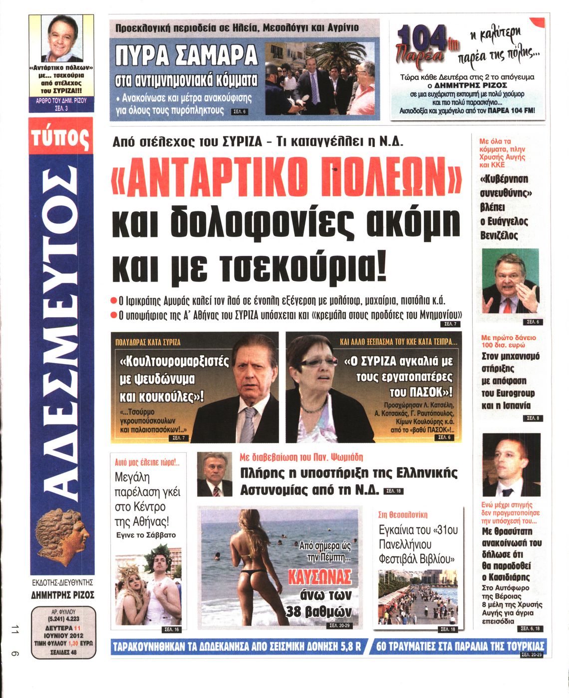 Τα πρωτοσέλιδα των εφημερίδων Enikos Newsroom 07:17, Δευτέρα 11 Ιουνίου 2012 Media ΕΦΗΜΕΡΙΔΕΣ ΠΡΩΤΟΣΕΛΙΔΑ Μοιράσου το: σχολίασε κι εσύ (0 σχόλια) Ακολουθήστε το enikos.gr στο Google News και μάθετε πρώτοι όλες τις ειδήσεις Δείτε όλες τις τελευταίες ειδήσεις από την Ελλάδα και τον Κόσμο στο enikos.gr Ειδήσεις Ροή Ειδήσεων 9 λεπτά πριν Ευρωπαϊκή Ένωση: Συμφωνία για δάνειο 90 δισ. ευρώ στην Ουκρανία τη διετία 2026-2027 5 ώρες πριν ΟΠΕΚΕΠΕ: Προφυλακιστέος ο φερόμενος αρχηγός και ο λογιστής της εγκληματικής οργάνωσης 6 ώρες πριν Αυξάνουν την πίεση προς την κυβέρνηση οι αγρότες: Κλείνουν παρακαμπτήριους και ανοίγουν διόδια – Τι θα γίνει τις γιορτές 6 ώρες πριν Φοινικούντα: Το Σάββατο απολογείται ο 30χρονος γιος γνωστού επιχειρηματία της Πλάκας που παραδόθηκε – Όσα είπε στους αστυνομικούς και ο ρόλος του στο έγκλημα 4 ώρες πριν ΑΕΚ – Κραϊόβα 3-2: Επική ανατροπή και πρόκριση στους «16» του Conference League η Ένωση 5 ώρες πριν Αρχαιολόγοι ανακάλυψαν ρωμαϊκά τεχνουργήματα από μια πόλη που δεν υπήρξε ποτέ – Τα τρία εντυπωσιακά κτίρια και ο αμφορέας με τις… σαρδέλες 6 ώρες πριν Ύπνος: Η απλή βραδινή ρουτίνα για να προστατεύσετε τα μαλλιά σας από το κρύο κατά τη διάρκεια του χειμώνα 7 ώρες πριν Manifesting: Πώς να συναντήσετε τον σύντροφο της ζωής σας, ανάλογα με τον μήνα γέννησής σας 2 ημέρες πριν 20 χρόνια τα Χριστούγεννα ξεκινούν στα Public με μεγάλη ποικιλία σε δώρα! 1 λεπτό πριν Βουλγαρία: Χιλιάδες πολίτες στους δρόμους κατά της απερχόμενης κυβέρνησης και της διαφθοράς 9 λεπτά πριν Ευρωπαϊκή Ένωση: Συμφωνία για δάνειο 90 δισ. ευρώ στην Ουκρανία τη διετία 2026-2027 32 λεπτά πριν Αιματηρή βομβιστική επίθεση στην Υεμένη: Τουλάχιστον τρεις νεκροί και 13 τραυματίες 35 λεπτά πριν Στη Φλόριντα σήμερα οι διαβουλεύσεις σχετικά με τα επόμενα στάδια για τη Λωρίδα της Γάζας 39 λεπτά πριν Σίσσυ Τουμάση: «Είμαι ασθενοφοβική πάρα πολύ και με πιάνει μια παράνοια μ’ αυτό» ENIKOS NETWORK Σε περίοδο αυξημένης δραστηριότητας η γρίπη στην Ελλάδα-Μέτρα προστασίας από τον ΕΟΔΥ Σκέφτεστε συνέχεια συζητήσεις που έχετε κάνει; Τι σημαίνει αυτό, σύμφωνα με ειδικό Στεγαστικό: Τι λέει η ΠΟΜΙΔΑ για τα νέα μέτρα που ανακοίνωσε ο Κυριάκος Μητσοτάκης Λαγκάρντ: Αισιόδοξη για την ανάπτυξη της Ευρωζώνης, αβέβαιη για τον πληθωρισμό Χαρτογραφώντας το «σημείο χωρίς επιστροφή»: Για πρώτη φορά αποκαλύπτεται με λεπτομέρεια το ακανθώδες όριο της ατμόσφαιρας τ... Η Google καταργεί τη λειτουργία «dark web report» – Πώς θα μπορούν οι χρήστες να διαγράφουν τα δεδομένα τους περισσότερα 02:50 , Παρασκευή 19 Δεκεμβρίου 2025 GNTM: «Κλείδωσαν» οι τέσσερις φιναλίστ – Μεγάλη ανατροπή στις τελευταίες αποχωρήσεις Για προτελευταία φορά εμφανίστηκαν στο πλατό του GNTM οι φιναλίστ του φετινού κύκλου, το βράδυ... 17:45 , Πέμπτη 18 Δεκεμβρίου 2025 ROUK ZOUK: Εορταστικό επεισόδιο με καλεσμένους τους πρωταγωνιστές του «Γιατί ρε πατέρα» Το Σάββατο 20 Δεκεμβρίου στις 21:00, η Ζέτα Μακρυπούλια υποδέχεται εκλεκτούς ηθοποιούς που όλο... 17:20 , Πέμπτη 18 Δεκεμβρίου 2025 Άγιος έρωτας: Η Χριστίνα εξομολογείται στον πατέρα Νικόλαο, απόψε στις 21:00 στον Alpha Η Νότα αποφασίζει να εκδικηθεί τον Πέτρο και τον Στέφανο, για χάρη του Λούη, όμως τα πράγματα ... 16:50 , Πέμπτη 18 Δεκεμβρίου 2025 Να μ’ αγαπάς: Ζωή και Φωτεινή συμφιλιώνονται ως μάνα με κόρη, απόψε στις 20:00 Η ταυτότητα του Άγγελου αποκαλύπτεται στο νέο επεισόδιο της σειράς “Να μ’ αγαπάς... ΤΕΛΕΥΤΑΙΕΣ ΕΙΔΗΣΕΙΣ 9 λεπτά πριν Ευρωπαϊκή Ένωση: Συμφωνία για δάνειο 90 δισ. ευρώ στην... 32 