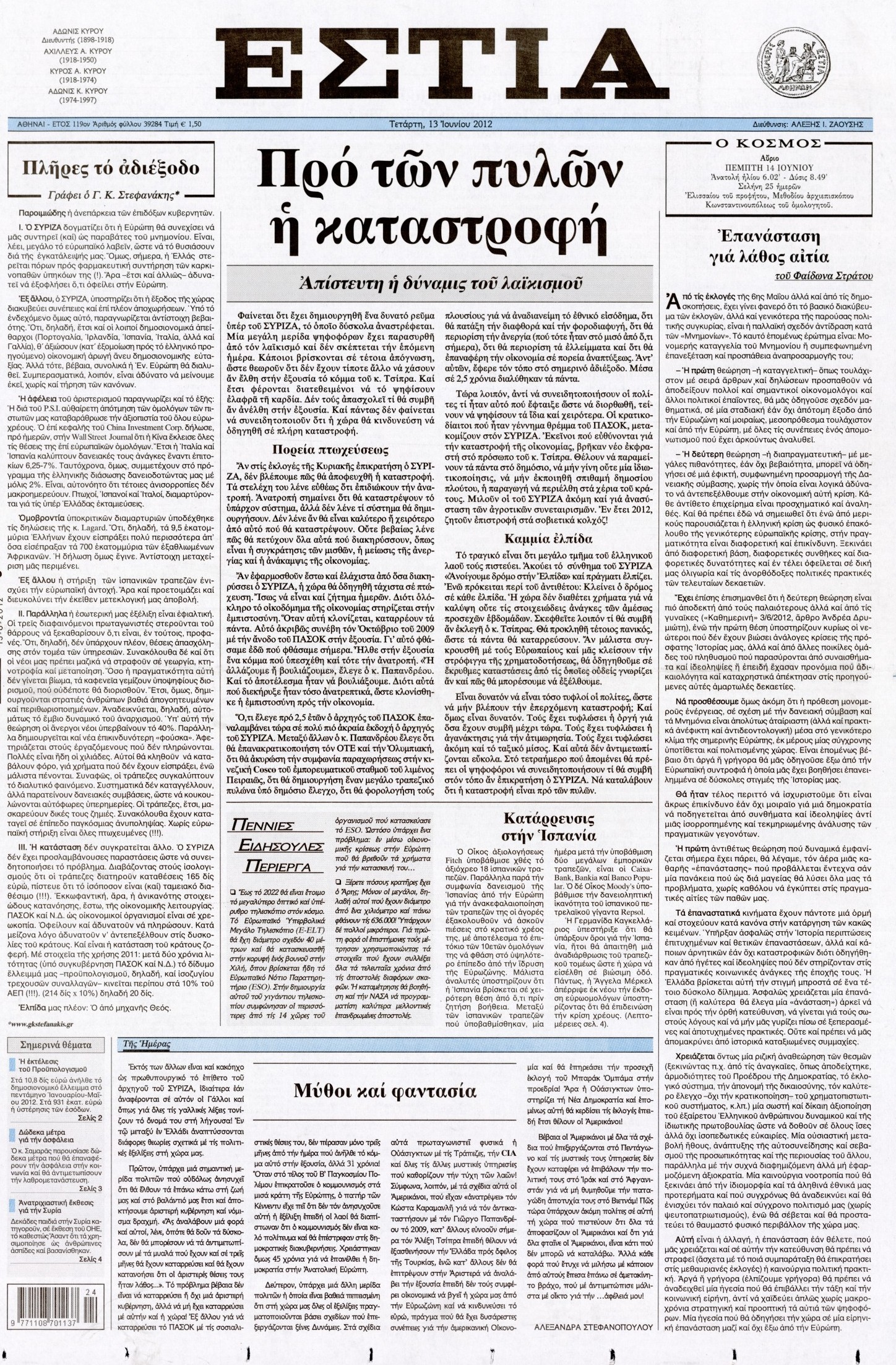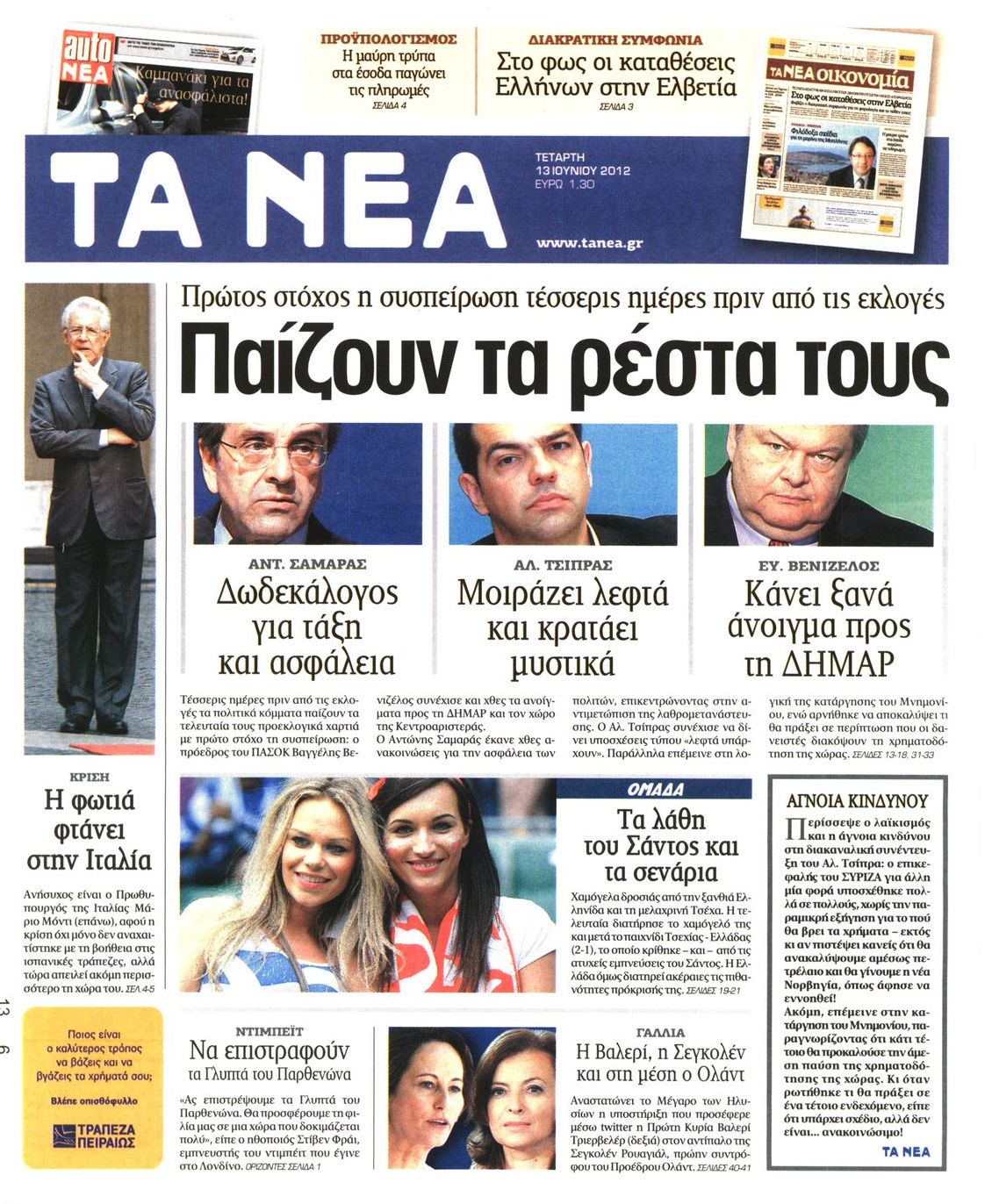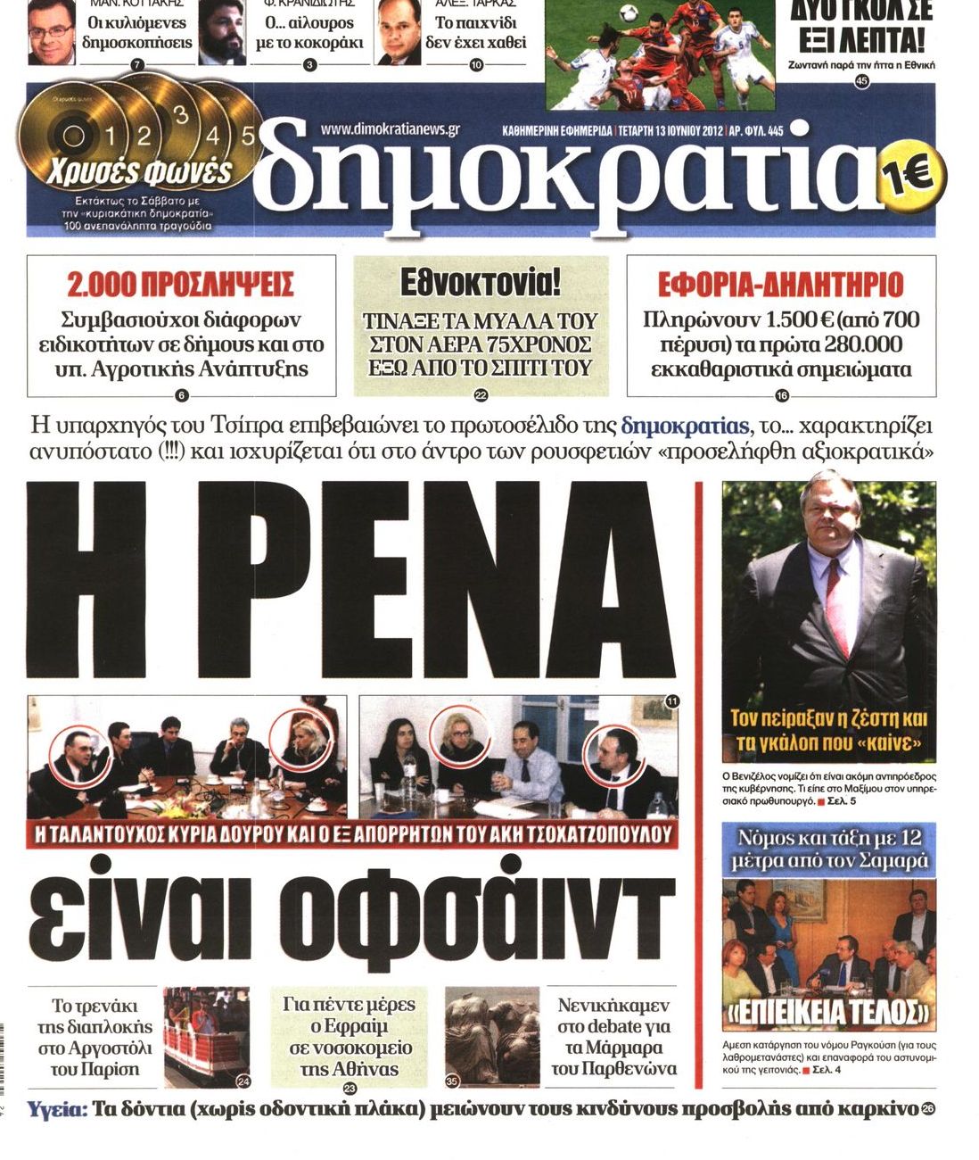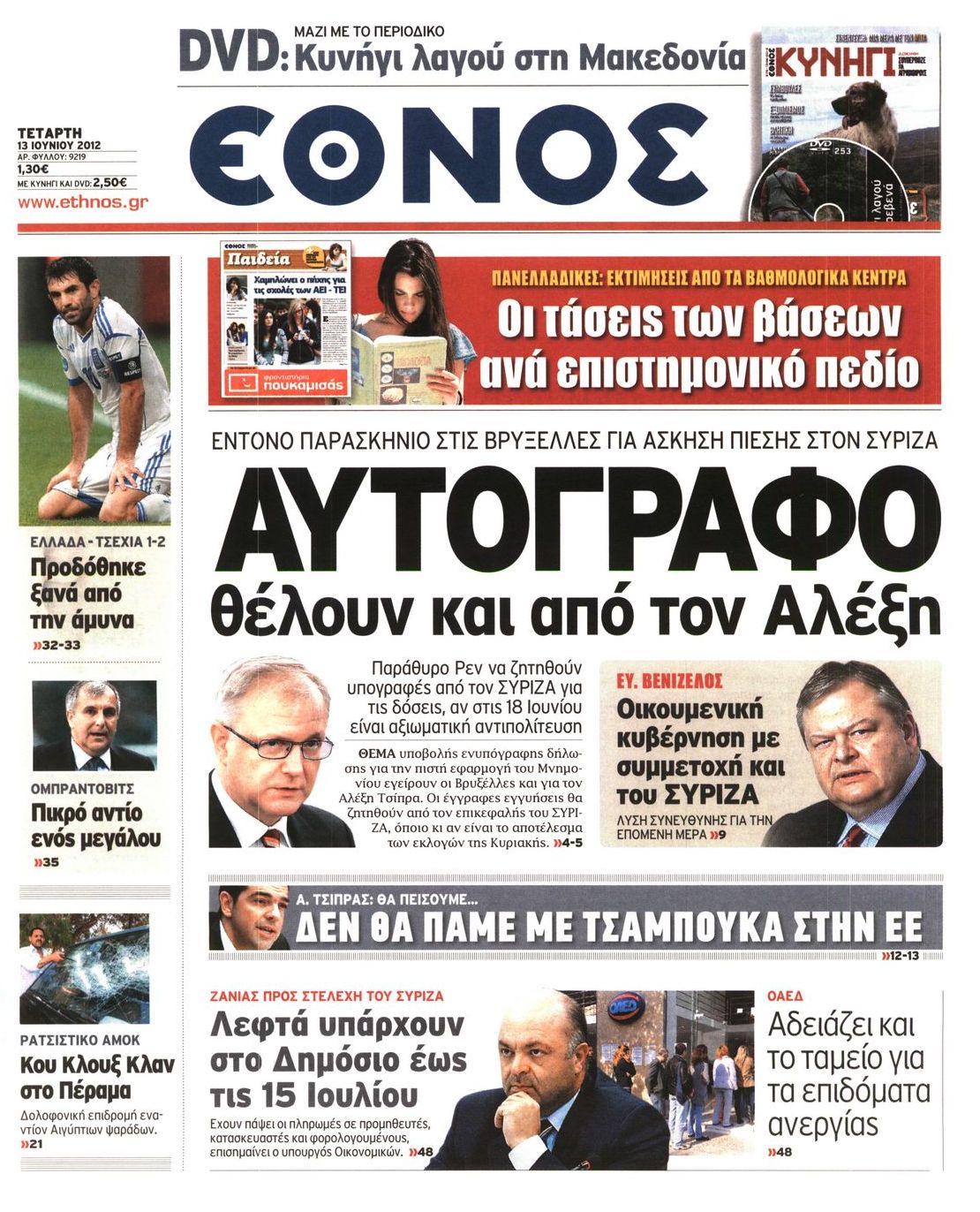 Τα πρωτοσέλιδα των εφημερίδων Enikos Newsroom 07:34, Τετάρτη 13 Ιουνίου 2012 Media ΕΦΗΜΕΡΙΔΕΣ ΠΡΩΤΟΣΕΛΙΔΑ Μοιράσου το: σχολίασε κι εσύ (0 σχόλια) Ακολουθήστε το enikos.gr στο Google News και μάθετε πρώτοι όλες τις ειδήσεις Δείτε όλες τις τελευταίες ειδήσεις από την Ελλάδα και τον Κόσμο στο enikos.gr Ειδήσεις Ροή Ειδήσεων 2 ώρες πριν Χριστούγεννα στα μπλόκα: Επιμένουν στις κινητοποιήσεις τους οι αγρότες – Ανοίγουν τα διόδια το Σαββατοκύριακο 2 ώρες πριν Ουκρανία: Η άνευ προηγουμένου επίθεση σε ρωσικό τάνκερ στη Μεσόγειο και το μήνυμα προς στον Πούτιν – Το «μακρύ χέρι» του Κιέβου 2 ώρες πριν Πούτιν: Τα μηνύματα σε Ευρώπη και ΝΑΤΟ από το μαραθώνιο «σόου» του – Η απαίτηση για «σεβασμό» και η ειρήνη «με τους όρους» της Μόσχας 3 ώρες πριν Τραμπ: Δεν αποκλείει την πιθανότητα ενός πολέμου στη Βενεζουέλα – «Ο Μαδούρο ξέρει καλύτερα από τον καθένα τι ακριβώς θέλω» 3 ώρες πριν Συνεχίζει να προκαλεί ο Μίτσκοσκι: «Για μένα το όνομα Μακεδονία είναι ιερό» 2 ώρες πριν Ανακαλύφθηκαν αρχαία χρυσά νομίσματα 2.200 ετών που απεικονίζουν τον θεό Απόλλωνα – Η άγνωστη σύνδεση με τον Φίλιππο Β΄ της Μακεδονίας 3 ώρες πριν Ύπνος: Μια κρυφή κατάσταση του εγκεφάλου πριν από τον ύπνο μπορεί να είναι το “κλειδί” για υψηλή ευφυΐα και δημιουργικότητα 4 ώρες πριν Αριθμολογία: Οι άνθρωποι που έχουν γεννηθεί αυτές τις 4 ημερομηνίες, συχνά παρεξηγούνται – «Η καλοσύνη τους κρύβει τεράστια δύναμη» 5 ώρες πριν Ξεχάστε το καθάρισμα το Σαββατοκύριακο: Ο «κανόνας των 20 λεπτών» που θα σας λύσει τα χέρια 16 λεπτά πριν Φαίη Σκορδά: «Παλιότερα τα κομπλιμέντα τα προσπερνούσα, τώρα τα έχω ανάγκη» 32 λεπτά πριν Βασίλης Σπανούλης: Δεν εμφανίστηκε ούτε ένας δημοσιογράφος στην συνέντευξη Τύπου – «Καλησπέρα στον… κανέναν», δείτε βίντεο 43 λεπτά πριν Πόλεμος στην Ουκρανία: Εφτά νεκροί από ρωσική πυραυλική επίθεση στο λιμάνι της Οδησσού 47 λεπτά πριν ΗΠΑ: Η κυβέρνηση του Ντόναλντ Τραμπ άρχισε να δημοσιοποιεί τα αρχεία Έπσταϊν 58 λεπτά πριν Σάμος: Άνοιξε το μπλόκο των αγροτών στον κόμβο Κοκκαρίου – Σε νέα συνεδρίαση θα καθορίσουν την στάση τους ENIKOS NETWORK Το ΕΚΑΒ τιμήθηκε από την Ακαδημία Αθηνών για τα 40 χρόνια προσφοράς του Έχετε πραγματικά μεγάλη καρδιά; 10 χαρακτηριστικά όσων έχουν καλοσύνη Αναστολή μέτρων αναγκαστικής εκτέλεσης για κτηνοτρόφους που πλήττονται από την ευλογιά των αιγοπροβάτων Πλήρης επάρκεια προϊόντων στις λαϊκές της Αττικής, παρά τις αγροτικές κινητοποιήσεις – Τι απαντούν οι πωλητές Χαρτογραφώντας το «σημείο χωρίς επιστροφή»: Για πρώτη φορά αποκαλύπτεται με λεπτομέρεια το ακανθώδες όριο της ατμόσφαιρας τ... Η Google καταργεί τη λειτουργία «dark web report» – Πώς θα μπορούν οι χρήστες να διαγράφουν τα δεδομένα τους περισσότερα 22:42 , Παρασκευή 19 Δεκεμβρίου 2025 Γιώργος Γιαννόπουλος για “Το σόι σου”: “Είναι ευτυχία και ευλογία αυτή η σειρά” «Είναι ευτυχία και ευλογία η συγκυρία αυτής της σειράς», θα πει ο Γιώργος Γιαννόπουλος -ο αγαπ... 20:37 , Παρασκευή 19 Δεκεμβρίου 2025 Don’t Forget The Lyrics: Η Έλλη Κοκκίνου υποδέχεται 4 παίκτες που θα κάνουν τα πάντα για να μη χάσουν ούτε… μισή λέξη από τους στίχους Το «Don’t Forget The Lyrics» επιστρέφει απόψε, Παρασκευή 19 Δεκεμβρίου, στις 21:00 με νέο επει... 19:31 , Παρασκευή 19 Δεκεμβρίου 2025 GNTM: Απόψε ο μεγάλος τελικός για τους 4 φιναλίστ Έπειτα από μήνες γεμάτους μόδα, δημιουργία και έντονες αναμετρήσεις, το GNTM 2025 κορυφώνεται,... 18:11 , Παρασκευή 19 Δεκεμβρίου 2025 Το σόι σου: Ο Άρης έρχεται στην Ελλάδα για τις γι
