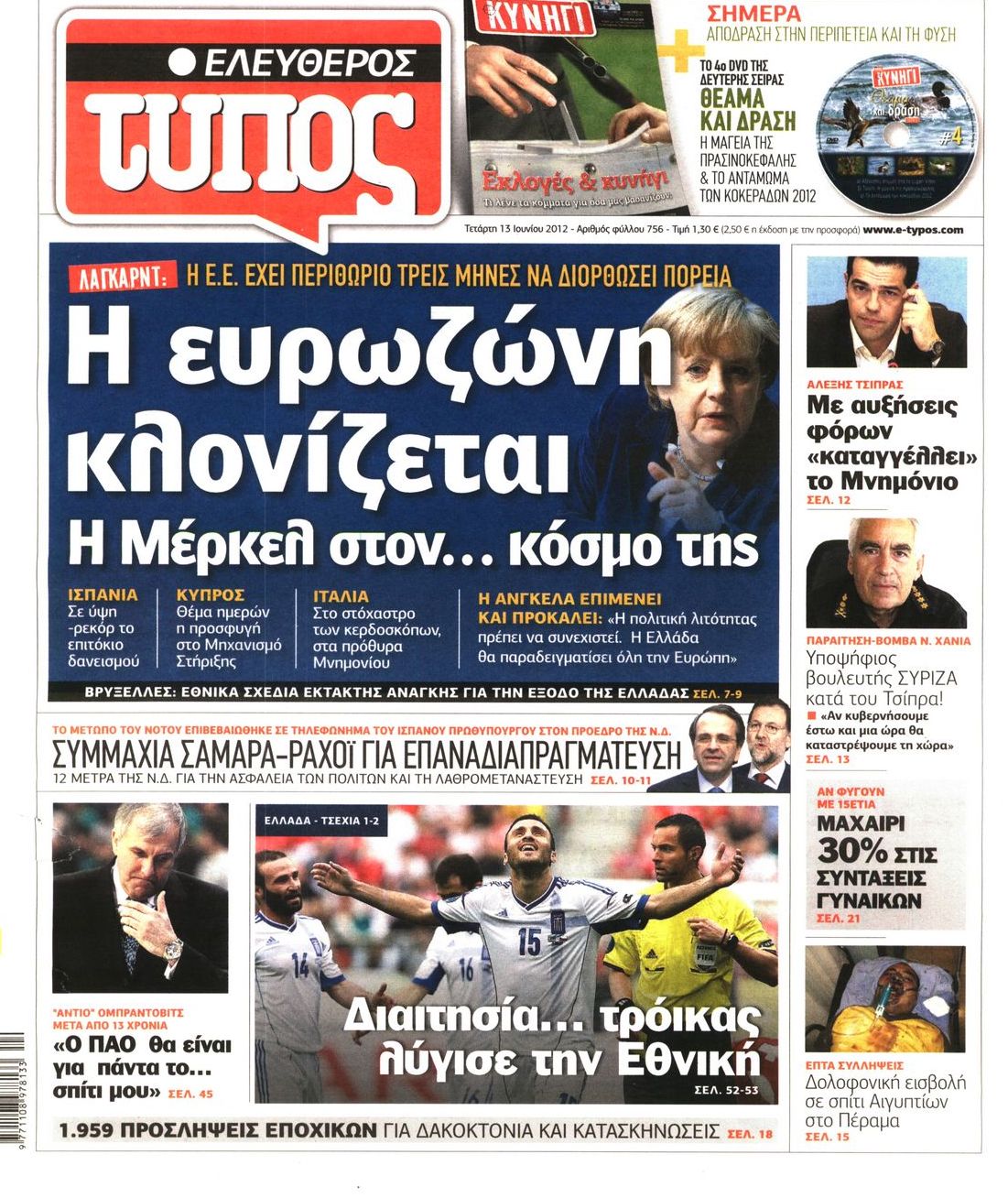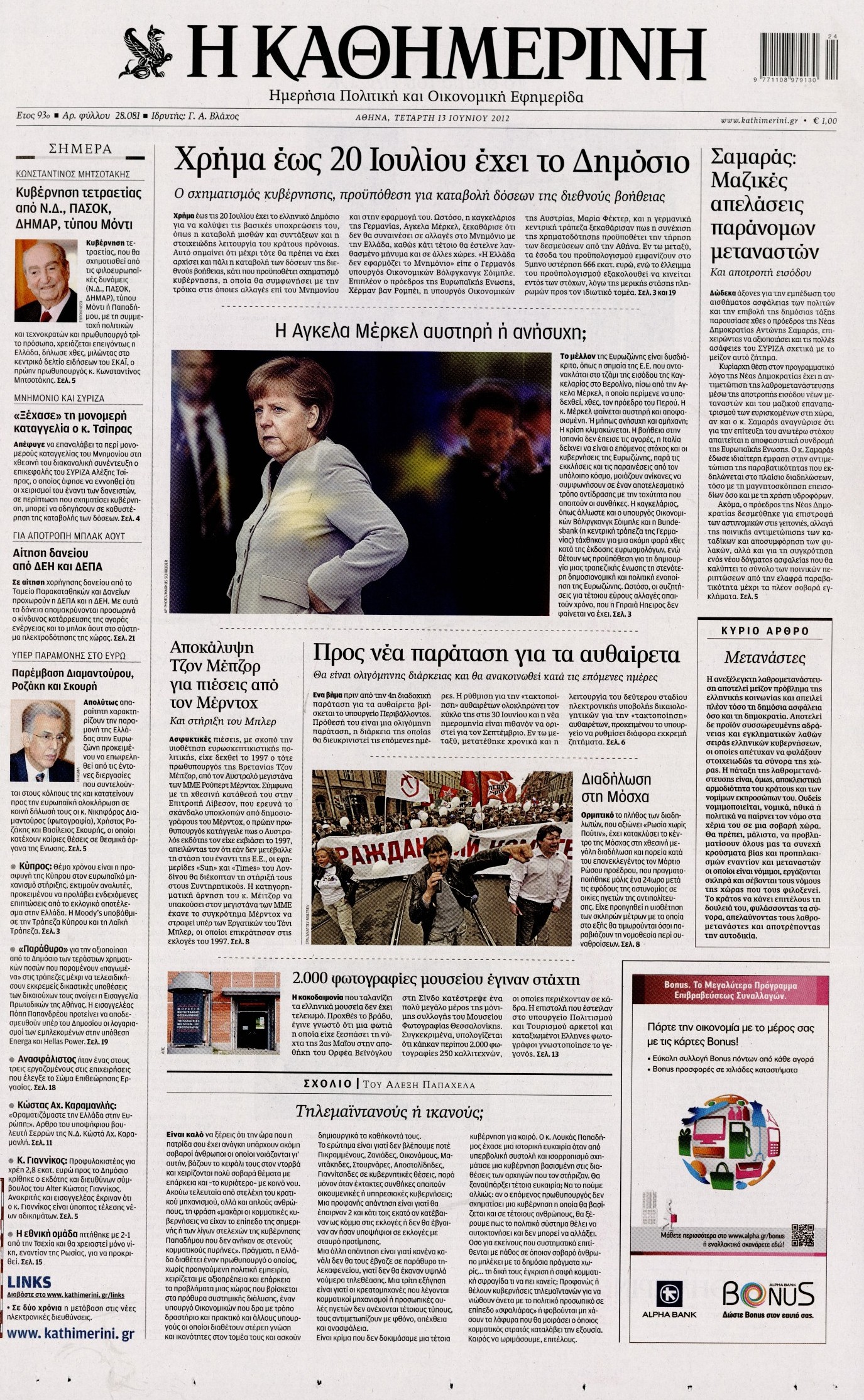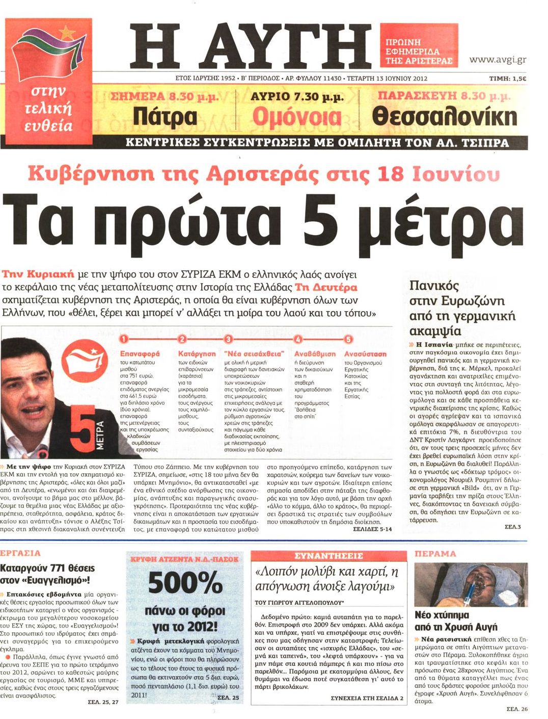 Τα πρωτοσέλιδα των εφημερίδων Enikos Newsroom 07:34, Τετάρτη 13 Ιουνίου 2012 Media ΕΦΗΜΕΡΙΔΕΣ ΠΡΩΤΟΣΕΛΙΔΑ Μοιράσου το: σχολίασε κι εσύ (0 σχόλια) Ακολουθήστε το enikos.gr στο Google News και μάθετε πρώτοι όλες τις ειδήσεις Δείτε όλες τις τελευταίες ειδήσεις από την Ελλάδα και τον Κόσμο στο enikos.gr Ειδήσεις Ροή Ειδήσεων 2 ώρες πριν Χριστούγεννα στα μπλόκα: Επιμένουν στις κινητοποιήσεις τους οι αγρότες – Ανοίγουν τα διόδια το Σαββατοκύριακο 2 ώρες πριν Ουκρανία: Η άνευ προηγουμένου επίθεση σε ρωσικό τάνκερ στη Μεσόγειο και το μήνυμα προς στον Πούτιν – Το «μακρύ χέρι» του Κιέβου 2 ώρες πριν Πούτιν: Τα μηνύματα σε Ευρώπη και ΝΑΤΟ από το μαραθώνιο «σόου» του – Η απαίτηση για «σεβασμό» και η ειρήνη «με τους όρους» της Μόσχας 3 ώρες πριν Τραμπ: Δεν αποκλείει την πιθανότητα ενός πολέμου στη Βενεζουέλα – «Ο Μαδούρο ξέρει καλύτερα από τον καθένα τι ακριβώς θέλω» 3 ώρες πριν Συνεχίζει να προκαλεί ο Μίτσκοσκι: «Για μένα το όνομα Μακεδονία είναι ιερό» 2 ώρες πριν Ανακαλύφθηκαν αρχαία χρυσά νομίσματα 2.200 ετών που απεικονίζουν τον θεό Απόλλωνα – Η άγνωστη σύνδεση με τον Φίλιππο Β΄ της Μακεδονίας 3 ώρες πριν Ύπνος: Μια κρυφή κατάσταση του εγκεφάλου πριν από τον ύπνο μπορεί να είναι το “κλειδί” για υψηλή ευφυΐα και δημιουργικότητα 4 ώρες πριν Αριθμολογία: Οι άνθρωποι που έχουν γεννηθεί αυτές τις 4 ημερομηνίες, συχνά παρεξηγούνται – «Η καλοσύνη τους κρύβει τεράστια δύναμη» 5 ώρες πριν Ξεχάστε το καθάρισμα το Σαββατοκύριακο: Ο «κανόνας των 20 λεπτών» που θα σας λύσει τα χέρια 16 λεπτά πριν Φαίη Σκορδά: «Παλιότερα τα κομπλιμέντα τα προσπερνούσα, τώρα τα έχω ανάγκη» 32 λεπτά πριν Βασίλης Σπανούλης: Δεν εμφανίστηκε ούτε ένας δημοσιογράφος στην συνέντευξη Τύπου – «Καλησπέρα στον… κανέναν», δείτε βίντεο 43 λεπτά πριν Πόλεμος στην Ουκρανία: Εφτά νεκροί από ρωσική πυραυλική επίθεση στο λιμάνι της Οδησσού 47 λεπτά πριν ΗΠΑ: Η κυβέρνηση του Ντόναλντ Τραμπ άρχισε να δημοσιοποιεί τα αρχεία Έπσταϊν 58 λεπτά πριν Σάμος: Άνοιξε το μπλόκο των αγροτών στον κόμβο Κοκκαρίου – Σε νέα συνεδρίαση θα καθορίσουν την στάση τους ENIKOS NETWORK Το ΕΚΑΒ τιμήθηκε από την Ακαδημία Αθηνών για τα 40 χρόνια προσφοράς του Έχετε πραγματικά μεγάλη καρδιά; 10 χαρακτηριστικά όσων έχουν καλοσύνη Αναστολή μέτρων αναγκαστικής εκτέλεσης για κτηνοτρόφους που πλήττονται από την ευλογιά των αιγοπροβάτων Πλήρης επάρκεια προϊόντων στις λαϊκές της Αττικής, παρά τις αγροτικές κινητοποιήσεις – Τι απαντούν οι πωλητές Χαρτογραφώντας το «σημείο χωρίς επιστροφή»: Για πρώτη φορά αποκαλύπτεται με λεπτομέρεια το ακανθώδες όριο της ατμόσφαιρας τ... Η Google καταργεί τη λειτουργία «dark web report» – Πώς θα μπορούν οι χρήστες να διαγράφουν τα δεδομένα τους περισσότερα 22:42 , Παρασκευή 19 Δεκεμβρίου 2025 Γιώργος Γιαννόπουλος για “Το σόι σου”: “Είναι ευτυχία και ευλογία αυτή η σειρά” «Είναι ευτυχία και ευλογία η συγκυρία αυτής της σειράς», θα πει ο Γιώργος Γιαννόπουλος -ο αγαπ... 20:37 , Παρασκευή 19 Δεκεμβρίου 2025 Don’t Forget The Lyrics: Η Έλλη Κοκκίνου υποδέχεται 4 παίκτες που θα κάνουν τα πάντα για να μη χάσουν ούτε… μισή λέξη από τους στίχους Το «Don’t Forget The Lyrics» επιστρέφει απόψε, Παρασκευή 19 Δεκεμβρίου, στις 21:00 με νέο επει... 19:31 , Παρασκευή 19 Δεκεμβρίου 2025 GNTM: Απόψε ο μεγάλος τελικός για τους 4 φιναλίστ Έπειτα από μήνες γεμάτους μόδα, δημιουργία και έντονες αναμετρήσεις, το GNTM 2025 κορυφώνεται,... 18:11 , Παρασκευή 19 Δεκεμβρίου 2025 Το σόι σου: Ο Άρης έρχεται στην Ελλάδα για τις γι