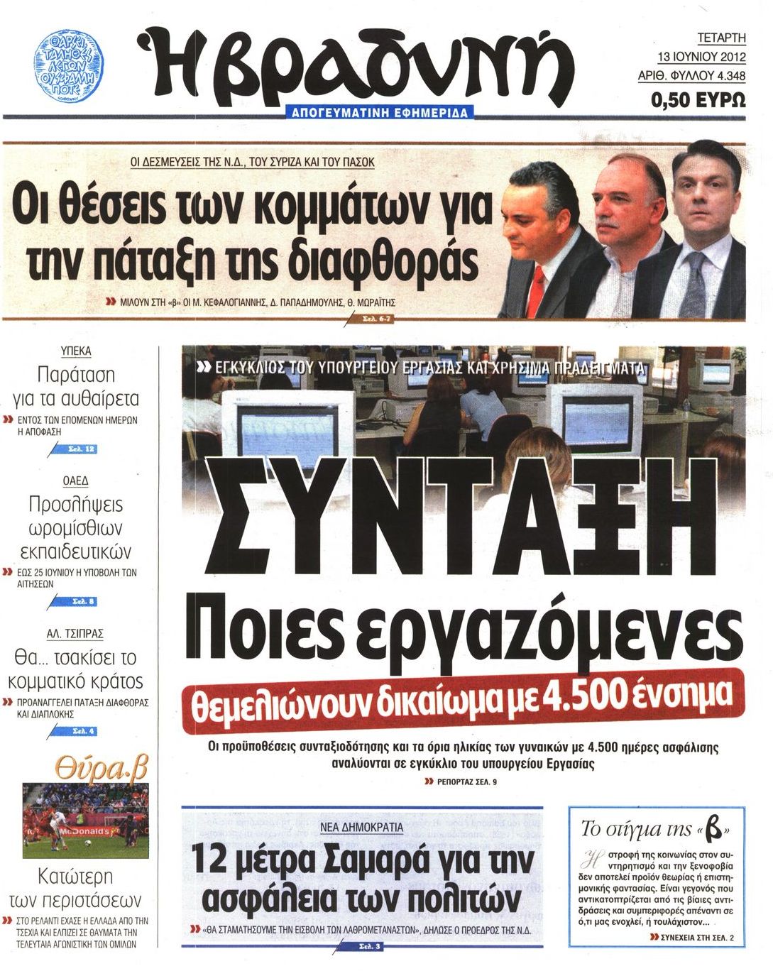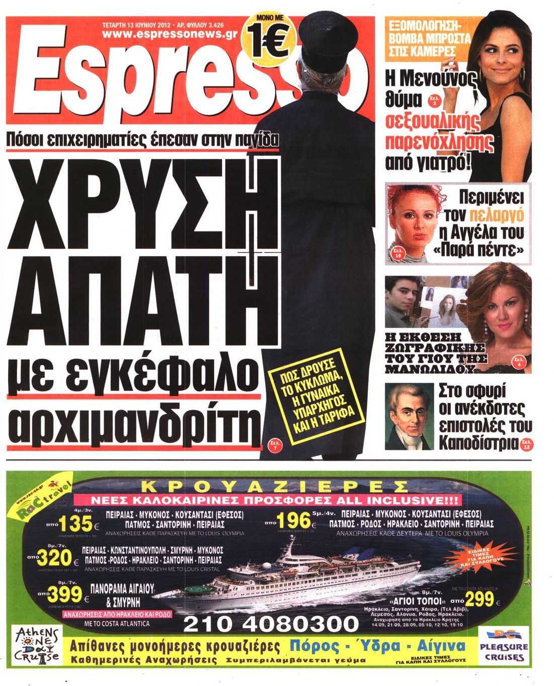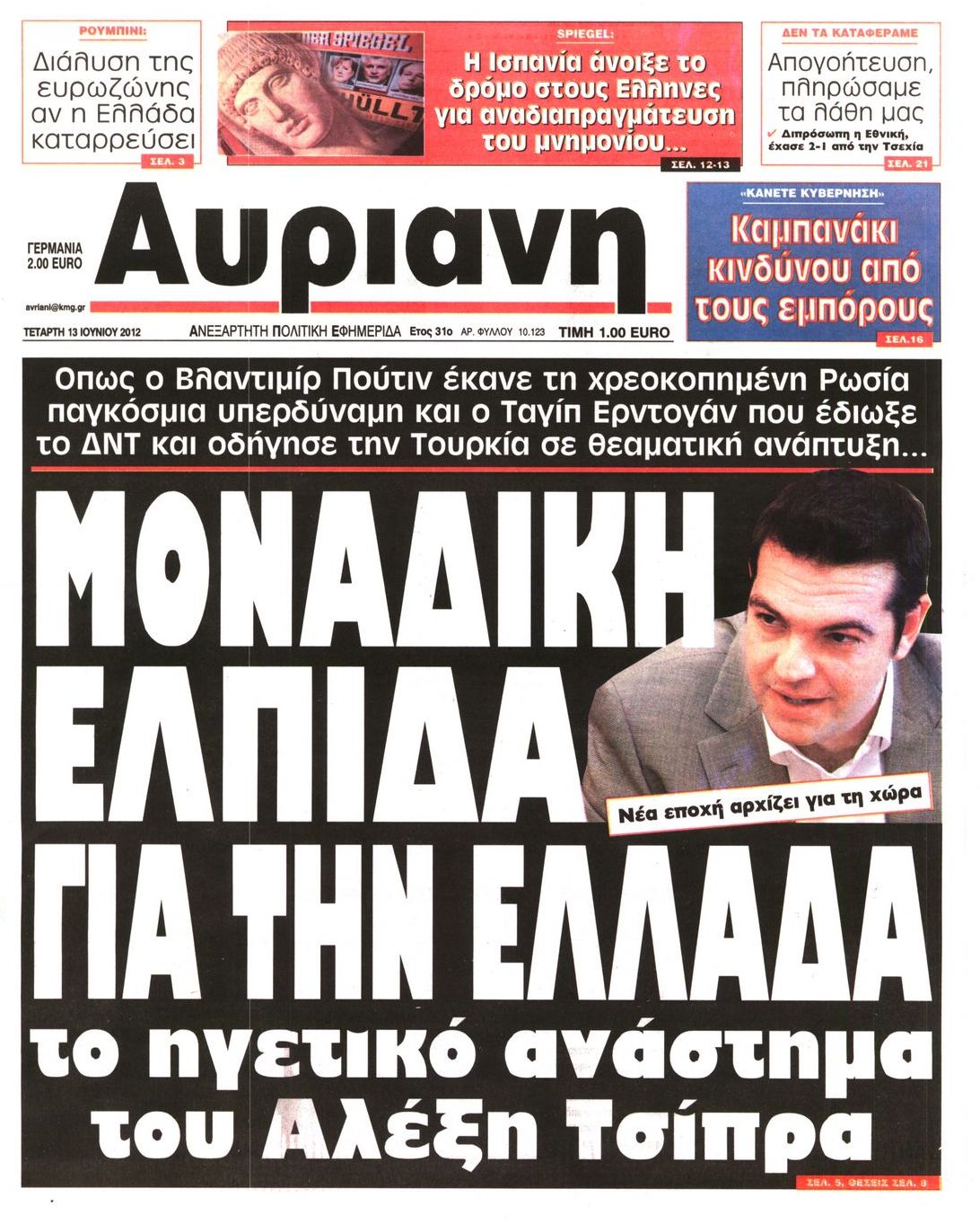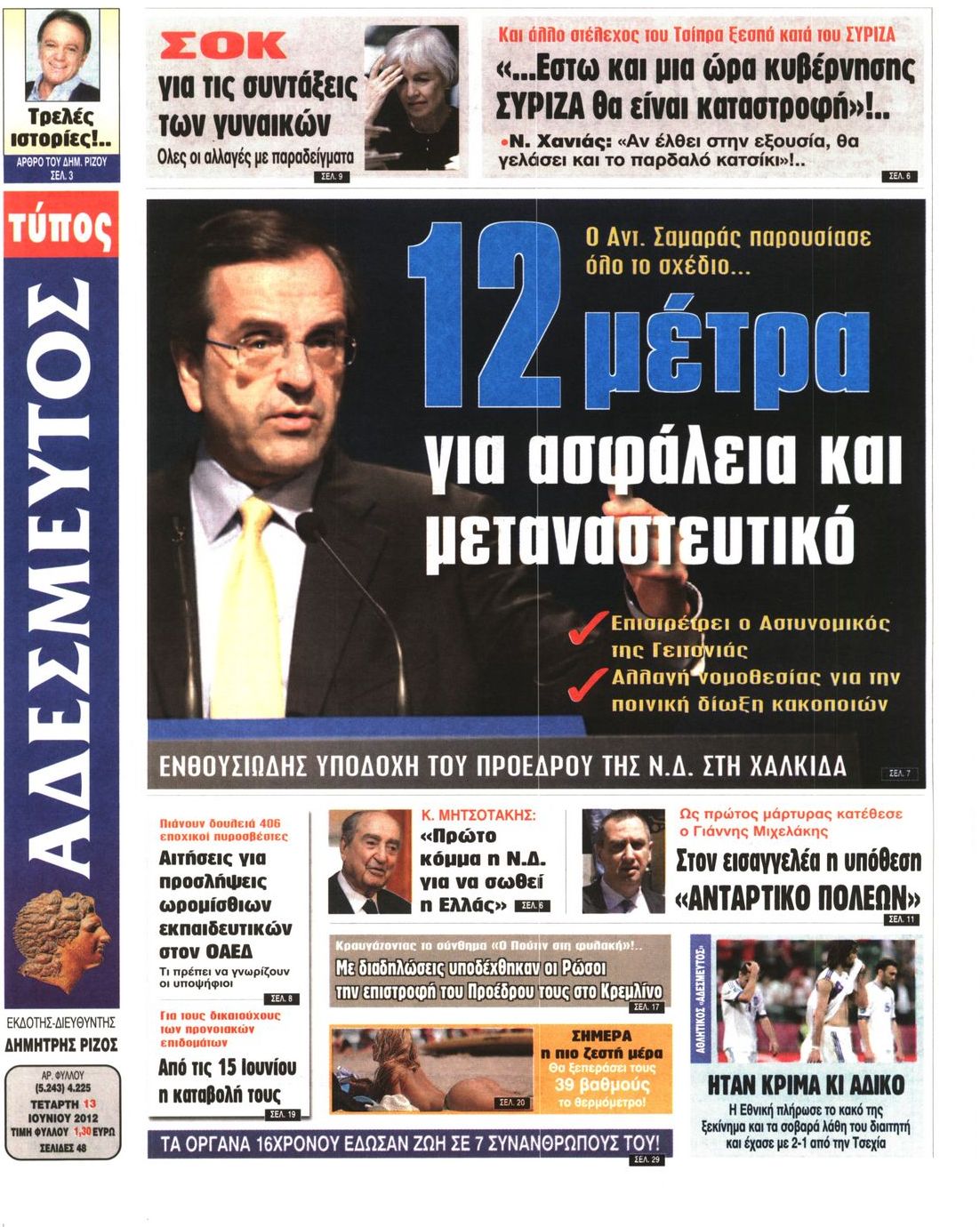 Τα πρωτοσέλιδα των εφημερίδων Enikos Newsroom 07:34, Τετάρτη 13 Ιουνίου 2012 Media ΕΦΗΜΕΡΙΔΕΣ ΠΡΩΤΟΣΕΛΙΔΑ Μοιράσου το: σχολίασε κι εσύ (0 σχόλια) Ακολουθήστε το enikos.gr στο Google News και μάθετε πρώτοι όλες τις ειδήσεις Δείτε όλες τις τελευταίες ειδήσεις από την Ελλάδα και τον Κόσμο στο enikos.gr Ειδήσεις Ροή Ειδήσεων 2 ώρες πριν Χριστούγεννα στα μπλόκα: Επιμένουν στις κινητοποιήσεις τους οι αγρότες – Ανοίγουν τα διόδια το Σαββατοκύριακο 2 ώρες πριν Ουκρανία: Η άνευ προηγουμένου επίθεση σε ρωσικό τάνκερ στη Μεσόγειο και το μήνυμα προς στον Πούτιν – Το «μακρύ χέρι» του Κιέβου 2 ώρες πριν Πούτιν: Τα μηνύματα σε Ευρώπη και ΝΑΤΟ από το μαραθώνιο «σόου» του – Η απαίτηση για «σεβασμό» και η ειρήνη «με τους όρους» της Μόσχας 3 ώρες πριν Τραμπ: Δεν αποκλείει την πιθανότητα ενός πολέμου στη Βενεζουέλα – «Ο Μαδούρο ξέρει καλύτερα από τον καθένα τι ακριβώς θέλω» 3 ώρες πριν Συνεχίζει να προκαλεί ο Μίτσκοσκι: «Για μένα το όνομα Μακεδονία είναι ιερό» 2 ώρες πριν Ανακαλύφθηκαν αρχαία χρυσά νομίσματα 2.200 ετών που απεικονίζουν τον θεό Απόλλωνα – Η άγνωστη σύνδεση με τον Φίλιππο Β΄ της Μακεδονίας 3 ώρες πριν Ύπνος: Μια κρυφή κατάσταση του εγκεφάλου πριν από τον ύπνο μπορεί να είναι το “κλειδί” για υψηλή ευφυΐα και δημιουργικότητα 4 ώρες πριν Αριθμολογία: Οι άνθρωποι που έχουν γεννηθεί αυτές τις 4 ημερομηνίες, συχνά παρεξηγούνται – «Η καλοσύνη τους κρύβει τεράστια δύναμη» 5 ώρες πριν Ξεχάστε το καθάρισμα το Σαββατοκύριακο: Ο «κανόνας των 20 λεπτών» που θα σας λύσει τα χέρια 16 λεπτά πριν Φαίη Σκορδά: «Παλιότερα τα κομπλιμέντα τα προσπερνούσα, τώρα τα έχω ανάγκη» 32 λεπτά πριν Βασίλης Σπανούλης: Δεν εμφανίστηκε ούτε ένας δημοσιογράφος στην συνέντευξη Τύπου – «Καλησπέρα στον… κανέναν», δείτε βίντεο 43 λεπτά πριν Πόλεμος στην Ουκρανία: Εφτά νεκροί από ρωσική πυραυλική επίθεση στο λιμάνι της Οδησσού 47 λεπτά πριν ΗΠΑ: Η κυβέρνηση του Ντόναλντ Τραμπ άρχισε να δημοσιοποιεί τα αρχεία Έπσταϊν 58 λεπτά πριν Σάμος: Άνοιξε το μπλόκο των αγροτών στον κόμβο Κοκκαρίου – Σε νέα συνεδρίαση θα καθορίσουν την στάση τους ENIKOS NETWORK Το ΕΚΑΒ τιμήθηκε από την Ακαδημία Αθηνών για τα 40 χρόνια προσφοράς του Έχετε πραγματικά μεγάλη καρδιά; 10 χαρακτηριστικά όσων έχουν καλοσύνη Αναστολή μέτρων αναγκαστικής εκτέλεσης για κτηνοτρόφους που πλήττονται από την ευλογιά των αιγοπροβάτων Πλήρης επάρκεια προϊόντων στις λαϊκές της Αττικής, παρά τις αγροτικές κινητοποιήσεις – Τι απαντούν οι πωλητές Χαρτογραφώντας το «σημείο χωρίς επιστροφή»: Για πρώτη φορά αποκαλύπτεται με λεπτομέρεια το ακανθώδες όριο της ατμόσφαιρας τ... Η Google καταργεί τη λειτουργία «dark web report» – Πώς θα μπορούν οι χρήστες να διαγράφουν τα δεδομένα τους περισσότερα 22:42 , Παρασκευή 19 Δεκεμβρίου 2025 Γιώργος Γιαννόπουλος για “Το σόι σου”: “Είναι ευτυχία και ευλογία αυτή η σειρά” «Είναι ευτυχία και ευλογία η συγκυρία αυτής της σειράς», θα πει ο Γιώργος Γιαννόπουλος -ο αγαπ... 20:37 , Παρασκευή 19 Δεκεμβρίου 2025 Don’t Forget The Lyrics: Η Έλλη Κοκκίνου υποδέχεται 4 παίκτες που θα κάνουν τα πάντα για να μη χάσουν ούτε… μισή λέξη από τους στίχους Το «Don’t Forget The Lyrics» επιστρέφει απόψε, Παρασκευή 19 Δεκεμβρίου, στις 21:00 με νέο επει... 19:31 , Παρασκευή 19 Δεκεμβρίου 2025 GNTM: Απόψε ο μεγάλος τελικός για τους 4 φιναλίστ Έπειτα από μήνες γεμάτους μόδα, δημιουργία και έντονες αναμετρήσεις, το GNTM 2025 κορυφώνεται,... 18:11 , Παρασκευή 19 Δεκεμβρίου 2025 Το σόι σου: Ο Άρης έρχεται στην Ελλάδα για τις γι