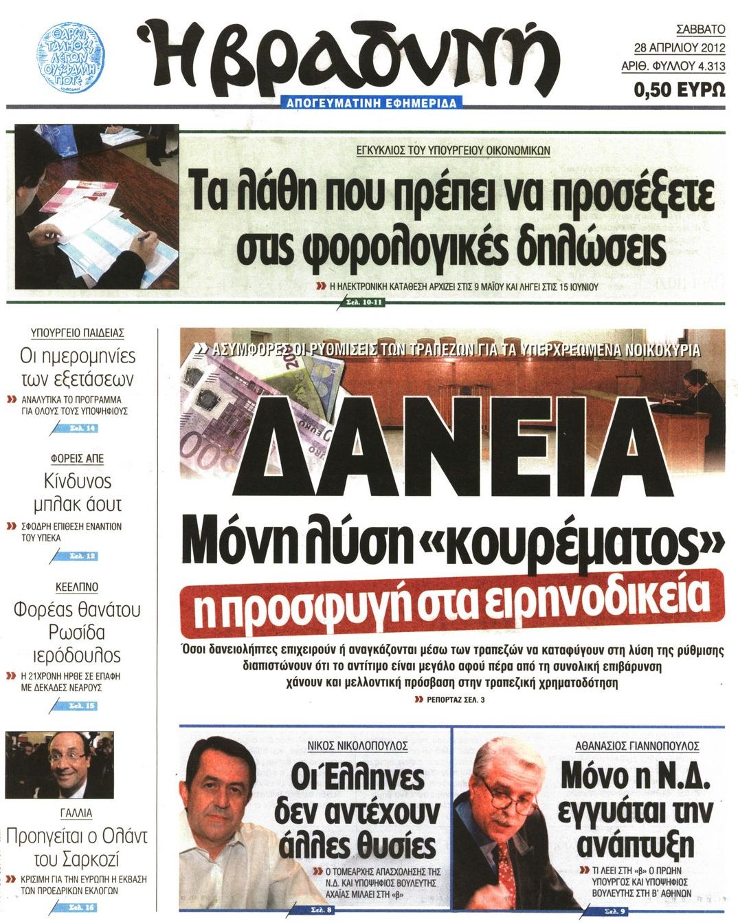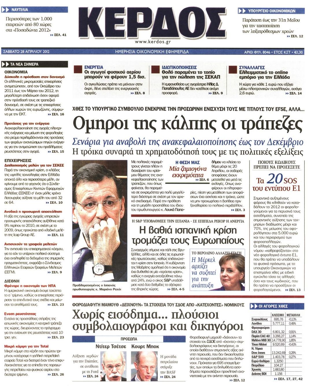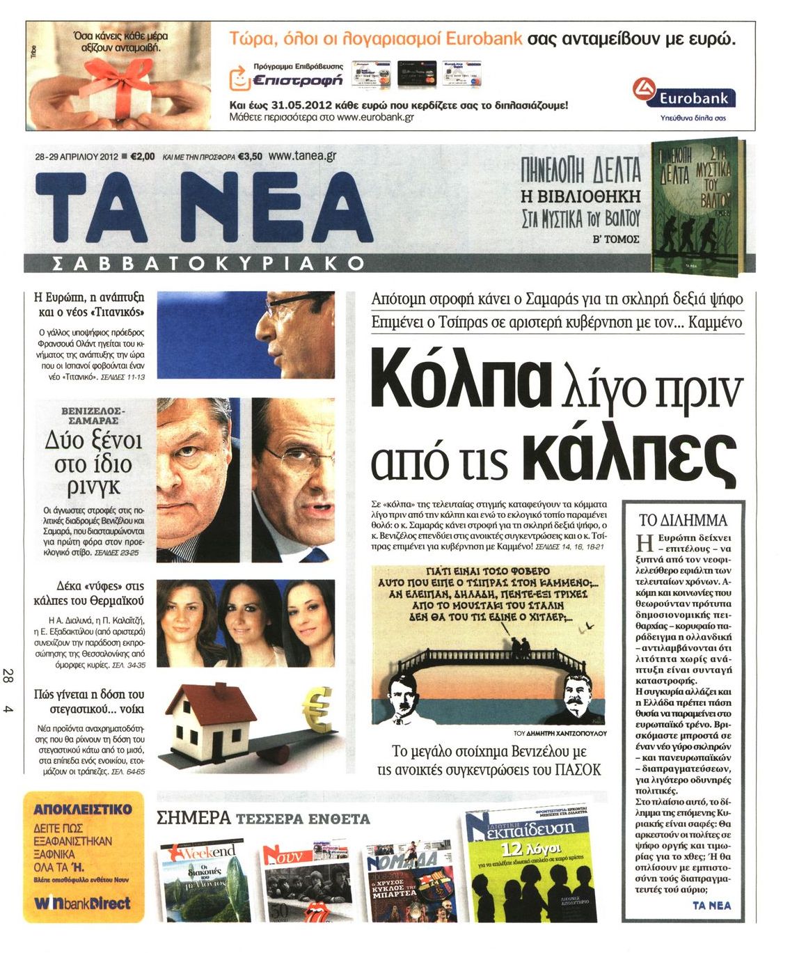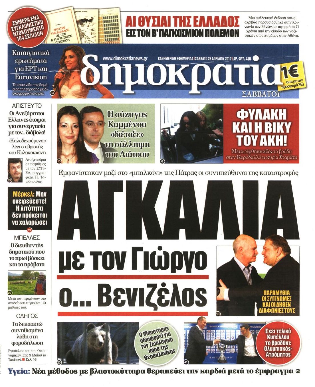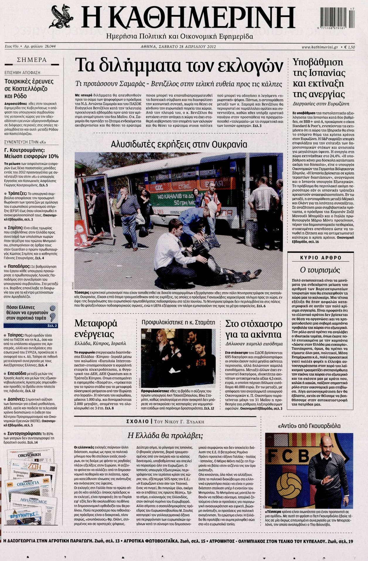 Τα πρωτοσέλιδα των εφημερίδων Enikos Newsroom 07:55, Σάββατο 28 Απριλίου 2012 Media Μοιράσου το: σχολίασε κι εσύ (0 σχόλια) Ακολουθήστε το enikos.gr στο Google News και μάθετε πρώτοι όλες τις ειδήσεις Δείτε όλες τις τελευταίες ειδήσεις από την Ελλάδα και τον Κόσμο στο enikos.gr Ειδήσεις Ροή Ειδήσεων 4 ώρες πριν Από το Ορμένιο ως τα Μάλγαρα κι από τη Σιάτιστα μέχρι τη Νίκαια: Μπλόκα σε όλη την Ελλάδα – Το Σάββατο ανοίγουν τα διόδια οι αγρότες 2 ώρες πριν Εμπλοκή και αερομαχίες με οπλισμένα τουρκικά F-16 στο Αιγαίο 3 ώρες πριν Αττική: Θρίλερ με νεκρό βρέφος 5 μηνών – Κοιμόταν στο ίδιο κρεβάτι με τους γονείς του 1 ώρα πριν Πούτιν: «Ναι, είμαι ερωτευμένος» – Βίντεο από τη σπάνια προσωπική παραδοχή του 3 ώρες πριν Μεσόγειος: Η διαδρομή του ρωσικού τάνκερ «Qendil» και η στοχευμένη επίθεση της Ουκρανίας με drone – Ο Πούτιν προειδοποίησε για αντίποινα 5 ώρες πριν Τα 5 ζώδια που ευνοούνται στην ερωτική ζωή τους την επόμενη εβδομάδα – «Η ενέργεια του Αιγόκερου φέρνει αγάπη και σταθερότητα» 6 ώρες πριν Αυτό το έξυπνο μαθηματικό κόλπο θα μπορούσε να αλλάξει τον τρόπο με τον οποίο οι επιστήμονες μελετούν τους σεισμούς 2 ώρες πριν Μήπως έχετε χάσει τον εαυτό σας στη σχέση σας; 7 «αθόρυβες» υποχωρήσεις που μάλλον κάνατε, χωρίς να το συνειδητοποιήσετε 4 ώρες πριν Κουίζ για την παλιά Αθήνα: Αναγνωρίζετε την περιοχή; Έχετε περάσει 100% από εκεί 4 λεπτά πριν Ανδρέας Λυκουρέντζος: Υπέβαλε την παραίτησή του ο πρόεδρος του ΕΛΓΑ – Δεν έγινε δεκτή από την κυβέρνηση – ΒΙΝΤΕΟ 8 λεπτά πριν Ηράκλειο: «Ιπτάμενοι» Άγιοι Βασίληδες μοίρασαν δώρα και χαμόγελα στα παιδιά στο ΠΑΓΝΗ – Δείτε βίντεο 14 λεπτά πριν Αριθμολογία: Οι άνθρωποι που έχουν γεννηθεί αυτές τις 4 ημερομηνίες, συχνά παρεξηγούνται – «Η καλοσύνη τους κρύβει τεράστια δύναμη» 20 λεπτά πριν Ρύθμιση του ΥΠΑΑΤ για τους αγρότες που δεν έλαβαν τη βασική ενίσχυση λόγω εκκρεμοτήτων στο Κτηματολόγιο 32 λεπτά πριν Μπαράκ Ομπάμα: Τα βιβλία, οι ταινίες και τα τραγούδια που ξεχώρισε το 2025 – Πλήρης λίστα ENIKOS NETWORK Το ΕΚΑΒ τιμήθηκε από την Ακαδημία Αθηνών για τα 40 χρόνια προσφοράς του Έχετε πραγματικά μεγάλη καρδιά; 10 χαρακτηριστικά όσων έχουν καλοσύνη Έρχονται νέες προσλήψεις σε Δήμο – Όλες οι λεπτομέρειες Επίδομα παιδιού: Πότε ανοίγει ξανά η πλατφόρμα για τις αιτήσεις Χαρτογραφώντας το «σημείο χωρίς επιστροφή»: Για πρώτη φορά αποκαλύπτεται με λεπτομέρεια το ακανθώδες όριο της ατμόσφαιρας τ... Η Google καταργεί τη λειτουργία «dark web report» – Πώς θα μπορούν οι χρήστες να διαγράφουν τα δεδομένα τους περισσότερα 20:37 , Παρασκευή 19 Δεκεμβρίου 2025 Don’t Forget The Lyrics: Η Έλλη Κοκκίνου υποδέχεται 4 παίκτες που θα κάνουν τα πάντα για να μη χάσουν ούτε… μισή λέξη από τους στίχους Το «Don’t Forget The Lyrics» επιστρέφει απόψε, Παρασκευή 19 Δεκεμβρίου, στις 21:00 με νέο επει... 19:31 , Παρασκευή 19 Δεκεμβρίου 2025 GNTM: Απόψε ο μεγάλος τελικός για τους 4 φιναλίστ Έπειτα από μήνες γεμάτους μόδα, δημιουργία και έντονες αναμετρήσεις, το GNTM 2025 κορυφώνεται,... 18:11 , Παρασκευή 19 Δεκεμβρίου 2025 Το σόι σου: Ο Άρης έρχεται στην Ελλάδα για τις γιορτές των Χριστουγέννων – Τι θα δούμε στο αποψινό εορταστικό επεισόδιο Ένα απολαυστικό, εορταστικό επεισόδιο της σειράς “Το σόι σου”, γεμάτο ευτράπελα αλ... 15:15 , Παρασκευή 19 Δεκεμβρίου 2025 Την Κυριακή με τη Realnews: Ό,τι και αν αγοράσεις, σκανάρεις και κερδίζεις! Την Κυριακή με τη Realnews: Ό,τι και αν αγοράσεις, σκανάρεις και κερδίζεις! Με το PADU app, το... ΤΕΛΕΥΤΑΙΕΣ ΕΙΔΗΣΕΙΣ 4 λεπτά πριν Ανδρέας Λυκο