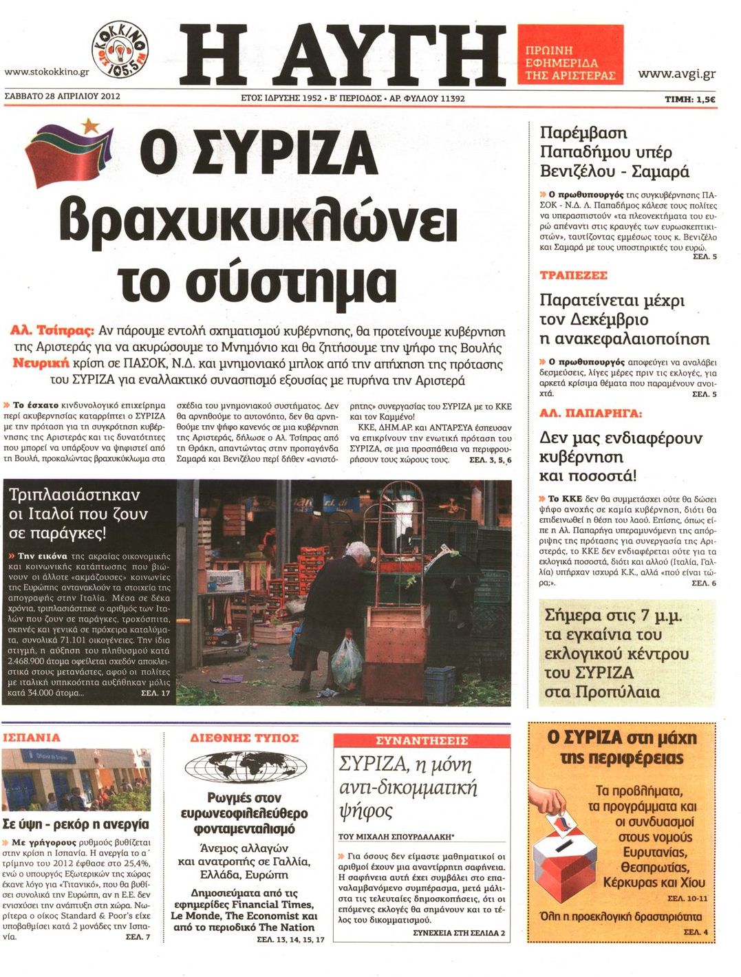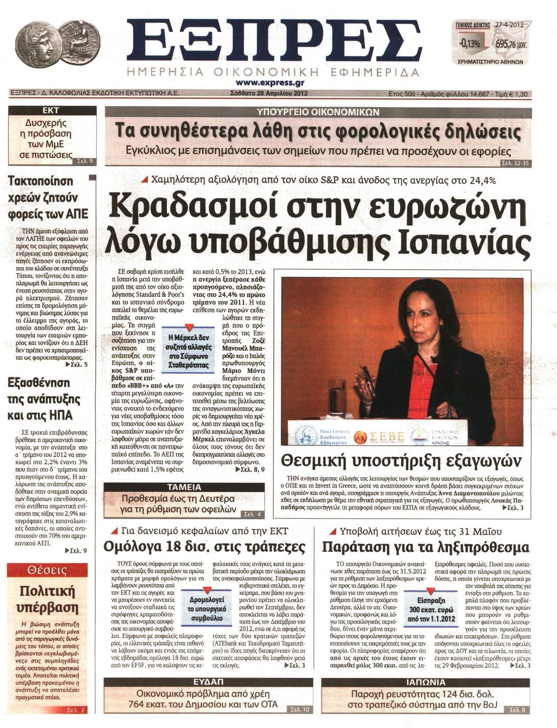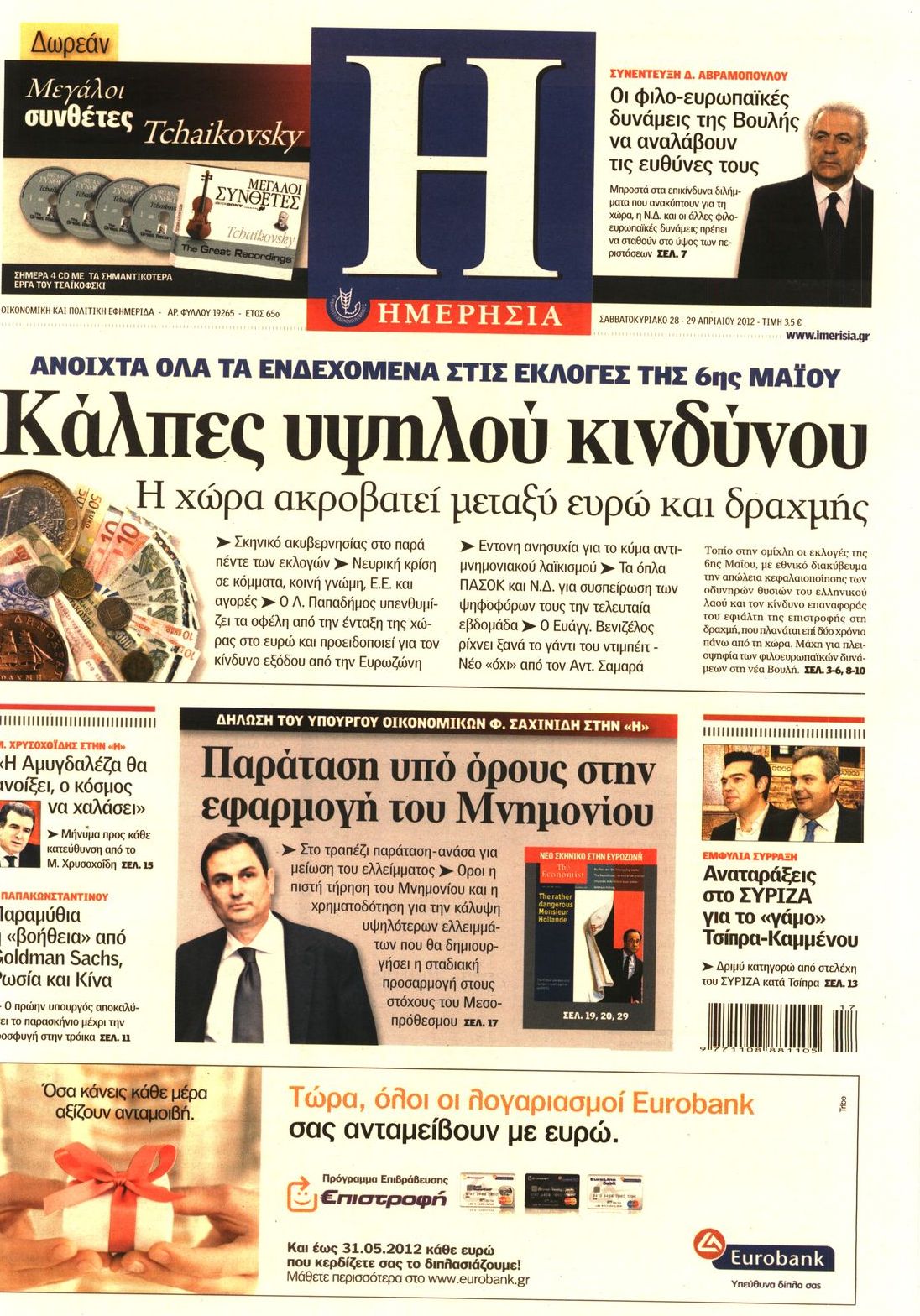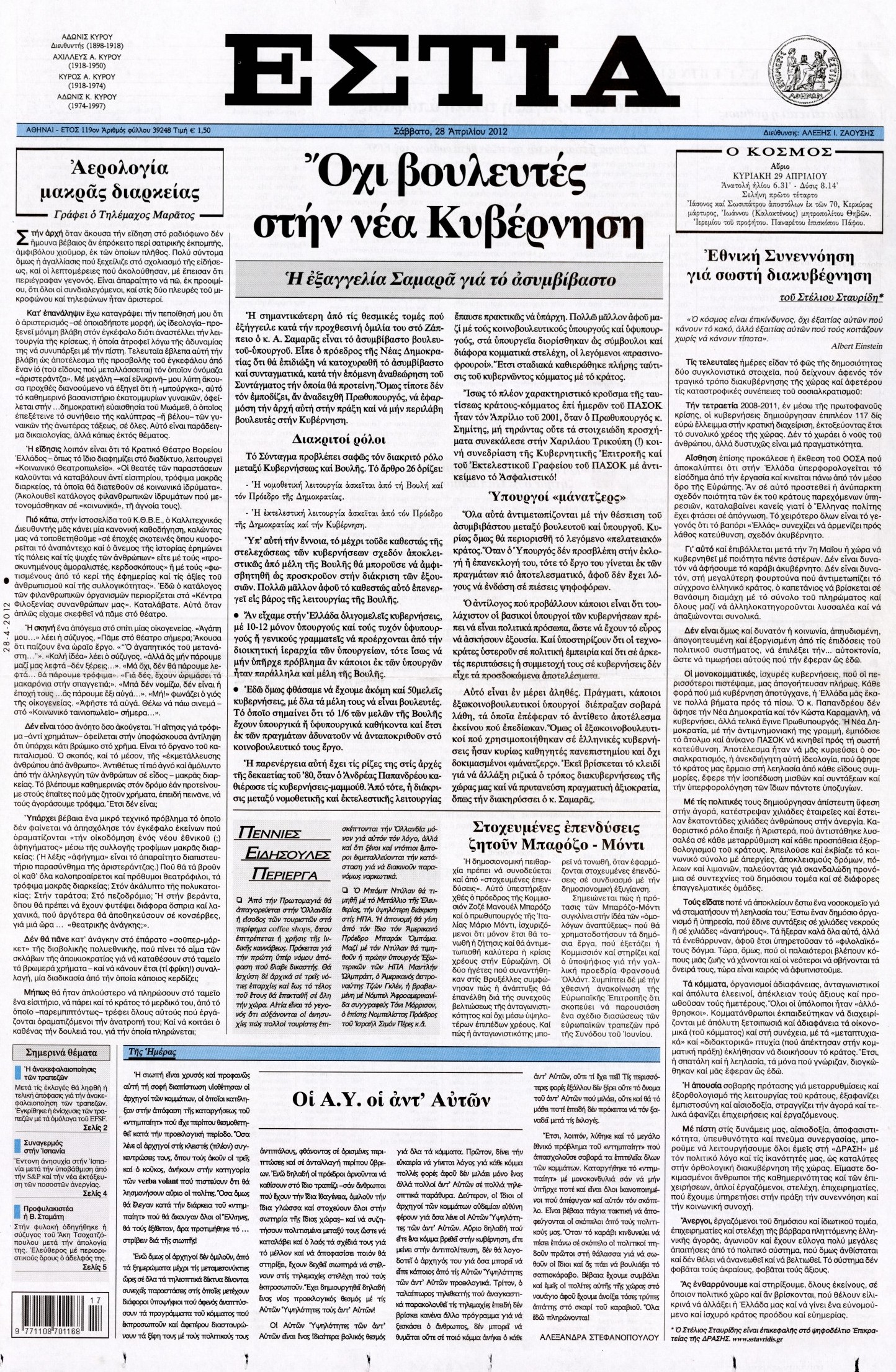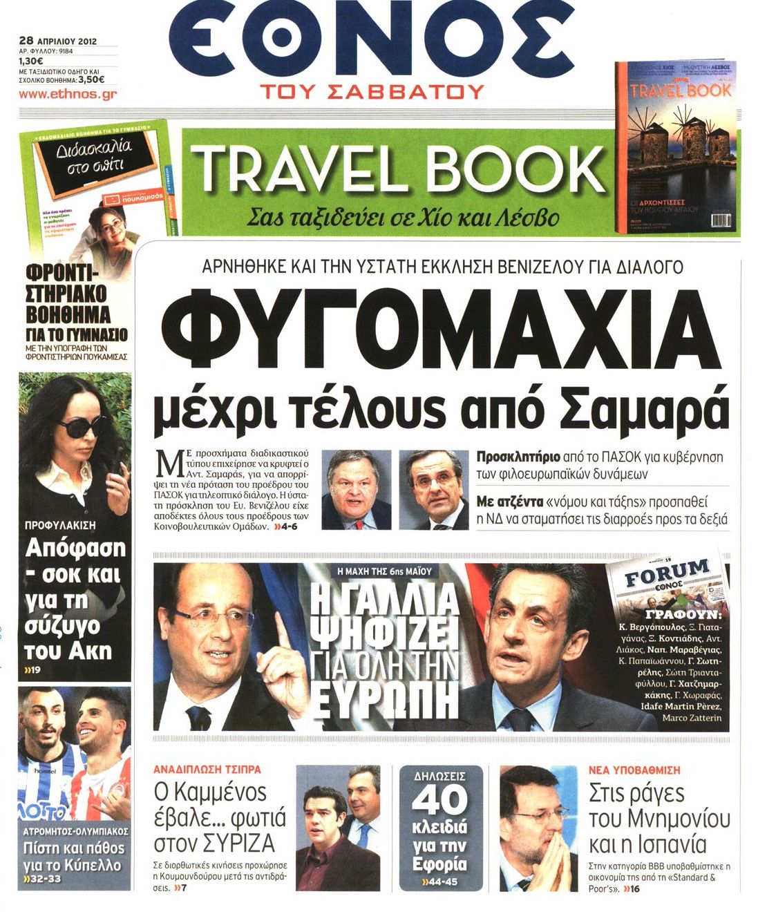 Τα πρωτοσέλιδα των εφημερίδων Enikos Newsroom 07:55, Σάββατο 28 Απριλίου 2012 Media Μοιράσου το: σχολίασε κι εσύ (0 σχόλια) Ακολουθήστε το enikos.gr στο Google News και μάθετε πρώτοι όλες τις ειδήσεις Δείτε όλες τις τελευταίες ειδήσεις από την Ελλάδα και τον Κόσμο στο enikos.gr Ειδήσεις Ροή Ειδήσεων 4 ώρες πριν Από το Ορμένιο ως τα Μάλγαρα κι από τη Σιάτιστα μέχρι τη Νίκαια: Μπλόκα σε όλη την Ελλάδα – Το Σάββατο ανοίγουν τα διόδια οι αγρότες 2 ώρες πριν Εμπλοκή και αερομαχίες με οπλισμένα τουρκικά F-16 στο Αιγαίο 3 ώρες πριν Αττική: Θρίλερ με νεκρό βρέφος 5 μηνών – Κοιμόταν στο ίδιο κρεβάτι με τους γονείς του 1 ώρα πριν Πούτιν: «Ναι, είμαι ερωτευμένος» – Βίντεο από τη σπάνια προσωπική παραδοχή του 3 ώρες πριν Μεσόγειος: Η διαδρομή του ρωσικού τάνκερ «Qendil» και η στοχευμένη επίθεση της Ουκρανίας με drone – Ο Πούτιν προειδοποίησε για αντίποινα 5 ώρες πριν Τα 5 ζώδια που ευνοούνται στην ερωτική ζωή τους την επόμενη εβδομάδα – «Η ενέργεια του Αιγόκερου φέρνει αγάπη και σταθερότητα» 6 ώρες πριν Αυτό το έξυπνο μαθηματικό κόλπο θα μπορούσε να αλλάξει τον τρόπο με τον οποίο οι επιστήμονες μελετούν τους σεισμούς 2 ώρες πριν Μήπως έχετε χάσει τον εαυτό σας στη σχέση σας; 7 «αθόρυβες» υποχωρήσεις που μάλλον κάνατε, χωρίς να το συνειδητοποιήσετε 4 ώρες πριν Κουίζ για την παλιά Αθήνα: Αναγνωρίζετε την περιοχή; Έχετε περάσει 100% από εκεί 4 λεπτά πριν Ανδρέας Λυκουρέντζος: Υπέβαλε την παραίτησή του ο πρόεδρος του ΕΛΓΑ – Δεν έγινε δεκτή από την κυβέρνηση – ΒΙΝΤΕΟ 8 λεπτά πριν Ηράκλειο: «Ιπτάμενοι» Άγιοι Βασίληδες μοίρασαν δώρα και χαμόγελα στα παιδιά στο ΠΑΓΝΗ – Δείτε βίντεο 14 λεπτά πριν Αριθμολογία: Οι άνθρωποι που έχουν γεννηθεί αυτές τις 4 ημερομηνίες, συχνά παρεξηγούνται – «Η καλοσύνη τους κρύβει τεράστια δύναμη» 20 λεπτά πριν Ρύθμιση του ΥΠΑΑΤ για τους αγρότες που δεν έλαβαν τη βασική ενίσχυση λόγω εκκρεμοτήτων στο Κτηματολόγιο 32 λεπτά πριν Μπαράκ Ομπάμα: Τα βιβλία, οι ταινίες και τα τραγούδια που ξεχώρισε το 2025 – Πλήρης λίστα ENIKOS NETWORK Το ΕΚΑΒ τιμήθηκε από την Ακαδημία Αθηνών για τα 40 χρόνια προσφοράς του Έχετε πραγματικά μεγάλη καρδιά; 10 χαρακτηριστικά όσων έχουν καλοσύνη Έρχονται νέες προσλήψεις σε Δήμο – Όλες οι λεπτομέρειες Επίδομα παιδιού: Πότε ανοίγει ξανά η πλατφόρμα για τις αιτήσεις Χαρτογραφώντας το «σημείο χωρίς επιστροφή»: Για πρώτη φορά αποκαλύπτεται με λεπτομέρεια το ακανθώδες όριο της ατμόσφαιρας τ... Η Google καταργεί τη λειτουργία «dark web report» – Πώς θα μπορούν οι χρήστες να διαγράφουν τα δεδομένα τους περισσότερα 20:37 , Παρασκευή 19 Δεκεμβρίου 2025 Don’t Forget The Lyrics: Η Έλλη Κοκκίνου υποδέχεται 4 παίκτες που θα κάνουν τα πάντα για να μη χάσουν ούτε… μισή λέξη από τους στίχους Το «Don’t Forget The Lyrics» επιστρέφει απόψε, Παρασκευή 19 Δεκεμβρίου, στις 21:00 με νέο επει... 19:31 , Παρασκευή 19 Δεκεμβρίου 2025 GNTM: Απόψε ο μεγάλος τελικός για τους 4 φιναλίστ Έπειτα από μήνες γεμάτους μόδα, δημιουργία και έντονες αναμετρήσεις, το GNTM 2025 κορυφώνεται,... 18:11 , Παρασκευή 19 Δεκεμβρίου 2025 Το σόι σου: Ο Άρης έρχεται στην Ελλάδα για τις γιορτές των Χριστουγέννων – Τι θα δούμε στο αποψινό εορταστικό επεισόδιο Ένα απολαυστικό, εορταστικό επεισόδιο της σειράς “Το σόι σου”, γεμάτο ευτράπελα αλ... 15:15 , Παρασκευή 19 Δεκεμβρίου 2025 Την Κυριακή με τη Realnews: Ό,τι και αν αγοράσεις, σκανάρεις και κερδίζεις! Την Κυριακή με τη Realnews: Ό,τι και αν αγοράσεις, σκανάρεις και κερδίζεις! Με το PADU app, το... ΤΕΛΕΥΤΑΙΕΣ ΕΙΔΗΣΕΙΣ 4 λεπτά πριν Ανδρέας Λυκο
