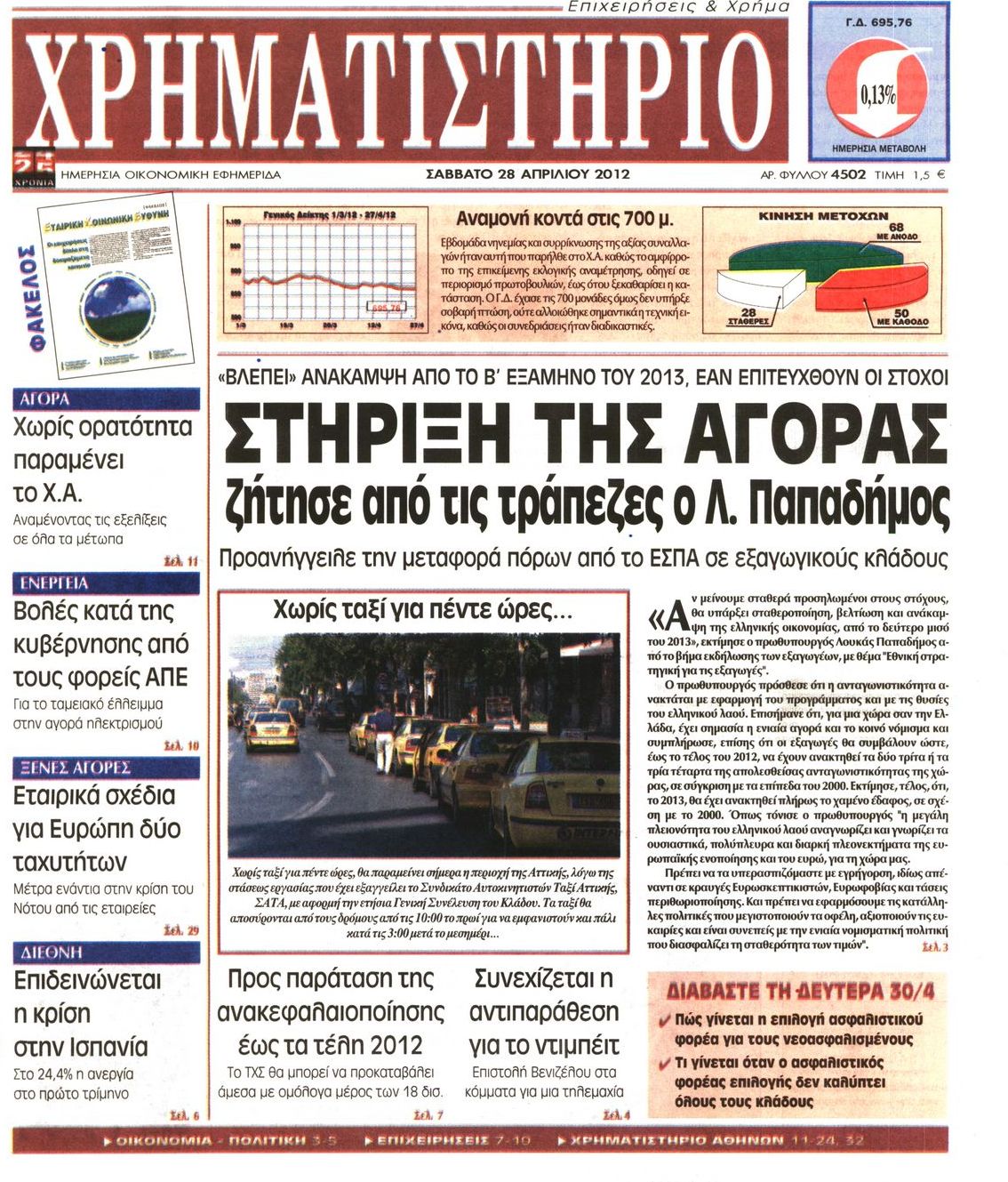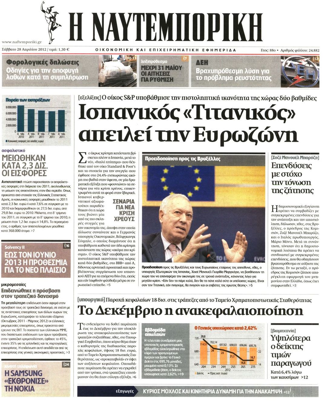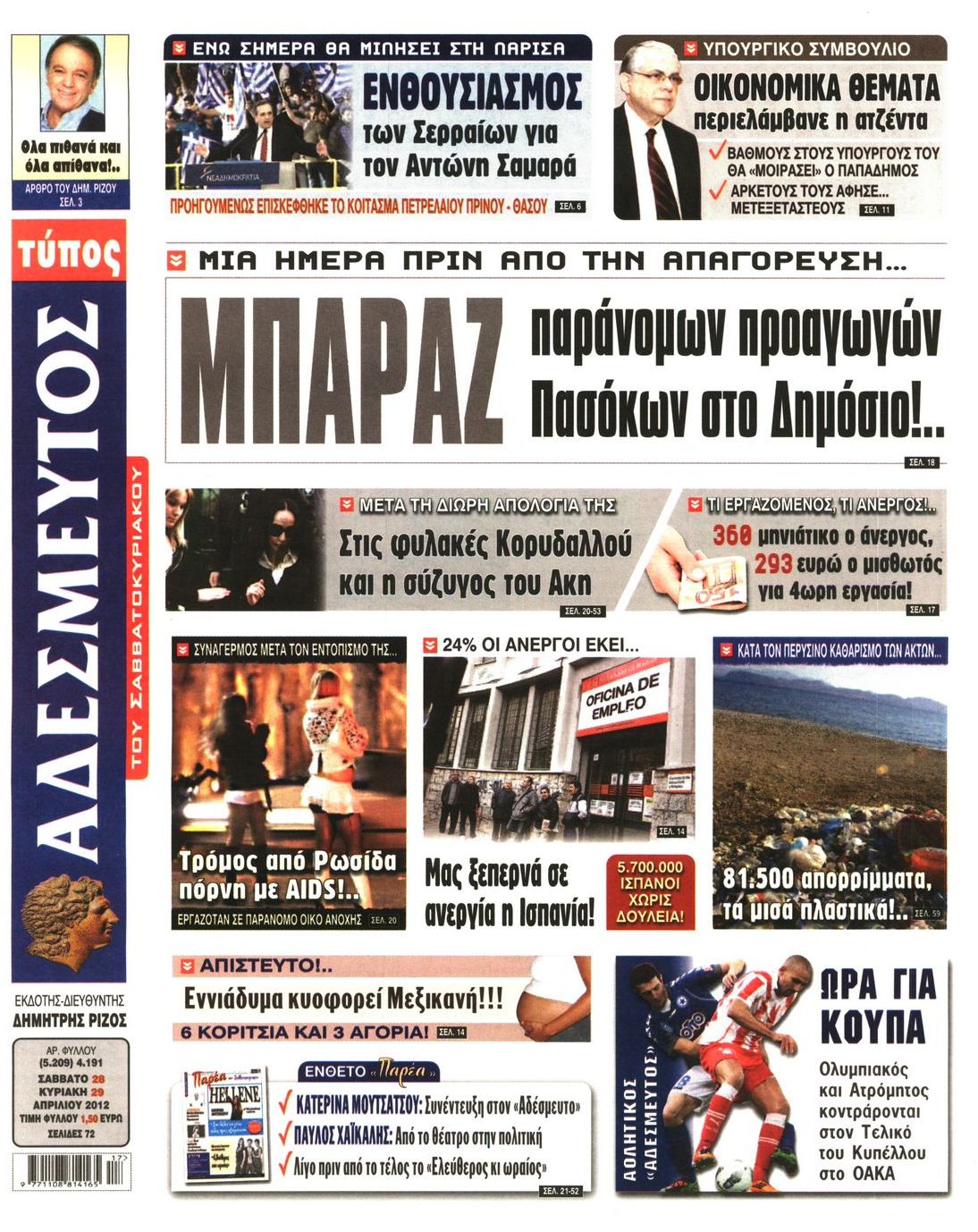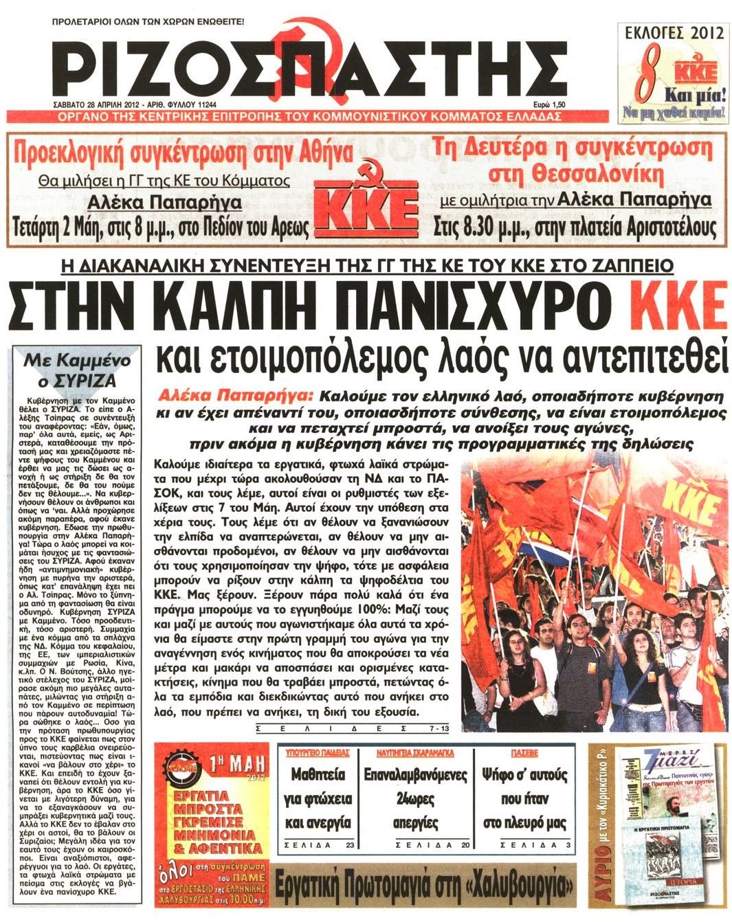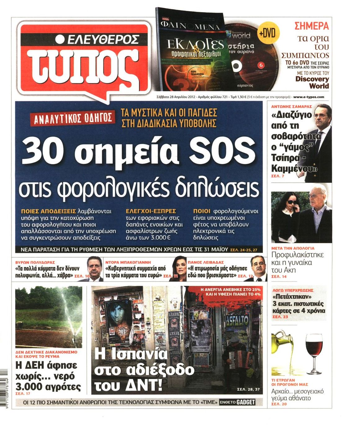 Τα πρωτοσέλιδα των εφημερίδων Enikos Newsroom 07:55, Σάββατο 28 Απριλίου 2012 Media Μοιράσου το: σχολίασε κι εσύ (0 σχόλια) Ακολουθήστε το enikos.gr στο Google News και μάθετε πρώτοι όλες τις ειδήσεις Δείτε όλες τις τελευταίες ειδήσεις από την Ελλάδα και τον Κόσμο στο enikos.gr Ειδήσεις Ροή Ειδήσεων 4 ώρες πριν Από το Ορμένιο ως τα Μάλγαρα κι από τη Σιάτιστα μέχρι τη Νίκαια: Μπλόκα σε όλη την Ελλάδα – Το Σάββατο ανοίγουν τα διόδια οι αγρότες 2 ώρες πριν Εμπλοκή και αερομαχίες με οπλισμένα τουρκικά F-16 στο Αιγαίο 3 ώρες πριν Αττική: Θρίλερ με νεκρό βρέφος 5 μηνών – Κοιμόταν στο ίδιο κρεβάτι με τους γονείς του 1 ώρα πριν Πούτιν: «Ναι, είμαι ερωτευμένος» – Βίντεο από τη σπάνια προσωπική παραδοχή του 3 ώρες πριν Μεσόγειος: Η διαδρομή του ρωσικού τάνκερ «Qendil» και η στοχευμένη επίθεση της Ουκρανίας με drone – Ο Πούτιν προειδοποίησε για αντίποινα 5 ώρες πριν Τα 5 ζώδια που ευνοούνται στην ερωτική ζωή τους την επόμενη εβδομάδα – «Η ενέργεια του Αιγόκερου φέρνει αγάπη και σταθερότητα» 6 ώρες πριν Αυτό το έξυπνο μαθηματικό κόλπο θα μπορούσε να αλλάξει τον τρόπο με τον οποίο οι επιστήμονες μελετούν τους σεισμούς 2 ώρες πριν Μήπως έχετε χάσει τον εαυτό σας στη σχέση σας; 7 «αθόρυβες» υποχωρήσεις που μάλλον κάνατε, χωρίς να το συνειδητοποιήσετε 4 ώρες πριν Κουίζ για την παλιά Αθήνα: Αναγνωρίζετε την περιοχή; Έχετε περάσει 100% από εκεί 4 λεπτά πριν Ανδρέας Λυκουρέντζος: Υπέβαλε την παραίτησή του ο πρόεδρος του ΕΛΓΑ – Δεν έγινε δεκτή από την κυβέρνηση – ΒΙΝΤΕΟ 8 λεπτά πριν Ηράκλειο: «Ιπτάμενοι» Άγιοι Βασίληδες μοίρασαν δώρα και χαμόγελα στα παιδιά στο ΠΑΓΝΗ – Δείτε βίντεο 14 λεπτά πριν Αριθμολογία: Οι άνθρωποι που έχουν γεννηθεί αυτές τις 4 ημερομηνίες, συχνά παρεξηγούνται – «Η καλοσύνη τους κρύβει τεράστια δύναμη» 20 λεπτά πριν Ρύθμιση του ΥΠΑΑΤ για τους αγρότες που δεν έλαβαν τη βασική ενίσχυση λόγω εκκρεμοτήτων στο Κτηματολόγιο 32 λεπτά πριν Μπαράκ Ομπάμα: Τα βιβλία, οι ταινίες και τα τραγούδια που ξεχώρισε το 2025 – Πλήρης λίστα ENIKOS NETWORK Το ΕΚΑΒ τιμήθηκε από την Ακαδημία Αθηνών για τα 40 χρόνια προσφοράς του Έχετε πραγματικά μεγάλη καρδιά; 10 χαρακτηριστικά όσων έχουν καλοσύνη Έρχονται νέες προσλήψεις σε Δήμο – Όλες οι λεπτομέρειες Επίδομα παιδιού: Πότε ανοίγει ξανά η πλατφόρμα για τις αιτήσεις Χαρτογραφώντας το «σημείο χωρίς επιστροφή»: Για πρώτη φορά αποκαλύπτεται με λεπτομέρεια το ακανθώδες όριο της ατμόσφαιρας τ... Η Google καταργεί τη λειτουργία «dark web report» – Πώς θα μπορούν οι χρήστες να διαγράφουν τα δεδομένα τους περισσότερα 20:37 , Παρασκευή 19 Δεκεμβρίου 2025 Don’t Forget The Lyrics: Η Έλλη Κοκκίνου υποδέχεται 4 παίκτες που θα κάνουν τα πάντα για να μη χάσουν ούτε… μισή λέξη από τους στίχους Το «Don’t Forget The Lyrics» επιστρέφει απόψε, Παρασκευή 19 Δεκεμβρίου, στις 21:00 με νέο επει... 19:31 , Παρασκευή 19 Δεκεμβρίου 2025 GNTM: Απόψε ο μεγάλος τελικός για τους 4 φιναλίστ Έπειτα από μήνες γεμάτους μόδα, δημιουργία και έντονες αναμετρήσεις, το GNTM 2025 κορυφώνεται,... 18:11 , Παρασκευή 19 Δεκεμβρίου 2025 Το σόι σου: Ο Άρης έρχεται στην Ελλάδα για τις γιορτές των Χριστουγέννων – Τι θα δούμε στο αποψινό εορταστικό επεισόδιο Ένα απολαυστικό, εορταστικό επεισόδιο της σειράς “Το σόι σου”, γεμάτο ευτράπελα αλ... 15:15 , Παρασκευή 19 Δεκεμβρίου 2025 Την Κυριακή με τη Realnews: Ό,τι και αν αγοράσεις, σκανάρεις και κερδίζεις! Την Κυριακή με τη Realnews: Ό,τι και αν αγοράσεις, σκανάρεις και κερδίζεις! Με το PADU app, το... ΤΕΛΕΥΤΑΙΕΣ ΕΙΔΗΣΕΙΣ 4 λεπτά πριν Ανδρέας Λυκο