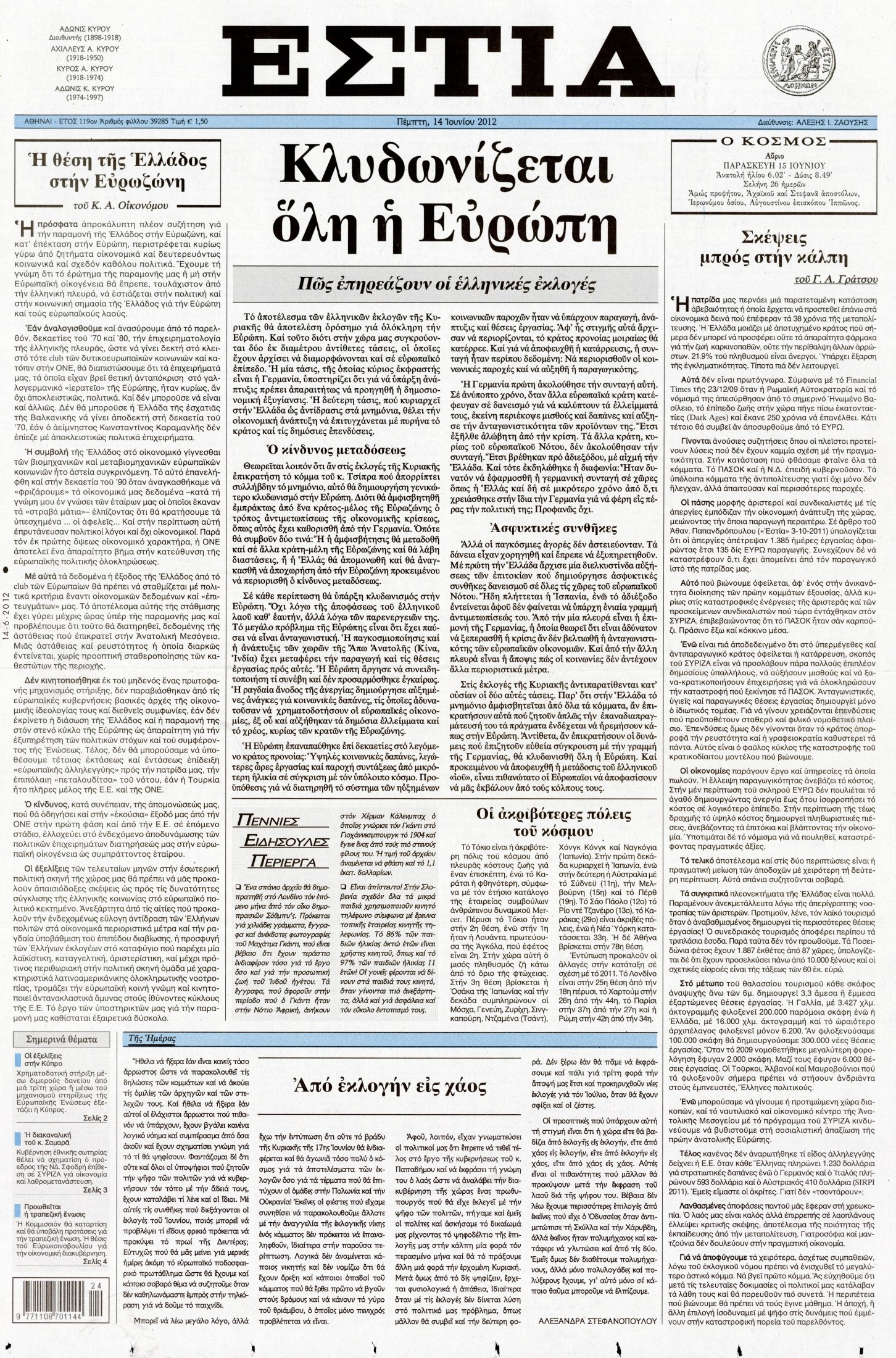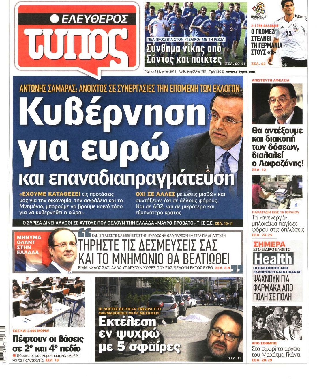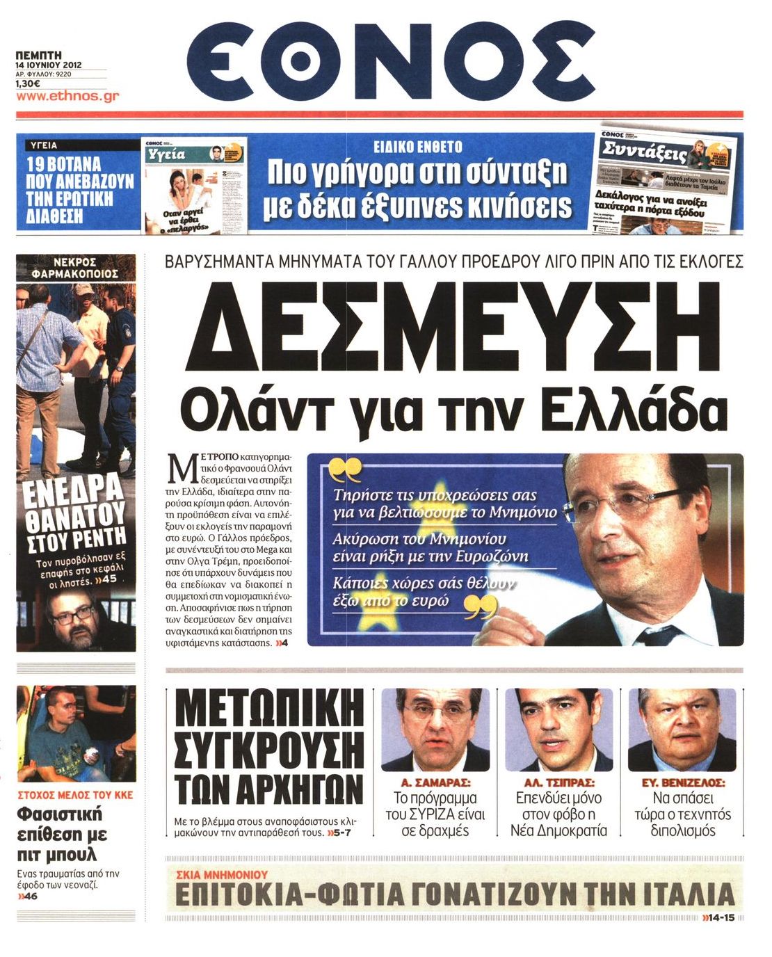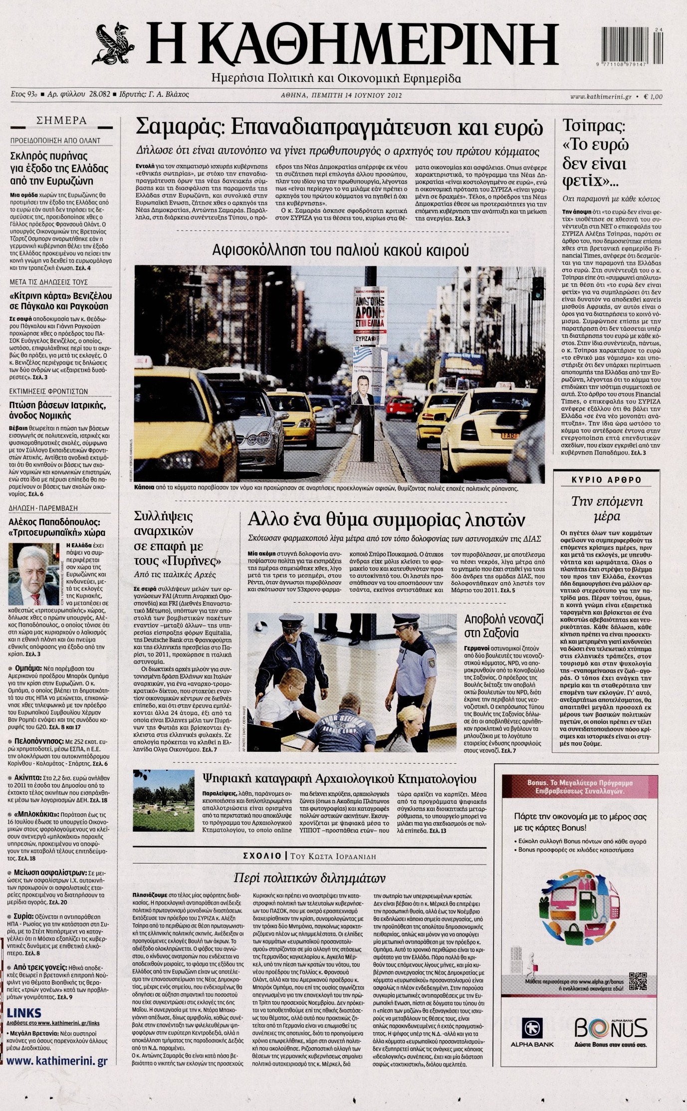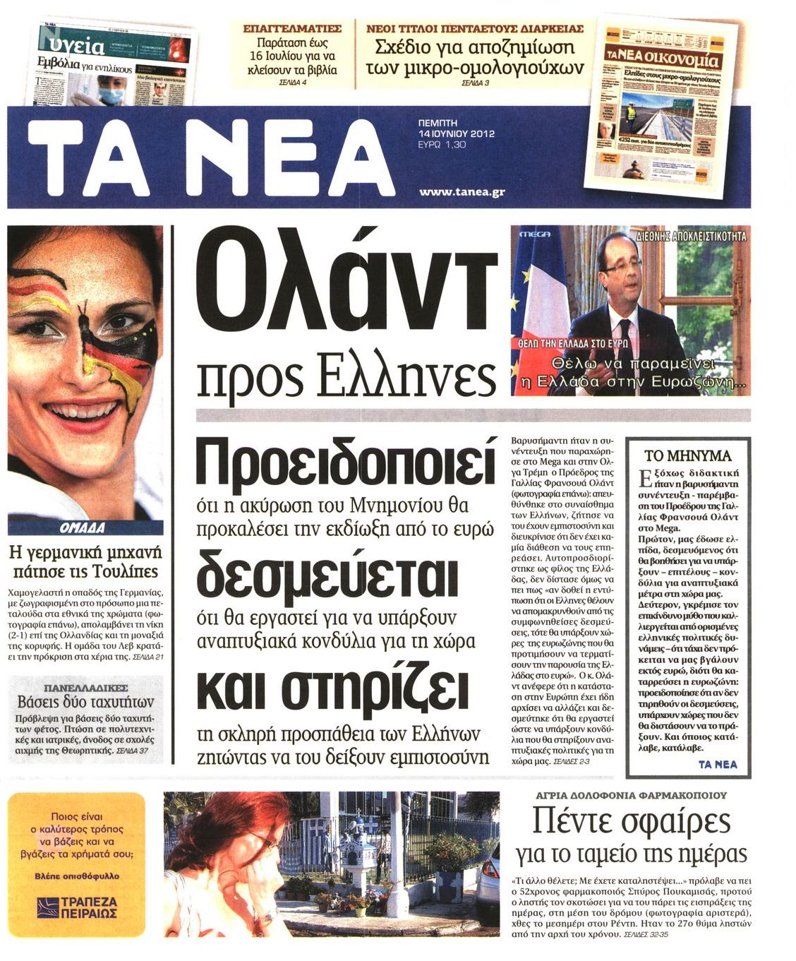 Τα πρωτοσέλιδα των εφημερίδων Enikos Newsroom 07:39, Πέμπτη 14 Ιουνίου 2012 Media ΕΦΗΜΕΡΙΔΕΣ ΠΡΩΤΟΣΕΛΙΔΑ Μοιράσου το: σχολίασε κι εσύ (0 σχόλια) Ακολουθήστε το enikos.gr στο Google News και μάθετε πρώτοι όλες τις ειδήσεις Δείτε όλες τις τελευταίες ειδήσεις από την Ελλάδα και τον Κόσμο στο enikos.gr Ειδήσεις Ροή Ειδήσεων 55 λεπτά πριν Πώς στήθηκε η επιχείρηση «Ίπαλλος» που οδήγησε στη σύλληψη του «Έλληνα Εσκομπάρ» – «Ο πόλεμος ενάντια στους εμπόρους ναρκωτικών θα συνεχιστεί» 40 λεπτά πριν Δίκη Χρυσής Αυγής: Την ενοχή και των 42 κατηγορουμένων ζητά η εισαγγελέας 1 ώρα πριν Κυψέλη: Στη φυλακή η 16χρονη που μαχαίρωσε συμμαθήτριά της 4 ώρες πριν Αμοργός: «Θα προσπαθήσω να το κάνω κάθε μέρα» – Ποιος είναι ο αγρότης που έστησε μόνος του το πρώτο μπλόκο στο νησί 2 ώρες πριν Τραγωδία στην Αλεξανδρούπολη: Παιδάκι 3 ετών μεταφέρθηκε νεκρό από τη μητέρα του στο νοσοκομείο 1 ώρα πριν Τα 3 ζώδια που θα δουν τη ζωή τους να αλλάζει ριζικά το 2026 – «Όλα γίνονται καλύτερα σταδιακά» 6 ώρες πριν «Δεν είχα κλάψει από τότε που διαγνώστηκα με καρκίνο, ώσπου ένα τηλεφώνημα με έκανε να λυγίσω» – Η συγκλονιστική εξομολόγηση ενός άνδρα 2 ώρες πριν Ο σπάνιος σεισμός που έλυσε τα χέρια των επιστημόνων – Αποκάλυψε ακριβώς όσα αναζητούσαν 8 ώρες πριν 20 χρόνια τα Χριστούγεννα ξεκινούν στα Public με μεγάλη ποικιλία σε δώρα! 5 λεπτά πριν Δημοσιογράφος μήνυσε τον ευρωβουλευτή Νίκο Παππά για ξυλοδαρμό – Αναζητείται στο πλαίσιο του αυτοφώρου 11 λεπτά πριν ΥΠΕΞ σε Μίτσκοσκι: «Κάθε προσπάθεια αλλοίωσης της Συμφωνίας των Πρεσπών δεν πρόκειται να γίνει αποδεκτή» 15 λεπτά πριν Θεσσαλονίκη: Επίθεση αδέσποτου σκύλου σε κάτοικο στον Χορτιάτη – Διακομίστηκε στο νοσοκομείο 27 λεπτά πριν Θεσσαλονίκη: Ακυρώνονται τρεις παραστάσεις του ΚΘΒΕ λόγω στάσης εργασίας των εργαζομένων 34 λεπτά πριν Τραγωδία στην Αχαΐα: 48χρονος κατέρρευσε στο κυνήγι μπροστά στα μάτια του πατέρα του ENIKOS NETWORK Γιατί αναζητούμε τα Χριστούγεννα όλο και νωρίτερα; Ποιοι οι ψυχολογικοί και οι συναισθηματικοί λόγοι Σοβαροί κίνδυνοι από τη λάθος χορήγηση φαρμάκου για τις αιμορραγίες-Συστάσεις προς τους γιατρούς Επίδομα παιδιού: Πότε θα δοθεί η τελευταία δόση για το 2025 από τον ΟΠΕΚΑ και τι πρέπει να γνωρίζετε Eurostat: Κάτω από την αρχική εκτίμηση της Υπηρεσίας ο πληθωρισμός στην Ελλάδα τον Νοέμβριο του 2025 – Tα στοιχεία για την ... Χαρτογραφώντας το «σημείο χωρίς επιστροφή»: Για πρώτη φορά αποκαλύπτεται με λεπτομέρεια το ακανθώδες όριο της ατμόσφαιρας τ... Η Google καταργεί τη λειτουργία «dark web report» – Πώς θα μπορούν οι χρήστες να διαγράφουν τα δεδομένα τους περισσότερα 12:35 , Τετάρτη 17 Δεκεμβρίου 2025 Μίρκα Παπακωνσταντίνου: «Δεν ήμουν αισιόδοξη για τα νούμερα – Είμαι ρεαλίστρια» Στα γυρίσματα του εορταστικού επεισοδίου της αγαπημένης σειράς “Το Σόι Σου”, βρέθηκε η κάμερα ... 12:12 , Τετάρτη 17 Δεκεμβρίου 2025 Ακούστε την εκπομπή του Νίκου Χατζηνικολάου 17/12/2025 Ακούστε την εκπομπή του Νίκου Χατζηνικολάου στον ραδιοφωνικό σταθμό RealFm 97,8, την Τετάρτη 1... 11:35 , Τετάρτη 17 Δεκεμβρίου 2025 Home Alone: Το σπίτι της ταινίας θα ανακαινιστεί – Επιστροφή στην αισθητική της δεκαετίας του ’90 Οι νέοι ιδιοκτήτες του πραγματικού σπιτιού που παρουσιάζεται στην κλασική ταινία του 1990 «Hom... 11:25 , Τετάρτη 17 Δεκεμβρίου 2025 Grand Hotel: Απόψε το τελευταίο επεισόδιο της χρονιάς – Όλα τα μυστικά μένουν εδώ Το τελευταίο επεισόδιο της χρονιάς της σειράς «Grand Hotel» θα προβληθεί απόψε στις 21:00. Ο Ά... ΤΕΛΕΥΤΑΙΕΣ ΕΙΔΗΣΕΙΣ