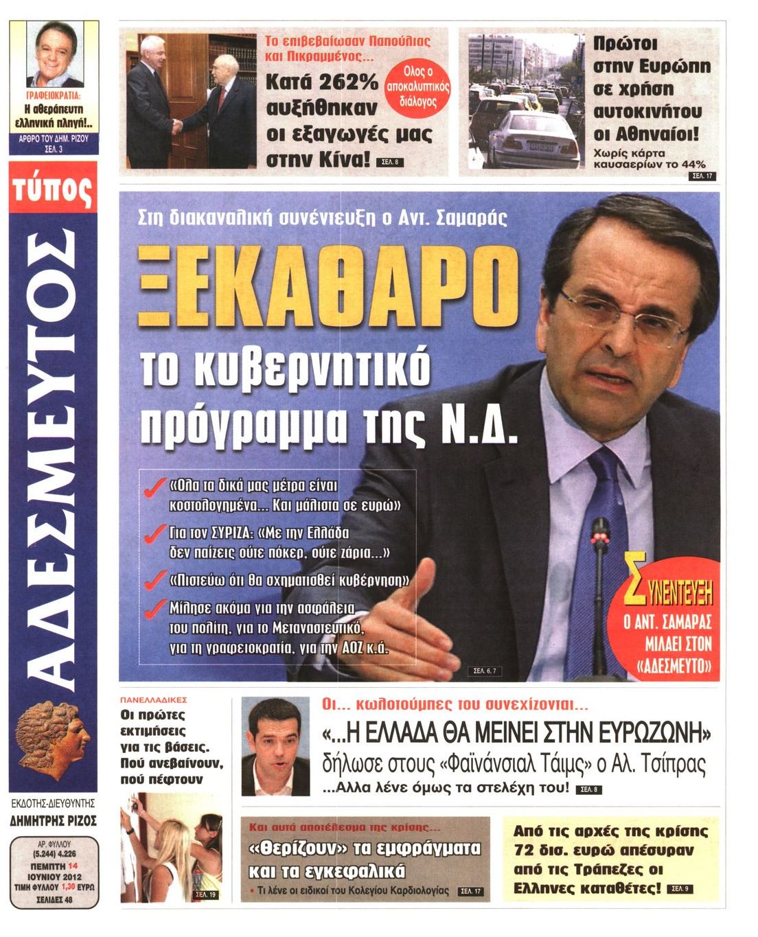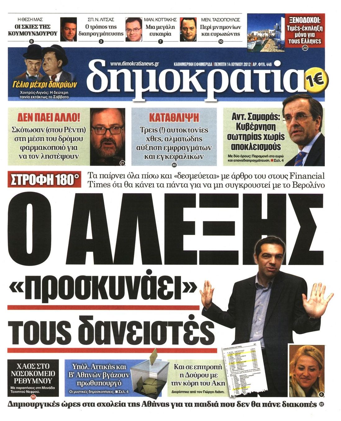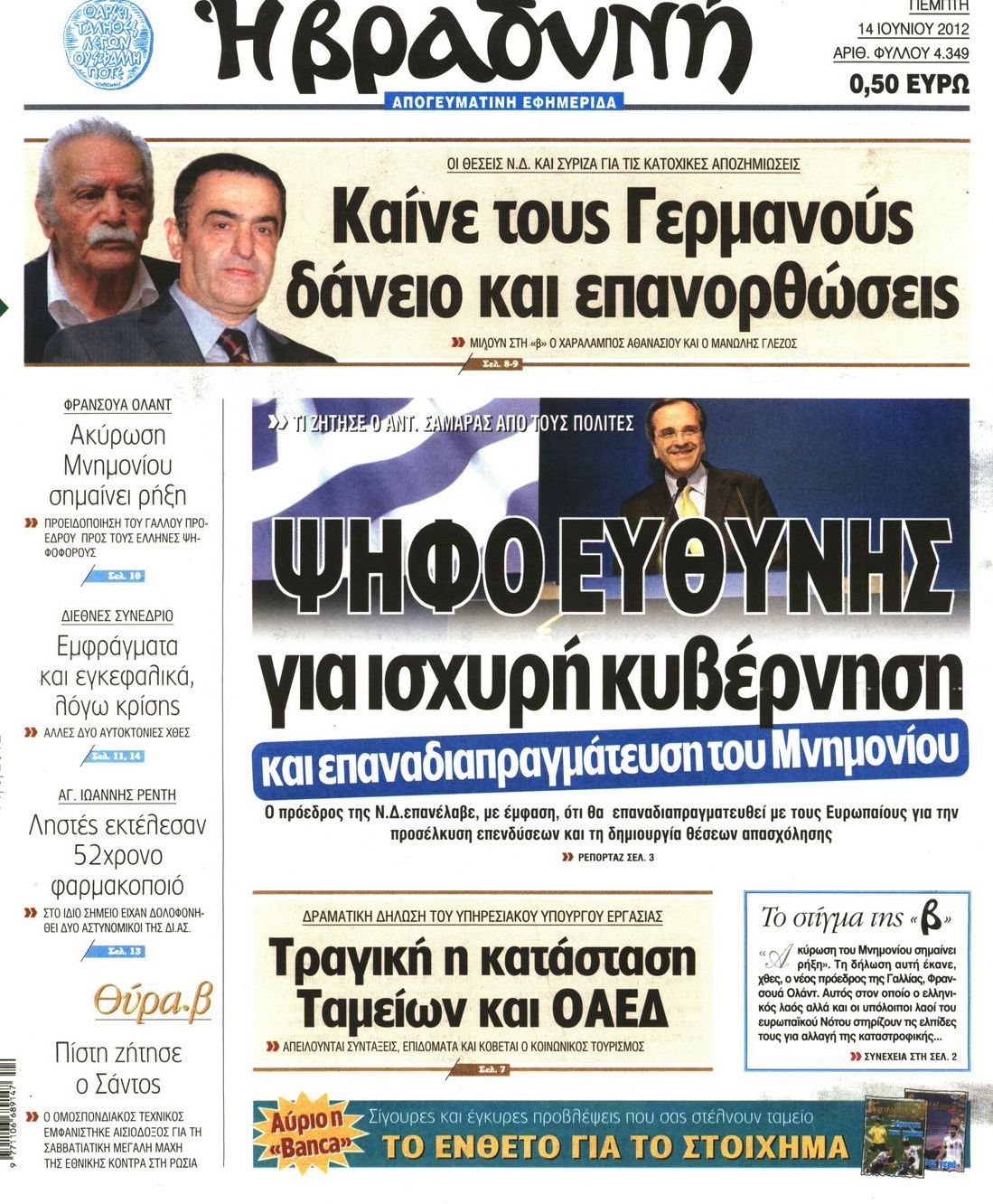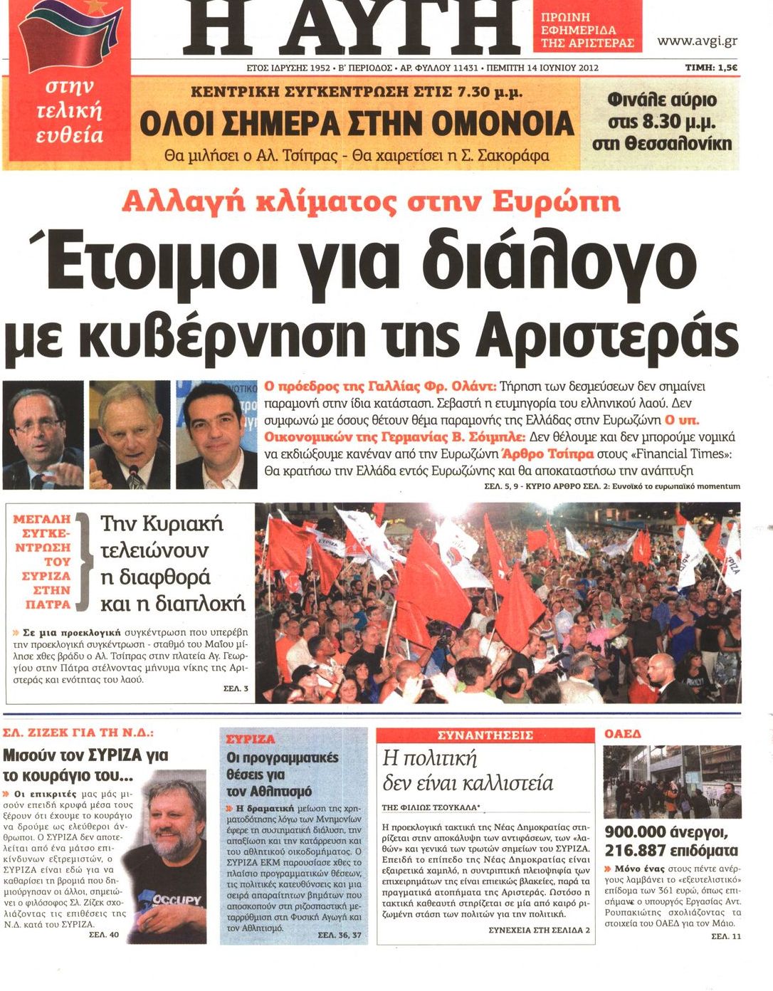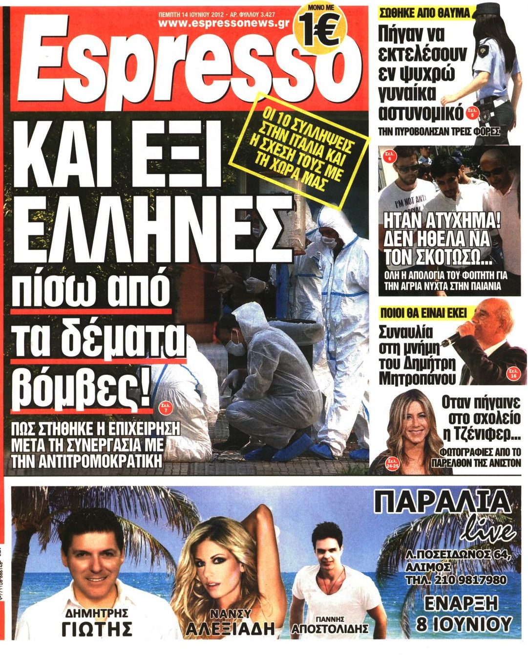 Τα πρωτοσέλιδα των εφημερίδων Enikos Newsroom 07:39, Πέμπτη 14 Ιουνίου 2012 Media ΕΦΗΜΕΡΙΔΕΣ ΠΡΩΤΟΣΕΛΙΔΑ Μοιράσου το: σχολίασε κι εσύ (0 σχόλια) Ακολουθήστε το enikos.gr στο Google News και μάθετε πρώτοι όλες τις ειδήσεις Δείτε όλες τις τελευταίες ειδήσεις από την Ελλάδα και τον Κόσμο στο enikos.gr Ειδήσεις Ροή Ειδήσεων 55 λεπτά πριν Πώς στήθηκε η επιχείρηση «Ίπαλλος» που οδήγησε στη σύλληψη του «Έλληνα Εσκομπάρ» – «Ο πόλεμος ενάντια στους εμπόρους ναρκωτικών θα συνεχιστεί» 40 λεπτά πριν Δίκη Χρυσής Αυγής: Την ενοχή και των 42 κατηγορουμένων ζητά η εισαγγελέας 1 ώρα πριν Κυψέλη: Στη φυλακή η 16χρονη που μαχαίρωσε συμμαθήτριά της 4 ώρες πριν Αμοργός: «Θα προσπαθήσω να το κάνω κάθε μέρα» – Ποιος είναι ο αγρότης που έστησε μόνος του το πρώτο μπλόκο στο νησί 2 ώρες πριν Τραγωδία στην Αλεξανδρούπολη: Παιδάκι 3 ετών μεταφέρθηκε νεκρό από τη μητέρα του στο νοσοκομείο 1 ώρα πριν Τα 3 ζώδια που θα δουν τη ζωή τους να αλλάζει ριζικά το 2026 – «Όλα γίνονται καλύτερα σταδιακά» 6 ώρες πριν «Δεν είχα κλάψει από τότε που διαγνώστηκα με καρκίνο, ώσπου ένα τηλεφώνημα με έκανε να λυγίσω» – Η συγκλονιστική εξομολόγηση ενός άνδρα 2 ώρες πριν Ο σπάνιος σεισμός που έλυσε τα χέρια των επιστημόνων – Αποκάλυψε ακριβώς όσα αναζητούσαν 8 ώρες πριν 20 χρόνια τα Χριστούγεννα ξεκινούν στα Public με μεγάλη ποικιλία σε δώρα! 5 λεπτά πριν Δημοσιογράφος μήνυσε τον ευρωβουλευτή Νίκο Παππά για ξυλοδαρμό – Αναζητείται στο πλαίσιο του αυτοφώρου 11 λεπτά πριν ΥΠΕΞ σε Μίτσκοσκι: «Κάθε προσπάθεια αλλοίωσης της Συμφωνίας των Πρεσπών δεν πρόκειται να γίνει αποδεκτή» 15 λεπτά πριν Θεσσαλονίκη: Επίθεση αδέσποτου σκύλου σε κάτοικο στον Χορτιάτη – Διακομίστηκε στο νοσοκομείο 27 λεπτά πριν Θεσσαλονίκη: Ακυρώνονται τρεις παραστάσεις του ΚΘΒΕ λόγω στάσης εργασίας των εργαζομένων 34 λεπτά πριν Τραγωδία στην Αχαΐα: 48χρονος κατέρρευσε στο κυνήγι μπροστά στα μάτια του πατέρα του ENIKOS NETWORK Γιατί αναζητούμε τα Χριστούγεννα όλο και νωρίτερα; Ποιοι οι ψυχολογικοί και οι συναισθηματικοί λόγοι Σοβαροί κίνδυνοι από τη λάθος χορήγηση φαρμάκου για τις αιμορραγίες-Συστάσεις προς τους γιατρούς Επίδομα παιδιού: Πότε θα δοθεί η τελευταία δόση για το 2025 από τον ΟΠΕΚΑ και τι πρέπει να γνωρίζετε Eurostat: Κάτω από την αρχική εκτίμηση της Υπηρεσίας ο πληθωρισμός στην Ελλάδα τον Νοέμβριο του 2025 – Tα στοιχεία για την ... Χαρτογραφώντας το «σημείο χωρίς επιστροφή»: Για πρώτη φορά αποκαλύπτεται με λεπτομέρεια το ακανθώδες όριο της ατμόσφαιρας τ... Η Google καταργεί τη λειτουργία «dark web report» – Πώς θα μπορούν οι χρήστες να διαγράφουν τα δεδομένα τους περισσότερα 12:35 , Τετάρτη 17 Δεκεμβρίου 2025 Μίρκα Παπακωνσταντίνου: «Δεν ήμουν αισιόδοξη για τα νούμερα – Είμαι ρεαλίστρια» Στα γυρίσματα του εορταστικού επεισοδίου της αγαπημένης σειράς “Το Σόι Σου”, βρέθηκε η κάμερα ... 12:12 , Τετάρτη 17 Δεκεμβρίου 2025 Ακούστε την εκπομπή του Νίκου Χατζηνικολάου 17/12/2025 Ακούστε την εκπομπή του Νίκου Χατζηνικολάου στον ραδιοφωνικό σταθμό RealFm 97,8, την Τετάρτη 1... 11:35 , Τετάρτη 17 Δεκεμβρίου 2025 Home Alone: Το σπίτι της ταινίας θα ανακαινιστεί – Επιστροφή στην αισθητική της δεκαετίας του ’90 Οι νέοι ιδιοκτήτες του πραγματικού σπιτιού που παρουσιάζεται στην κλασική ταινία του 1990 «Hom... 11:25 , Τετάρτη 17 Δεκεμβρίου 2025 Grand Hotel: Απόψε το τελευταίο επεισόδιο της χρονιάς – Όλα τα μυστικά μένουν εδώ Το τελευταίο επεισόδιο της χρονιάς της σειράς «Grand Hotel» θα προβληθεί απόψε στις 21:00. Ο Ά... ΤΕΛΕΥΤΑΙΕΣ ΕΙΔΗΣΕΙΣ