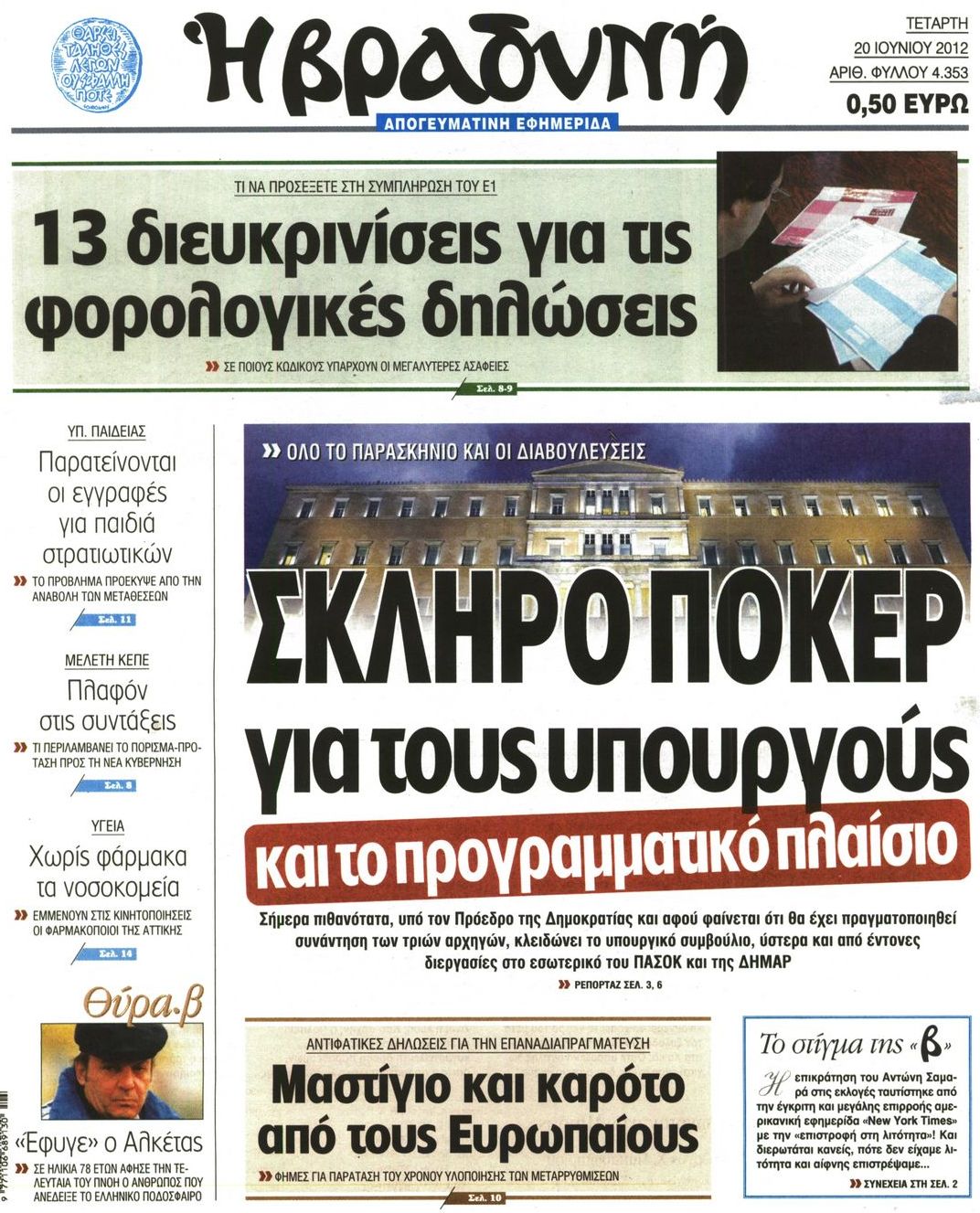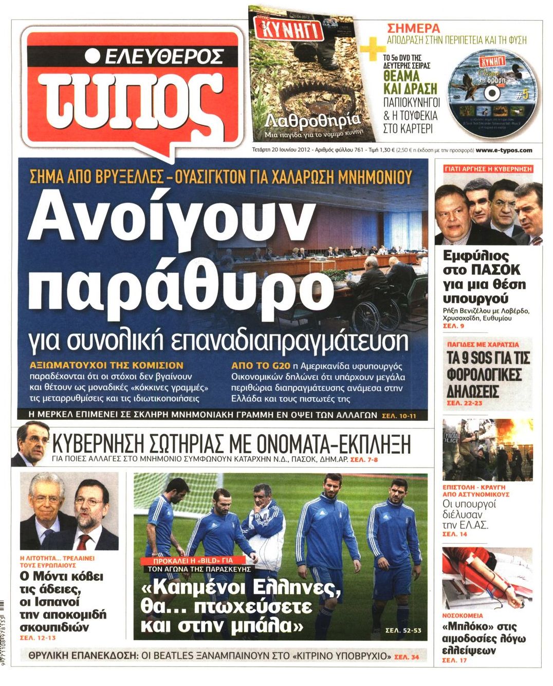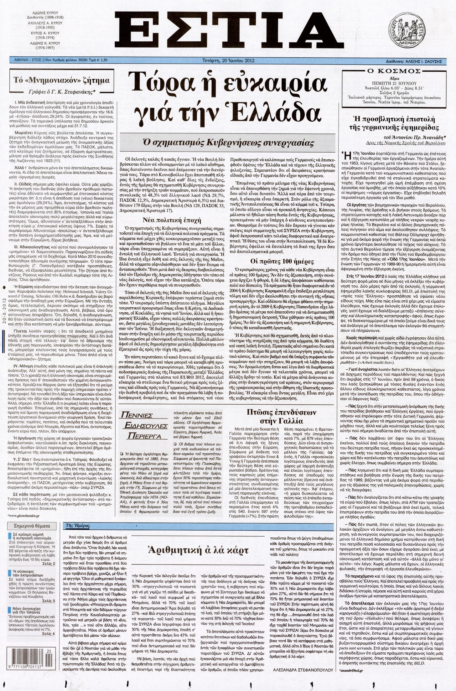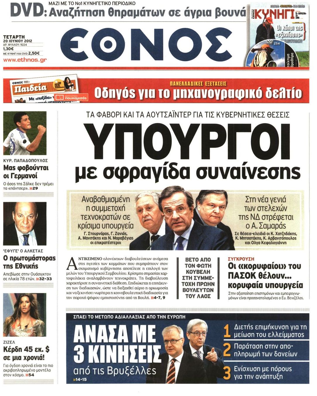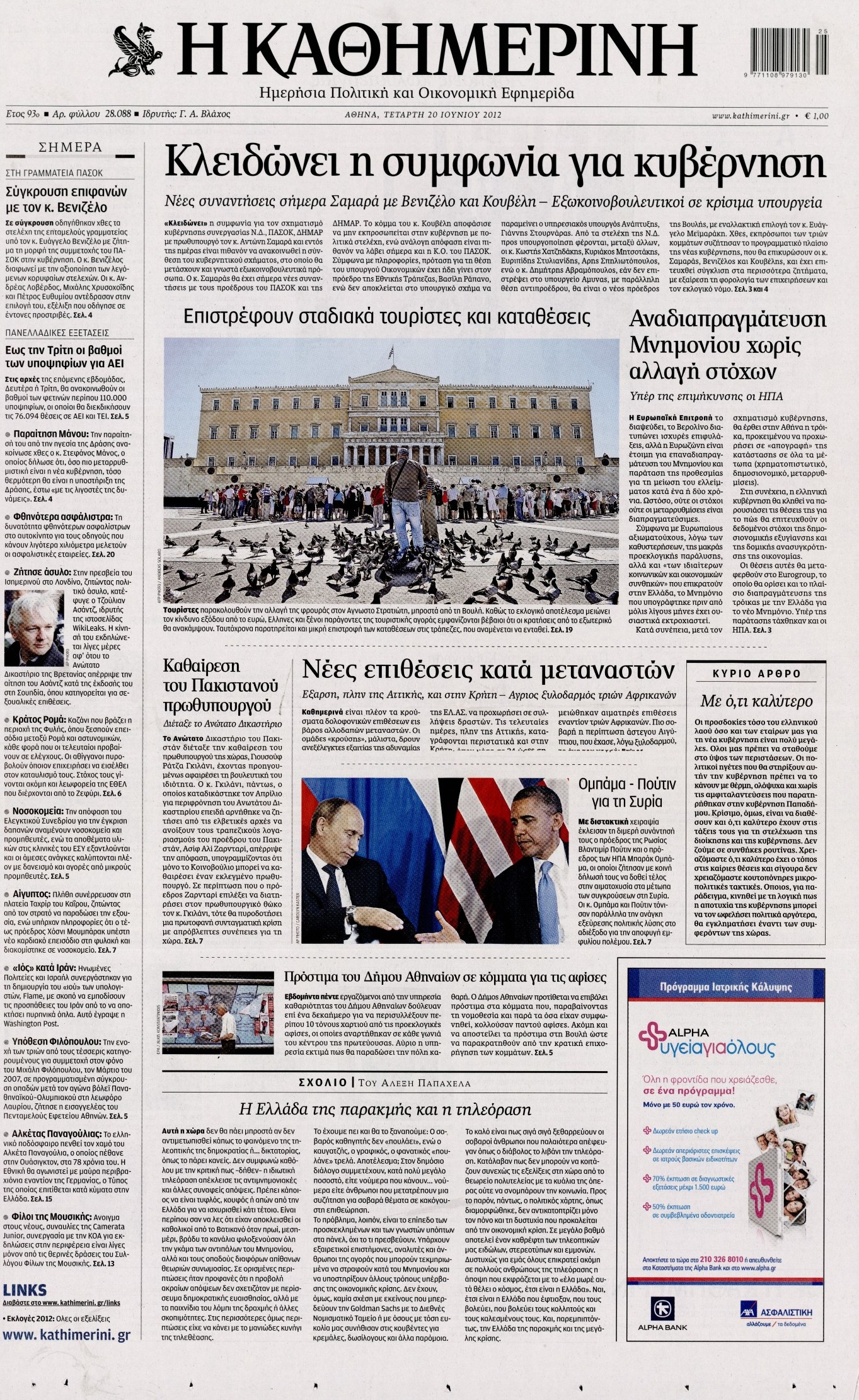 Τα πρωτοσέλιδα των εφημερίδων Enikos Newsroom 07:26, Τετάρτη 20 Ιουνίου 2012 Media ΕΦΗΜΕΡΙΔΕΣ ΠΡΩΤΟΣΕΛΙΔΑ Μοιράσου το: σχολίασε κι εσύ (0 σχόλια) Ακολουθήστε το enikos.gr στο Google News και μάθετε πρώτοι όλες τις ειδήσεις Δείτε όλες τις τελευταίες ειδήσεις από την Ελλάδα και τον Κόσμο στο enikos.gr Ειδήσεις Ροή Ειδήσεων 2 ώρες πριν Δημοσκόπηση Metron Analysis: Στις 10 μονάδες η διαφορά ΝΔ-ΠΑΣΟΚ, στην 3η θέση η Πλεύση Ελευθερίας – 8 στους 10 στηρίζουν τον αγώνα των αγροτών 6 ώρες πριν Αγρότες: «Όχι στον διάλογο, μας εμπαίζει η κυβέρνηση» – Αποφάσισαν κλιμάκωση των κινητοποιήσεων, τι θα γίνει τα Χριστούγεννα 1 ώρα πριν Νίκος Παππάς στον ΑΝΤ1: «Δεν κρύβομαι – Μετά το συμβάν ακολούθησα κανονικά το πρόγραμμά μου» – ΒΙΝΤΕΟ 3 ώρες πριν Αθήνα: Εξαρθρώθηκε εγκληματική οργάνωση που διακινούσε ναρκωτικά σε μορφή σοκολάτας – Δύο τράπερ ανάμεσα στους 4 συλληφθέντες – ΒΙΝΤΕΟ 1 ώρα πριν Διαμαντής Καραναστάσης: Οδηγούσε υπό την επήρεια αλκοόλ – Του αφαιρέθηκε το δίπλωμα και του επιβλήθηκε πρόστιμο 350 ευρώ 2 ώρες πριν Manifesting: Πώς να συναντήσετε τον σύντροφο της ζωής σας, ανάλογα με τον μήνα γέννησής σας 4 ώρες πριν Γάμος: 11 ψυχρές αλλά ευγενικές φράσεις, που λέει ένας άνδρας όταν σκέφτεται τον χωρισμό 3 ώρες πριν Σφουγγάρισμα: Η συνήθεια που θα σας βοηθήσει να διατηρήσετε το σπίτι σας καθαρό και τακτοποιημένο 2 ημέρες πριν 20 χρόνια τα Χριστούγεννα ξεκινούν στα Public με μεγάλη ποικιλία σε δώρα! 2 λεπτά πριν Φοινικούντα: Το Σάββατο απολογείται ο 30χρονος γιος γνωστού επιχειρηματία της Πλάκας που παραδόθηκε – Όσα είπε στους αστυνομικούς και ο ρόλος του στο έγκλημα 11 λεπτά πριν Αυξάνουν την πίεση προς την κυβέρνηση οι αγρότες: Κλείνουν παρακαμπτήριους και ανοίγουν διόδια – Τι θα γίνει τις γιορτές 16 λεπτά πριν Ελισάβετ Κωνσταντινίδου για τον Γεράσιμο Μιχελή και την Πόπη Χριστοδούλου: «Ξέρω ότι έχουν πάει απλώς κάπου αλλού, ότι δεν είναι ο θάνατος έτσι όπως τον έχουμε στο μυαλό μας» 21 λεπτά πριν Κρήτη: Νέες αποκαλύψεις για τον 54χρονο που κατηγορείται ότι εξαπάτησε τους γονείς του 33χρονου – Ζητούσε τρίχες αγνοουμένων 28 λεπτά πριν Τσιάρας: Δεν θα κινδυνέψουν οι πληρωμές των αγροτών – Χρειαζόμαστε μια νέα πολιτική, ένα restart ENIKOS NETWORK Σε περίοδο αυξημένης δραστηριότητας η γρίπη στην Ελλάδα-Μέτρα προστασίας από τον ΕΟΔΥ Σκέφτεστε συνέχεια συζητήσεις που έχετε κάνει; Τι σημαίνει αυτό, σύμφωνα με ειδικό Λαγκάρντ: Αισιόδοξη για την ανάπτυξη της Ευρωζώνης, αβέβαιη για τον πληθωρισμό ΑΣΕΠ 2ΓΒ/2025: Σήμερα αρχίζει η υποβολή ενστάσεων – Πότε θα βγουν τα οριστικά αποτελέσματα Χαρτογραφώντας το «σημείο χωρίς επιστροφή»: Για πρώτη φορά αποκαλύπτεται με λεπτομέρεια το ακανθώδες όριο της ατμόσφαιρας τ... Η Google καταργεί τη λειτουργία «dark web report» – Πώς θα μπορούν οι χρήστες να διαγράφουν τα δεδομένα τους περισσότερα 17:45 , Πέμπτη 18 Δεκεμβρίου 2025 ROUK ZOUK: Εορταστικό επεισόδιο με καλεσμένους τους πρωταγωνιστές του «Γιατί ρε πατέρα» Το Σάββατο 20 Δεκεμβρίου στις 21:00, η Ζέτα Μακρυπούλια υποδέχεται εκλεκτούς ηθοποιούς που όλο... 17:20 , Πέμπτη 18 Δεκεμβρίου 2025 Άγιος έρωτας: Η Χριστίνα εξομολογείται στον πατέρα Νικόλαο, απόψε στις 21:00 στον Alpha Η Νότα αποφασίζει να εκδικηθεί τον Πέτρο και τον Στέφανο, για χάρη του Λούη, όμως τα πράγματα ... 16:50 , Πέμπτη 18 Δεκεμβρίου 2025 Να μ’ αγαπάς: Ζωή και Φωτεινή συμφιλιώνονται ως μάνα με κόρη, απόψε στις 20:00 Η ταυτότητα του Άγγελου αποκαλύπτεται στο νέο επεισόδιο της σειράς “Να μ’ αγαπάς... 15:52 , Πέμπτη 18 Δ