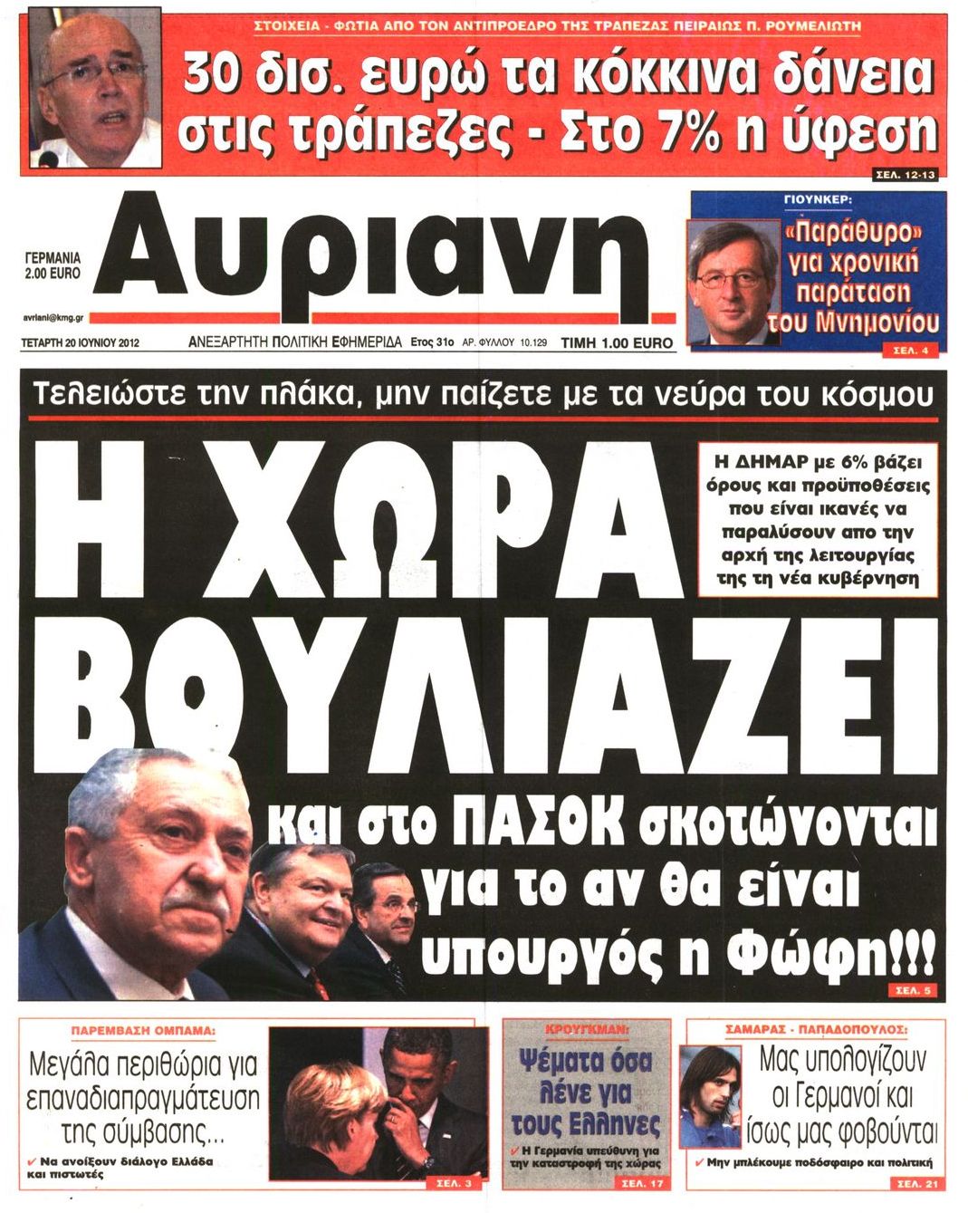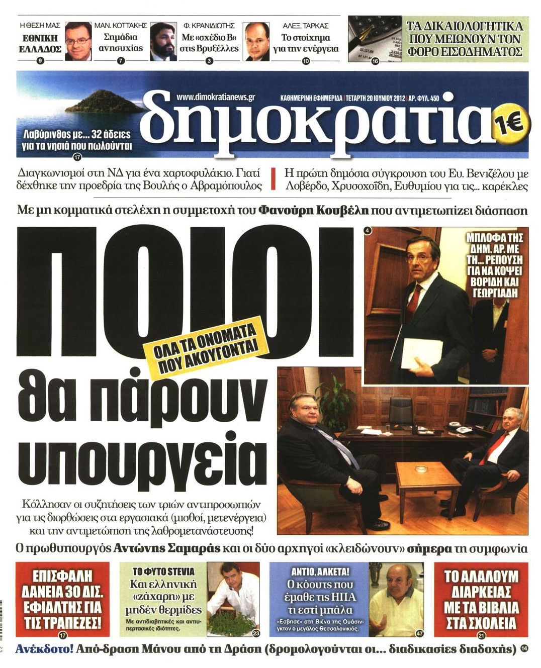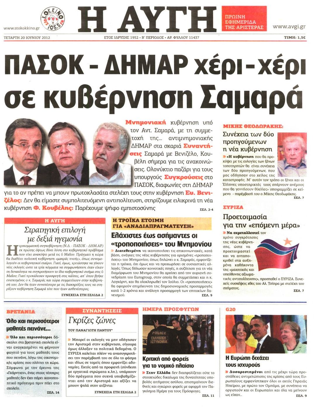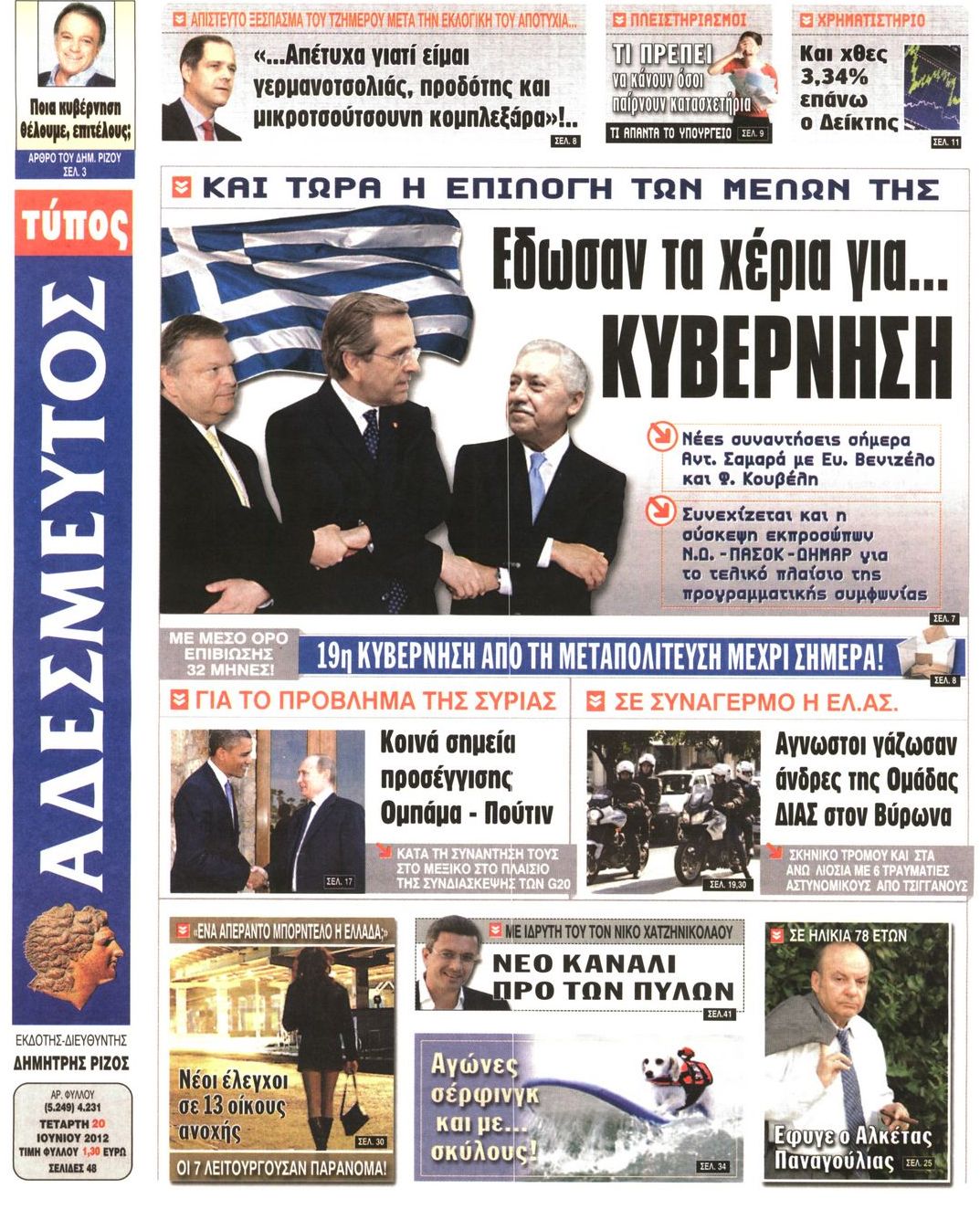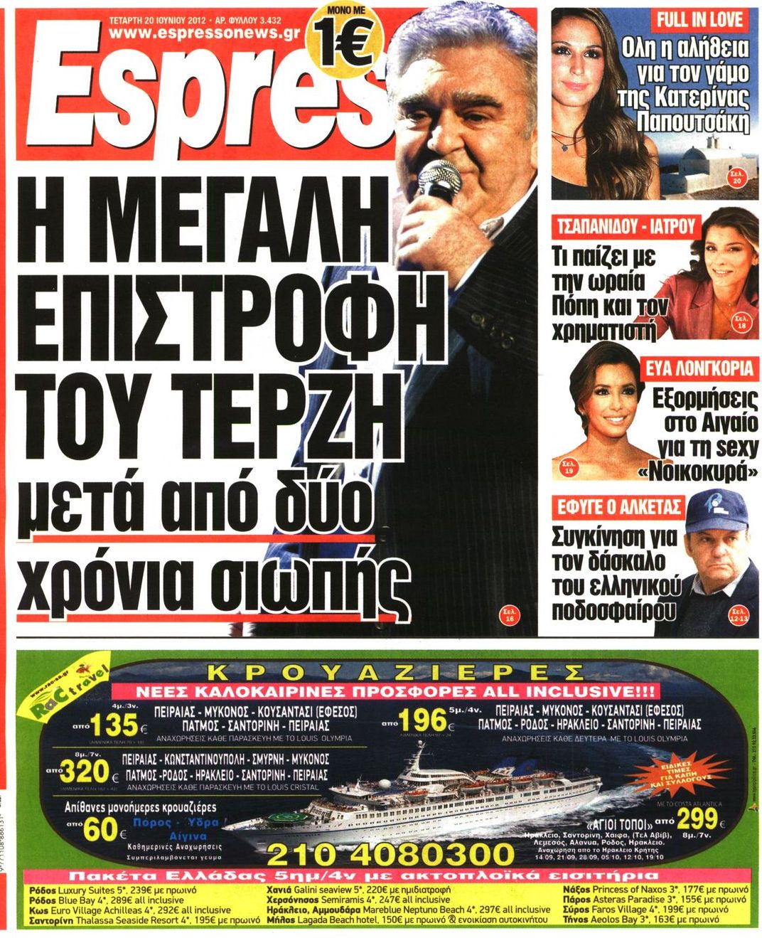 Τα πρωτοσέλιδα των εφημερίδων Enikos Newsroom 07:26, Τετάρτη 20 Ιουνίου 2012 Media ΕΦΗΜΕΡΙΔΕΣ ΠΡΩΤΟΣΕΛΙΔΑ Μοιράσου το: σχολίασε κι εσύ (0 σχόλια) Ακολουθήστε το enikos.gr στο Google News και μάθετε πρώτοι όλες τις ειδήσεις Δείτε όλες τις τελευταίες ειδήσεις από την Ελλάδα και τον Κόσμο στο enikos.gr Ειδήσεις Ροή Ειδήσεων 2 ώρες πριν Δημοσκόπηση Metron Analysis: Στις 10 μονάδες η διαφορά ΝΔ-ΠΑΣΟΚ, στην 3η θέση η Πλεύση Ελευθερίας – 8 στους 10 στηρίζουν τον αγώνα των αγροτών 6 ώρες πριν Αγρότες: «Όχι στον διάλογο, μας εμπαίζει η κυβέρνηση» – Αποφάσισαν κλιμάκωση των κινητοποιήσεων, τι θα γίνει τα Χριστούγεννα 1 ώρα πριν Νίκος Παππάς στον ΑΝΤ1: «Δεν κρύβομαι – Μετά το συμβάν ακολούθησα κανονικά το πρόγραμμά μου» – ΒΙΝΤΕΟ 3 ώρες πριν Αθήνα: Εξαρθρώθηκε εγκληματική οργάνωση που διακινούσε ναρκωτικά σε μορφή σοκολάτας – Δύο τράπερ ανάμεσα στους 4 συλληφθέντες – ΒΙΝΤΕΟ 1 ώρα πριν Διαμαντής Καραναστάσης: Οδηγούσε υπό την επήρεια αλκοόλ – Του αφαιρέθηκε το δίπλωμα και του επιβλήθηκε πρόστιμο 350 ευρώ 2 ώρες πριν Manifesting: Πώς να συναντήσετε τον σύντροφο της ζωής σας, ανάλογα με τον μήνα γέννησής σας 4 ώρες πριν Γάμος: 11 ψυχρές αλλά ευγενικές φράσεις, που λέει ένας άνδρας όταν σκέφτεται τον χωρισμό 3 ώρες πριν Σφουγγάρισμα: Η συνήθεια που θα σας βοηθήσει να διατηρήσετε το σπίτι σας καθαρό και τακτοποιημένο 2 ημέρες πριν 20 χρόνια τα Χριστούγεννα ξεκινούν στα Public με μεγάλη ποικιλία σε δώρα! 2 λεπτά πριν Φοινικούντα: Το Σάββατο απολογείται ο 30χρονος γιος γνωστού επιχειρηματία της Πλάκας που παραδόθηκε – Όσα είπε στους αστυνομικούς και ο ρόλος του στο έγκλημα 11 λεπτά πριν Αυξάνουν την πίεση προς την κυβέρνηση οι αγρότες: Κλείνουν παρακαμπτήριους και ανοίγουν διόδια – Τι θα γίνει τις γιορτές 16 λεπτά πριν Ελισάβετ Κωνσταντινίδου για τον Γεράσιμο Μιχελή και την Πόπη Χριστοδούλου: «Ξέρω ότι έχουν πάει απλώς κάπου αλλού, ότι δεν είναι ο θάνατος έτσι όπως τον έχουμε στο μυαλό μας» 21 λεπτά πριν Κρήτη: Νέες αποκαλύψεις για τον 54χρονο που κατηγορείται ότι εξαπάτησε τους γονείς του 33χρονου – Ζητούσε τρίχες αγνοουμένων 28 λεπτά πριν Τσιάρας: Δεν θα κινδυνέψουν οι πληρωμές των αγροτών – Χρειαζόμαστε μια νέα πολιτική, ένα restart ENIKOS NETWORK Σε περίοδο αυξημένης δραστηριότητας η γρίπη στην Ελλάδα-Μέτρα προστασίας από τον ΕΟΔΥ Σκέφτεστε συνέχεια συζητήσεις που έχετε κάνει; Τι σημαίνει αυτό, σύμφωνα με ειδικό Λαγκάρντ: Αισιόδοξη για την ανάπτυξη της Ευρωζώνης, αβέβαιη για τον πληθωρισμό ΑΣΕΠ 2ΓΒ/2025: Σήμερα αρχίζει η υποβολή ενστάσεων – Πότε θα βγουν τα οριστικά αποτελέσματα Χαρτογραφώντας το «σημείο χωρίς επιστροφή»: Για πρώτη φορά αποκαλύπτεται με λεπτομέρεια το ακανθώδες όριο της ατμόσφαιρας τ... Η Google καταργεί τη λειτουργία «dark web report» – Πώς θα μπορούν οι χρήστες να διαγράφουν τα δεδομένα τους περισσότερα 17:45 , Πέμπτη 18 Δεκεμβρίου 2025 ROUK ZOUK: Εορταστικό επεισόδιο με καλεσμένους τους πρωταγωνιστές του «Γιατί ρε πατέρα» Το Σάββατο 20 Δεκεμβρίου στις 21:00, η Ζέτα Μακρυπούλια υποδέχεται εκλεκτούς ηθοποιούς που όλο... 17:20 , Πέμπτη 18 Δεκεμβρίου 2025 Άγιος έρωτας: Η Χριστίνα εξομολογείται στον πατέρα Νικόλαο, απόψε στις 21:00 στον Alpha Η Νότα αποφασίζει να εκδικηθεί τον Πέτρο και τον Στέφανο, για χάρη του Λούη, όμως τα πράγματα ... 16:50 , Πέμπτη 18 Δεκεμβρίου 2025 Να μ’ αγαπάς: Ζωή και Φωτεινή συμφιλιώνονται ως μάνα με κόρη, απόψε στις 20:00 Η ταυτότητα του Άγγελου αποκαλύπτεται στο νέο επεισόδιο της σειράς “Να μ’ αγαπάς... 15:52 , Πέμπτη 18 Δ
