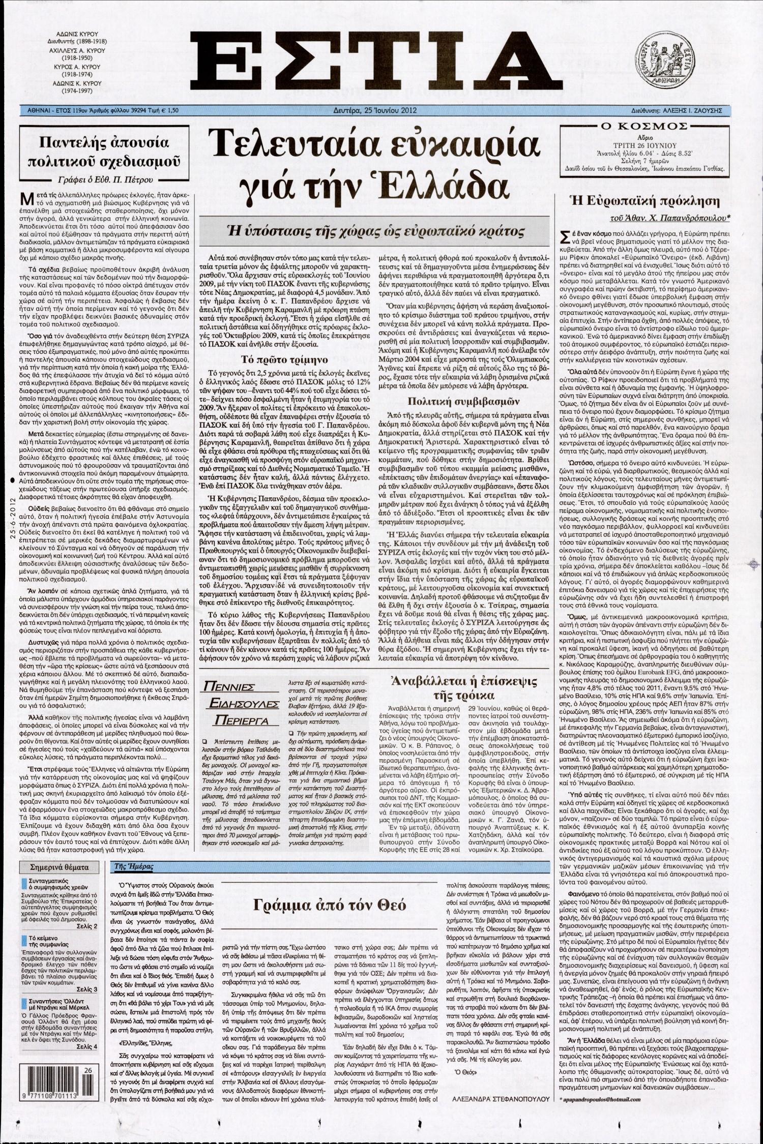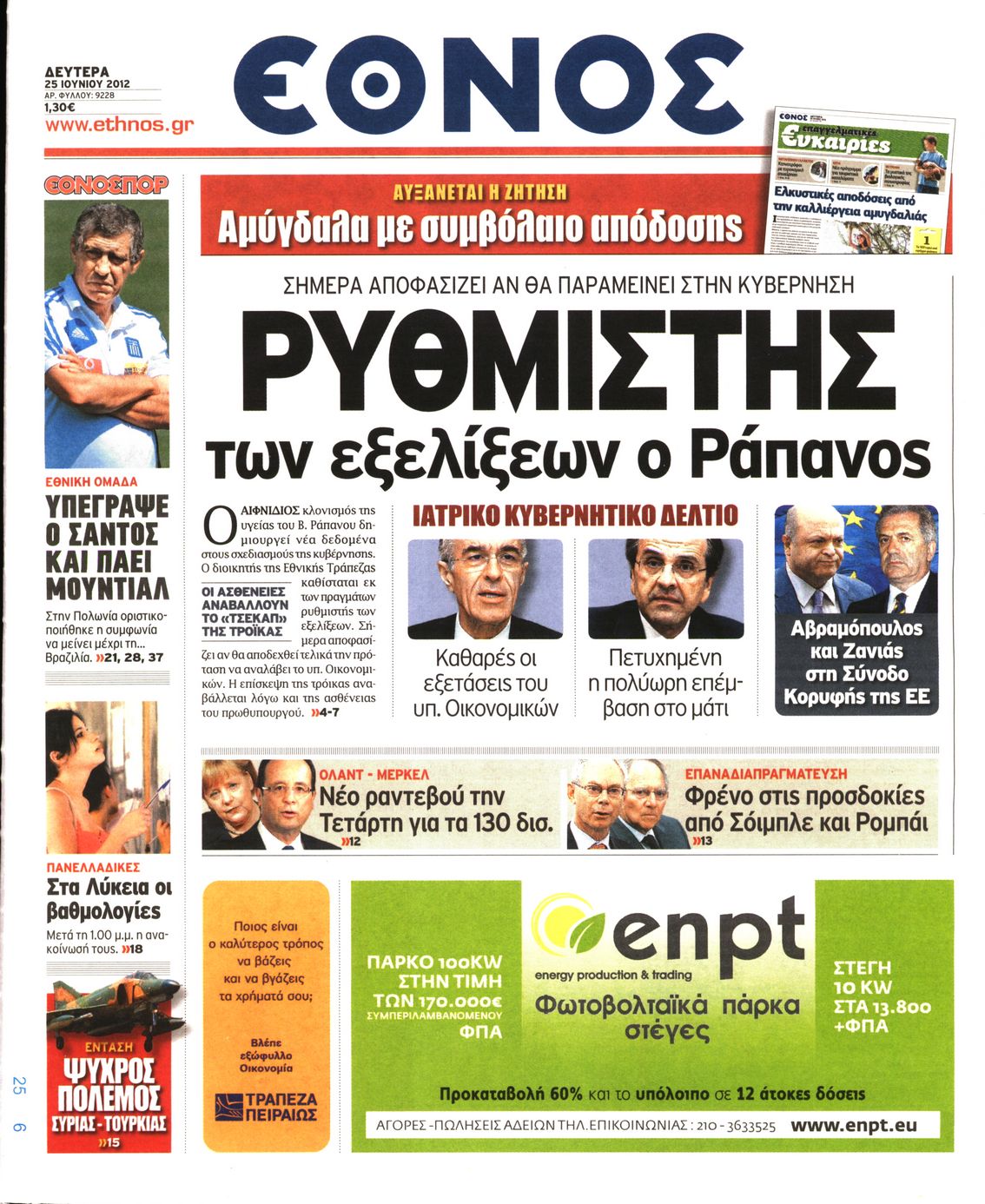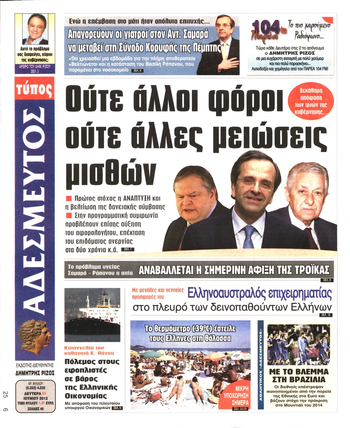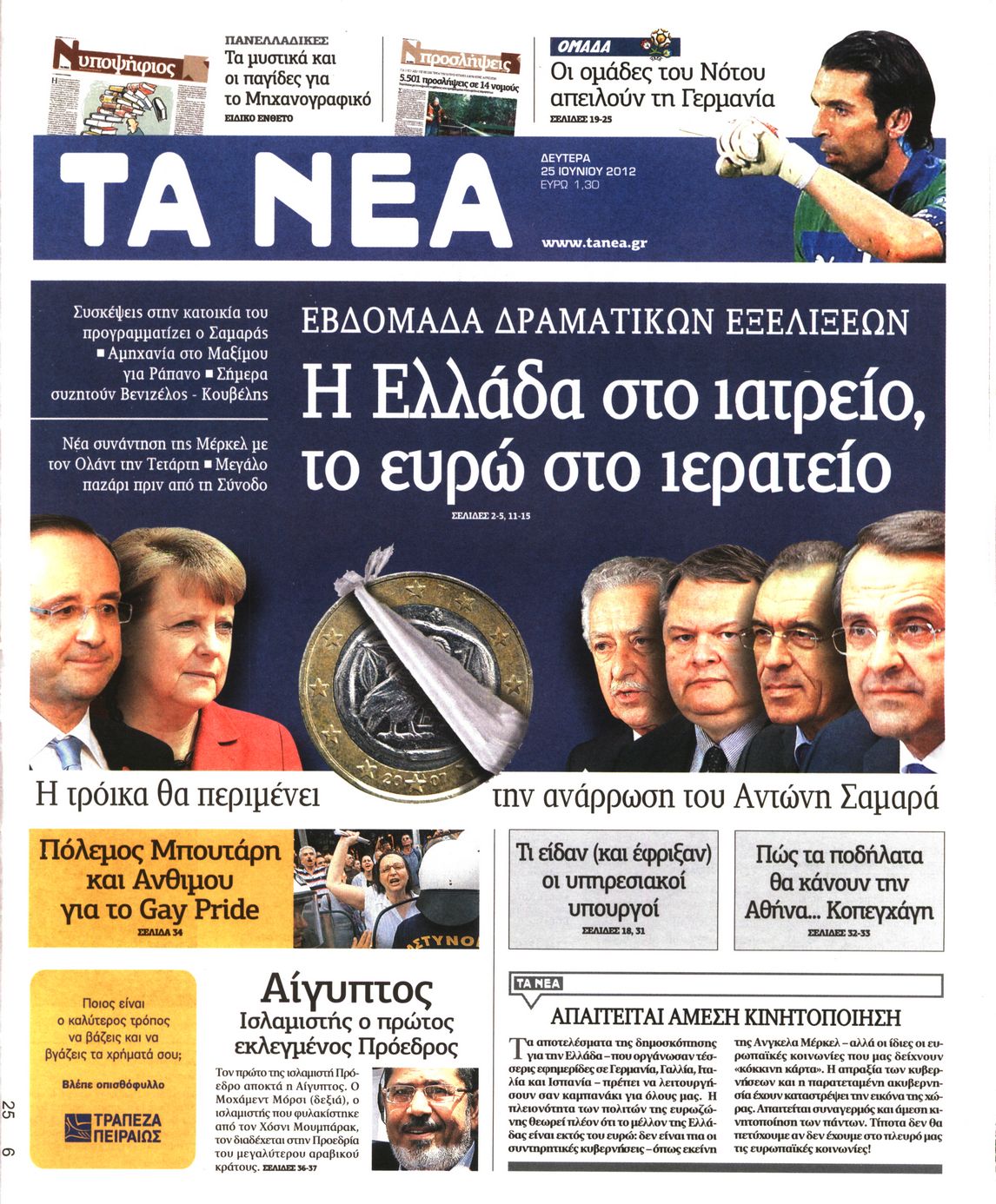 Τα πρωτοσέλιδα των εφημερίδων Enikos Newsroom 07:35, Δευτέρα 25 Ιουνίου 2012 Media ΕΦΗΜΕΡΙΔΕΣ ΠΡΩΤΟΣΕΛΙΔΑ Μοιράσου το: σχολίασε κι εσύ (0 σχόλια) Ακολουθήστε το enikos.gr στο Google News και μάθετε πρώτοι όλες τις ειδήσεις Δείτε όλες τις τελευταίες ειδήσεις από την Ελλάδα και τον Κόσμο στο enikos.gr Ειδήσεις Ροή Ειδήσεων 3 ώρες πριν Εκτός ευρωομάδας ΣΥΡΙΖΑ ο Νίκος Παππάς μετά την επίθεση στον δημοσιογράφο Νίκο Γιαννόπουλο – Η μήνυση και οι νέες δηλώσεις 3 ώρες πριν «Αγριεύουν» οι αγρότες: «Δεν συντρέχει λόγος συνάντησης με τον πρωθυπουργό» – Ώρα αποφάσεων στη σύσκεψη της Πέμπτης 3 ώρες πριν Κυψέλη: Χωρίς την οικογένειά της δίπλα της απολογήθηκε η 16χρονη – «Της είχε επιτεθεί κάποιος για να την βιάσει, φοβήθηκε και κυκλοφορούσε με μαχαίρι» 3 ώρες πριν Politico: Το πρόβλημα της Ευρώπης δεν είναι το Βέλγιο αλλά ο Ντόναλντ Τραμπ 5 ώρες πριν Αλεξανδρούπολη: Πολυοργανική ανεπάρκεια λόγω υποσιτισμού η αιτία θανάτου του 3χρονου αγοριού 3 ώρες πριν Μυστήριο με τεράστιες κυκλικές πέτρες 200 κιλών – Ανακαλύφθηκαν τυχαία κατά τη διάρκεια οδικών έργων και κανείς δεν ξέρει από πού προέρχονται 4 ώρες πριν Ύπνος: Ειδικός εξηγεί τον πραγματικό λόγο που ξυπνάτε στις 4 τα ξημερώματα – Ο ρόλος των ορμονών και του κιρκάδιου ρυθμού 5 ώρες πριν Αριθμολογία: Οι άνθρωποι που έχουν γεννηθεί αυτές τις 4 ημερομηνίες, είναι τρυφεροί και αγαπούν ανιδιοτελώς 17 ώρες πριν 20 χρόνια τα Χριστούγεννα ξεκινούν στα Public με μεγάλη ποικιλία σε δώρα! 7 λεπτά πριν Βρυξέλλες: Νυχτερινό… μπλόκο αγροτών μπροστά από το κτίριο της Ευρωπαϊκής Επιτροπής – Πάνω από 100 τρακτέρ απέκλεισαν την λεωφόρο 22 λεπτά πριν Euroleague: Απρόσμενη ήττα για την Μονακό του Βασίλη Σπανούλη – Η βαθμολογία μετά το τέλος της 16ης αγωνιστικής 37 λεπτά πριν Μουντιάλ 2026: Η νέα ταξιδιωτική απαγόρευση του Ντόναλντ Τραμπ πλήττει (και) τους οπαδούς Σενεγάλης – Ακτής Ελεφαντοστού 49 λεπτά πριν Κυριάκος Μητσοτάκης: Στις Βρυξέλλες για την Σύνοδο Κορυφής ΕΕ και Δυτικών Βαλκανίων – Δείτε φωτογραφίες 1 ώρα πριν Σάρα Εσκενάζυ: Η πρώτη ανάρτηση για το θάνατο του πατέρα της, Αλμπέρτο Εσκενάζυ και η επιθυμία της οικογένειας ENIKOS NETWORK Αϋπνία: Το κόλπο που θα σας βοηθήσει να κοιμηθείτε απόψε – Είναι απλό και έχει αποτέλεσμα 2,6 εκατομμύρια πολίτες έχουν ήδη εμβολιαστεί κατά της γρίπης ΕΛΣΤΑΤ: Τι δείχνουν τα νέα στοιχεία για τις ηλεκτρονικές παραγγελίες των επιχειρήσεων ΚΕΠΕ: Οι 3 διακριτές συμβολές των ΜμΕ και της μεταποίησης στην ελληνική οικονομία Χαρτογραφώντας το «σημείο χωρίς επιστροφή»: Για πρώτη φορά αποκαλύπτεται με λεπτομέρεια το ακανθώδες όριο της ατμόσφαιρας τ... Η Google καταργεί τη λειτουργία «dark web report» – Πώς θα μπορούν οι χρήστες να διαγράφουν τα δεδομένα τους περισσότερα 22:24 , Τετάρτη 17 Δεκεμβρίου 2025 Το Σπίτι Δίπλα Στο Ποτάμι: Σε κίνδυνο η υγεία του Απόστολου – Τι θα δούμε απόψε “Το Σπίτι Δίπλα στο Ποτάμι” ξετυλίγει το νήμα της ζωής των πέντε αδελφών με καταισ... 21:14 , Τετάρτη 17 Δεκεμβρίου 2025 Παιχνίδια Εκδίκησης: Θα καταφέρει ο Χρήστος να κλονίσει την εμπιστοσύνη της Μάγιας απέναντι στον Άγη; Τα «Παιχνίδια Εκδίκησης» έρχονται απόψε στις 22:30, στον Αντ1, με το τελευταίο επεισόδιο της χ... 20:57 , Τετάρτη 17 Δεκεμβρίου 2025 Άγιος Έρωτας: Η Χλόη καταθέτει εναντίον του πατέρα της και ο Χάρης αποκαλύπτει στον Κλεάνθη ότι δεν είναι ο βιολογικός του πατέρας. Γεμάτο αποκαλύψεις είναι το νέο επεισόδιο της σειράς “Άγιος Έρωτας” απόψε στις 21:... 20:15 , Τετάρτη 17 Δεκεμβρίου 2025 Η α
