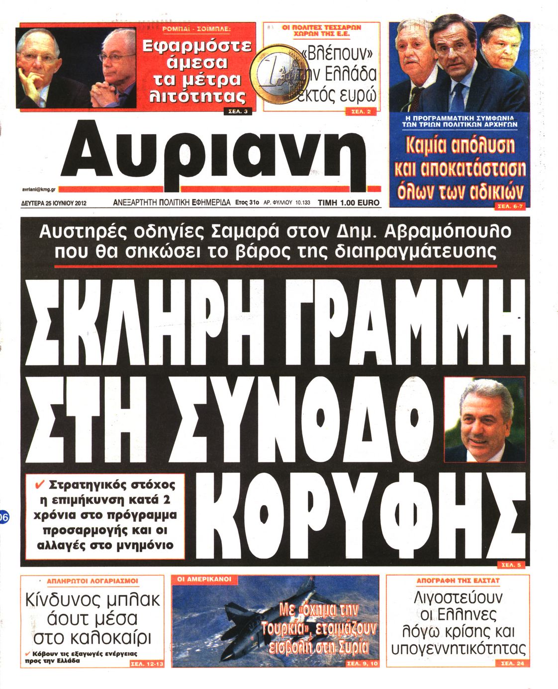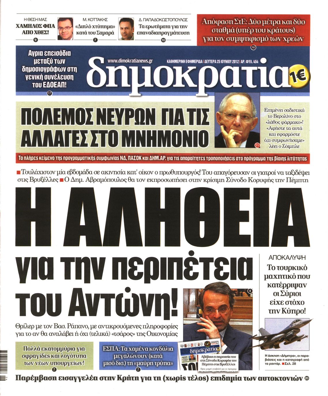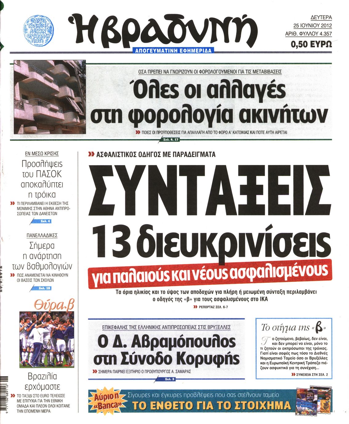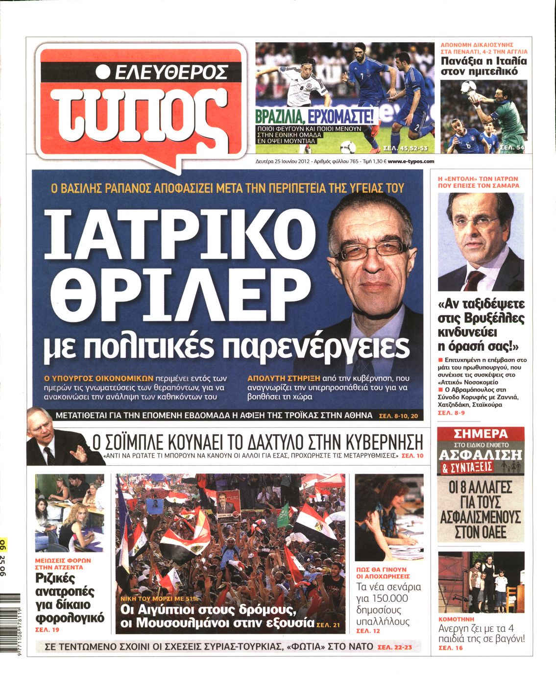 Τα πρωτοσέλιδα των εφημερίδων Enikos Newsroom 07:35, Δευτέρα 25 Ιουνίου 2012 Media ΕΦΗΜΕΡΙΔΕΣ ΠΡΩΤΟΣΕΛΙΔΑ Μοιράσου το: σχολίασε κι εσύ (0 σχόλια) Ακολουθήστε το enikos.gr στο Google News και μάθετε πρώτοι όλες τις ειδήσεις Δείτε όλες τις τελευταίες ειδήσεις από την Ελλάδα και τον Κόσμο στο enikos.gr Ειδήσεις Ροή Ειδήσεων 3 ώρες πριν Εκτός ευρωομάδας ΣΥΡΙΖΑ ο Νίκος Παππάς μετά την επίθεση στον δημοσιογράφο Νίκο Γιαννόπουλο – Η μήνυση και οι νέες δηλώσεις 3 ώρες πριν «Αγριεύουν» οι αγρότες: «Δεν συντρέχει λόγος συνάντησης με τον πρωθυπουργό» – Ώρα αποφάσεων στη σύσκεψη της Πέμπτης 3 ώρες πριν Κυψέλη: Χωρίς την οικογένειά της δίπλα της απολογήθηκε η 16χρονη – «Της είχε επιτεθεί κάποιος για να την βιάσει, φοβήθηκε και κυκλοφορούσε με μαχαίρι» 3 ώρες πριν Politico: Το πρόβλημα της Ευρώπης δεν είναι το Βέλγιο αλλά ο Ντόναλντ Τραμπ 5 ώρες πριν Αλεξανδρούπολη: Πολυοργανική ανεπάρκεια λόγω υποσιτισμού η αιτία θανάτου του 3χρονου αγοριού 3 ώρες πριν Μυστήριο με τεράστιες κυκλικές πέτρες 200 κιλών – Ανακαλύφθηκαν τυχαία κατά τη διάρκεια οδικών έργων και κανείς δεν ξέρει από πού προέρχονται 4 ώρες πριν Ύπνος: Ειδικός εξηγεί τον πραγματικό λόγο που ξυπνάτε στις 4 τα ξημερώματα – Ο ρόλος των ορμονών και του κιρκάδιου ρυθμού 5 ώρες πριν Αριθμολογία: Οι άνθρωποι που έχουν γεννηθεί αυτές τις 4 ημερομηνίες, είναι τρυφεροί και αγαπούν ανιδιοτελώς 17 ώρες πριν 20 χρόνια τα Χριστούγεννα ξεκινούν στα Public με μεγάλη ποικιλία σε δώρα! 7 λεπτά πριν Βρυξέλλες: Νυχτερινό… μπλόκο αγροτών μπροστά από το κτίριο της Ευρωπαϊκής Επιτροπής – Πάνω από 100 τρακτέρ απέκλεισαν την λεωφόρο 22 λεπτά πριν Euroleague: Απρόσμενη ήττα για την Μονακό του Βασίλη Σπανούλη – Η βαθμολογία μετά το τέλος της 16ης αγωνιστικής 37 λεπτά πριν Μουντιάλ 2026: Η νέα ταξιδιωτική απαγόρευση του Ντόναλντ Τραμπ πλήττει (και) τους οπαδούς Σενεγάλης – Ακτής Ελεφαντοστού 49 λεπτά πριν Κυριάκος Μητσοτάκης: Στις Βρυξέλλες για την Σύνοδο Κορυφής ΕΕ και Δυτικών Βαλκανίων – Δείτε φωτογραφίες 1 ώρα πριν Σάρα Εσκενάζυ: Η πρώτη ανάρτηση για το θάνατο του πατέρα της, Αλμπέρτο Εσκενάζυ και η επιθυμία της οικογένειας ENIKOS NETWORK Αϋπνία: Το κόλπο που θα σας βοηθήσει να κοιμηθείτε απόψε – Είναι απλό και έχει αποτέλεσμα 2,6 εκατομμύρια πολίτες έχουν ήδη εμβολιαστεί κατά της γρίπης ΕΛΣΤΑΤ: Τι δείχνουν τα νέα στοιχεία για τις ηλεκτρονικές παραγγελίες των επιχειρήσεων ΚΕΠΕ: Οι 3 διακριτές συμβολές των ΜμΕ και της μεταποίησης στην ελληνική οικονομία Χαρτογραφώντας το «σημείο χωρίς επιστροφή»: Για πρώτη φορά αποκαλύπτεται με λεπτομέρεια το ακανθώδες όριο της ατμόσφαιρας τ... Η Google καταργεί τη λειτουργία «dark web report» – Πώς θα μπορούν οι χρήστες να διαγράφουν τα δεδομένα τους περισσότερα 22:24 , Τετάρτη 17 Δεκεμβρίου 2025 Το Σπίτι Δίπλα Στο Ποτάμι: Σε κίνδυνο η υγεία του Απόστολου – Τι θα δούμε απόψε “Το Σπίτι Δίπλα στο Ποτάμι” ξετυλίγει το νήμα της ζωής των πέντε αδελφών με καταισ... 21:14 , Τετάρτη 17 Δεκεμβρίου 2025 Παιχνίδια Εκδίκησης: Θα καταφέρει ο Χρήστος να κλονίσει την εμπιστοσύνη της Μάγιας απέναντι στον Άγη; Τα «Παιχνίδια Εκδίκησης» έρχονται απόψε στις 22:30, στον Αντ1, με το τελευταίο επεισόδιο της χ... 20:57 , Τετάρτη 17 Δεκεμβρίου 2025 Άγιος Έρωτας: Η Χλόη καταθέτει εναντίον του πατέρα της και ο Χάρης αποκαλύπτει στον Κλεάνθη ότι δεν είναι ο βιολογικός του πατέρας. Γεμάτο αποκαλύψεις είναι το νέο επεισόδιο της σειράς “Άγιος Έρωτας” απόψε στις 21:... 20:15 , Τετάρτη 17 Δεκεμβρίου 2025 Η α