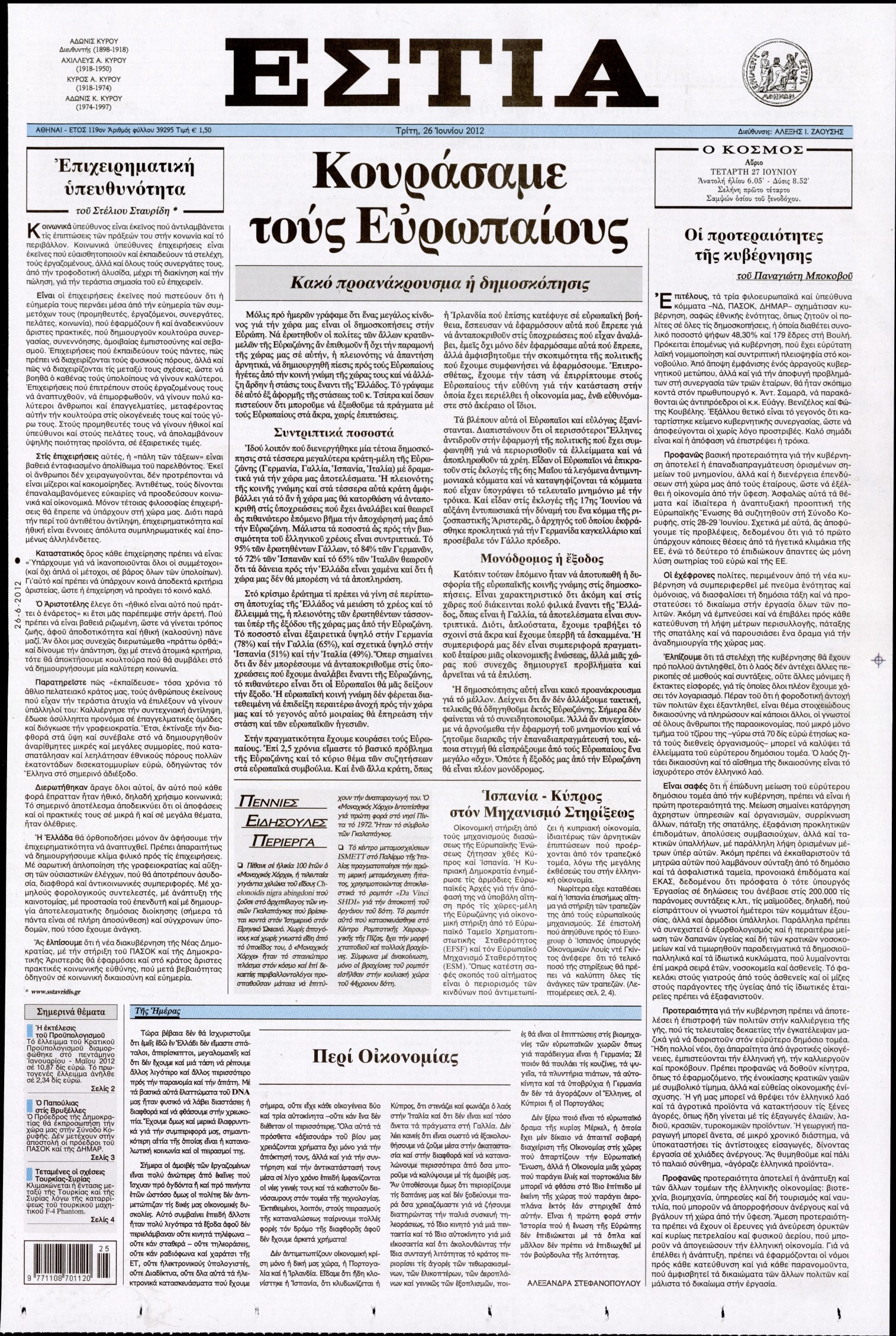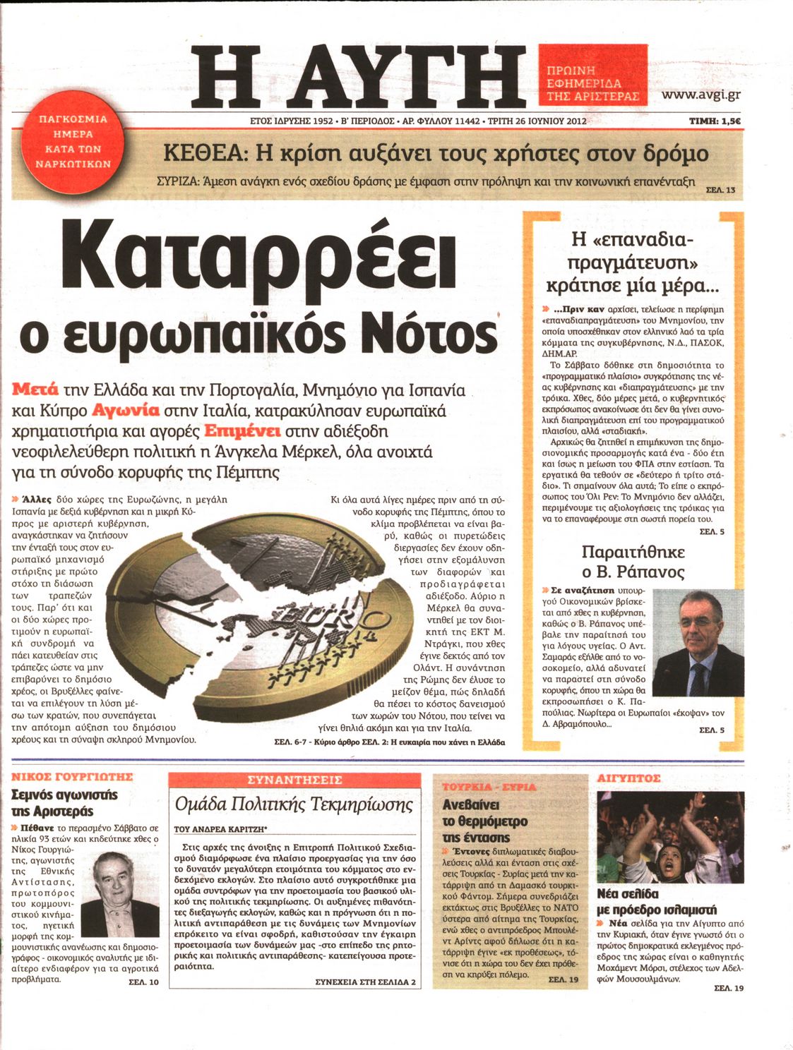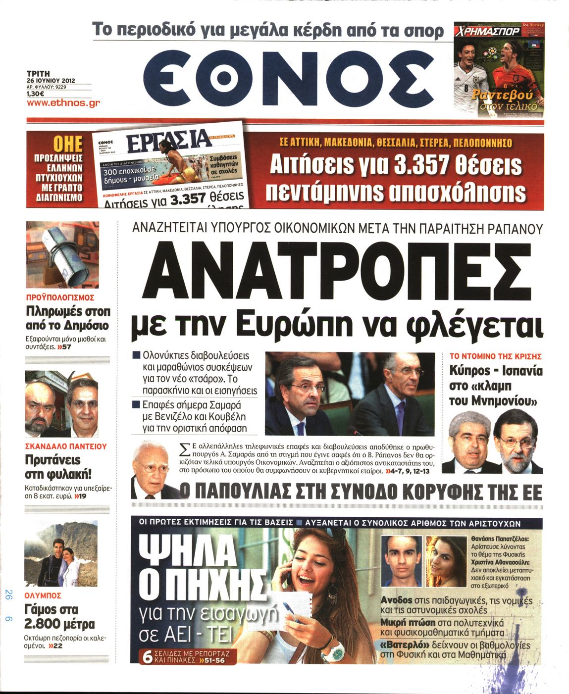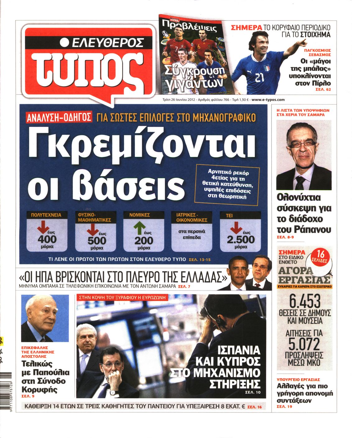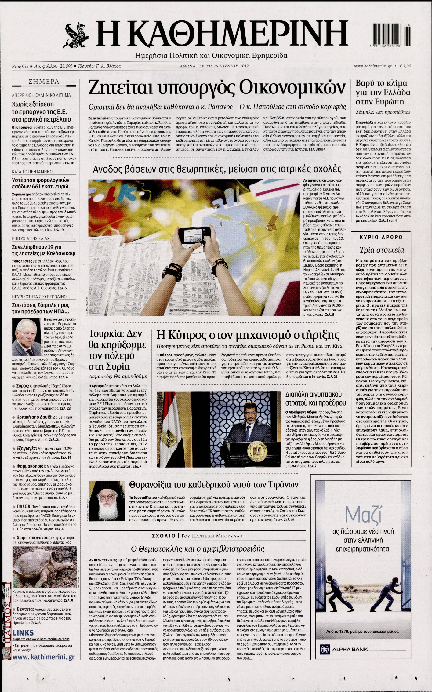 Τα πρωτοσέλιδα των εφημερίδων Enikos Newsroom 07:29, Τρίτη 26 Ιουνίου 2012 Media ΕΦΗΜΕΡΙΔΕΣ ΠΡΩΤΟΣΕΛΙΔΑ Μοιράσου το: σχολίασε κι εσύ (0 σχόλια) Ακολουθήστε το enikos.gr στο Google News και μάθετε πρώτοι όλες τις ειδήσεις Δείτε όλες τις τελευταίες ειδήσεις από την Ελλάδα και τον Κόσμο στο enikos.gr Ειδήσεις Ροή Ειδήσεων 5 ώρες πριν Εκτός ευρωομάδας ΣΥΡΙΖΑ ο Νίκος Παππάς μετά την επίθεση στον δημοσιογράφο Νίκο Γιαννόπουλο – Η μήνυση και οι νέες δηλώσεις 5 ώρες πριν «Αγριεύουν» οι αγρότες: «Δεν συντρέχει λόγος συνάντησης με τον πρωθυπουργό» – Ώρα αποφάσεων στη σύσκεψη της Πέμπτης 5 ώρες πριν Κυψέλη: Χωρίς την οικογένειά της δίπλα της απολογήθηκε η 16χρονη – «Της είχε επιτεθεί κάποιος για να την βιάσει, φοβήθηκε και κυκλοφορούσε με μαχαίρι» 5 ώρες πριν Politico: Το πρόβλημα της Ευρώπης δεν είναι το Βέλγιο αλλά ο Ντόναλντ Τραμπ 7 ώρες πριν Αλεξανδρούπολη: Πολυοργανική ανεπάρκεια λόγω υποσιτισμού η αιτία θανάτου του 3χρονου αγοριού 5 ώρες πριν Μυστήριο με τεράστιες κυκλικές πέτρες 200 κιλών – Ανακαλύφθηκαν τυχαία κατά τη διάρκεια οδικών έργων και κανείς δεν ξέρει από πού προέρχονται 6 ώρες πριν Ύπνος: Ειδικός εξηγεί τον πραγματικό λόγο που ξυπνάτε στις 4 τα ξημερώματα – Ο ρόλος των ορμονών και του κιρκάδιου ρυθμού 7 ώρες πριν Αριθμολογία: Οι άνθρωποι που έχουν γεννηθεί αυτές τις 4 ημερομηνίες, είναι τρυφεροί και αγαπούν ανιδιοτελώς 19 ώρες πριν 20 χρόνια τα Χριστούγεννα ξεκινούν στα Public με μεγάλη ποικιλία σε δώρα! 12 λεπτά πριν Αλ Τσαντίρι Νιουζ: «Λύγισε» ο Δημήτρης Λάλος για τον Δημήτρη Ήμελλο – «Τον μνημονεύω, να ‘ναι καλά εκεί που είναι» 27 λεπτά πριν GNTM: Με δάκρυα τον αποχαιρέτησε η Ηλιάνα Παπαγεωργίου πριν από τον ημιτελικό – «Αισθάνομαι πολύ παράξενα» 42 λεπτά πριν Αμερικανικά στρατεύματα στον Ισημερινό για «προσωρινή» επιχείρηση κατά των ναρκωτικών 58 λεπτά πριν Βραζιλία: Το Κογκρέσο ενέκρινε σχέδιο νόμου για τη μείωση της ποινής του πρώην προέδρου Μπολσονάρου 1 ώρα πριν Ένταση στο περιφερειακό συμβούλιο Δυτικής Μακεδονίας: Φωνές, σπρωξιές και διακοπή – Δείτε βίντεο ENIKOS NETWORK Αϋπνία: Το κόλπο που θα σας βοηθήσει να κοιμηθείτε απόψε – Είναι απλό και έχει αποτέλεσμα 2,6 εκατομμύρια πολίτες έχουν ήδη εμβολιαστεί κατά της γρίπης ΕΛΣΤΑΤ: Τι δείχνουν τα νέα στοιχεία για τις ηλεκτρονικές παραγγελίες των επιχειρήσεων ΚΕΠΕ: Οι 3 διακριτές συμβολές των ΜμΕ και της μεταποίησης στην ελληνική οικονομία Χαρτογραφώντας το «σημείο χωρίς επιστροφή»: Για πρώτη φορά αποκαλύπτεται με λεπτομέρεια το ακανθώδες όριο της ατμόσφαιρας τ... Η Google καταργεί τη λειτουργία «dark web report» – Πώς θα μπορούν οι χρήστες να διαγράφουν τα δεδομένα τους περισσότερα 02:30 , Πέμπτη 18 Δεκεμβρίου 2025 Αλ Τσαντίρι Νιουζ: Η κόρη της Πάολα στο κοινό – Η ατάκα Λαζόπουλου που την έκανε να «κοκκινήσει» Γιορτινή διάθεση και ευχάριστες στιγμές γέμισε η αποψινή, τελευταία για το 2025, εκπομπή του «... 22:24 , Τετάρτη 17 Δεκεμβρίου 2025 Το Σπίτι Δίπλα Στο Ποτάμι: Σε κίνδυνο η υγεία του Απόστολου – Τι θα δούμε απόψε “Το Σπίτι Δίπλα στο Ποτάμι” ξετυλίγει το νήμα της ζωής των πέντε αδελφών με καταισ... 21:14 , Τετάρτη 17 Δεκεμβρίου 2025 Παιχνίδια Εκδίκησης: Θα καταφέρει ο Χρήστος να κλονίσει την εμπιστοσύνη της Μάγιας απέναντι στον Άγη; Τα «Παιχνίδια Εκδίκησης» έρχονται απόψε στις 22:30, στον Αντ1, με το τελευταίο επεισόδιο της χ... 20:57 , Τετάρτη 17 Δεκεμβρίου 2025 Άγιος Έρωτας: Η Χλόη καταθέτει εναντίον του πατέρα της και ο Χάρης αποκαλύπτει στον Κλεάνθη ότι 