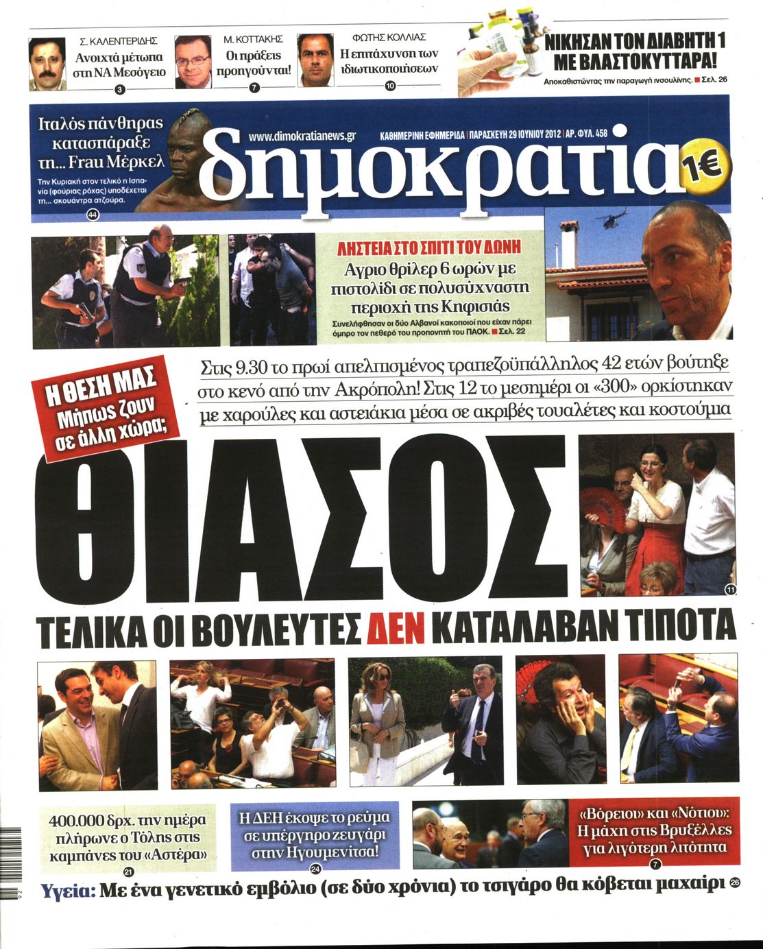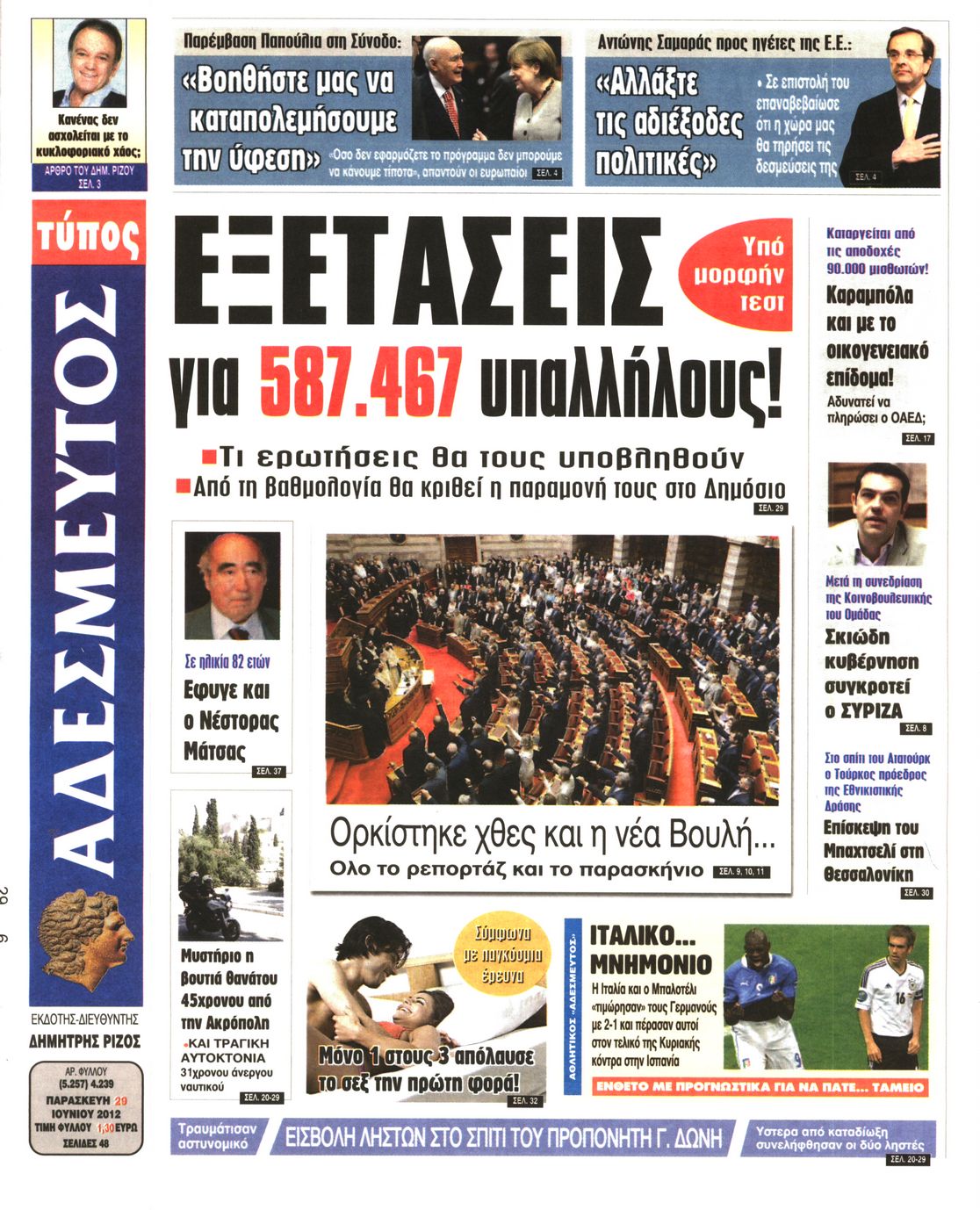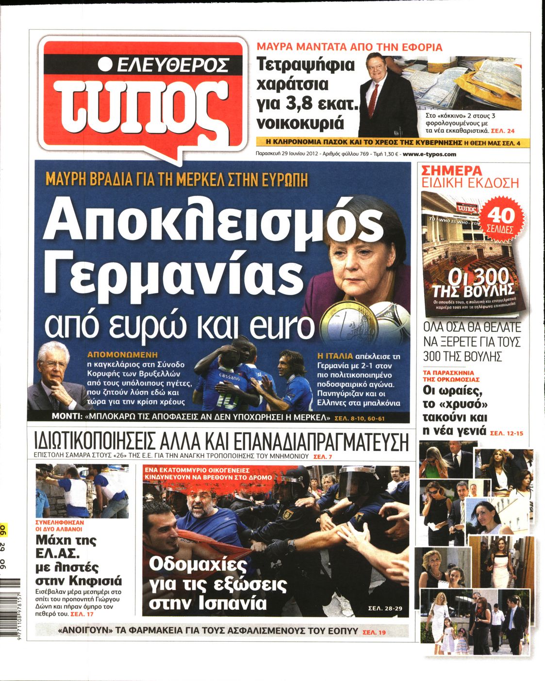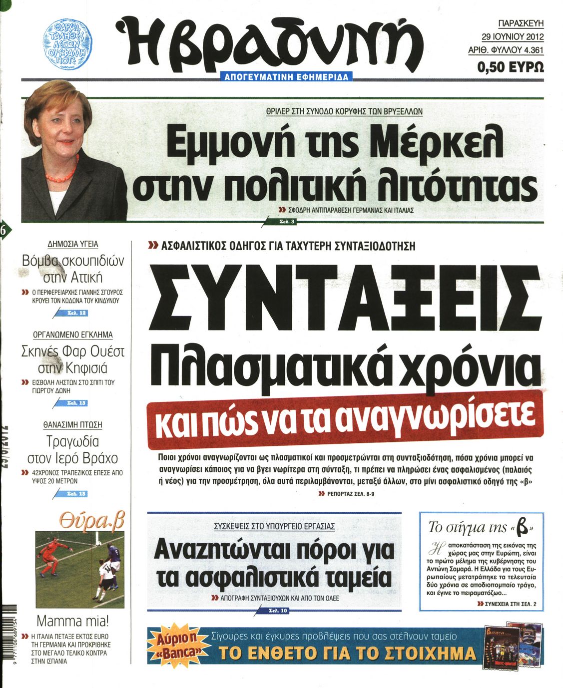 Τα πρωτοσέλιδα των εφημερίδων Enikos Newsroom 07:32, Παρασκευή 29 Ιουνίου 2012 Media ΕΦΗΜΕΡΙΔΕΣ ΠΡΩΤΟΣΕΛΙΔΑ Μοιράσου το: σχολίασε κι εσύ (0 σχόλια) Ακολουθήστε το enikos.gr στο Google News και μάθετε πρώτοι όλες τις ειδήσεις Δείτε όλες τις τελευταίες ειδήσεις από την Ελλάδα και τον Κόσμο στο enikos.gr Ειδήσεις Ροή Ειδήσεων 1 ώρα πριν Μητσοτάκης για αγρότες: Ελπίζω πως θα απομακρυνθούν σύντομα από τα μπλόκα 3 ώρες πριν Έρευνα MRB: Η πρόθεση ψήφου και τα σημαντικότερα προβλήματα – Οι «λέξεις» που εκφράζουν τους πολίτες 14 λεπτά πριν Αγρότες: Επ’ αόριστον μπλόκο στον σταθμό στον Προμαχώνα για τα φορτηγά – Κλείνει το ρεύμα εισόδου στα Μάλγαρα 20 λεπτά πριν Μισέλ Ομπάμα: Εμφανώς αδυνατισμένη στην εκπομπή του Τζίμι Κίμελ – Οι φήμες για τη χρήση Ozempic και η «φιλία» της με τον Ρομπ Ράινερ 3 ώρες πριν Αλαλούμ με τις πληρωμές στους αγρότες: Δεν καταβλήθηκε η Βασική Ενίσχυση, αλλά έγινε παρακράτηση της εισφοράς στον ΕΛΓΑ – Τι απαντά η κυβέρνηση 3 ώρες πριν Τα 4 ζώδια που ξαναβρίσκουν τον εαυτό τους – «Μπαίνετε επιτέλους στην ουσία των πραγμάτων» 4 ώρες πριν 20 χρόνια τα Χριστούγεννα ξεκινούν στα Public με μεγάλη ποικιλία σε δώρα! 2 ώρες πριν «Δεν είχα κλάψει από τότε που διαγνώστηκα με καρκίνο, ώσπου ένα τηλεφώνημα με έκανε να λυγίσω» – Η συγκλονιστική εξομολόγηση ενός άνδρα 1 ώρα πριν Τα 7 σπάνια χαρακτηριστικά που κάνουν κάποιους ανθρώπους ακαταμάχητους 3 λεπτά πριν Αγρίνιο: Στο νοσοκομείο 9χρονος που έλαβε φάρμακο σε challenge με συμμαθητή του 8 λεπτά πριν Λευκορωσία: «Ο πόλεμος στην Ουκρανία πρέπει να σταματήσει», λέει ο Λουκασένκο – «Πολλά εξαρτώνται από τον Τραμπ» 13 λεπτά πριν Τασούλας σε Μητσοτάκη: Όλα μπορούν να λυθούν εν πολλοίς όχι συγκρουσιακά αλλά με διαδικασίες καταλλαγής και διαλόγου 14 λεπτά πριν Αγρότες: Επ’ αόριστον μπλόκο στον σταθμό στον Προμαχώνα για τα φορτηγά – Κλείνει το ρεύμα εισόδου στα Μάλγαρα 17 λεπτά πριν Τα πολυκαταστήματα attica και το Σωματείο ΕΛΠΙΔΑ εγκαινιάζουν τις ανακαινισμένες παιδικές χαρές και ανακοινώνουν τη συνέχιση της σύμπραξής τους τα φετινά Χριστούγεννα ENIKOS NETWORK Ανησυχητική αύξηση της υπέρτασης στα παιδιά – Πώς θα τα προστατέψουμε; Αδενώματα Υπόφυσης: Μια πάθηση καλοήθης, αλλά όχι αθώα Διευκρινίσεις από το ΥΠΑΑΤ και τον ΟΠΕΚΕΠΕ για την εξόφληση της βασικής ενίσχυσης στους αγρότες Προϋπολογισμός: Στα 12,6 δισ. ευρώ το πρωτογενές πλεόνασμα το 11μηνο-Δείτε αναλυτικά τα στοιχεία Σύγχρονος Νοστράδαμος: Προειδοποιεί για «μεγάλο γεγονός» τους επόμενους μήνες που θα συγκλονίσει τη Βρετανία και τον κόσμο Τεστ παρατηρητικότητας: Μπορείτε να βρείτε τις 3 διαφορές στις εικόνες με έναν πιγκουίνο σε 14 δευτερόλεπτα περισσότερα 12:35 , Τετάρτη 17 Δεκεμβρίου 2025 Μίρκα Παπακωνσταντίνου: «Δεν ήμουν αισιόδοξη για τα νούμερα – Είμαι ρεαλίστρια» Στα γυρίσματα του εορταστικού επεισοδίου της αγαπημένης σειράς “Το Σόι Σου”, βρέθηκε η κάμερα ... 12:12 , Τετάρτη 17 Δεκεμβρίου 2025 Ακούστε την εκπομπή του Νίκου Χατζηνικολάου 17/12/2025 Ακούστε την εκπομπή του Νίκου Χατζηνικολάου στον ραδιοφωνικό σταθμό RealFm 97,8, την Τετάρτη 1... 11:35 , Τετάρτη 17 Δεκεμβρίου 2025 Home Alone: Το σπίτι της ταινίας θα ανακαινιστεί – Επιστροφή στην αισθητική της δεκαετίας του ’90 Οι νέοι ιδιοκτήτες του πραγματικού σπιτιού που παρουσιάζεται στην κλασική ταινία του 1990 «Hom... 11:25 , Τετάρτη 17 Δεκεμβρίου 2025 Grand Hotel: Απόψε το τελευταίο επεισόδιο της χρονιάς – Όλα τα μυστικά μένουν εδώ Το τελευταίο επεισόδιο της χρονιάς της σειρ