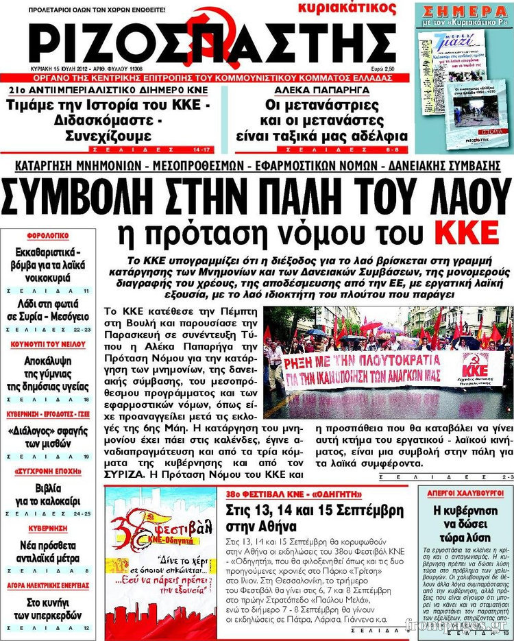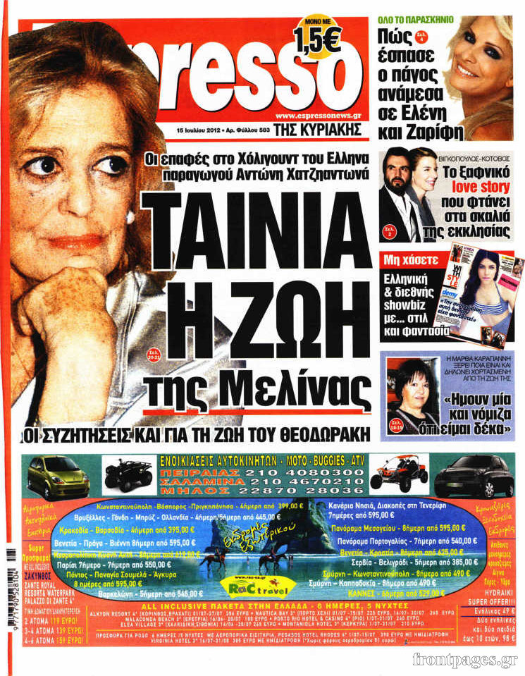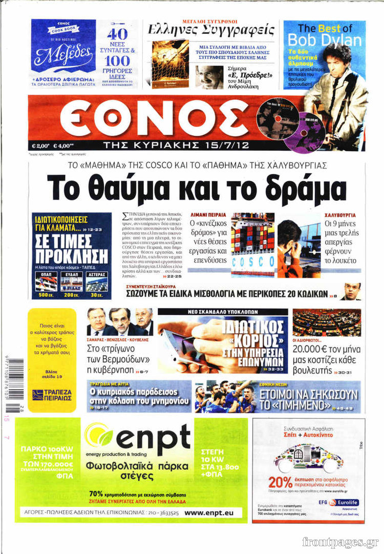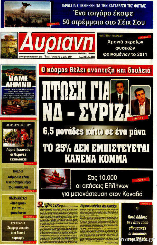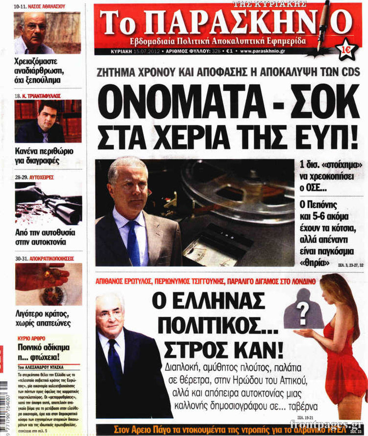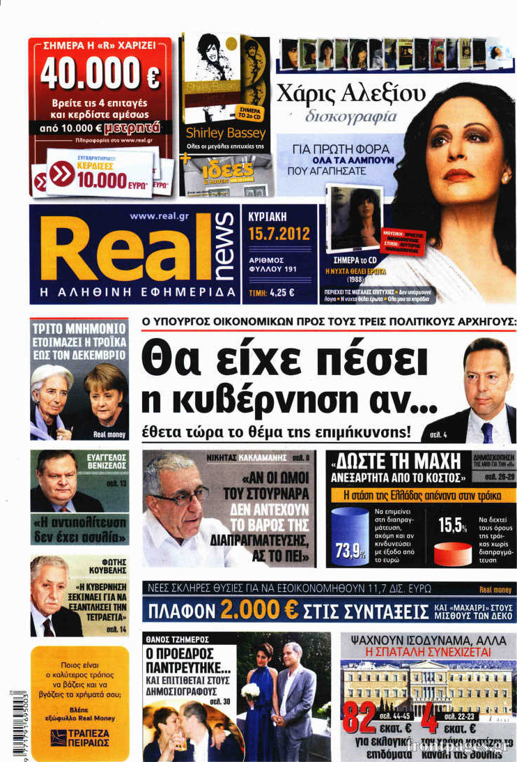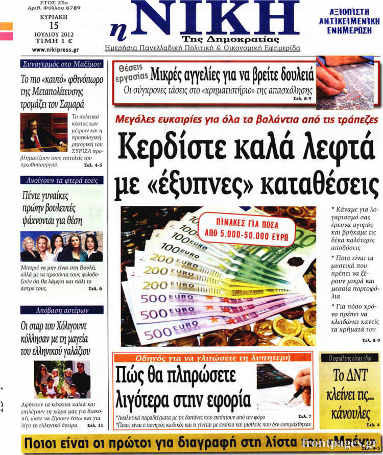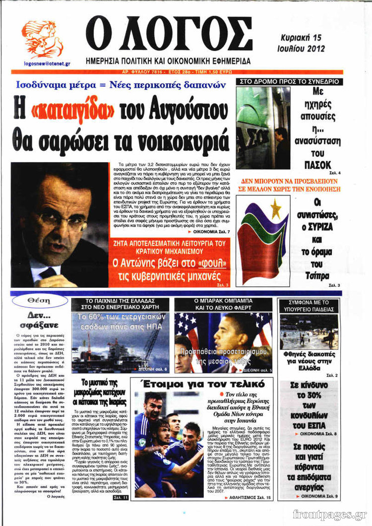 Τα πρωτοσέλιδα των εφημερίδων Enikos Newsroom 10:33, Κυριακή 15 Ιουλίου 2012 Media ΚΥΡΙΑΚΑΤΙΚΕΣ ΕΦΗΜΕΡΙΔΕΣ Μοιράσου το: σχολίασε κι εσύ (0 σχόλια) Ακολουθήστε το enikos.gr στο Google News και μάθετε πρώτοι όλες τις ειδήσεις Δείτε όλες τις τελευταίες ειδήσεις από την Ελλάδα και τον Κόσμο στο enikos.gr Ειδήσεις Ροή Ειδήσεων 4 ώρες πριν Ακίλα Σάλεχ: «Άκυρο» το τουρκολιβυκό μνημόνιο λέει ο πρόεδρος της λιβυκής Βουλής – Ανοίγει ο διάλογος με Ελλάδα, Αίγυπτο και Τουρκία 8 ώρες πριν Αγρότες: Την Τρίτη η απόφαση για διάλογο ή κλιμάκωση των κινητοποιήσεών τους – Πώς χαρακτηρίζουν τις ανακοινώσεις Τσιάρα και οι επόμενες κινήσεις 7 ώρες πριν Τραμπ για Ουκρανία: «Είμαστε πιο κοντά σε συμφωνία από ποτέ» – «Πολυεθνική δύναμη» προτείνουν οι Ευρωπαίοι 8 ώρες πριν Κυψέλη: Η 16χρονη που μαχαίρωσε την 14χρονη είχε συλληφθεί 3 φορές στο παρελθόν – Έβριζε καθηγητές, έβαζε φωτιές σε κάδους και εκβίαζε συμμαθητές της 7 ώρες πριν Τρομοκρατική επίθεση στο Σίδνεϊ: Θλίψη για τα 15 θύματα – Οργή στην εβραϊκή κοινότητα που προειδοποιούσε επί δύο χρόνια 18 λεπτά πριν Οπτική ψευδαίσθηση: Μόνο 1 στους 10 ανθρώπους θα βρει το κόκκινο αυγό σε 7 δευτερόλεπτα 32 λεπτά πριν Υψηλή χοληστερίνη: Γιατρός αποκαλύπτει δύο τρόπους για να την μειώσετε χωρίς φαρμακευτική αγωγή 1 ώρα πριν Τα ζώδια σήμερα, Τρίτη 16 Δεκεμβρίου: Ιχθύες, δεν χρειάζεται να έχετε όλες τις απαντήσεις 8 ώρες πριν Επιστήμονες ίσως έλυσαν το μυστήριο γύρω από τα Χόμπιτ – Νέα έρευνα αποκαλύπτει πώς εξαφανίστηκαν 1 λεπτό πριν ΔΕΔΔΗΕ: Διακοπές ρεύματος σήμερα (16/12) στην Αθήνα και σε άλλες 8 περιοχές της Αττικής 5 λεπτά πριν Με νέα μέτρα για τη στέγη ψηφίζεται σήμερα ο προϋπολογισμός – Οι δημοσιονομικοί και αναπτυξιακοί στόχοι 10 λεπτά πριν Σαν Φρανσίσκο: Τουλάχιστον 15 τραυματίες από απότομο φρενάρισμα τελεφερίκ 18 λεπτά πριν Οπτική ψευδαίσθηση: Μόνο 1 στους 10 ανθρώπους θα βρει το κόκκινο αυγό σε 7 δευτερόλεπτα 24 λεπτά πριν Δώρο Χριστουγέννων 2025: Ποιοι εργαζόμενοι το δικαιούνται – Η online εφαρμογή της ΓΣΕΕ για να το υπολογίσετε ENIKOS NETWORK Πότε το χρόνιο ροχαλητό να αποτελέσει ένδειξη κινδύνου για την καρδιά; Τι λένε οι ειδικοί Μάριος Θεμιστοκλέους: Το ΕΣΥ ενισχύεται, εκσυγχρονίζεται, αλλάζει ΕΒΕΠ για αγροτικές κινητοποιήσεις: Κάθε επιπλέον εβδομάδα προσθέτει περίπου 200 εκατ. ευρώ ζημιά Τι προβλέπει το νομοσχέδιο του υπουργείου Εθνικής Άμυνας – Oι αλλαγές στους μισθούς Σύγχρονος Νοστράδαμος: Προειδοποιεί για «μεγάλο γεγονός» τους επόμενους μήνες που θα συγκλονίσει τη Βρετανία και τον κόσμο Τεστ παρατηρητικότητας: Μπορείτε να βρείτε τις 3 διαφορές στις εικόνες με έναν πιγκουίνο σε 14 δευτερόλεπτα περισσότερα 05:48 , Τρίτη 16 Δεκεμβρίου 2025 Οι οικονομικές εφημερίδες 16/12/2025 Διαβάστε τα πρωτοσέλιδα από τις οικονομικές εφημερίδες, σήμερα 16/12/2025. 05:43 , Τρίτη 16 Δεκεμβρίου 2025 Οι αθλητικές εφημερίδες 16/12/2025 Διαβάστε τα πρωτοσέλιδα από τις αθλητικές εφημερίδες, σήμερα 16/12/2025. 05:38 , Τρίτη 16 Δεκεμβρίου 2025 Οι πολιτικές εφημερίδες 16/12/2025 Διαβάστε τα πρωτοσέλιδα από τις πολιτικές εφημερίδες, σήμερα 16/12/2025. 21:35 , Δευτέρα 15 Δεκεμβρίου 2025 Το Σπίτι Δίπλα Στο Ποτάμι: Η Ιουλία και ο Φωκάς μετακομίζουν στη Ρόδο – Δύο νέοι χαρακτήρες μπαίνουν στη σειρά Δύο νέοι, κομβικοί χαρακτήρες κάνουν την εμφάνισή τους αυτή την εβδομάδα στην αγαπημένη σειρά ... ΤΕΛΕΥΤΑΙΕΣ ΕΙΔΗΣΕΙΣ 1 λεπτό πριν ΔΕΔΔΗΕ: Διακοπές ρεύματος σήμερα (16/12) στην Αθήνα και... 5 λεπτά πριν Με νέα μέτρα για τη στέγη ψηφίζεται σήμε
