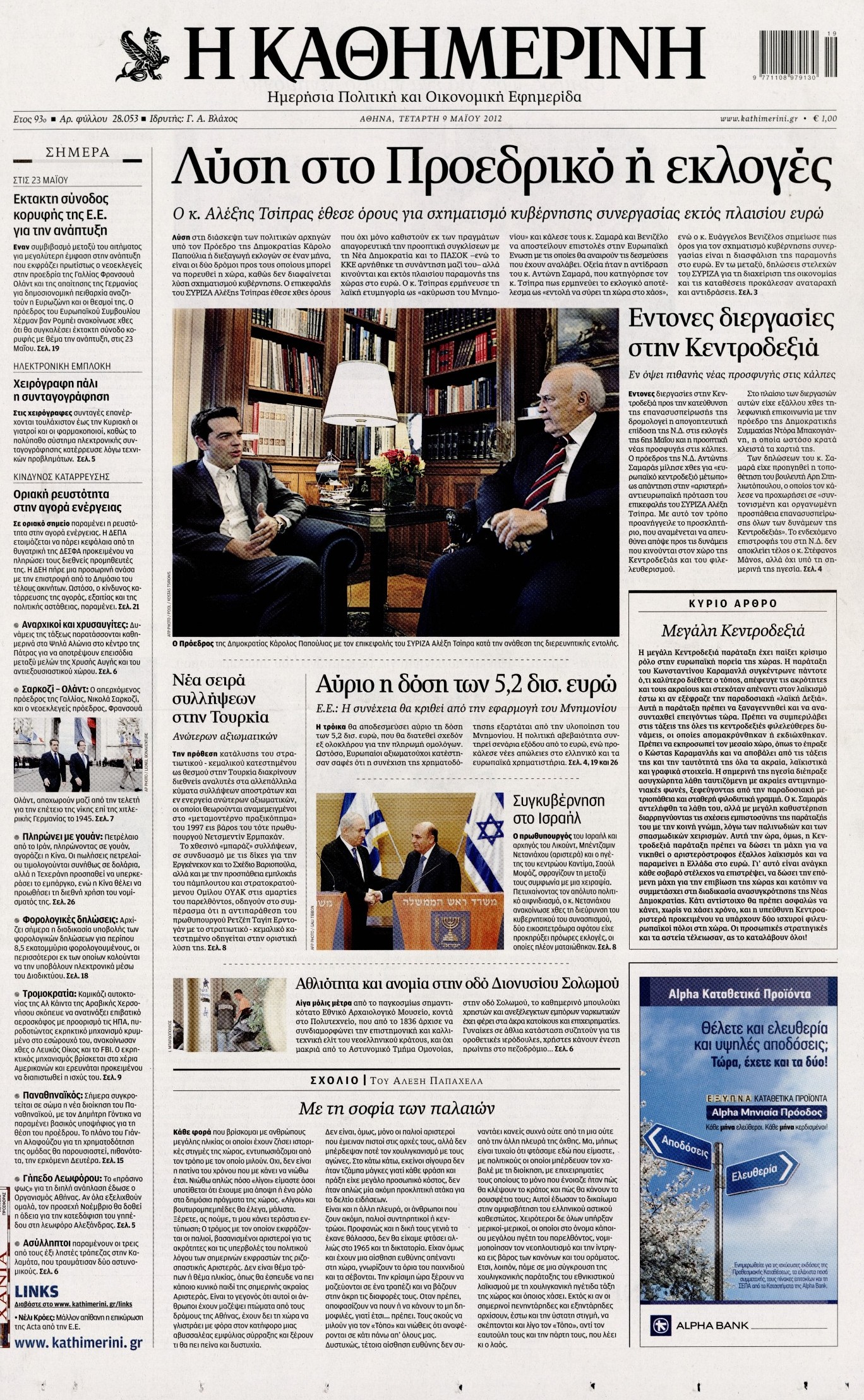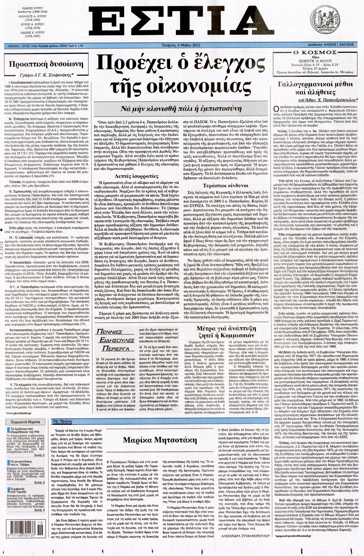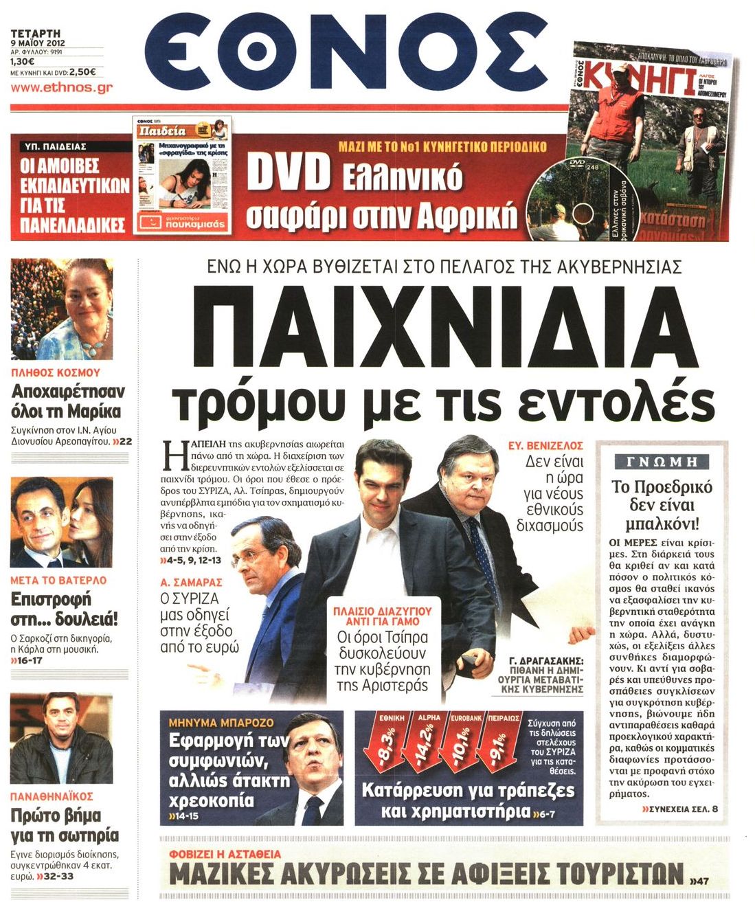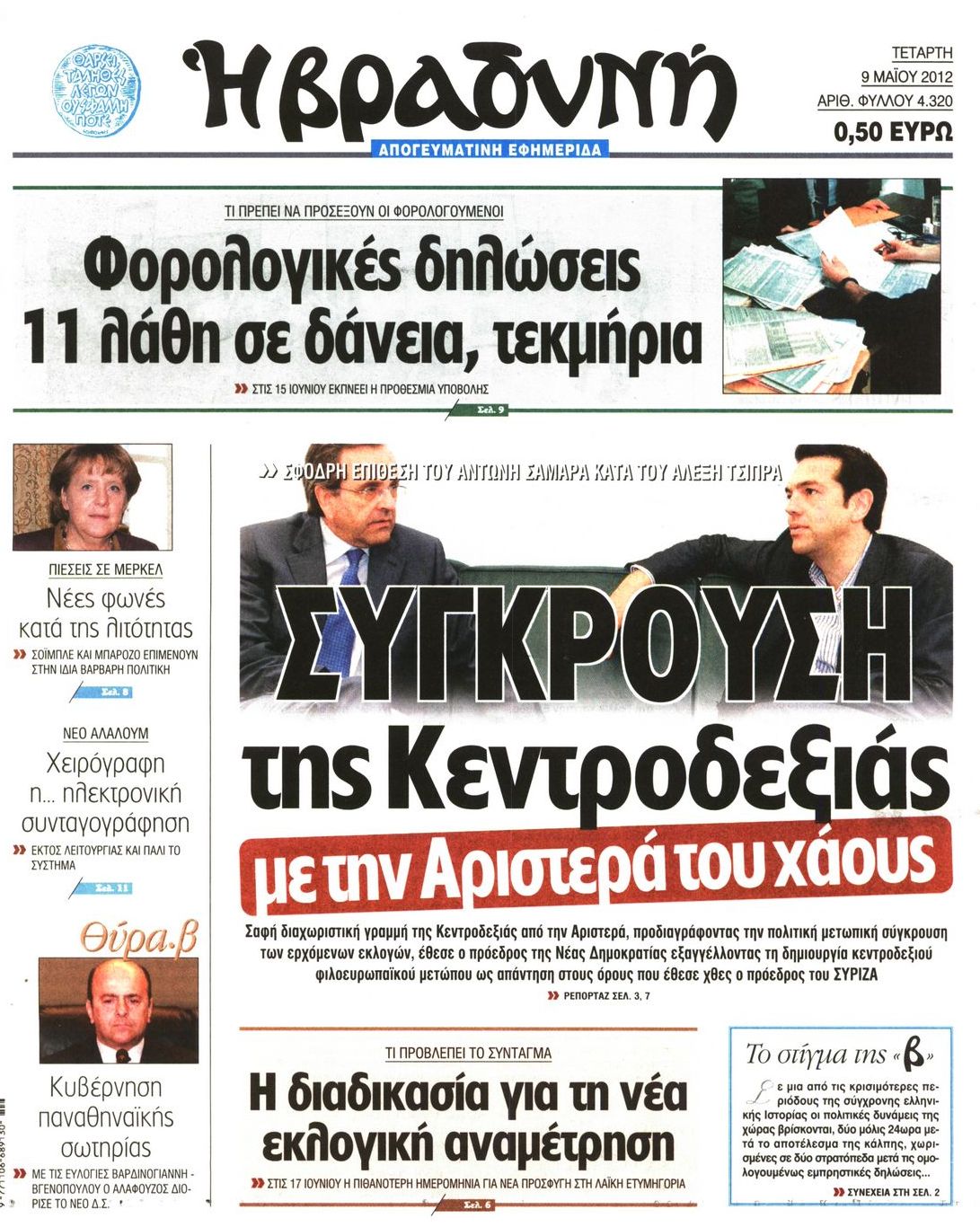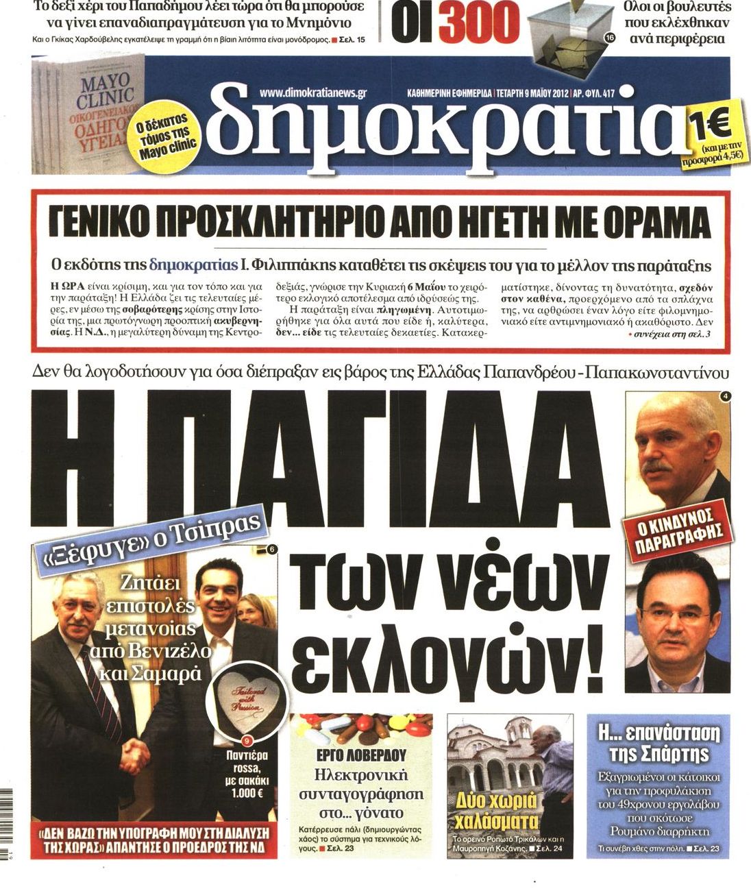 Τα πρωτοσέλιδα των εφημερίδων Enikos Newsroom 07:39, Τετάρτη 09 Μαΐου 2012 Media ΕΦΗΜΕΡΙΔΕΣ ΠΡΩΤΟΣΕΛΙΔΑ Μοιράσου το: σχολίασε κι εσύ (0 σχόλια) Ακολουθήστε το enikos.gr στο Google News και μάθετε πρώτοι όλες τις ειδήσεις Δείτε όλες τις τελευταίες ειδήσεις από την Ελλάδα και τον Κόσμο στο enikos.gr Ειδήσεις Ροή Ειδήσεων 36 λεπτά πριν Πώς στήθηκε η επιχείρηση «Ίπαλλος» που οδήγησε στη σύλληψη του «Έλληνα Εσκομπάρ» – «Ο πόλεμος ενάντια στους εμπόρους ναρκωτικών θα συνεχιστεί» 21 λεπτά πριν Δίκη Χρυσής Αυγής: Την ενοχή και των 42 κατηγορουμένων ζητά η εισαγγελέας 41 λεπτά πριν Κυψέλη: Στη φυλακή η 16χρονη που μαχαίρωσε συμμαθήτριά της 3 ώρες πριν Αμοργός: «Θα προσπαθήσω να το κάνω κάθε μέρα» – Ποιος είναι ο αγρότης που έστησε μόνος του το πρώτο μπλόκο στο νησί 2 ώρες πριν Τραγωδία στην Αλεξανδρούπολη: Παιδάκι 3 ετών μεταφέρθηκε νεκρό από τη μητέρα του στο νοσοκομείο 46 λεπτά πριν Τα 3 ζώδια που θα δουν τη ζωή τους να αλλάζει ριζικά το 2026 – «Όλα γίνονται καλύτερα σταδιακά» 6 ώρες πριν «Δεν είχα κλάψει από τότε που διαγνώστηκα με καρκίνο, ώσπου ένα τηλεφώνημα με έκανε να λυγίσω» – Η συγκλονιστική εξομολόγηση ενός άνδρα 2 ώρες πριν Ο σπάνιος σεισμός που έλυσε τα χέρια των επιστημόνων – Αποκάλυψε ακριβώς όσα αναζητούσαν 7 ώρες πριν 20 χρόνια τα Χριστούγεννα ξεκινούν στα Public με μεγάλη ποικιλία σε δώρα! 8 λεπτά πριν Θεσσαλονίκη: Ακυρώνονται τρεις παραστάσεις του ΚΘΒΕ λόγω στάσης εργασίας των εργαζομένων 14 λεπτά πριν Τραγωδία στην Αχαΐα: 48χρονος κατέρρευσε στο κυνήγι μπροστά στα μάτια του πατέρα του 21 λεπτά πριν Δίκη Χρυσής Αυγής: Την ενοχή και των 42 κατηγορουμένων ζητά η εισαγγελέας 22 λεπτά πριν Μαρκέλλα Γιαννάτου: «Είμαι κοντά στα 14 χρόνια σε ψυχανάλυση – Είχα αρχίσει να έχω κρίσεις άγχους, νόμιζα ότι θα πεθάνω» 29 λεπτά πριν Υπουργείο Αγροτικής Ανάπτυξης: Πώς θα γίνει η πληρωμή αγροτεμαχίων έως 20 στρέμματα παρά τα ζητήματα ΚΑΕΚ ENIKOS NETWORK Σοβαροί κίνδυνοι από τη λάθος χορήγηση φαρμάκου για τις αιμορραγίες-Συστάσεις προς τους γιατρούς 5 πράγματα που αποφεύγει γαστρεντερολόγος για να μειώσει τον κίνδυνο καρκίνου του εντέρου Eurostat: Κάτω από την αρχική εκτίμηση της Υπηρεσίας ο πληθωρισμός στην Ελλάδα τον Νοέμβριο του 2025 – Tα στοιχεία για την ... Συντάξεις Ιανουαρίου 2026: Σε ποιους θα πιστωθούν την Πέμπτη τα χρήματα και τι αυξήσεις θα δοθούν – Δείτε αναλυτικά παραδεί... Χαρτογραφώντας το «σημείο χωρίς επιστροφή»: Για πρώτη φορά αποκαλύπτεται με λεπτομέρεια το ακανθώδες όριο της ατμόσφαιρας τ... Η Google καταργεί τη λειτουργία «dark web report» – Πώς θα μπορούν οι χρήστες να διαγράφουν τα δεδομένα τους περισσότερα 12:35 , Τετάρτη 17 Δεκεμβρίου 2025 Μίρκα Παπακωνσταντίνου: «Δεν ήμουν αισιόδοξη για τα νούμερα – Είμαι ρεαλίστρια» Στα γυρίσματα του εορταστικού επεισοδίου της αγαπημένης σειράς “Το Σόι Σου”, βρέθηκε η κάμερα ... 12:12 , Τετάρτη 17 Δεκεμβρίου 2025 Ακούστε την εκπομπή του Νίκου Χατζηνικολάου 17/12/2025 Ακούστε την εκπομπή του Νίκου Χατζηνικολάου στον ραδιοφωνικό σταθμό RealFm 97,8, την Τετάρτη 1... 11:35 , Τετάρτη 17 Δεκεμβρίου 2025 Home Alone: Το σπίτι της ταινίας θα ανακαινιστεί – Επιστροφή στην αισθητική της δεκαετίας του ’90 Οι νέοι ιδιοκτήτες του πραγματικού σπιτιού που παρουσιάζεται στην κλασική ταινία του 1990 «Hom... 11:25 , Τετάρτη 17 Δεκεμβρίου 2025 Grand Hotel: Απόψε το τελευταίο επεισόδιο της χρονιάς – Όλα τα μυστικά μένουν εδώ Το τελευταίο επεισόδιο της χρονιάς της σειράς «Grand Hotel» θα προβληθεί απόψε στις 21:00. Ο Ά... ΤΕΛΕΥΤΑΙ