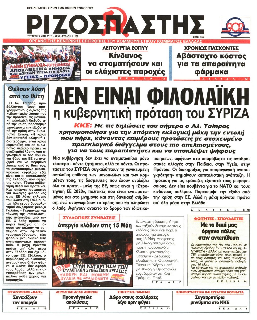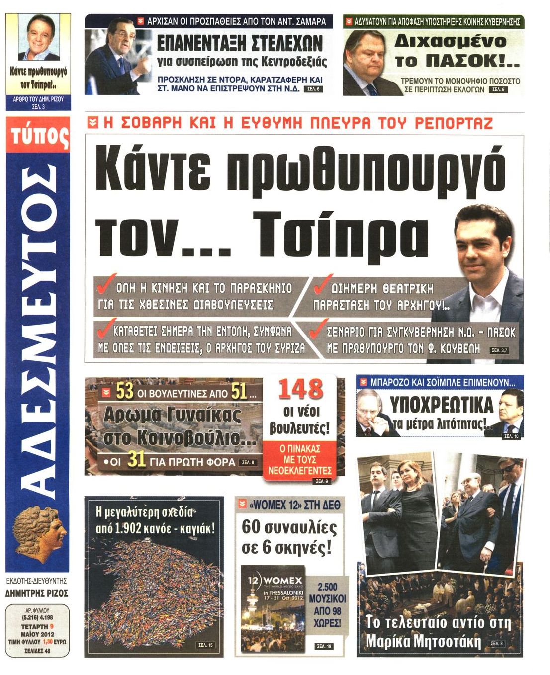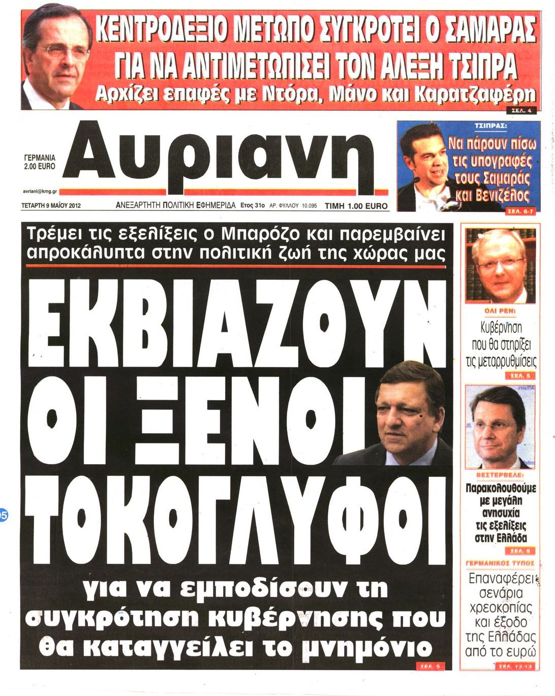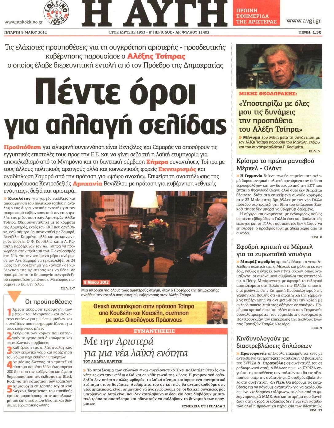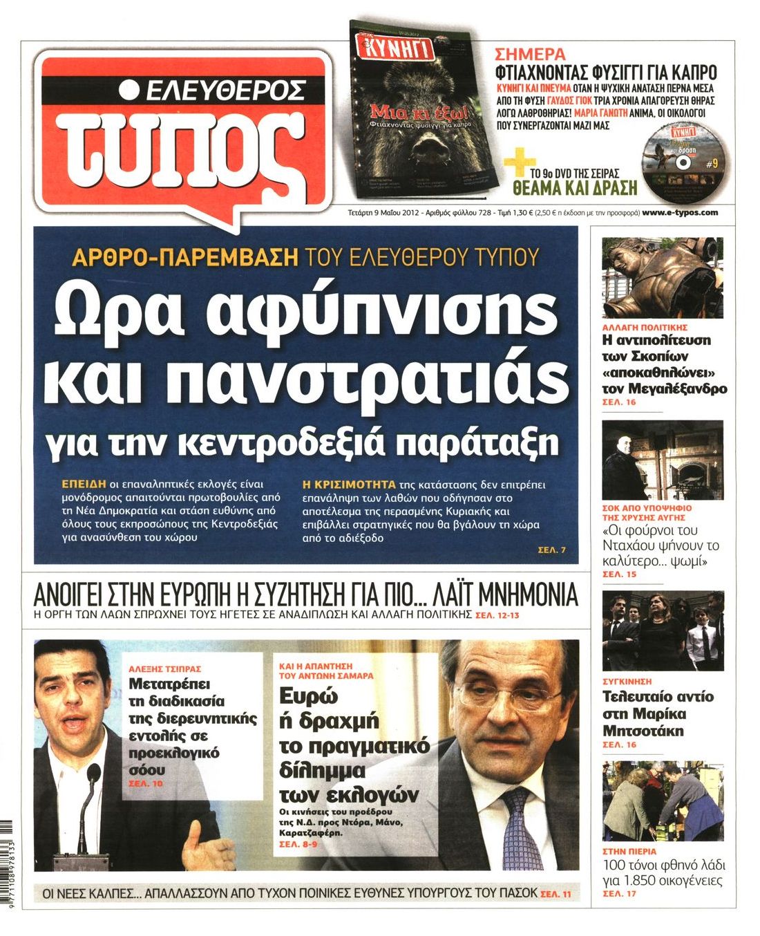 Τα πρωτοσέλιδα των εφημερίδων Enikos Newsroom 07:39, Τετάρτη 09 Μαΐου 2012 Media ΕΦΗΜΕΡΙΔΕΣ ΠΡΩΤΟΣΕΛΙΔΑ Μοιράσου το: σχολίασε κι εσύ (0 σχόλια) Ακολουθήστε το enikos.gr στο Google News και μάθετε πρώτοι όλες τις ειδήσεις Δείτε όλες τις τελευταίες ειδήσεις από την Ελλάδα και τον Κόσμο στο enikos.gr Ειδήσεις Ροή Ειδήσεων 36 λεπτά πριν Πώς στήθηκε η επιχείρηση «Ίπαλλος» που οδήγησε στη σύλληψη του «Έλληνα Εσκομπάρ» – «Ο πόλεμος ενάντια στους εμπόρους ναρκωτικών θα συνεχιστεί» 21 λεπτά πριν Δίκη Χρυσής Αυγής: Την ενοχή και των 42 κατηγορουμένων ζητά η εισαγγελέας 41 λεπτά πριν Κυψέλη: Στη φυλακή η 16χρονη που μαχαίρωσε συμμαθήτριά της 3 ώρες πριν Αμοργός: «Θα προσπαθήσω να το κάνω κάθε μέρα» – Ποιος είναι ο αγρότης που έστησε μόνος του το πρώτο μπλόκο στο νησί 2 ώρες πριν Τραγωδία στην Αλεξανδρούπολη: Παιδάκι 3 ετών μεταφέρθηκε νεκρό από τη μητέρα του στο νοσοκομείο 46 λεπτά πριν Τα 3 ζώδια που θα δουν τη ζωή τους να αλλάζει ριζικά το 2026 – «Όλα γίνονται καλύτερα σταδιακά» 6 ώρες πριν «Δεν είχα κλάψει από τότε που διαγνώστηκα με καρκίνο, ώσπου ένα τηλεφώνημα με έκανε να λυγίσω» – Η συγκλονιστική εξομολόγηση ενός άνδρα 2 ώρες πριν Ο σπάνιος σεισμός που έλυσε τα χέρια των επιστημόνων – Αποκάλυψε ακριβώς όσα αναζητούσαν 7 ώρες πριν 20 χρόνια τα Χριστούγεννα ξεκινούν στα Public με μεγάλη ποικιλία σε δώρα! 8 λεπτά πριν Θεσσαλονίκη: Ακυρώνονται τρεις παραστάσεις του ΚΘΒΕ λόγω στάσης εργασίας των εργαζομένων 14 λεπτά πριν Τραγωδία στην Αχαΐα: 48χρονος κατέρρευσε στο κυνήγι μπροστά στα μάτια του πατέρα του 21 λεπτά πριν Δίκη Χρυσής Αυγής: Την ενοχή και των 42 κατηγορουμένων ζητά η εισαγγελέας 22 λεπτά πριν Μαρκέλλα Γιαννάτου: «Είμαι κοντά στα 14 χρόνια σε ψυχανάλυση – Είχα αρχίσει να έχω κρίσεις άγχους, νόμιζα ότι θα πεθάνω» 29 λεπτά πριν Υπουργείο Αγροτικής Ανάπτυξης: Πώς θα γίνει η πληρωμή αγροτεμαχίων έως 20 στρέμματα παρά τα ζητήματα ΚΑΕΚ ENIKOS NETWORK Σοβαροί κίνδυνοι από τη λάθος χορήγηση φαρμάκου για τις αιμορραγίες-Συστάσεις προς τους γιατρούς 5 πράγματα που αποφεύγει γαστρεντερολόγος για να μειώσει τον κίνδυνο καρκίνου του εντέρου Eurostat: Κάτω από την αρχική εκτίμηση της Υπηρεσίας ο πληθωρισμός στην Ελλάδα τον Νοέμβριο του 2025 – Tα στοιχεία για την ... Συντάξεις Ιανουαρίου 2026: Σε ποιους θα πιστωθούν την Πέμπτη τα χρήματα και τι αυξήσεις θα δοθούν – Δείτε αναλυτικά παραδεί... Χαρτογραφώντας το «σημείο χωρίς επιστροφή»: Για πρώτη φορά αποκαλύπτεται με λεπτομέρεια το ακανθώδες όριο της ατμόσφαιρας τ... Η Google καταργεί τη λειτουργία «dark web report» – Πώς θα μπορούν οι χρήστες να διαγράφουν τα δεδομένα τους περισσότερα 12:35 , Τετάρτη 17 Δεκεμβρίου 2025 Μίρκα Παπακωνσταντίνου: «Δεν ήμουν αισιόδοξη για τα νούμερα – Είμαι ρεαλίστρια» Στα γυρίσματα του εορταστικού επεισοδίου της αγαπημένης σειράς “Το Σόι Σου”, βρέθηκε η κάμερα ... 12:12 , Τετάρτη 17 Δεκεμβρίου 2025 Ακούστε την εκπομπή του Νίκου Χατζηνικολάου 17/12/2025 Ακούστε την εκπομπή του Νίκου Χατζηνικολάου στον ραδιοφωνικό σταθμό RealFm 97,8, την Τετάρτη 1... 11:35 , Τετάρτη 17 Δεκεμβρίου 2025 Home Alone: Το σπίτι της ταινίας θα ανακαινιστεί – Επιστροφή στην αισθητική της δεκαετίας του ’90 Οι νέοι ιδιοκτήτες του πραγματικού σπιτιού που παρουσιάζεται στην κλασική ταινία του 1990 «Hom... 11:25 , Τετάρτη 17 Δεκεμβρίου 2025 Grand Hotel: Απόψε το τελευταίο επεισόδιο της χρονιάς – Όλα τα μυστικά μένουν εδώ Το τελευταίο επεισόδιο της χρονιάς της σειράς «Grand Hotel» θα προβληθεί απόψε στις 21:00. Ο Ά... ΤΕΛΕΥΤΑΙ