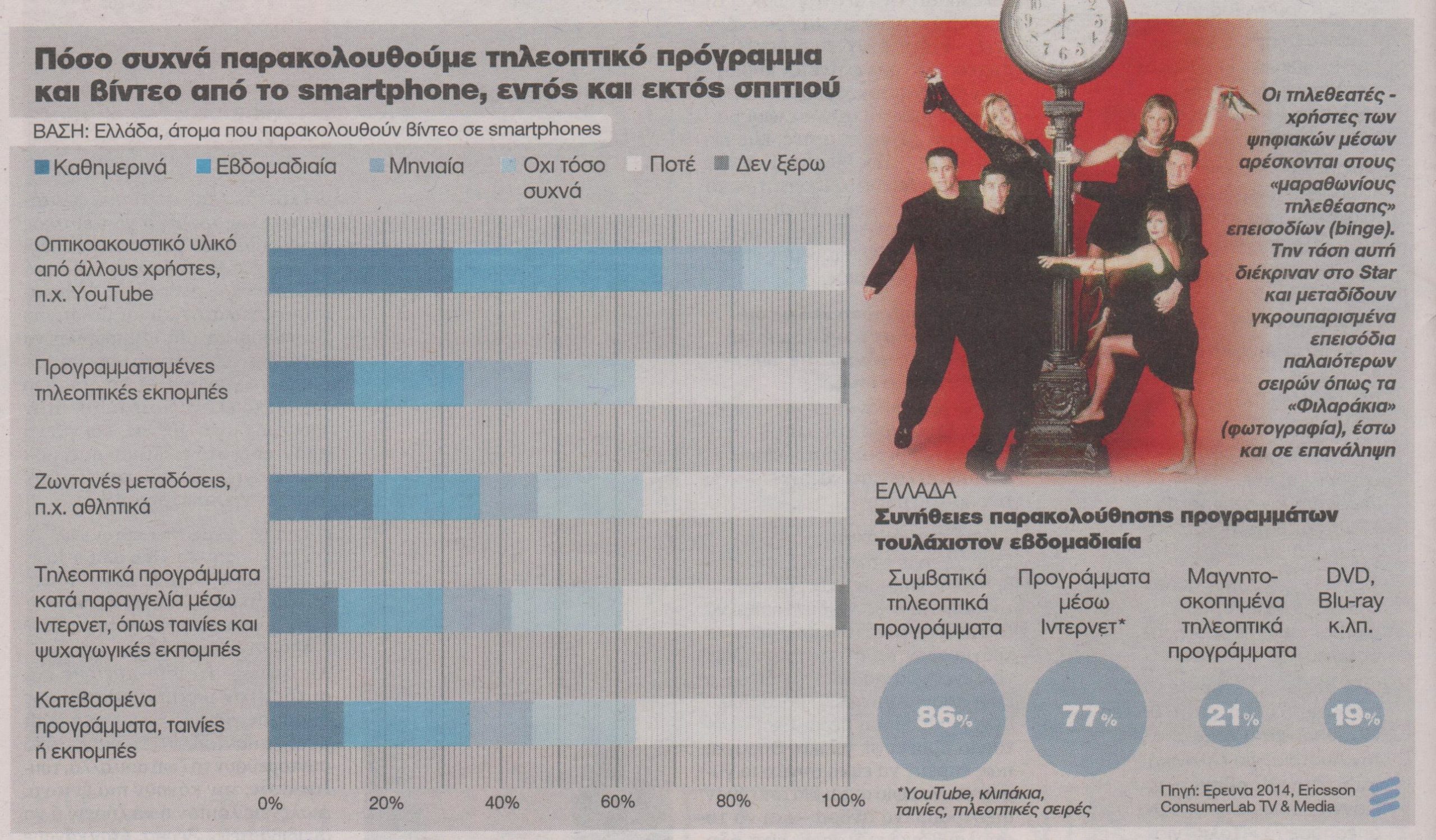 Η επιλογή παρακολούθησης μέσω ψηφιακής μετάδοσης το 2014 διαμορφώθηκε στο 86% έναντι του 77% που απέσπασε η τηλεόραση, σύμφωνα με τις απαντήσεις που έδωσαν σε προσωπικές συνεντεύξεις άνθρωποι ανεξαρτήτως φύλλου – αντιπροσωπευτικό δείγμα του πληθυσμού της χώρας- στην έρευνα ερωτηματολογίου της ConsumerLab της Ericsson.