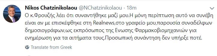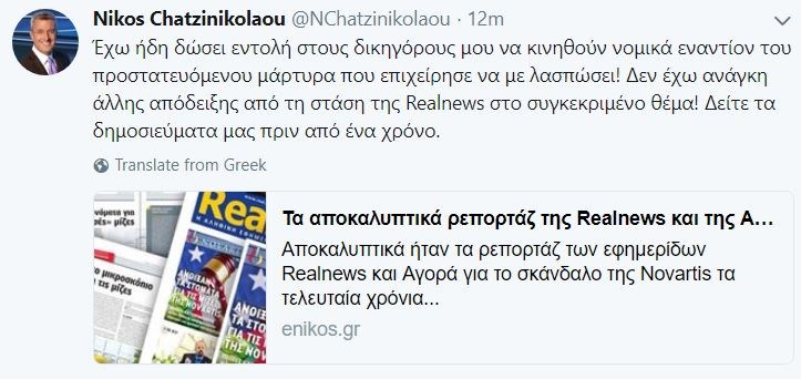Στην υπόθεση της Novartis αναφέρθηκε μέσω Twitter ο Νίκος Χατζηνικολάου.«Ο κ.Φρουζής λέει ότι συναντήθηκε μαζί μου. Η μόνη περίπτωση αυτό να συνέβη είναι αν με επισκέφθηκε στη Realnews, στο γραφείο μου, παρουσία συναδέλφων δημοσιογράφων, ως εκπρόσωπος της Ένωσης Φαρμακοβιομηχανιών για ενημέρωση για τα αιτήματα τους. Προσωπική συνάντηση δεν υπήρξε ποτέ» διευκρινίζει ο Νίκος Χατζηνικολάου, με αφορμή τους ισχυρισμούς του πρώην αντιπροέδρου της Novartis Κωνσταντίνου Φρουζή. «Έχω ήδη δώσει εντολή στους δικηγόρους μου να κινηθούν νομικά εναντίον του προστατευόμενου μάρτυρα που επιχείρησε να με λασπώσει! Δεν έχω ανάγκη άλλης απόδειξης από τη στάση της Realnews στο συγκεκριμένο θέμα! Δείτε τα δημοσιεύματα μας πριν από ένα χρόνο» προσθέτει ο Νίκος Χατζηνικολάου, παραθέτοντας τα δημοσιεύματα των εφημερίδων Realnews και Αγορά.