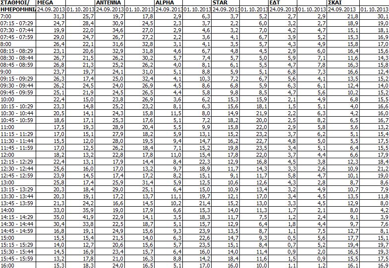 Δείτε τις χθεσινές (1/10) μετρήσεις τηλεθέασης των τηλεοπτικών σταθμών εθνικής εμβέλειας