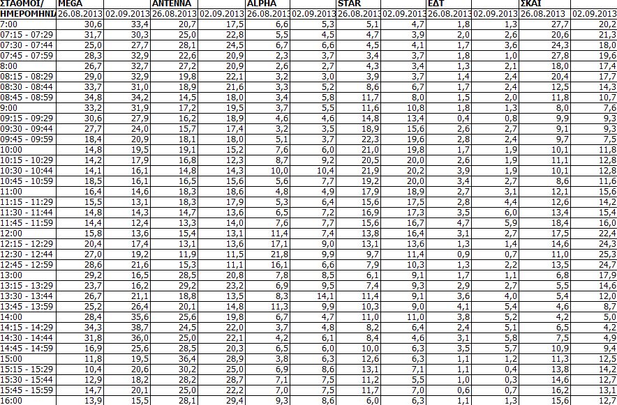 Δείτε τις χθεσινές (2/9) μετρήσεις τηλεθέασης των τηλεοπτικών σταθμών εθνικής εμβέλειας.