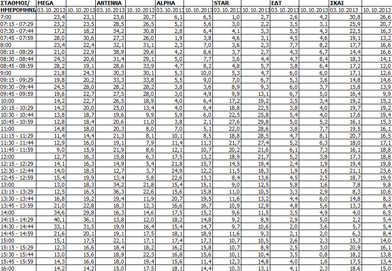 Δείτε τις χθεσινές (10/10) μετρήσεις τηλεθέασης των τηλεοπτικών σταθμών εθνικής εμβέλειας