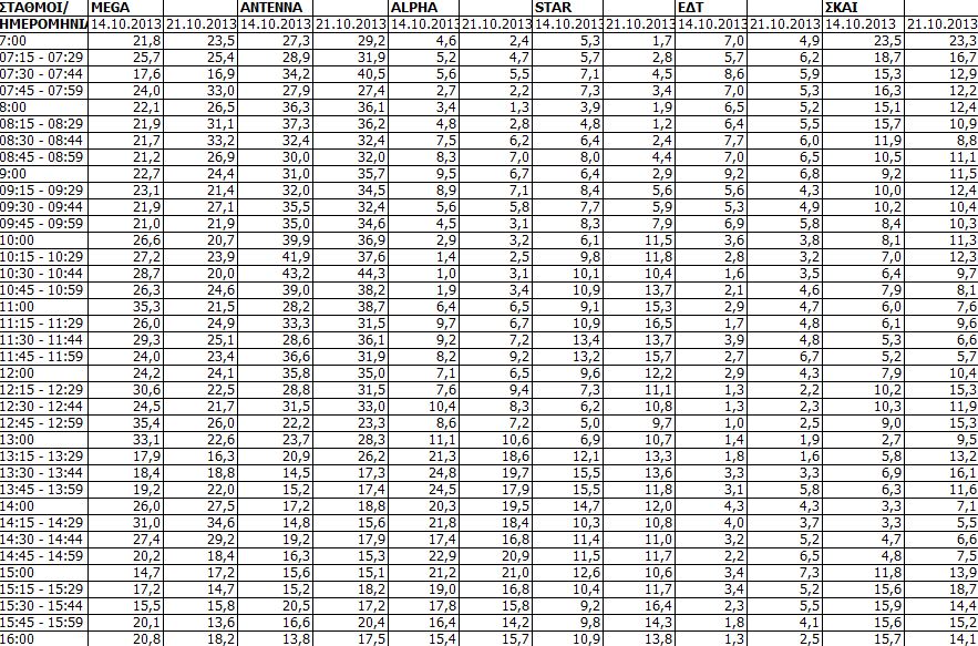 Δείτε τις χθεσινές (21/10) μετρήσεις τηλεθέασης των τηλεοπτικών σταθμών εθνικής εμβέλειας.