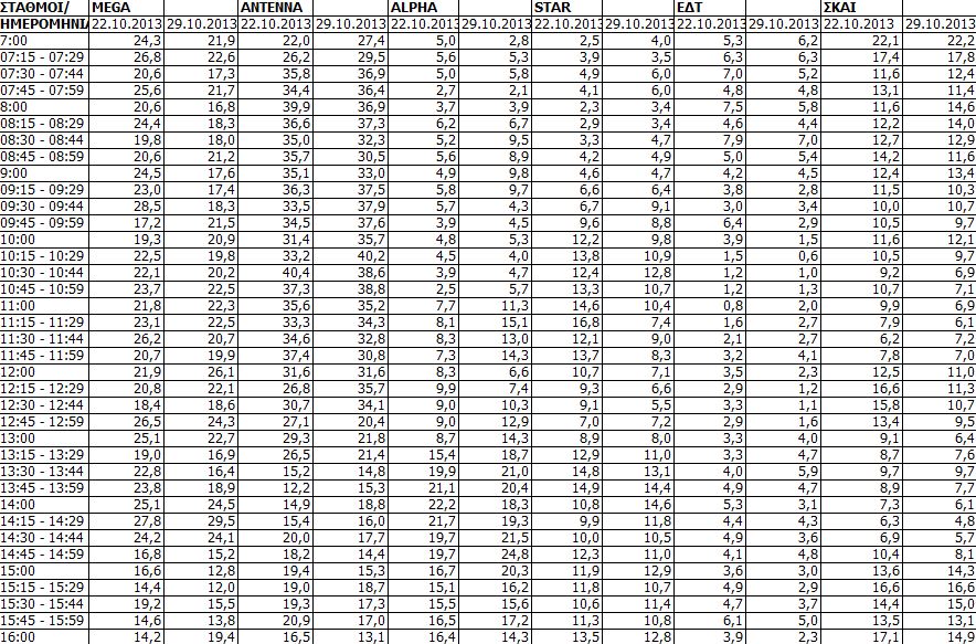 Δείτε τις χθεσινές (29/10) μετρήσεις τηλεθέασης των τηλεοπτικών σταθμών εθνικής εμβέλειας.