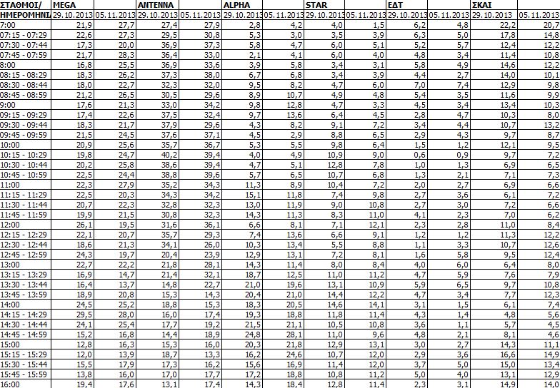 Δείτε τις χθεσινές (05/11) μετρήσεις τηλεθέασης των τηλεοπτικών σταθμών εθνικής εμβέλειας.