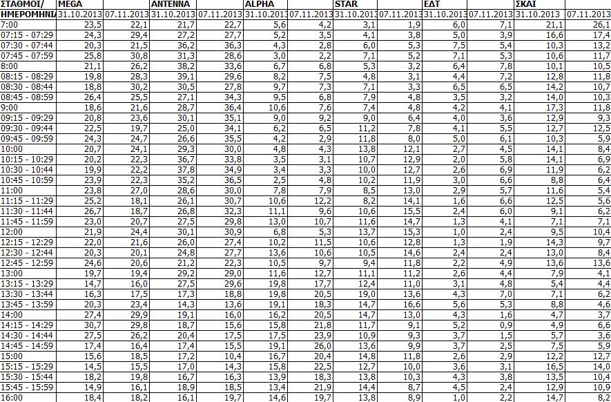Δείτε τις χθεσινές (07/11) μετρήσεις τηλεθέασης των τηλεοπτικών σταθμών εθνικής εμβέλειας.