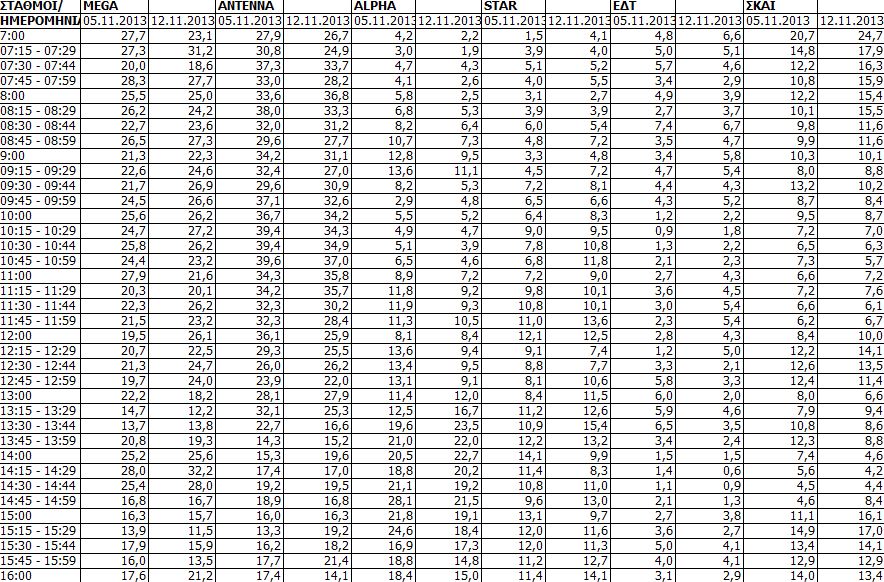 Δείτε τις χθεσινές (12/11) μετρήσεις τηλεθέασης των τηλεοπτικών σταθμών εθνικής εμβέλειας.