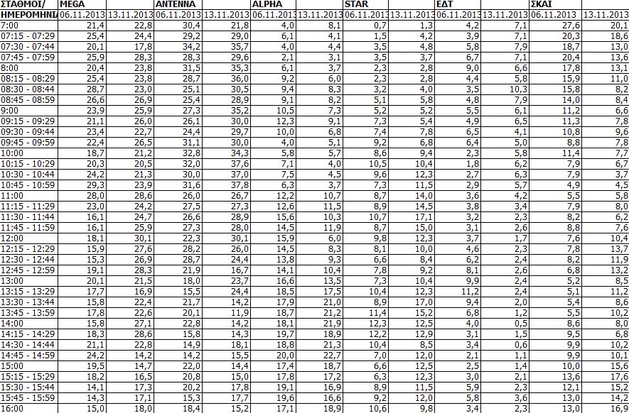 Δείτε τις χθεσινές (13/11) μετρήσεις τηλεθέασης των τηλεοπτικών σταθμών εθνικής εμβέλειας.